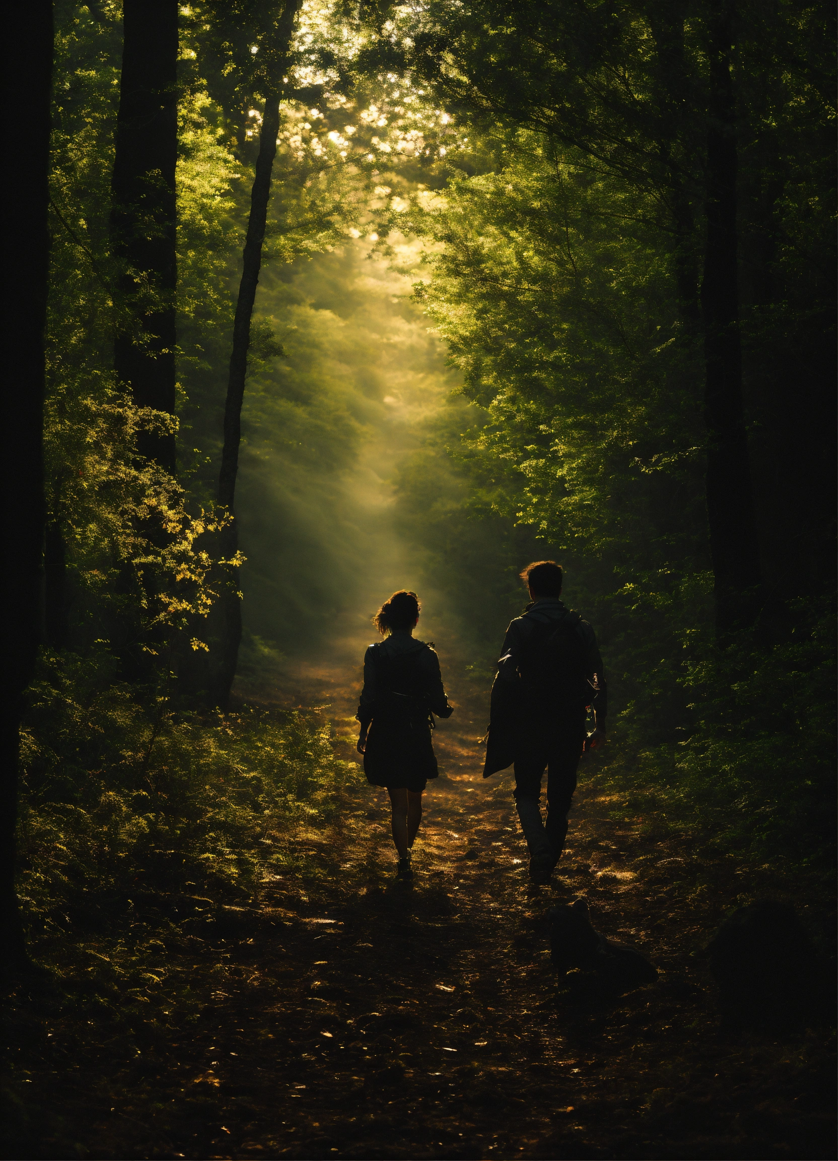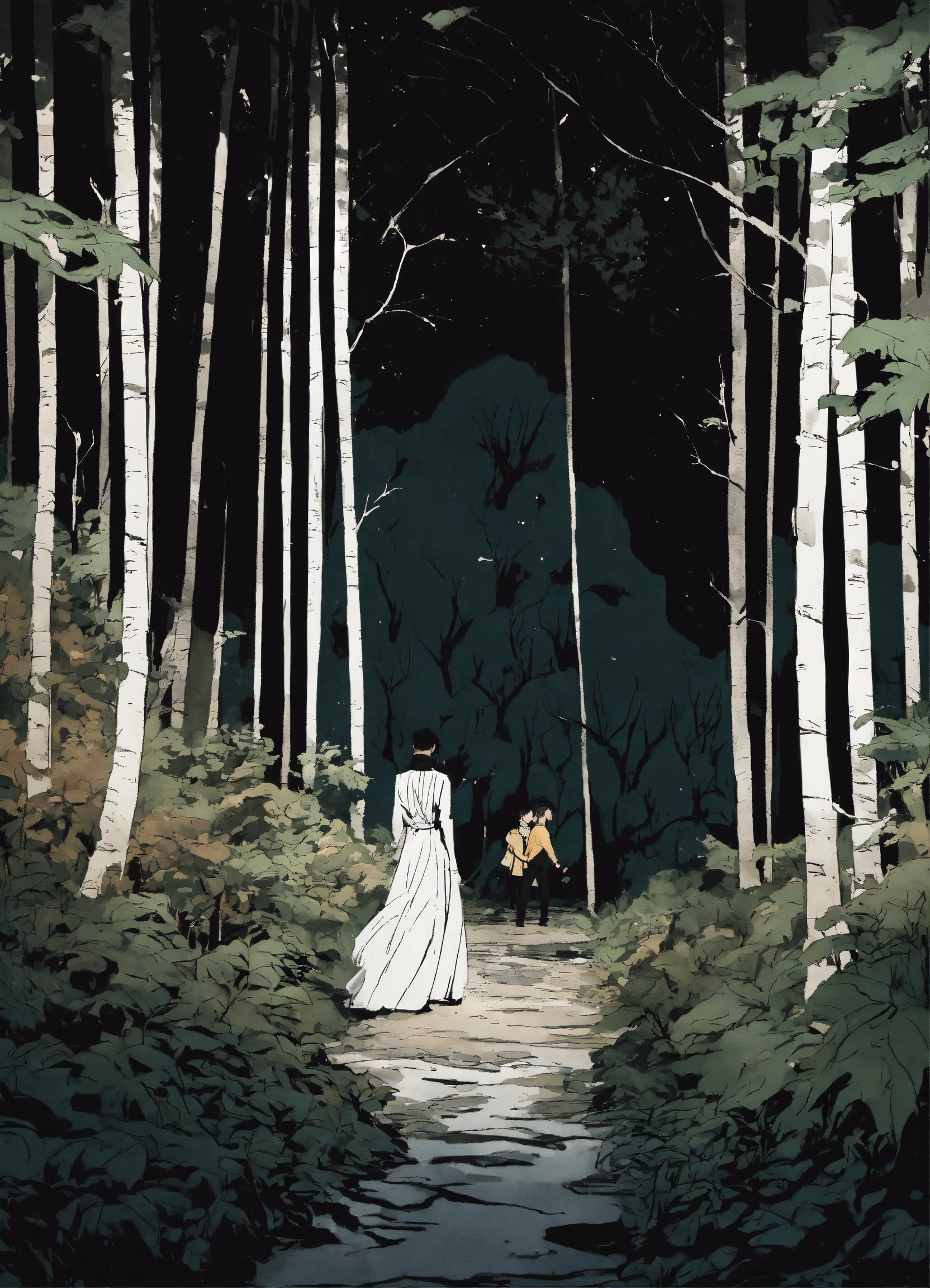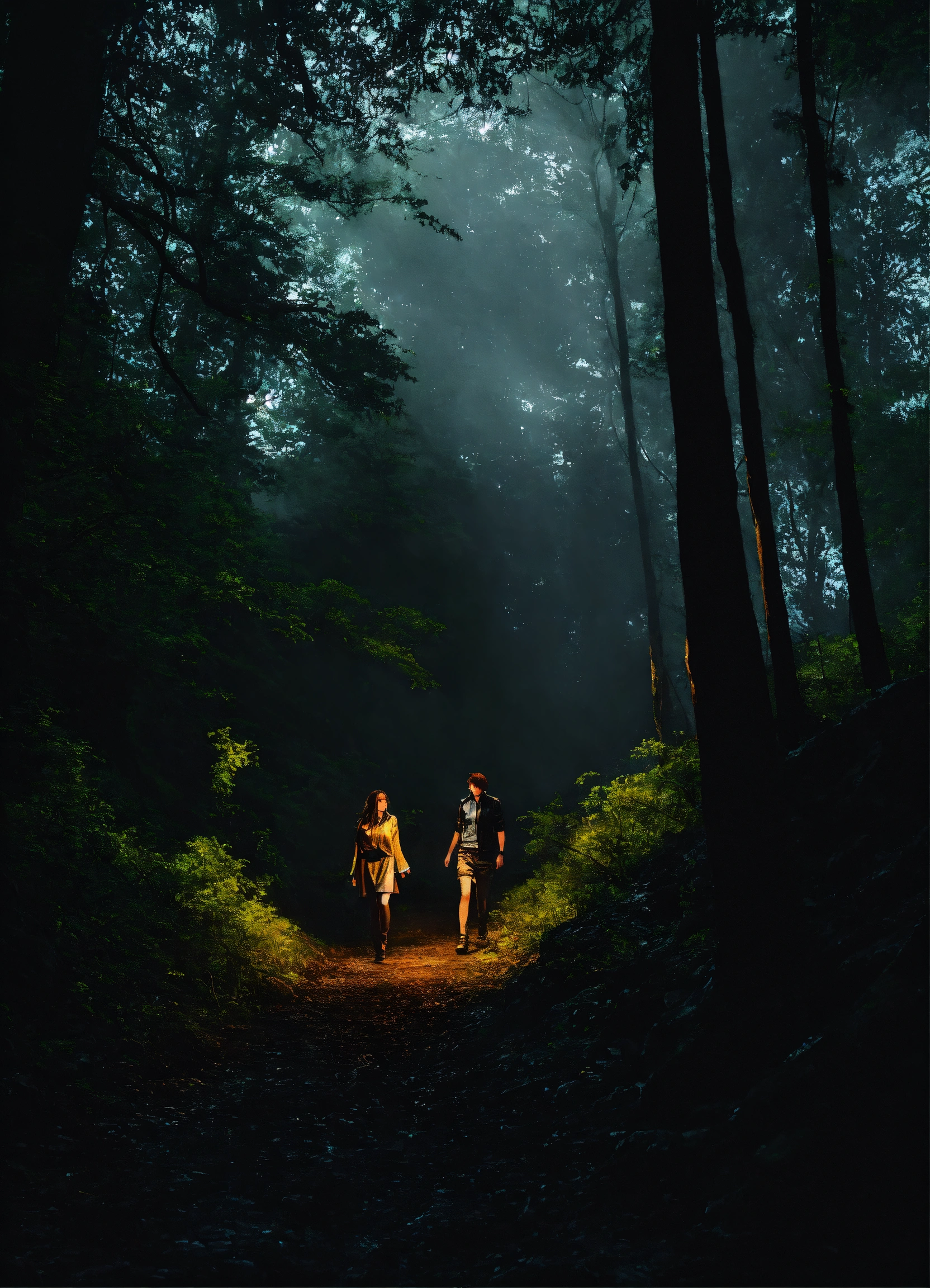 A tense lovers fleeing away in pitch-black darkness through a dense forest