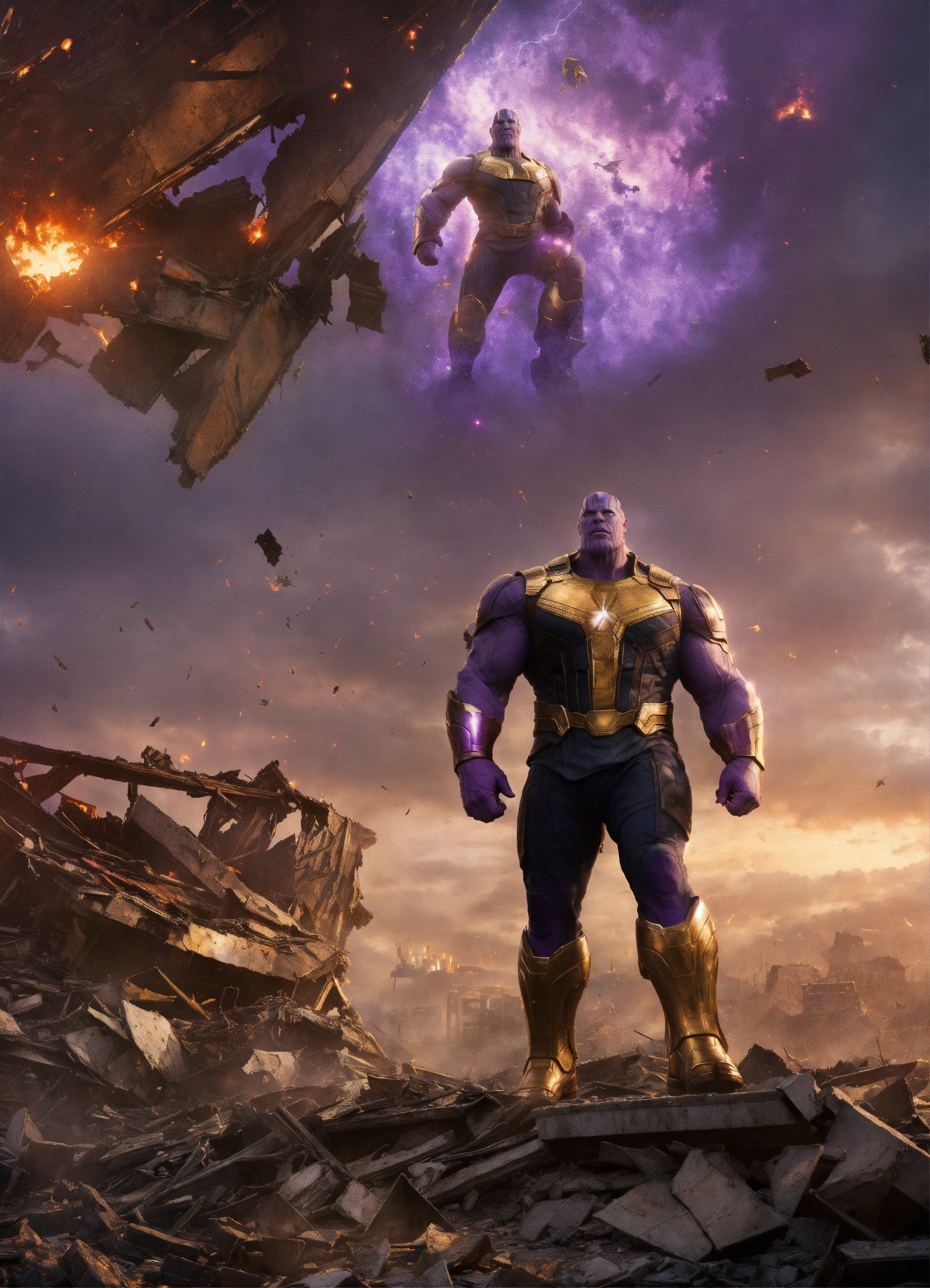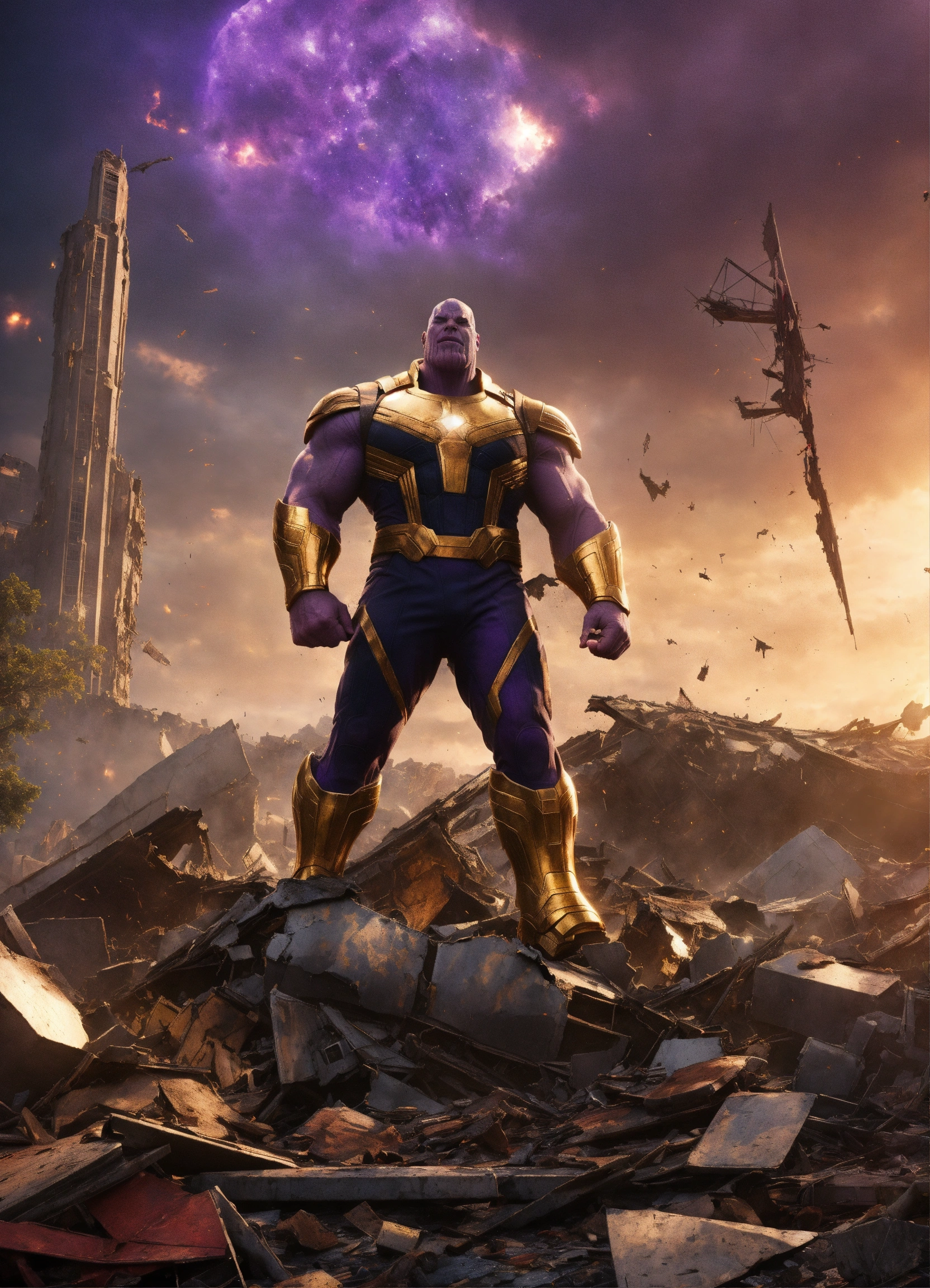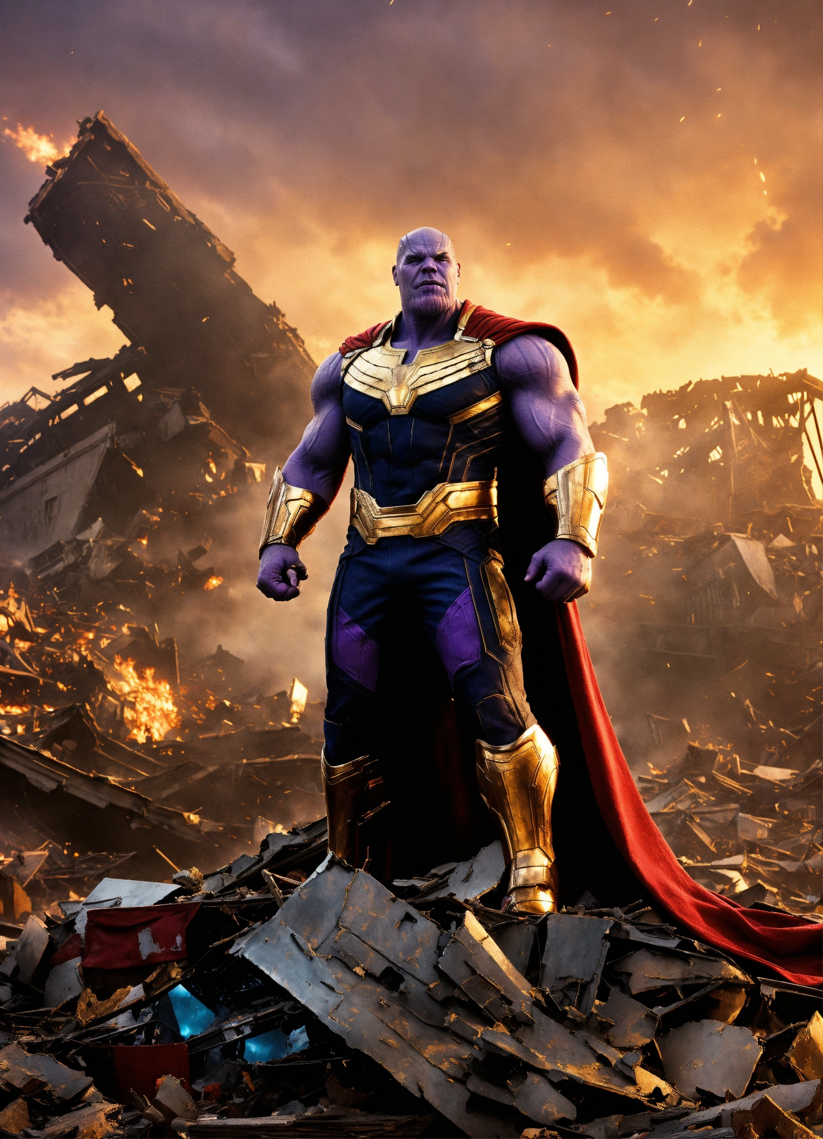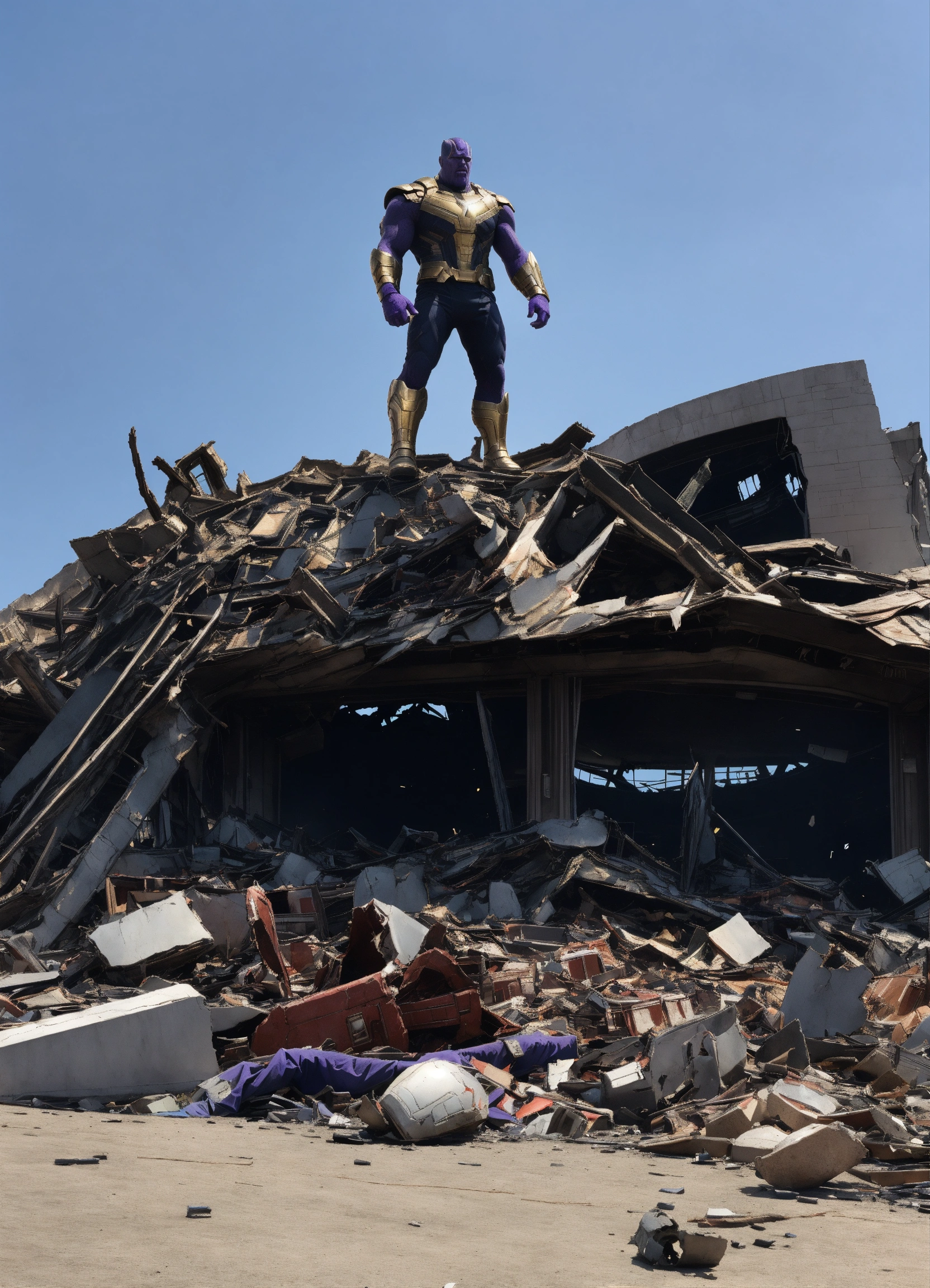 Thanos standing above the wreckage of the avengers headquarters after he just destroyed it, complete with avengers gear as wreckage