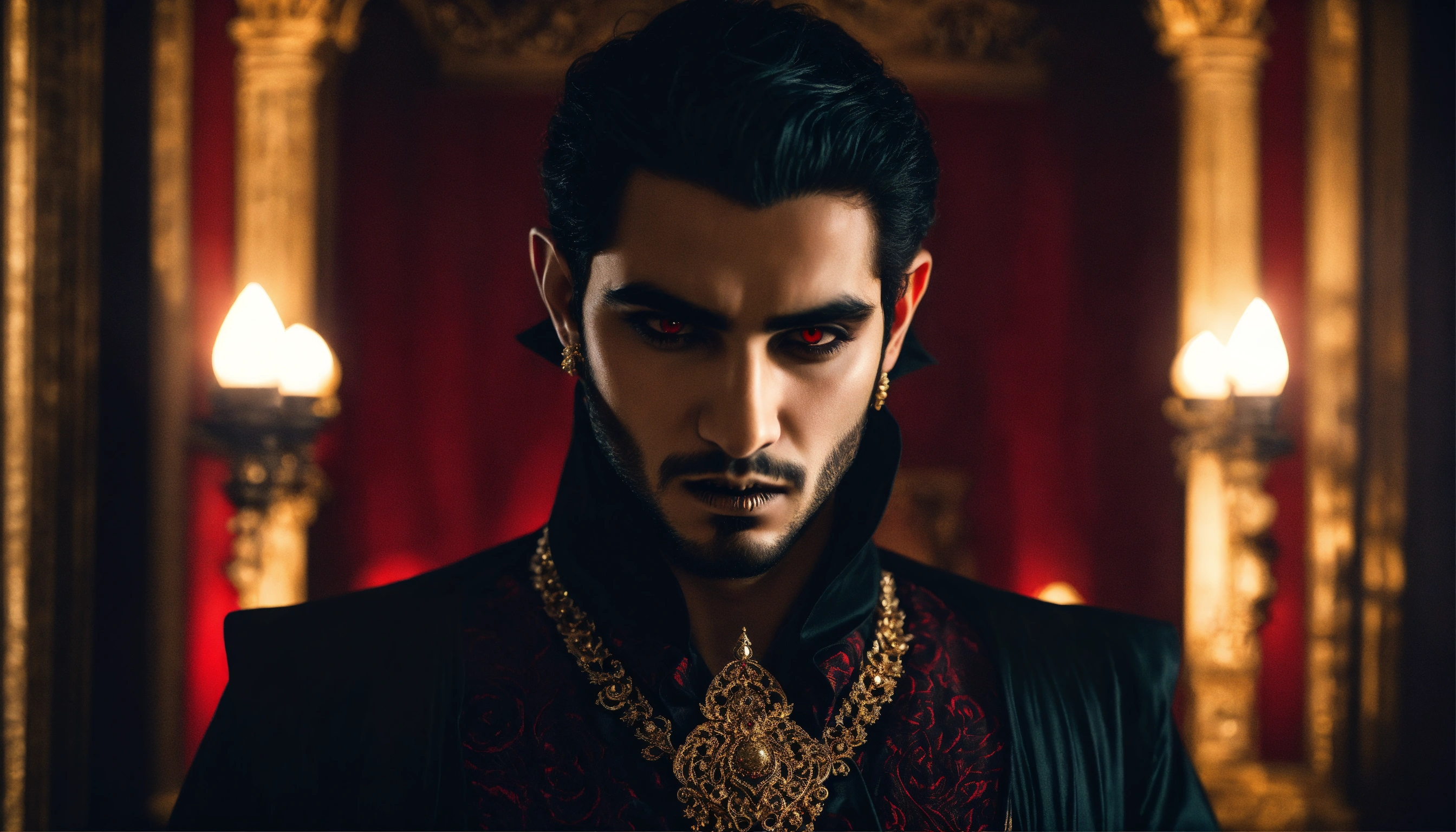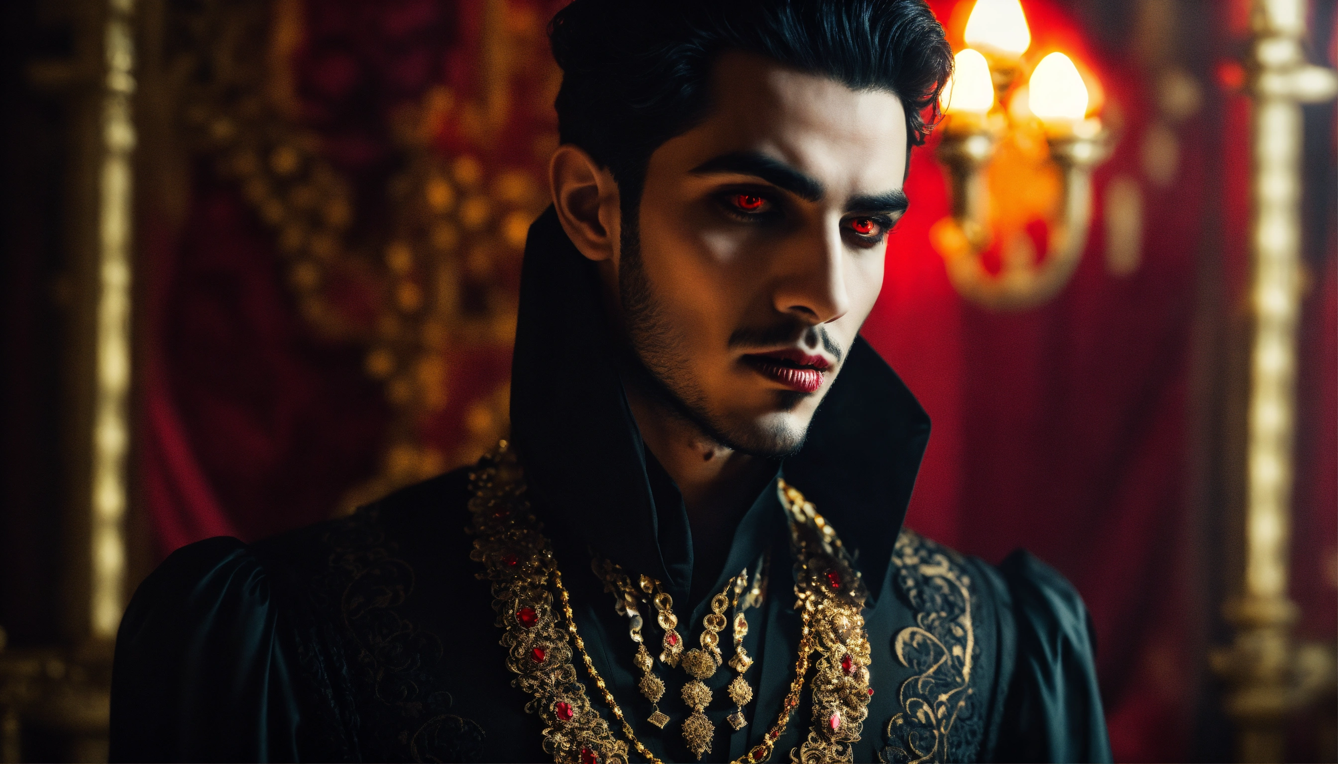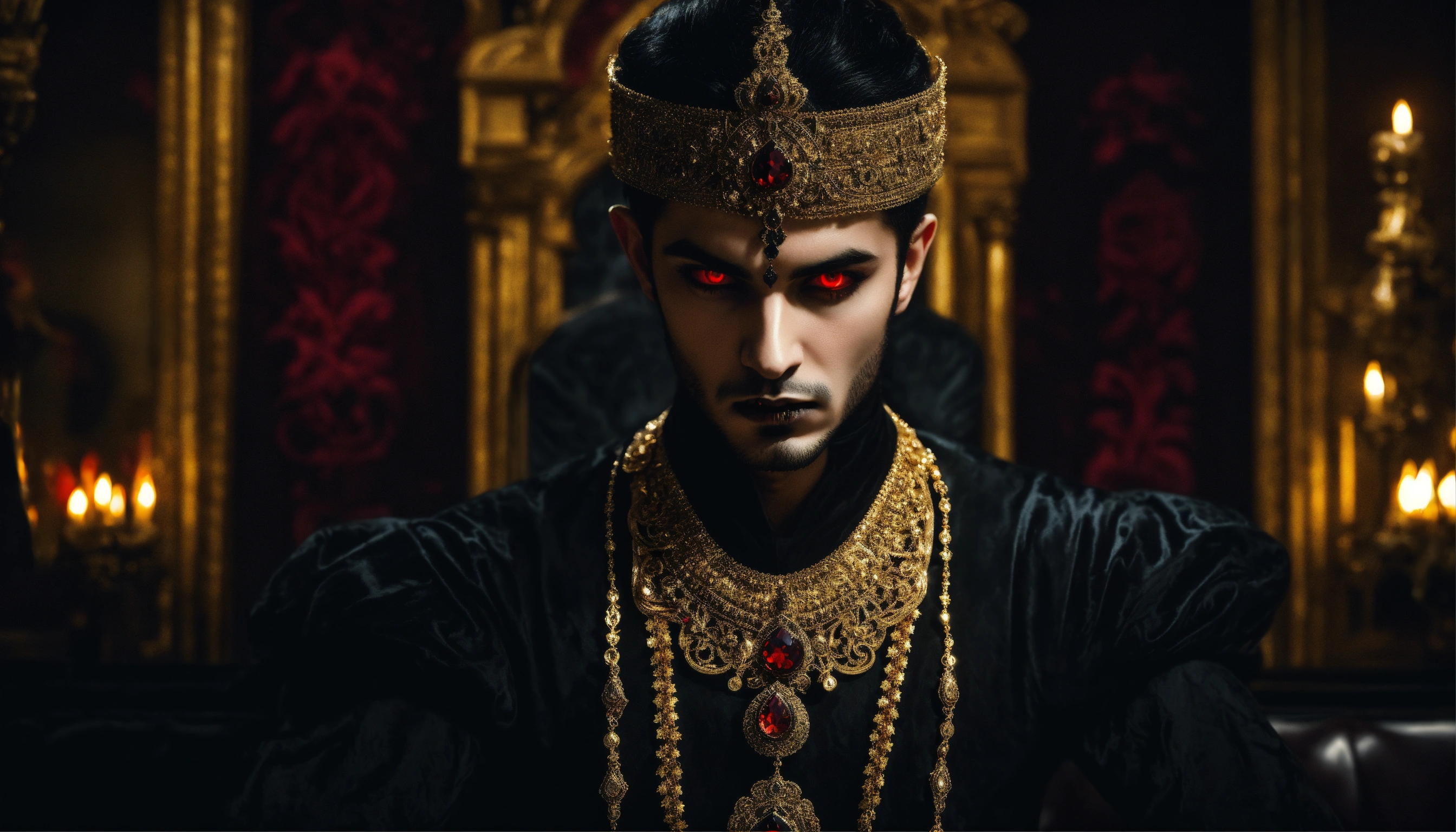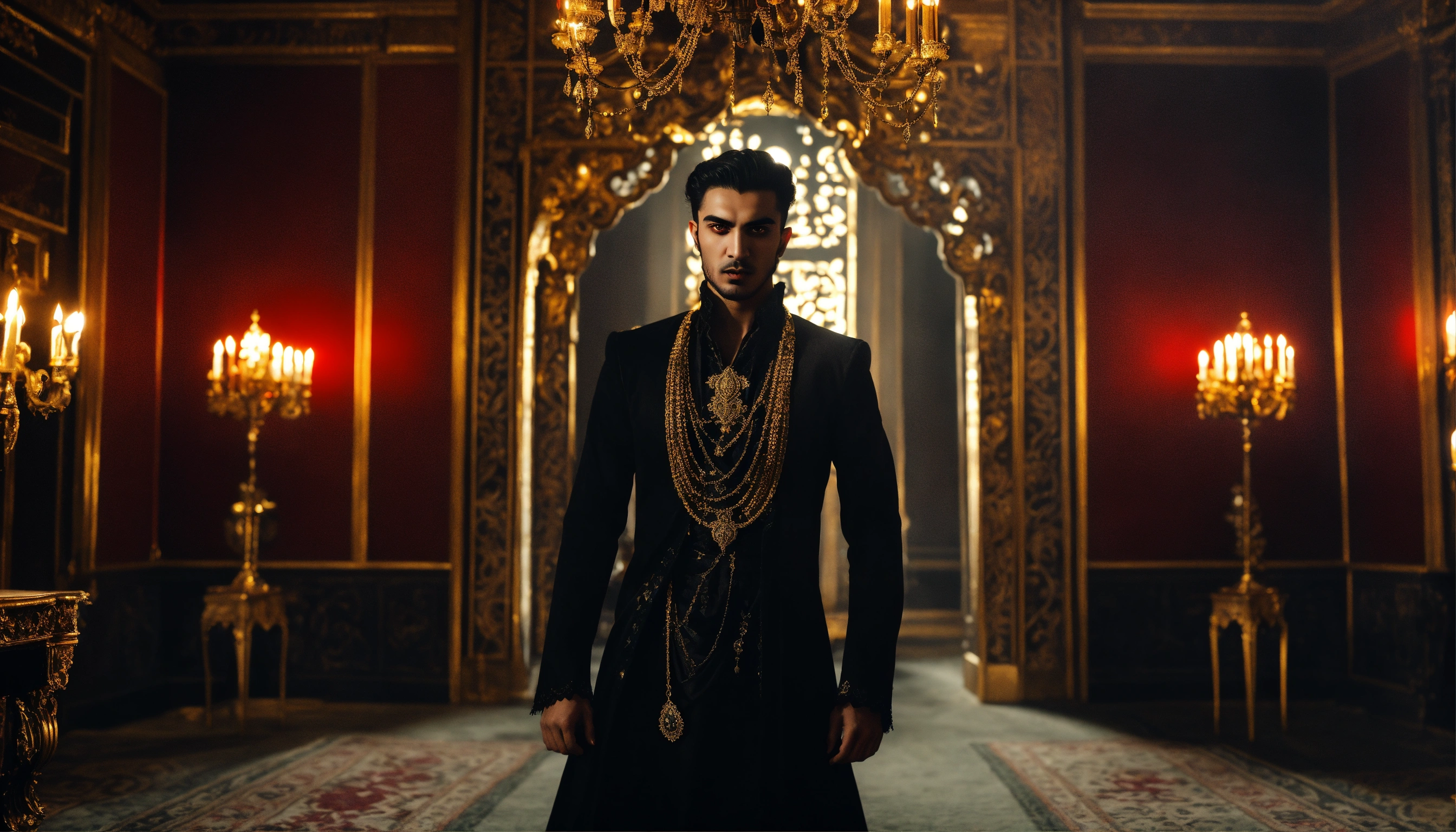 Sinister and dramatic picture of a young handsome arabic diabolical vampire with hypnotic red glowing eyes and pale white skin wearing black elaborate clothes and ornate gold jewellery in a dimly-lit palace bedroom