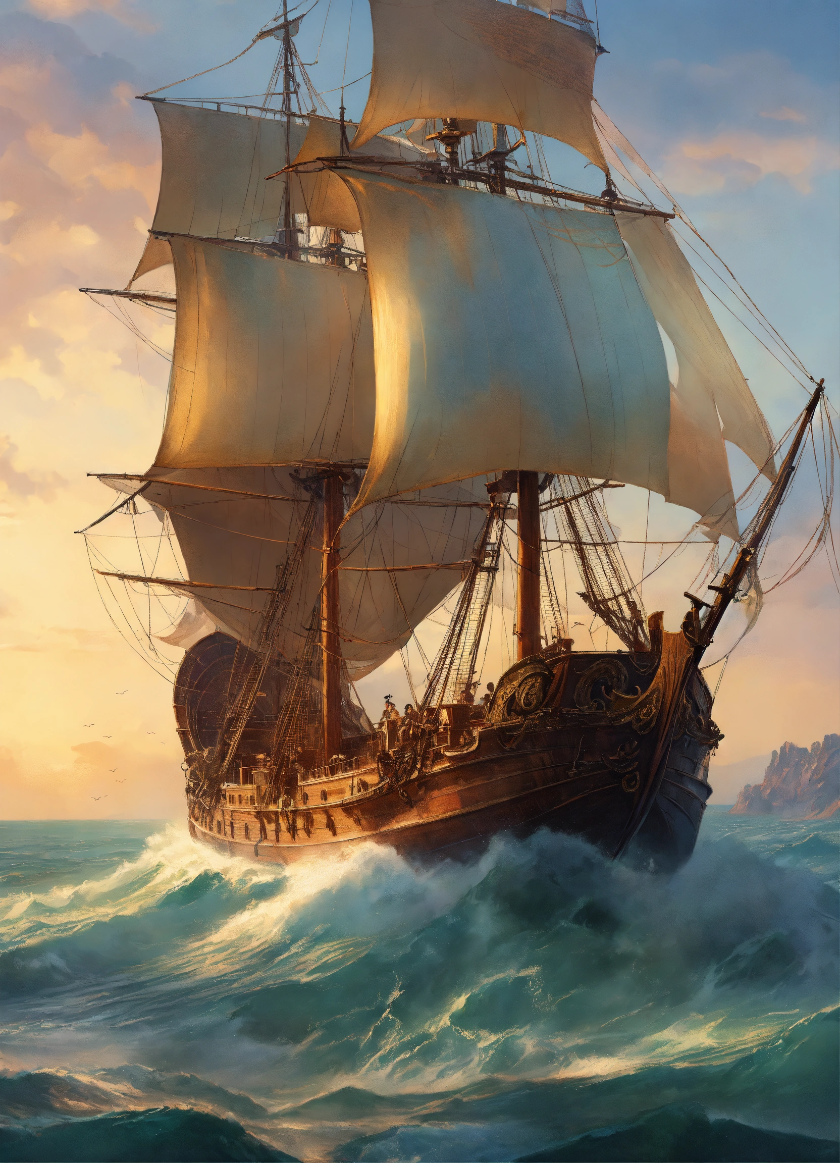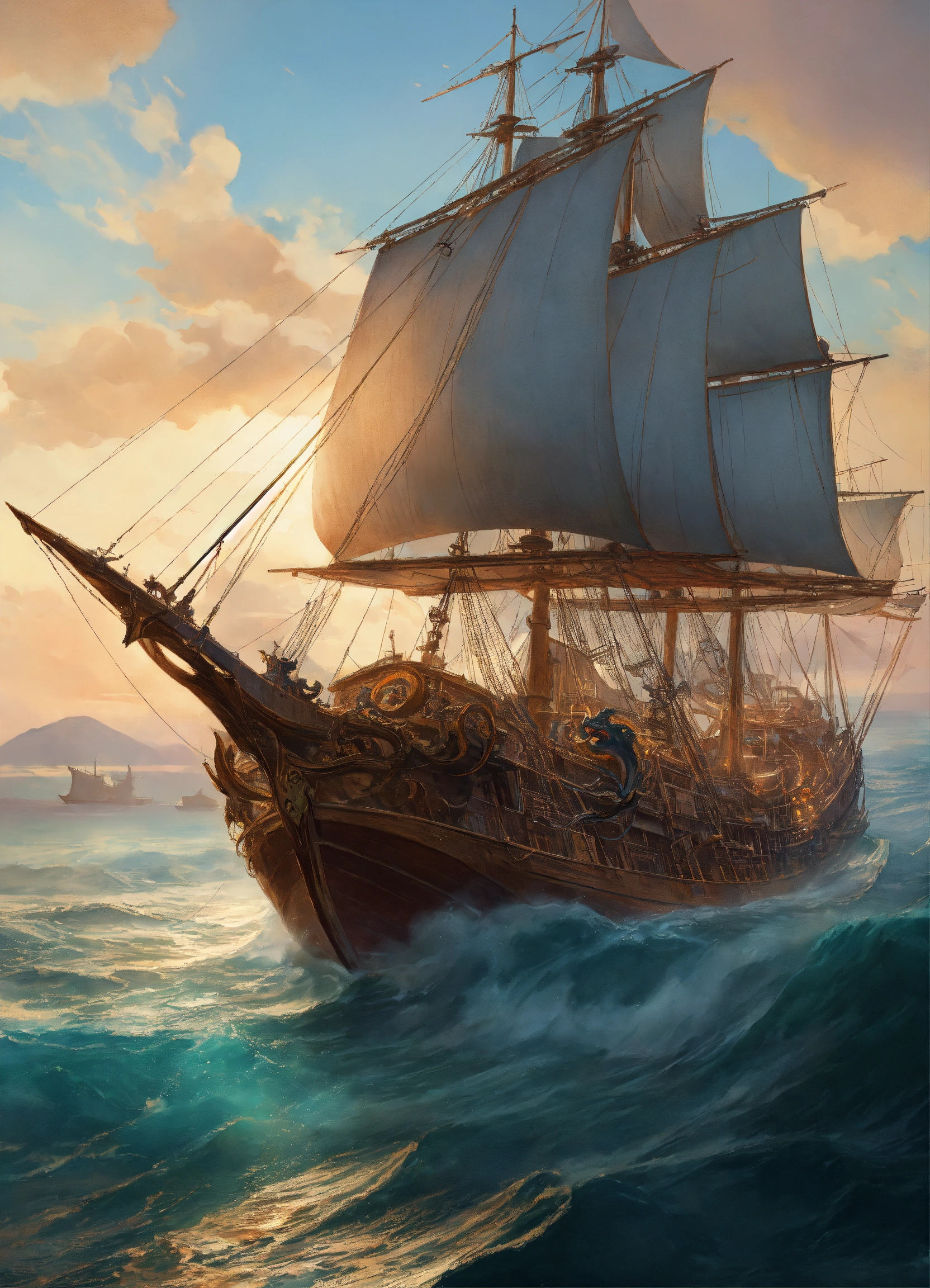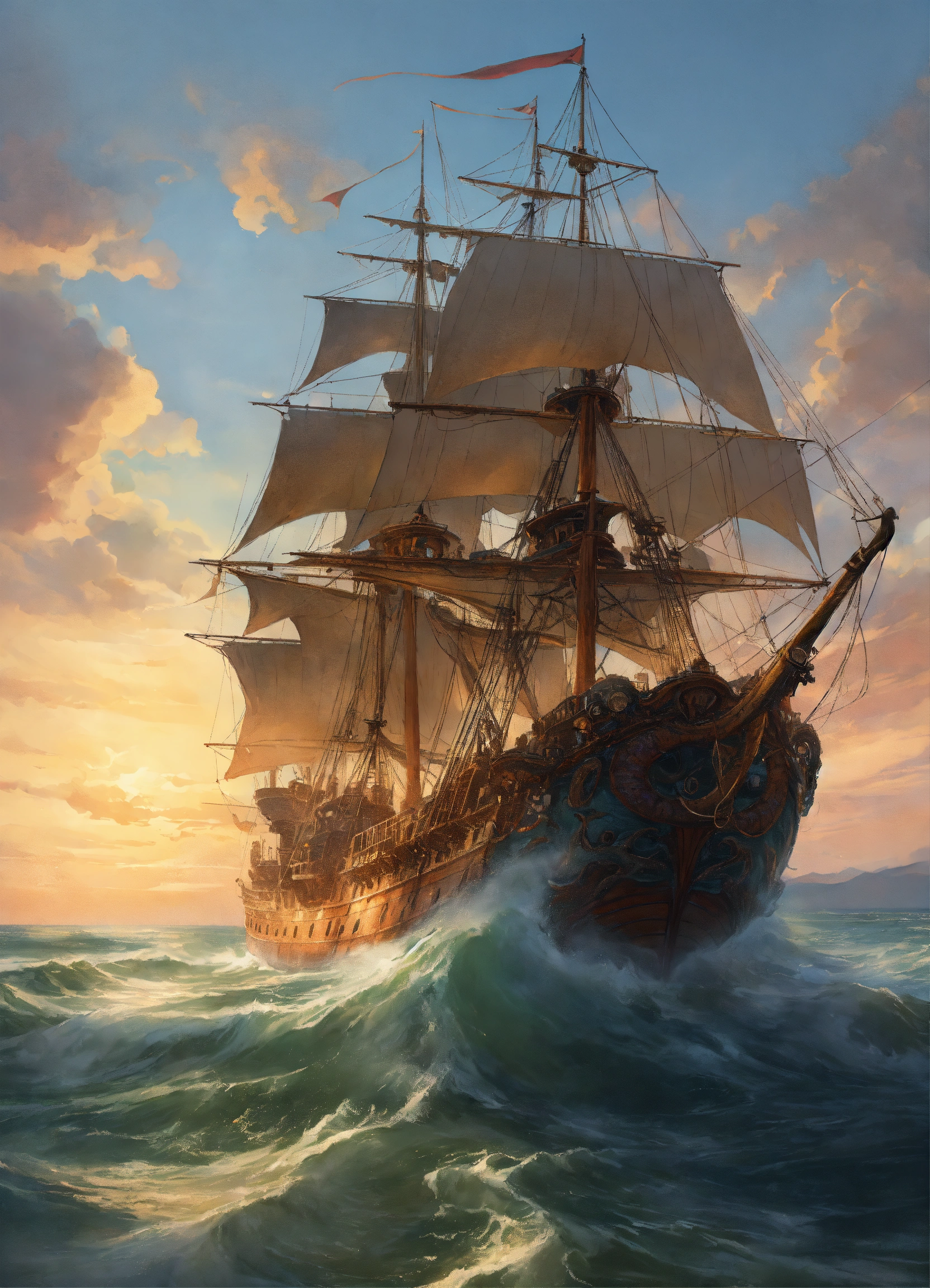 A kraken fighting a venetian galley ship, background sea plains, elegant, highly detailed, digital painting, artstation, concept art, smooth, sharp focus, illustration, art by artgerm and greg rutkowski and alphonse mucha, erte, 8k