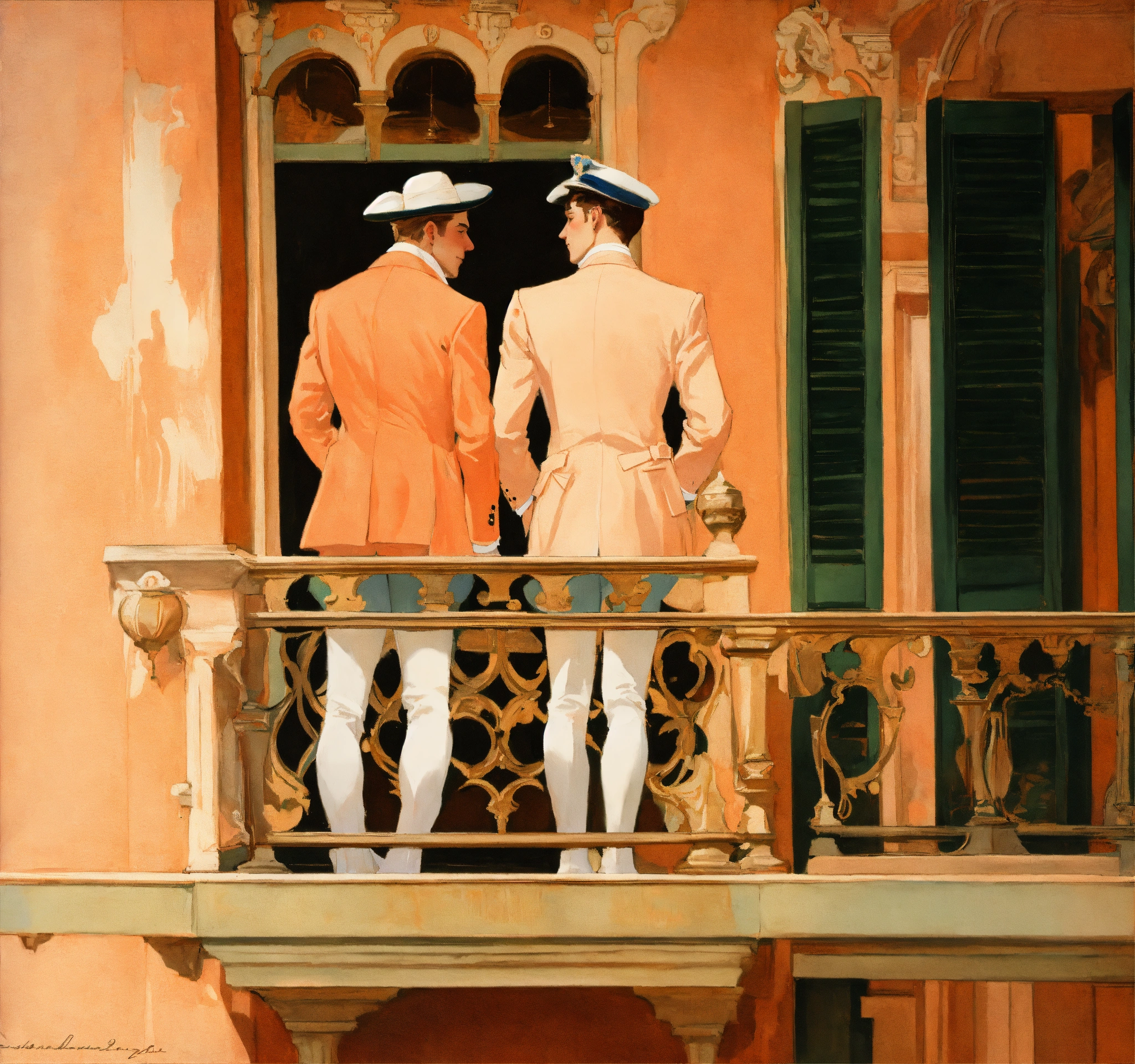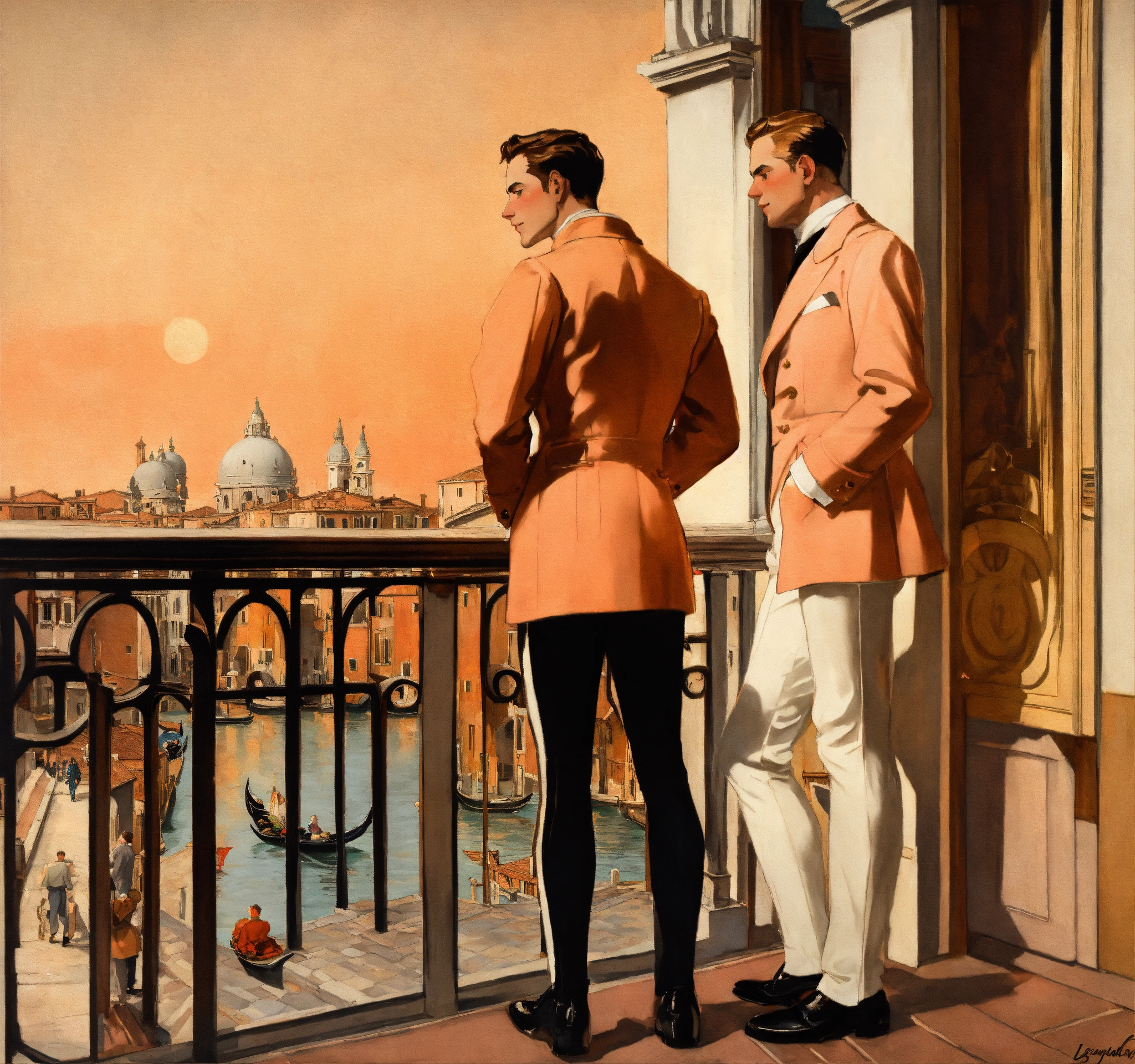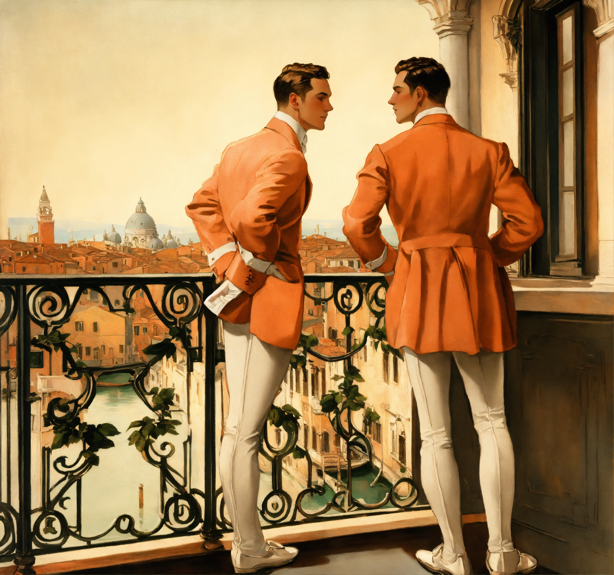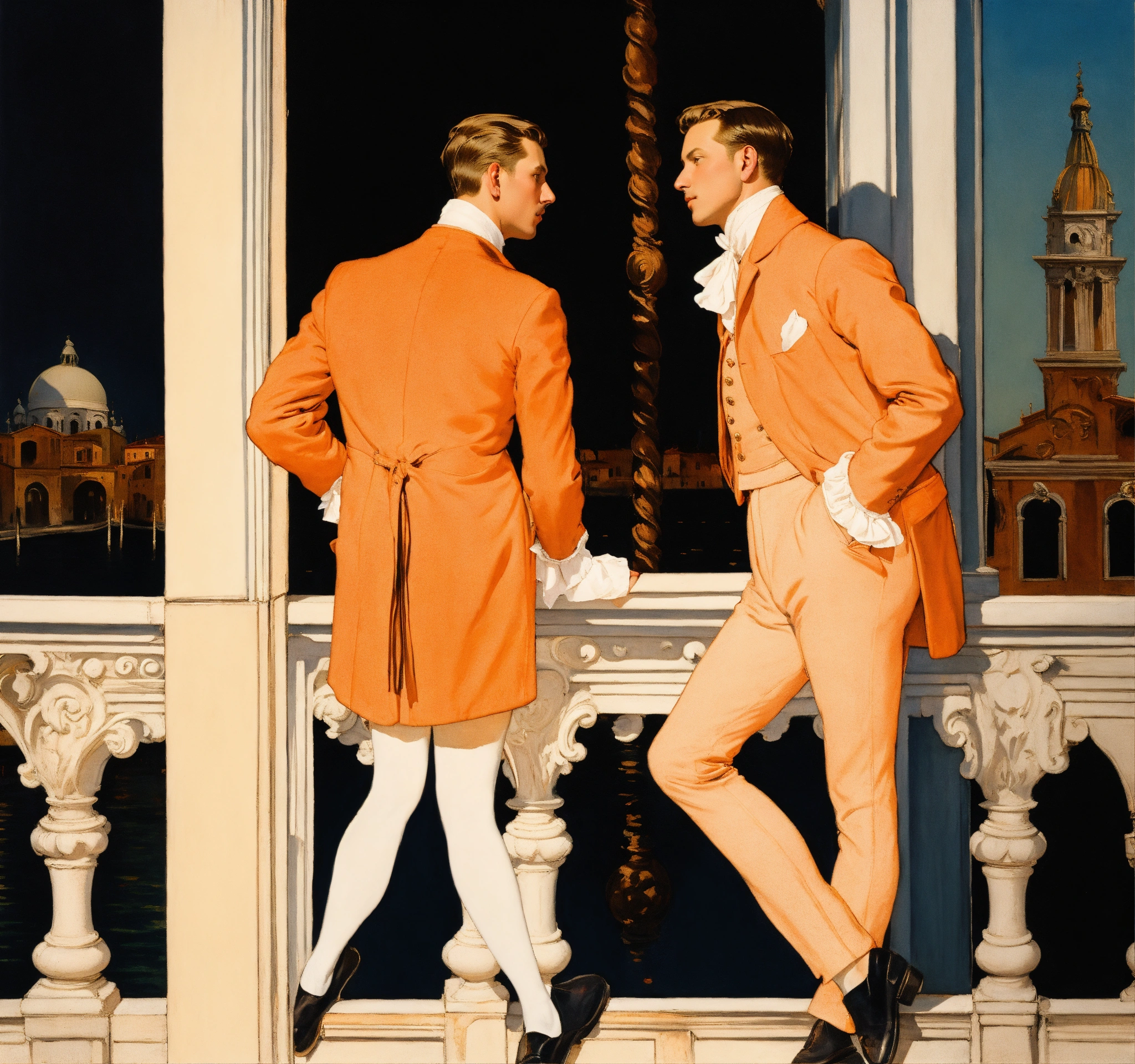 Back side, two gentleman in peach jacket and white tights leaning on a balcony in venice, leyendecker style