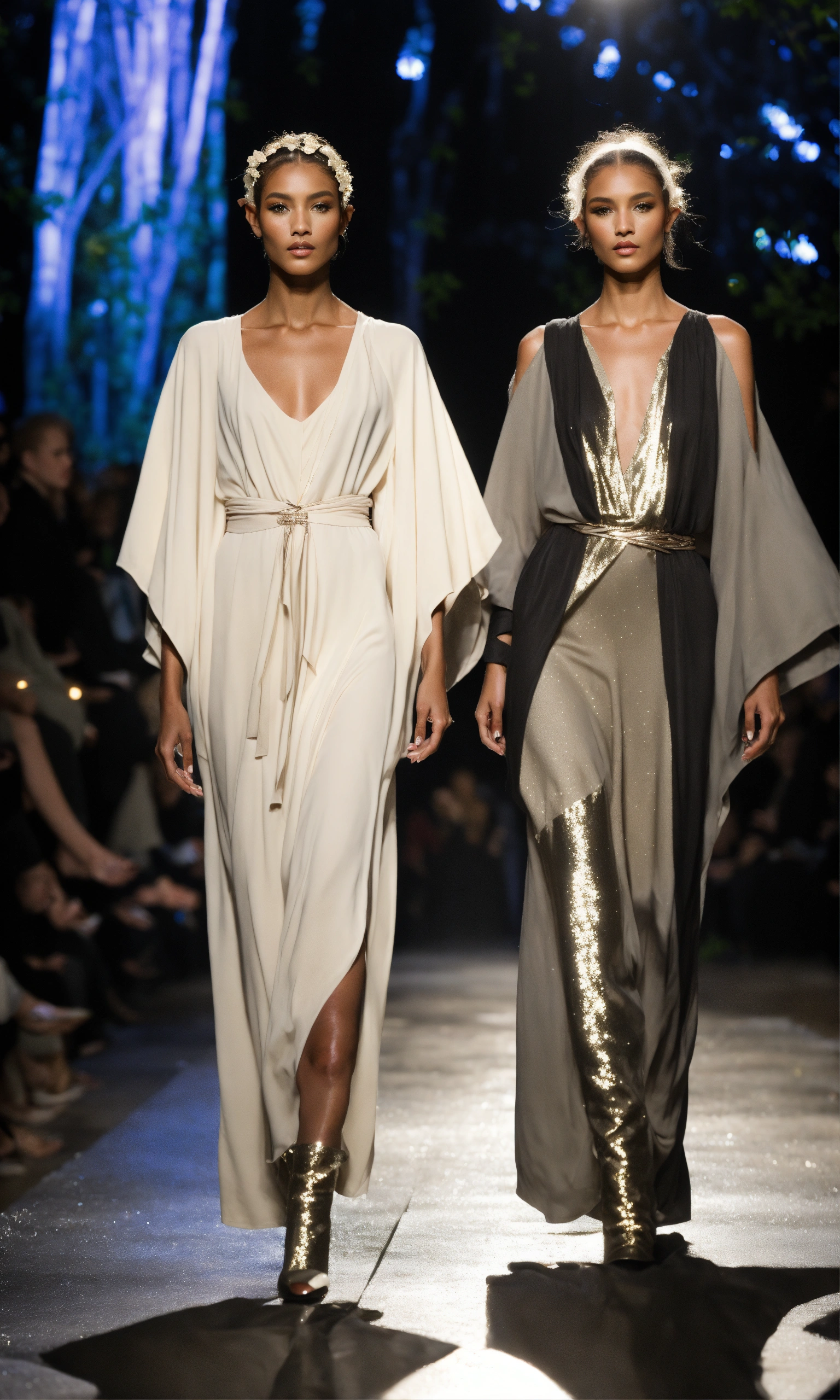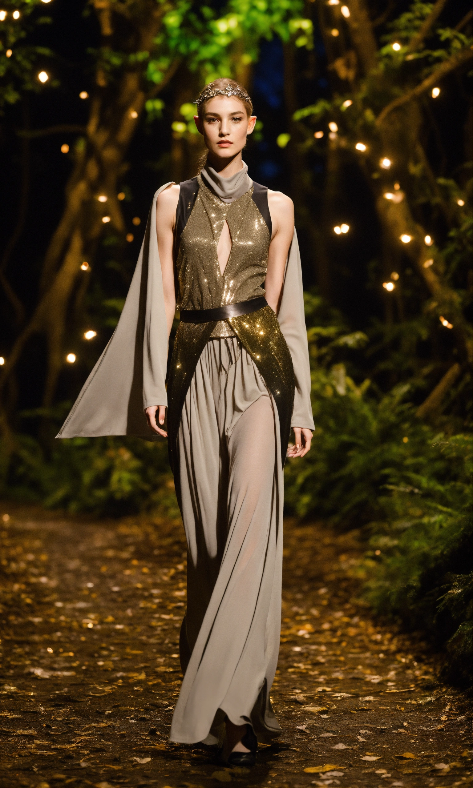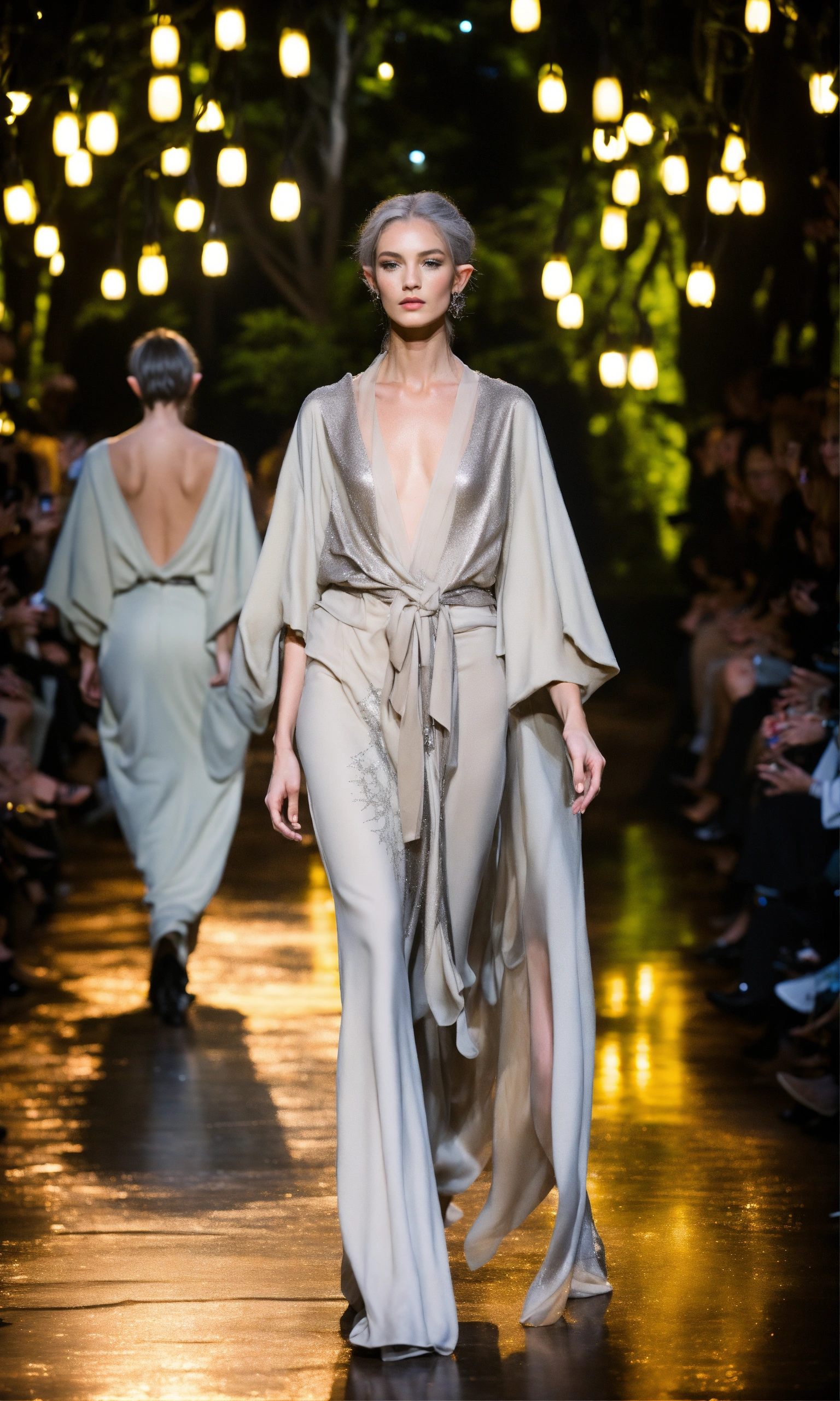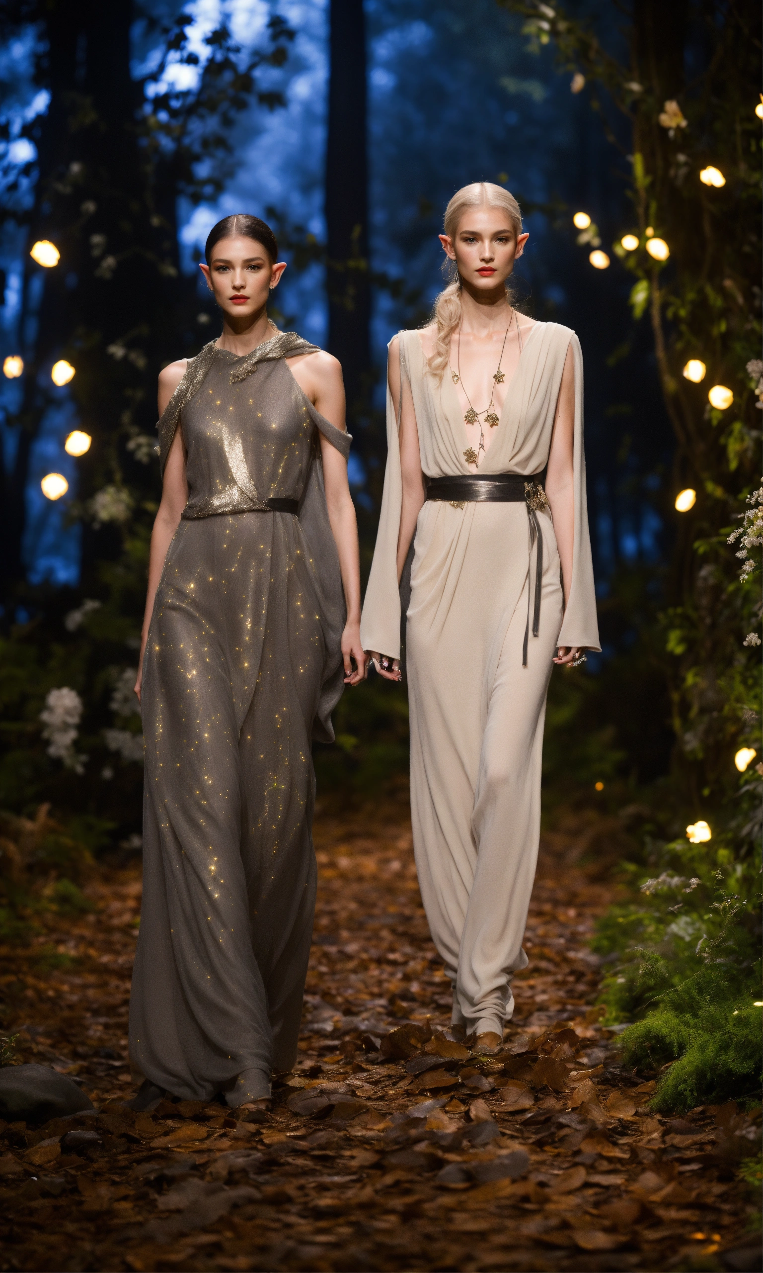 Lothlorien androgynous elves walking runway during elvin fashion week wearing dolman sleeve elvish donna karan fashion in black, white, grey, beige, stone, metallics, shimmer at an enchanted forest runway at starry nighttime, fireflies