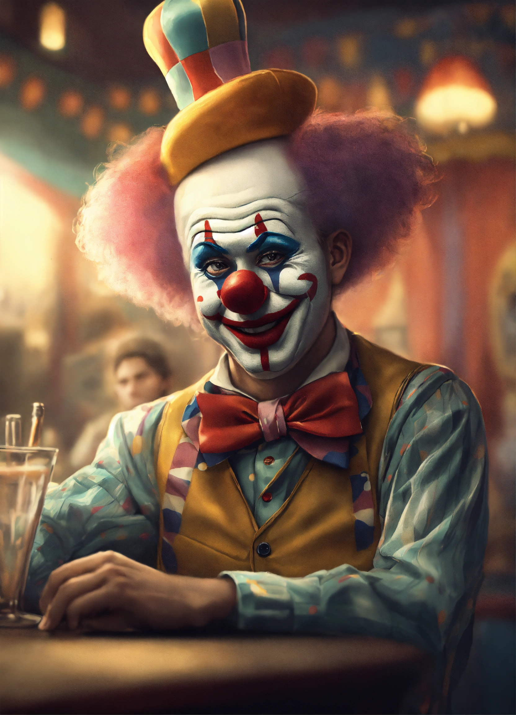 Circus clown masking himself, the half-painted face, the clown is bored with his job, standin in bar, a funny caricatured, soft thin pencil style, muted colors, factured, short focus, vanishing point, vignetting, light in contrast, highly detailed, hyper realistic, footage