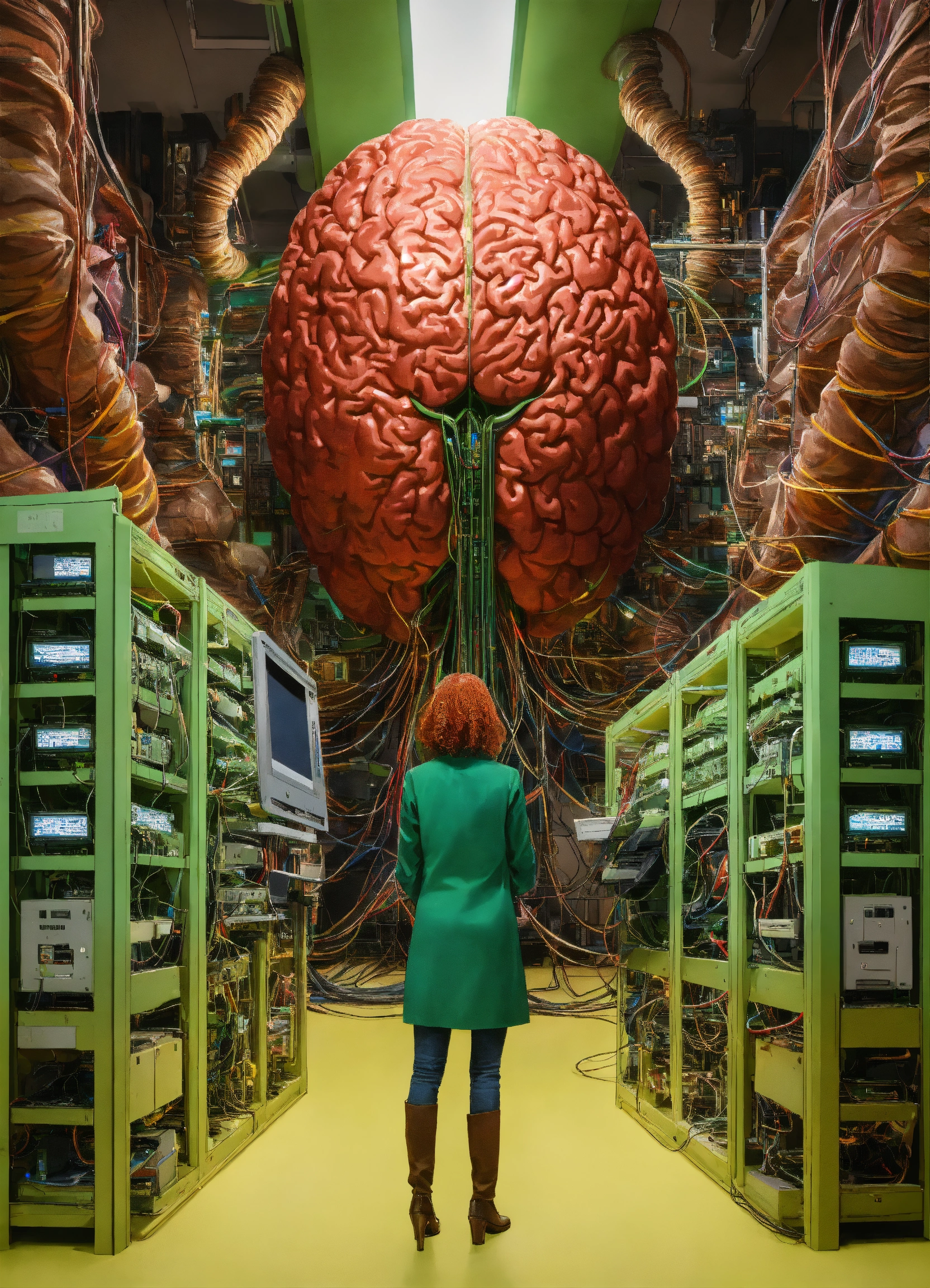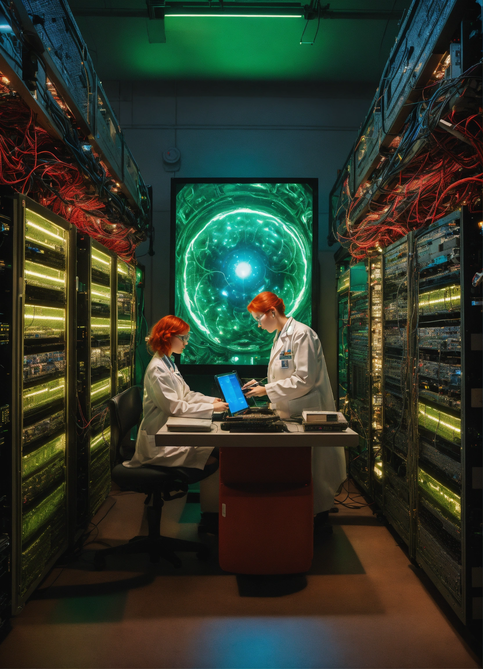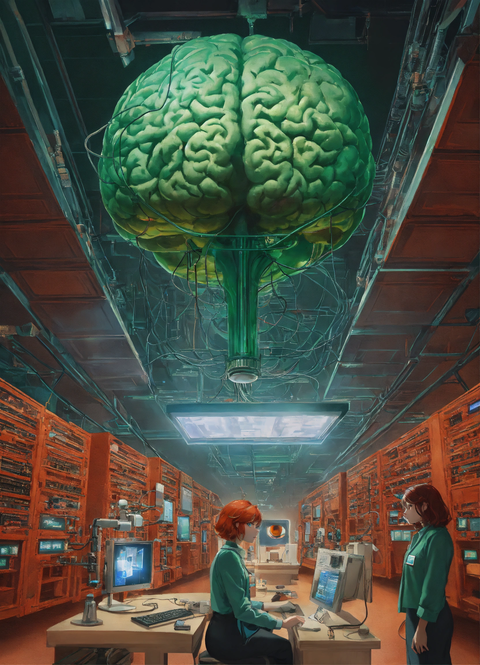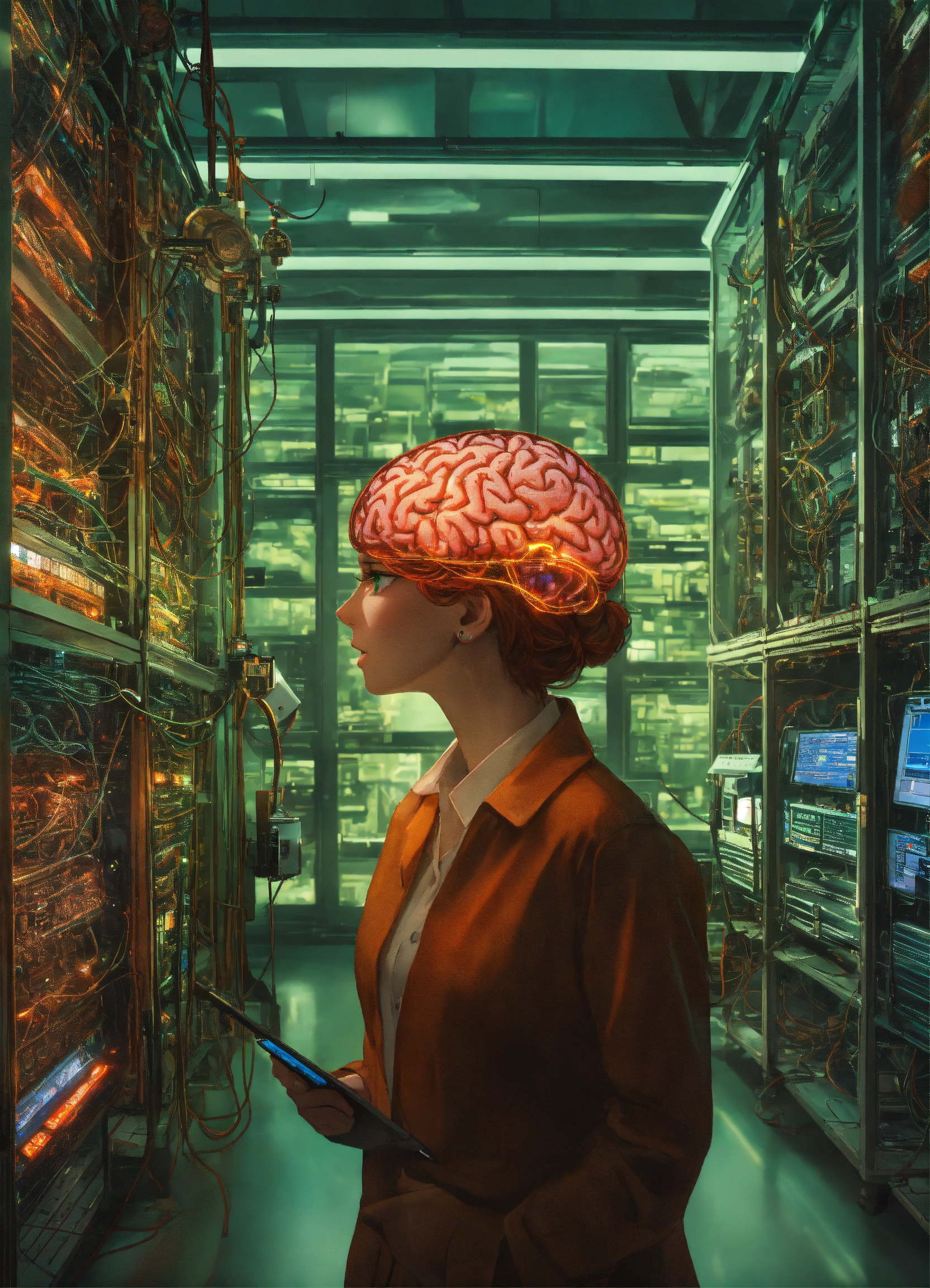 In the center of the room, a colossal human brain is intricately connected to advanced computers housed in the surrounding racks by millions of wires. this extraordinary brain possesses two eyes that fixate upon us with astonishing precision, unparalleled detail, ultra-realism and resolution at 64k, there are two alien scientists who are examining the brain. in the foreground, looking back at the point of view is a red headed, green eyed female scientist, studying a tablet.
