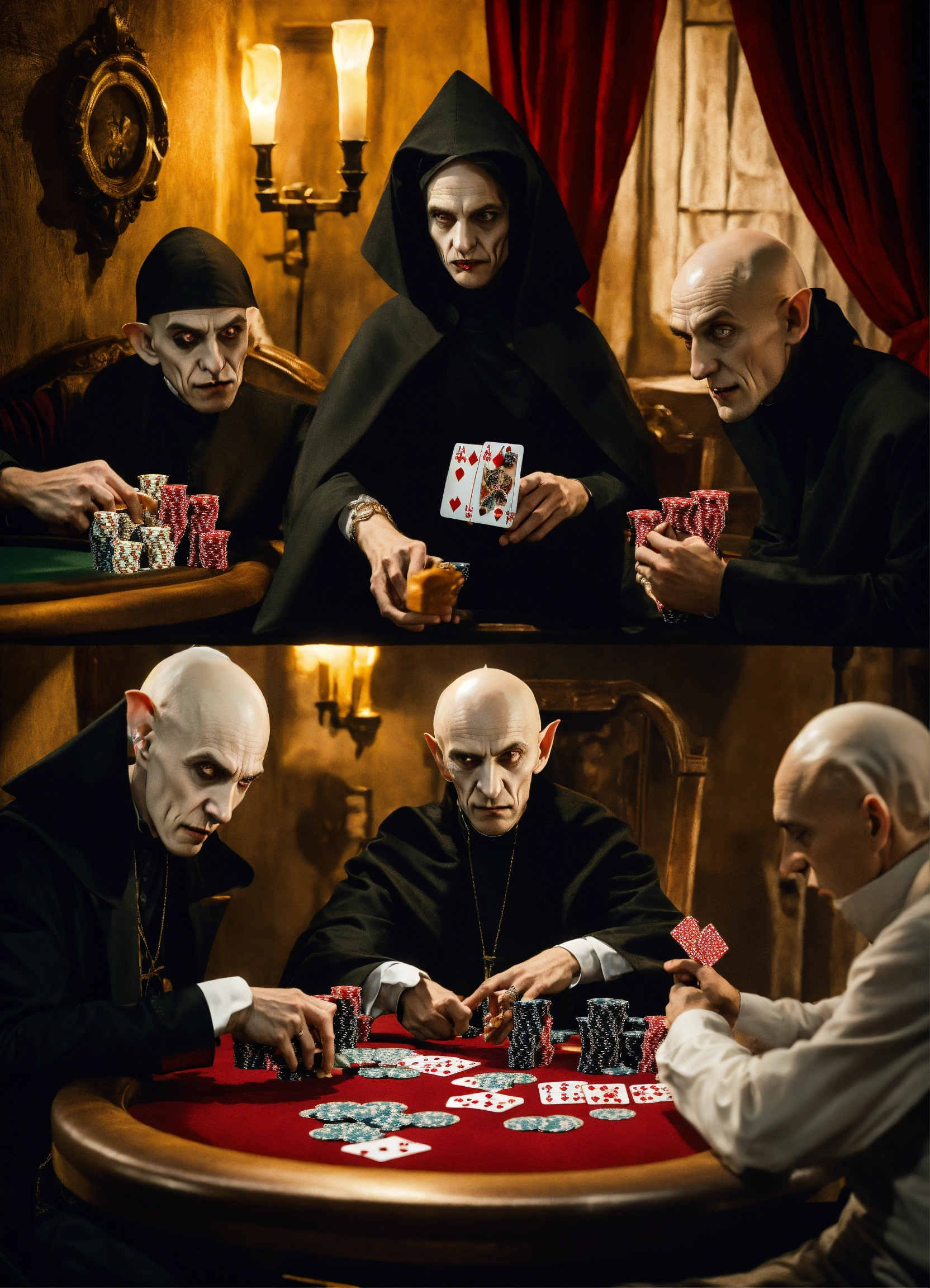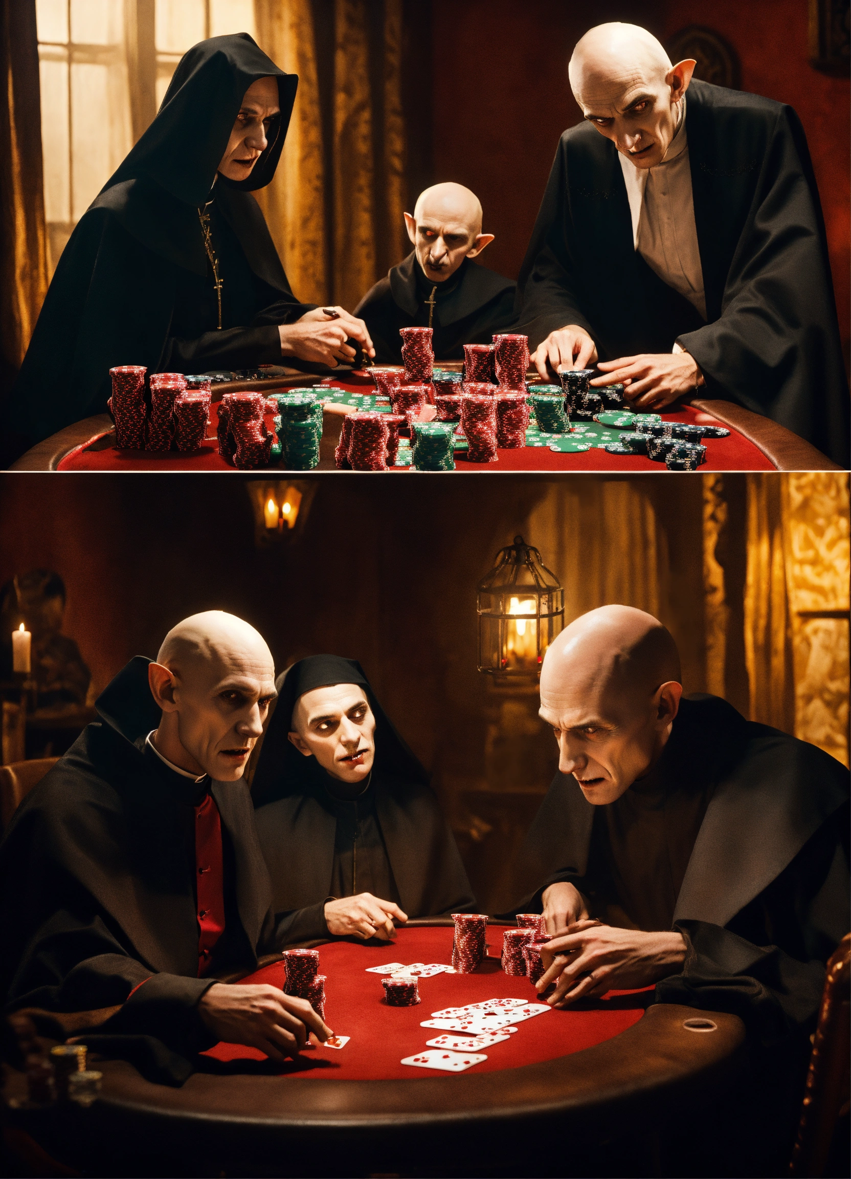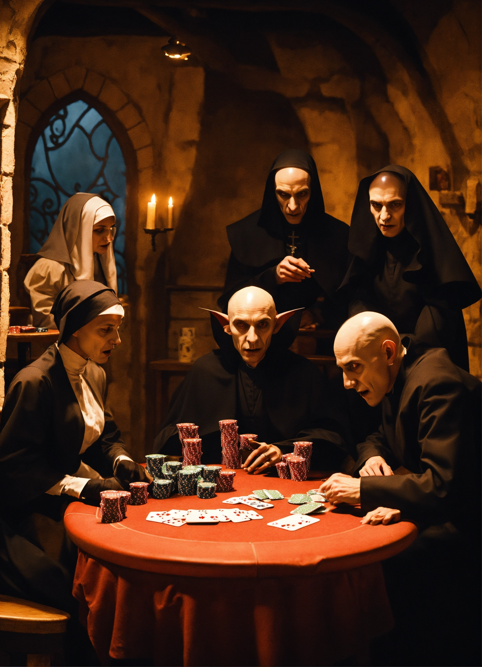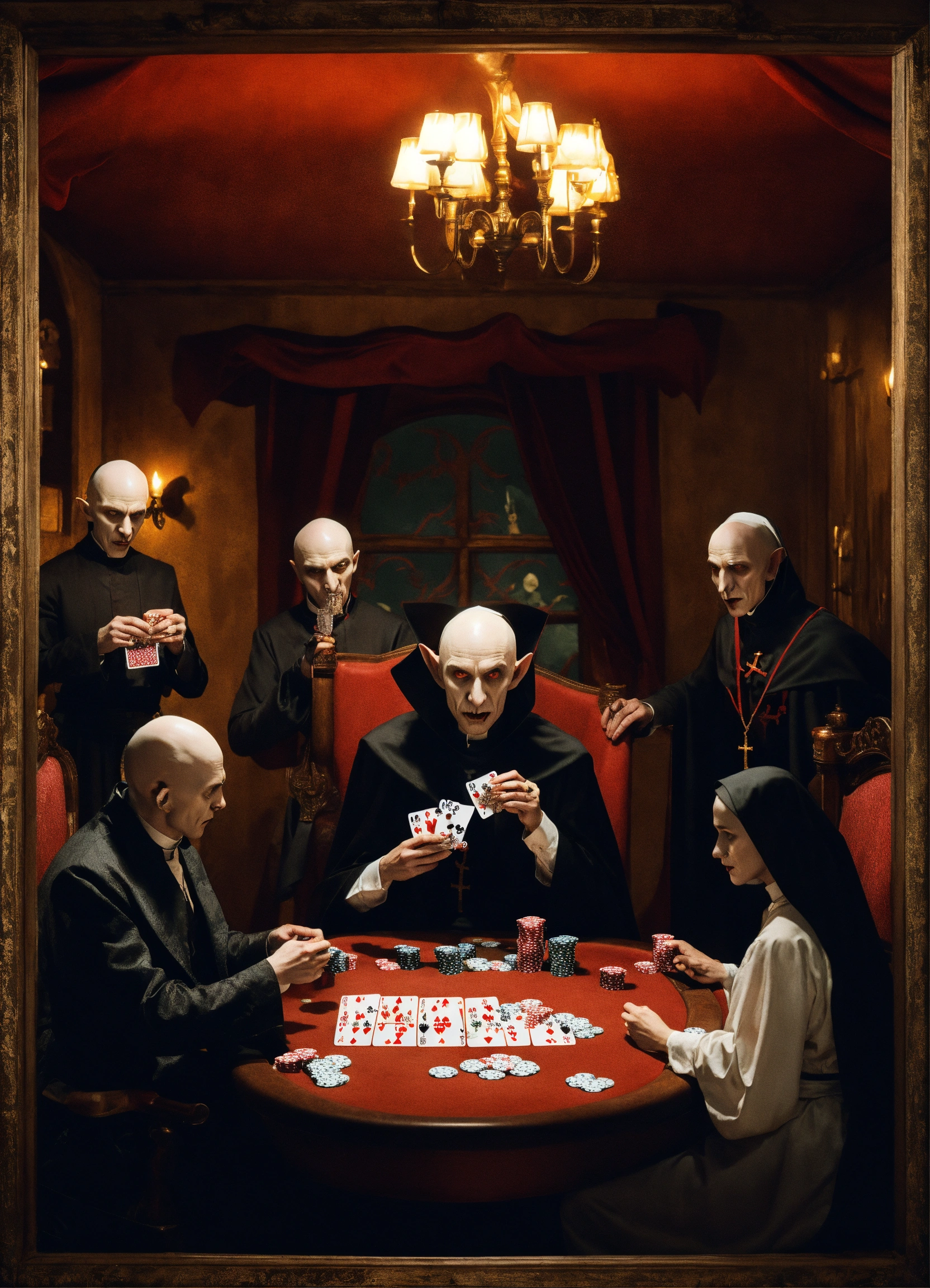 Nosferatu, dracula and their friends sitting playing poker in jigsaw and the nun's playhouse, realistic and photographic images in high resolution