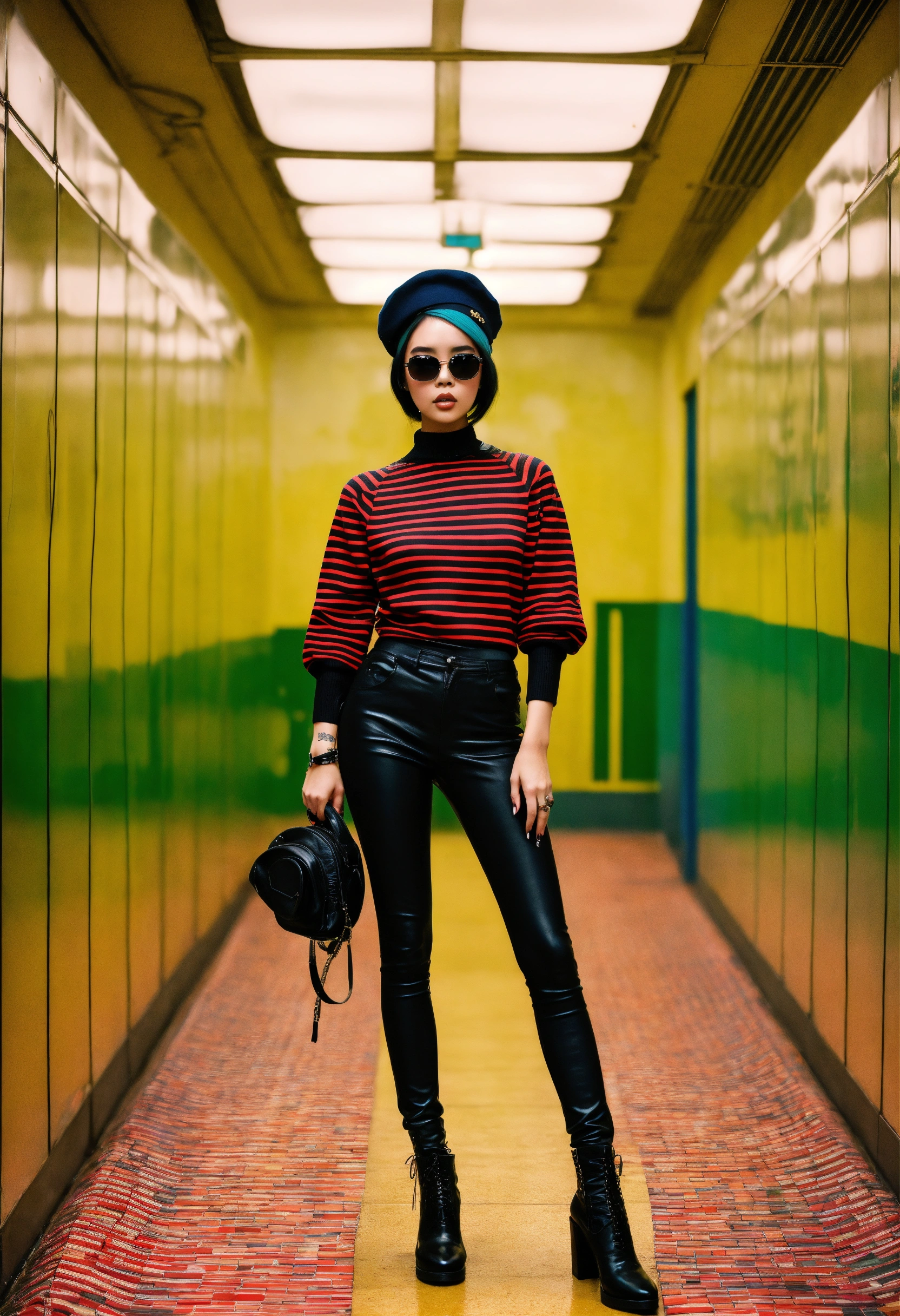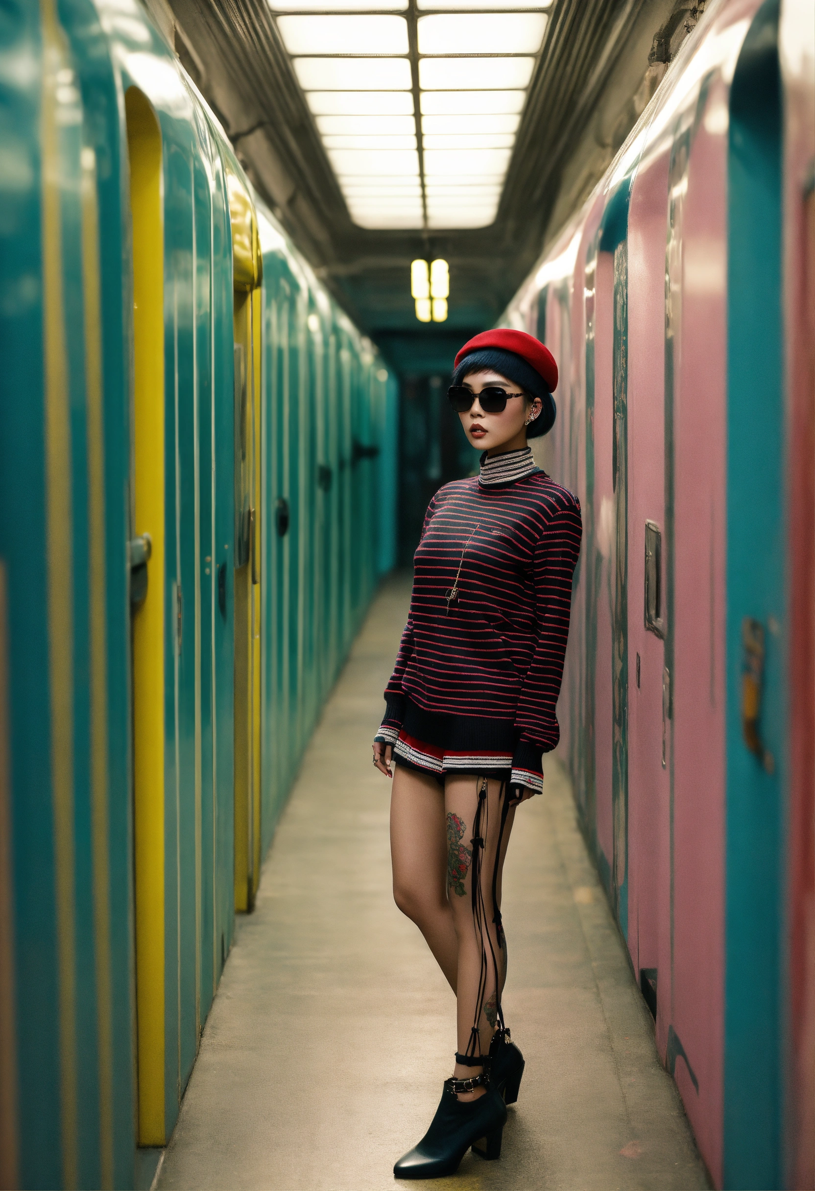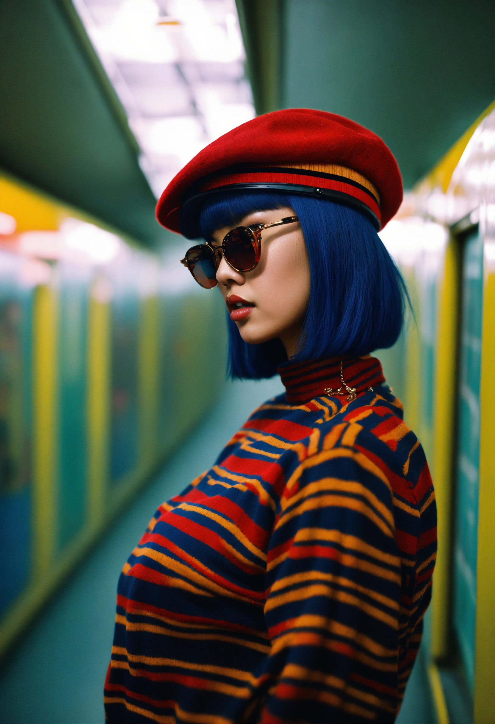 Front profile half body photography, in the tube corridor, a punk 80's asian model woman with a 50's beret, in a minimal large striped pattern pullover and large sunglasses, 80 degree view, art by sergio lopez, natalie shau, james jean, salvador dali, and an emo 2000's european man.
