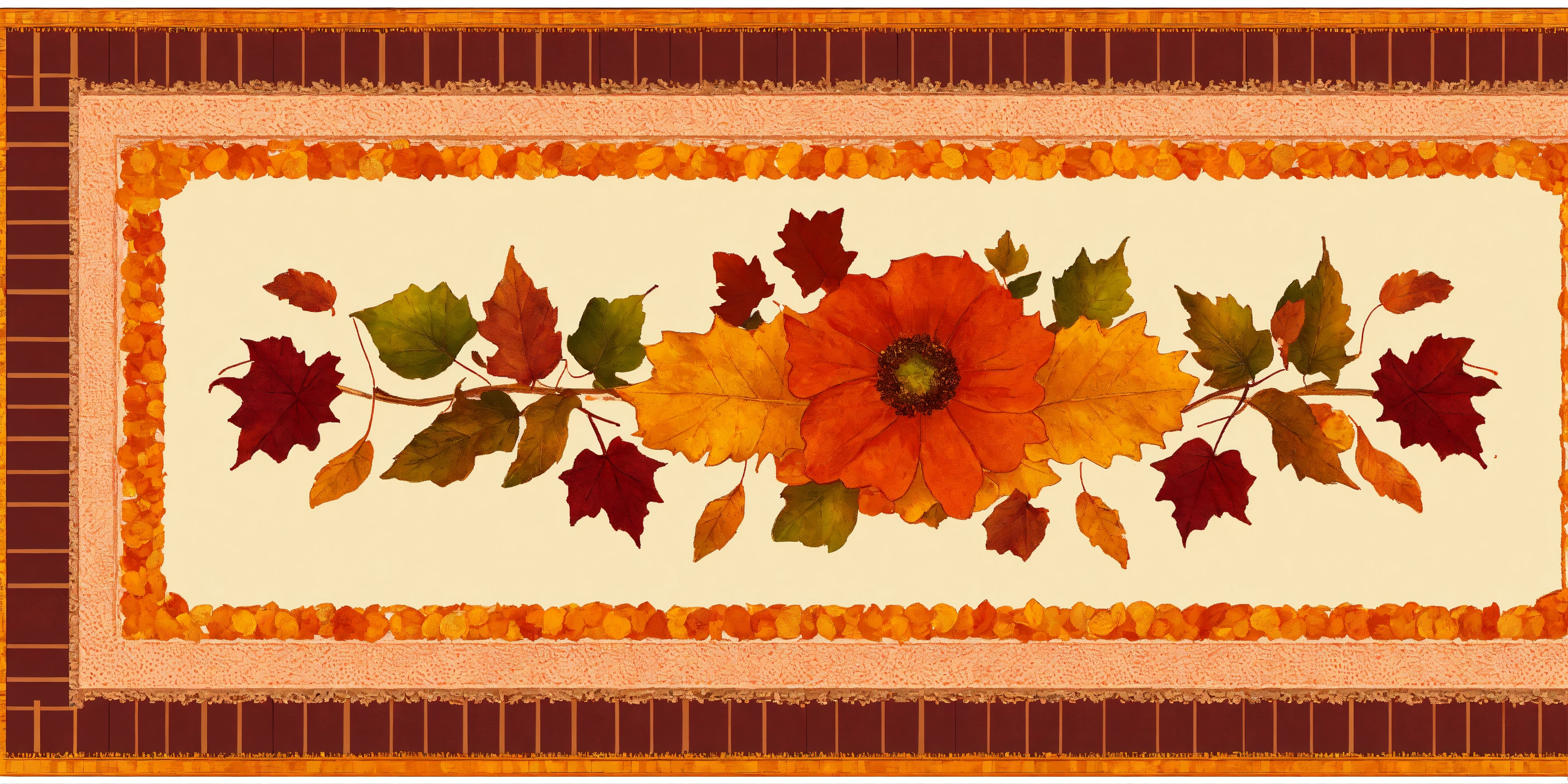 Illustrate a rectangle tablecloth with an oblong center panel with a lacy design. draw 3 pretty borders. border 1 is filled with many small orange, red, and gold autumn leaves. border 2 has an orange and brown, gingham border lined with a pretty scrolling design. border 3 has a combination of autumn colors. symmetry on all sides. tan and orange, gold, and red.