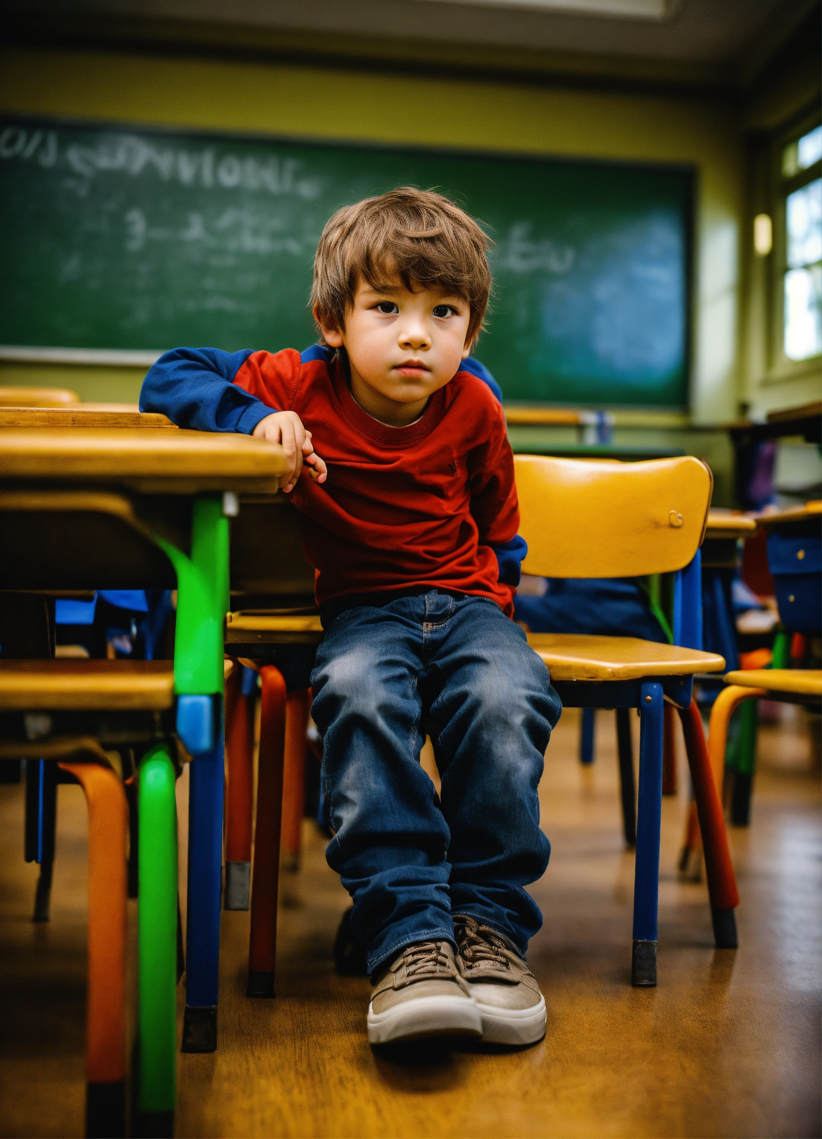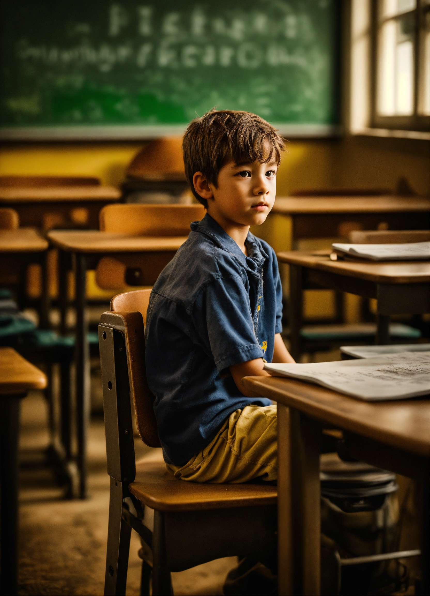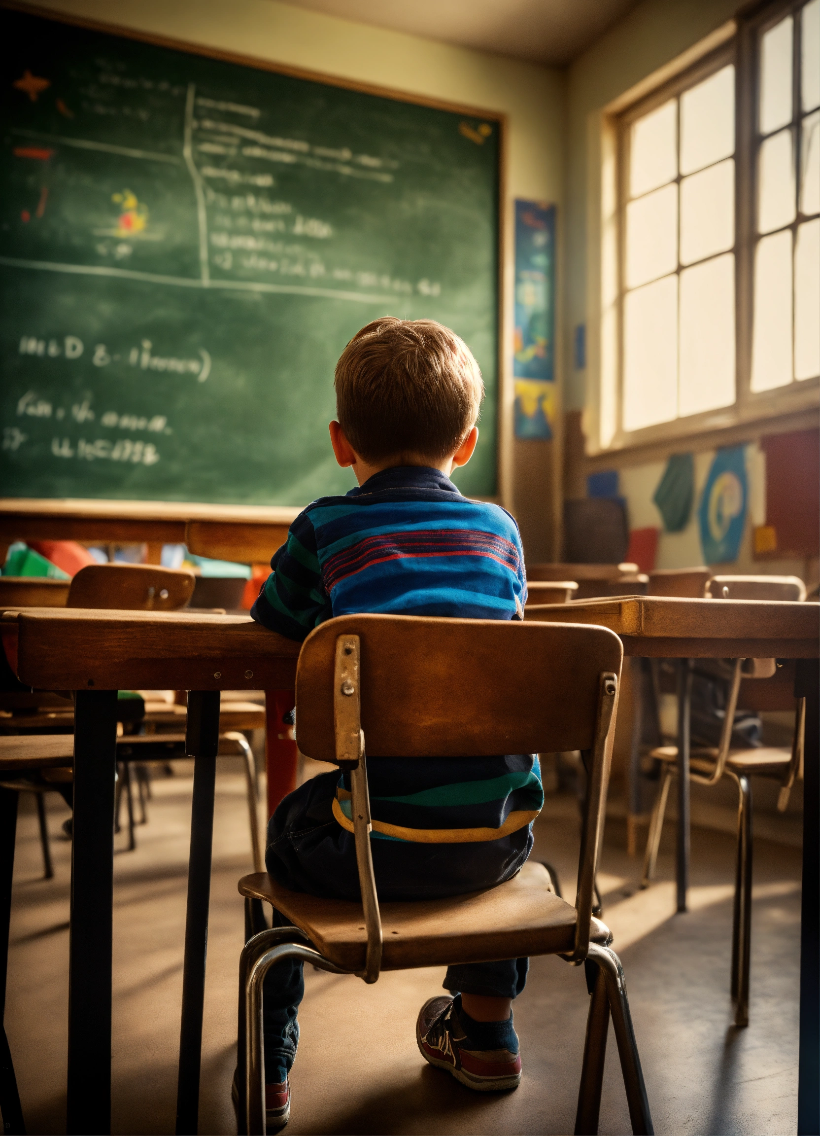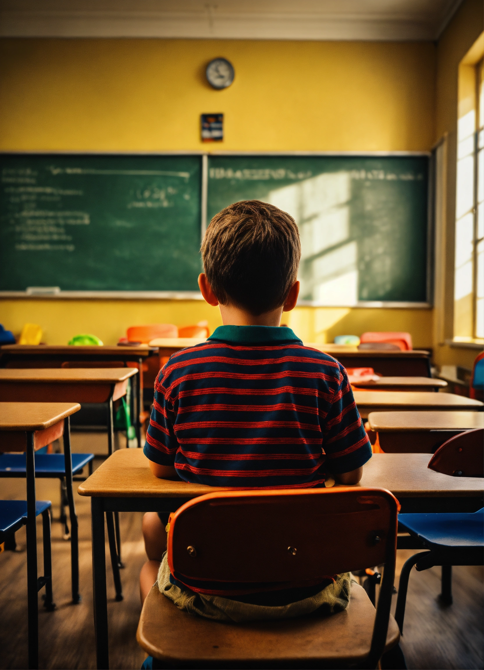 Child sitting with his back in a classroom, fresh perspective in the style of photo real, hyper-realistic, high dynamic range, rich colors, lifelike textures, 8k uhd, high color depth, nikon d 850, kodak portra 400, fujifilm xt