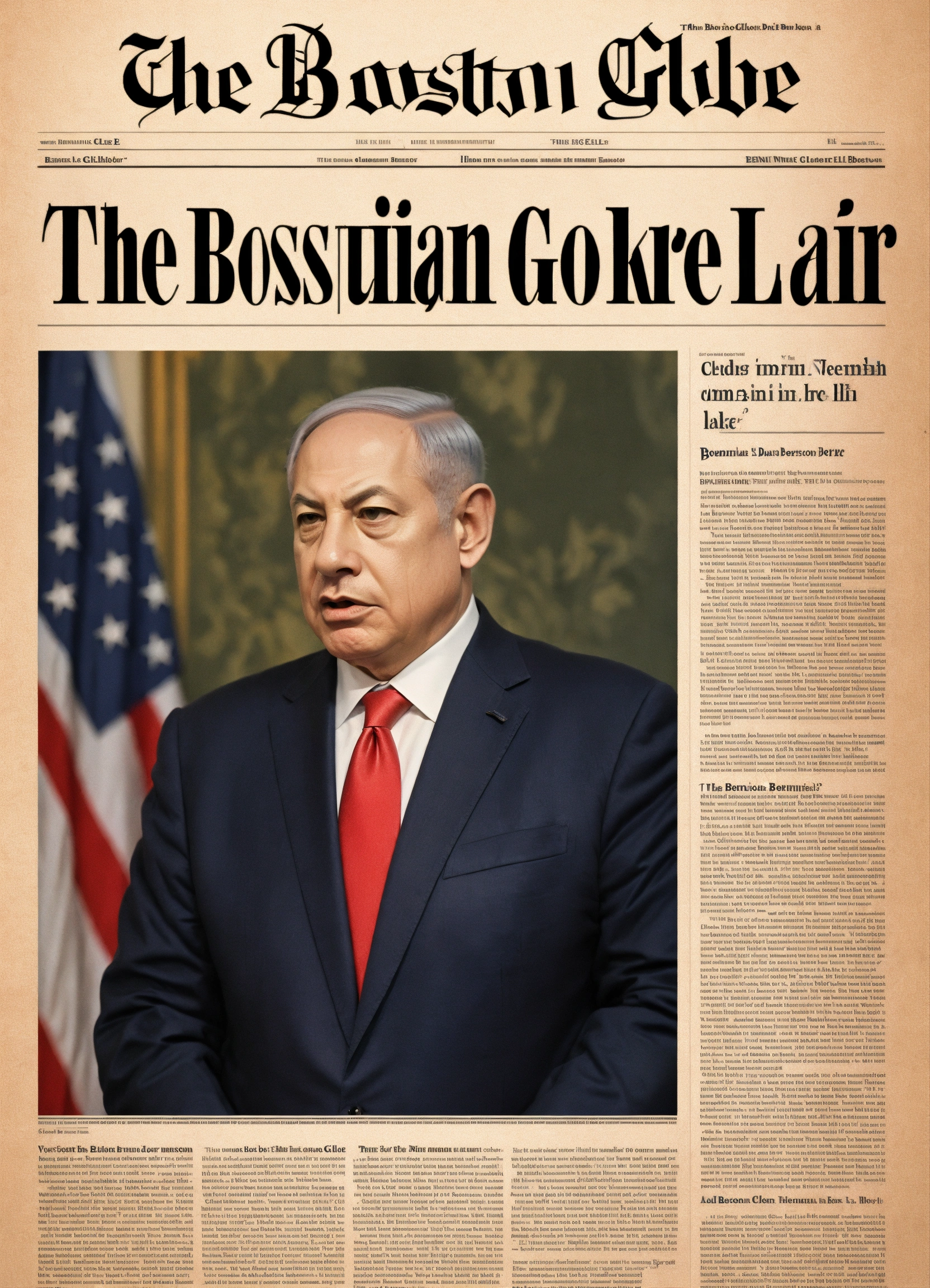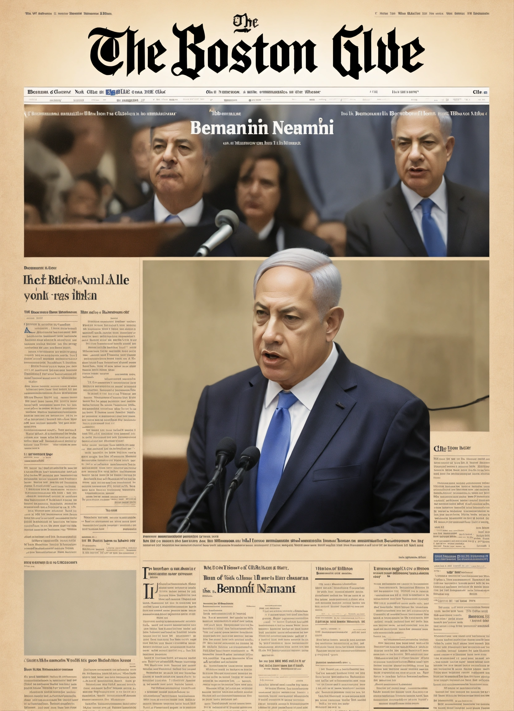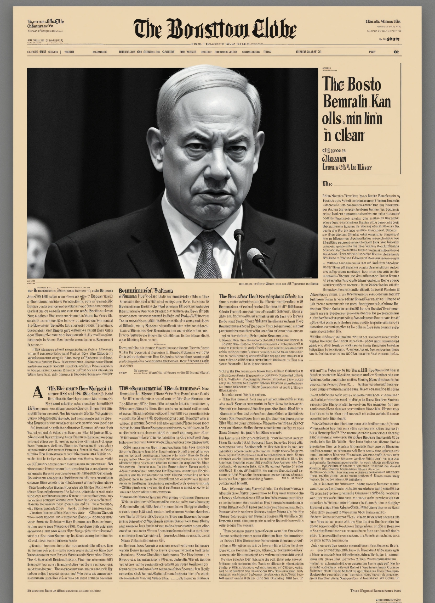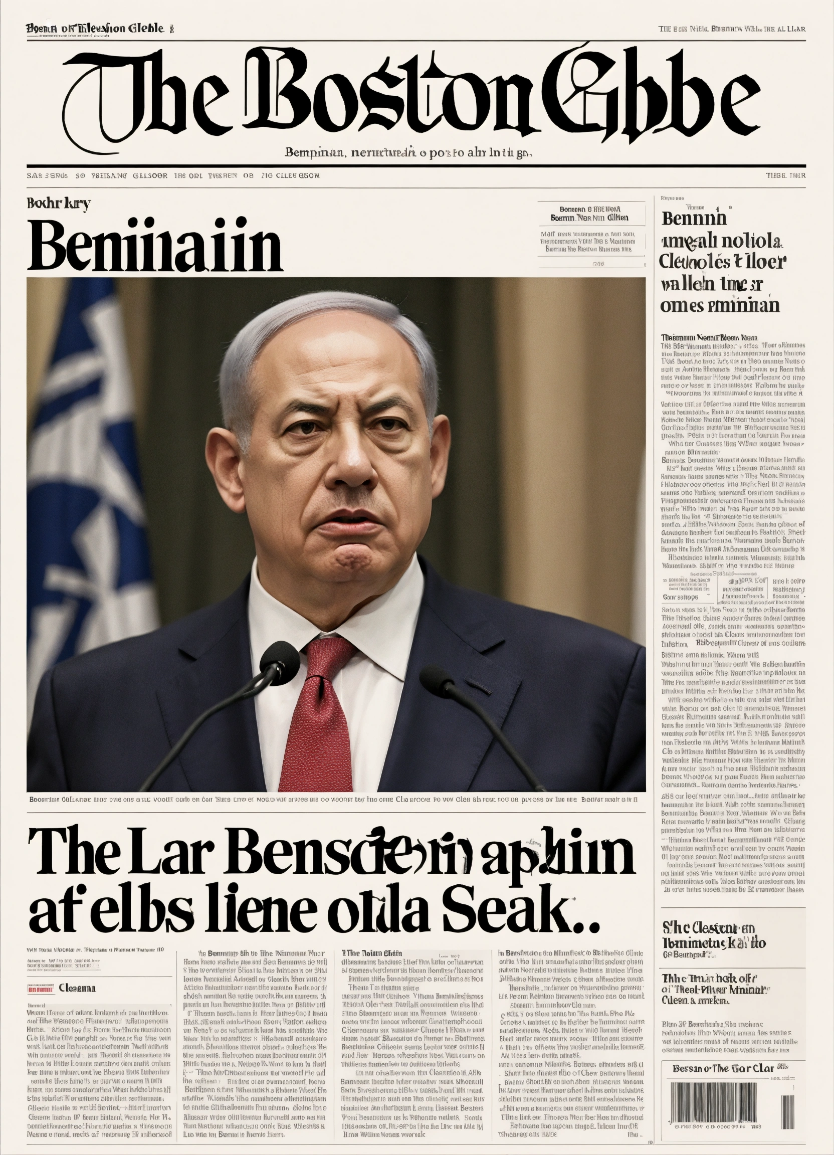 "the boston globe" front page of benjamin netanyahu, looking angry, old, minimalistic, article's text "the liar", clean, typography