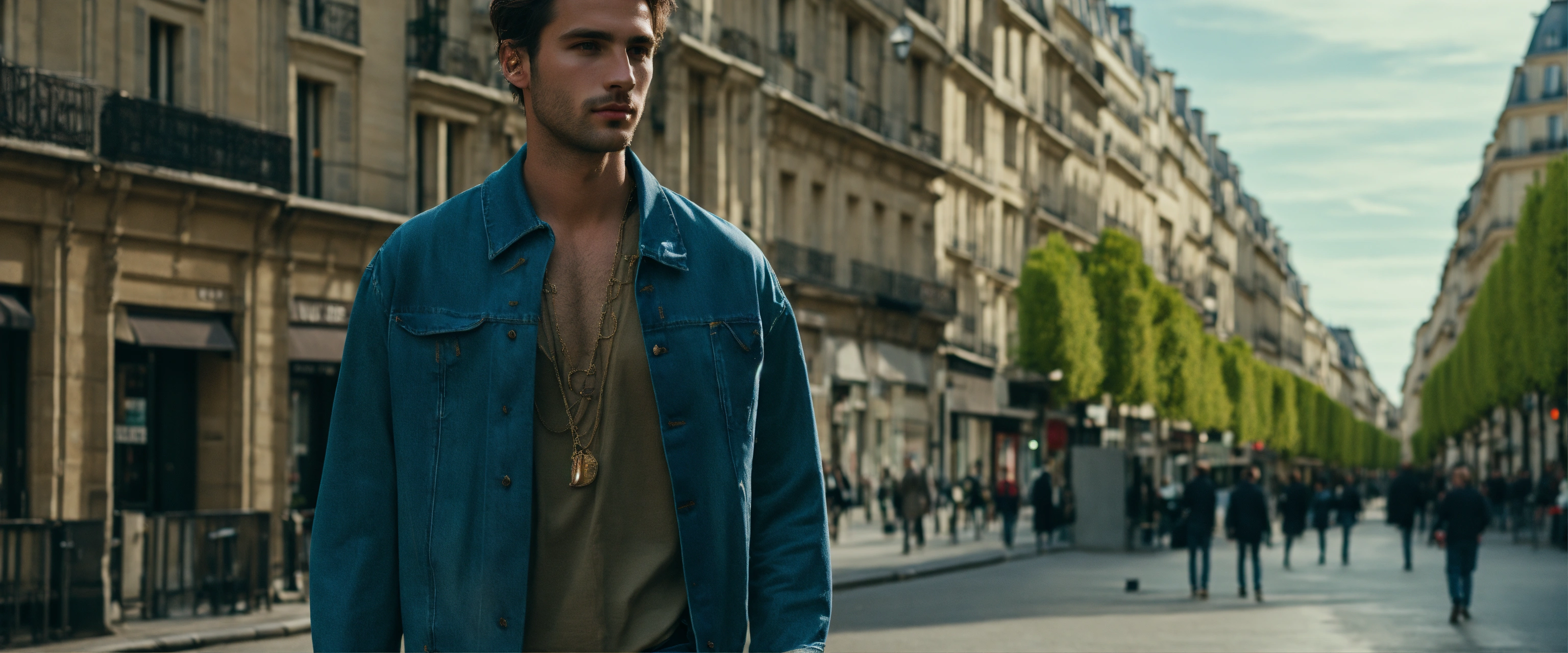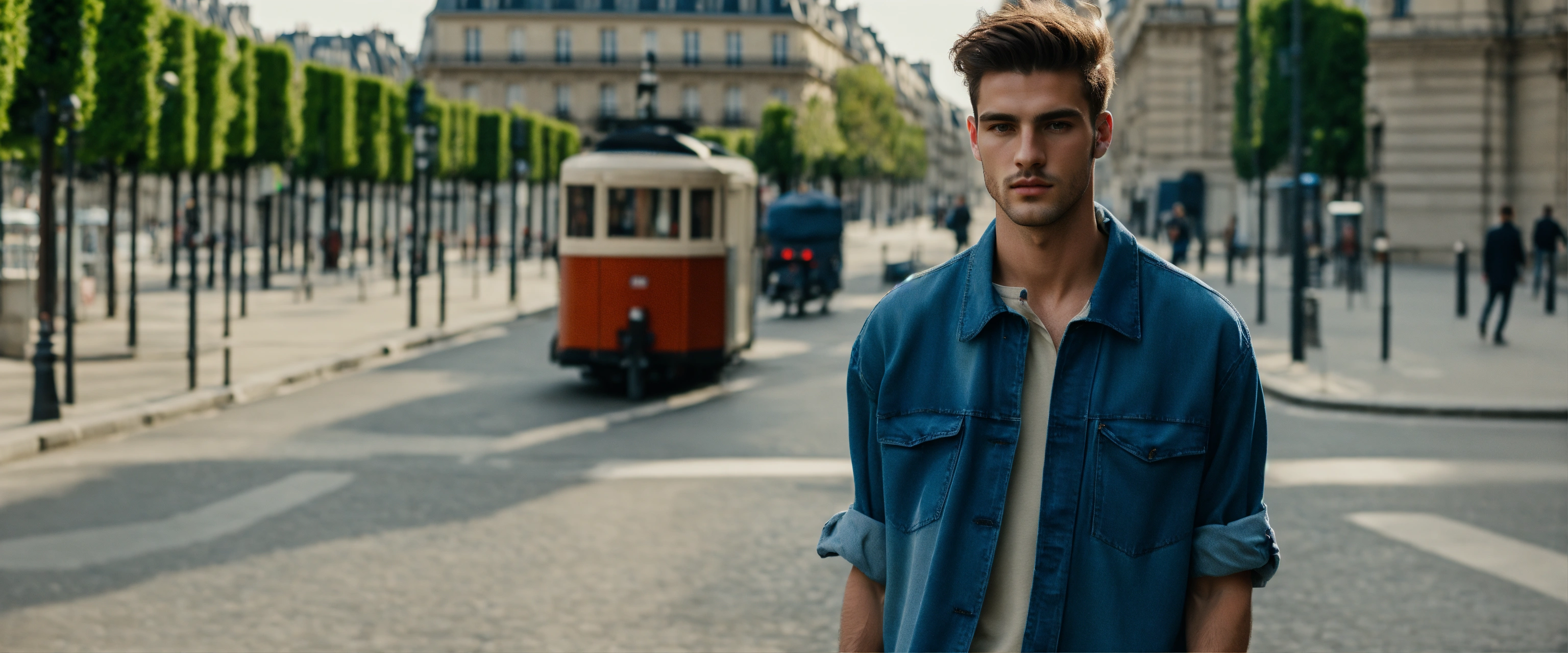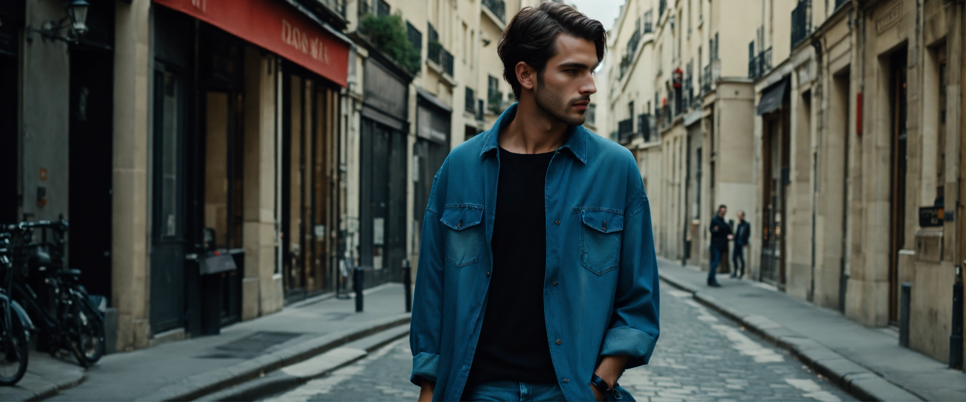 Ultra realistic 8k, full body photo of tall french male model modeling upscale dolman sleeve travel inspired grunge denim outfit with cool elements in paris, cinematic light