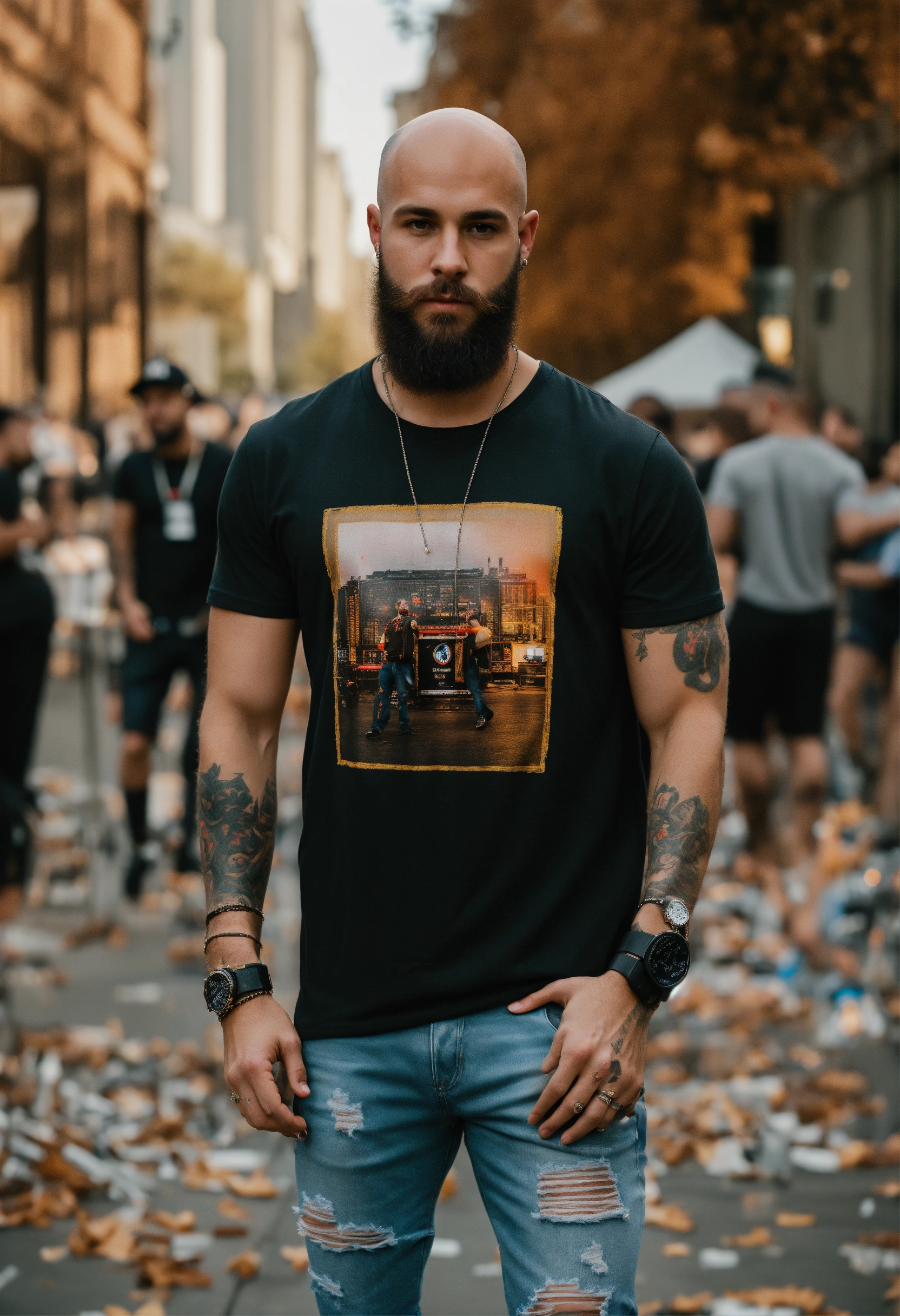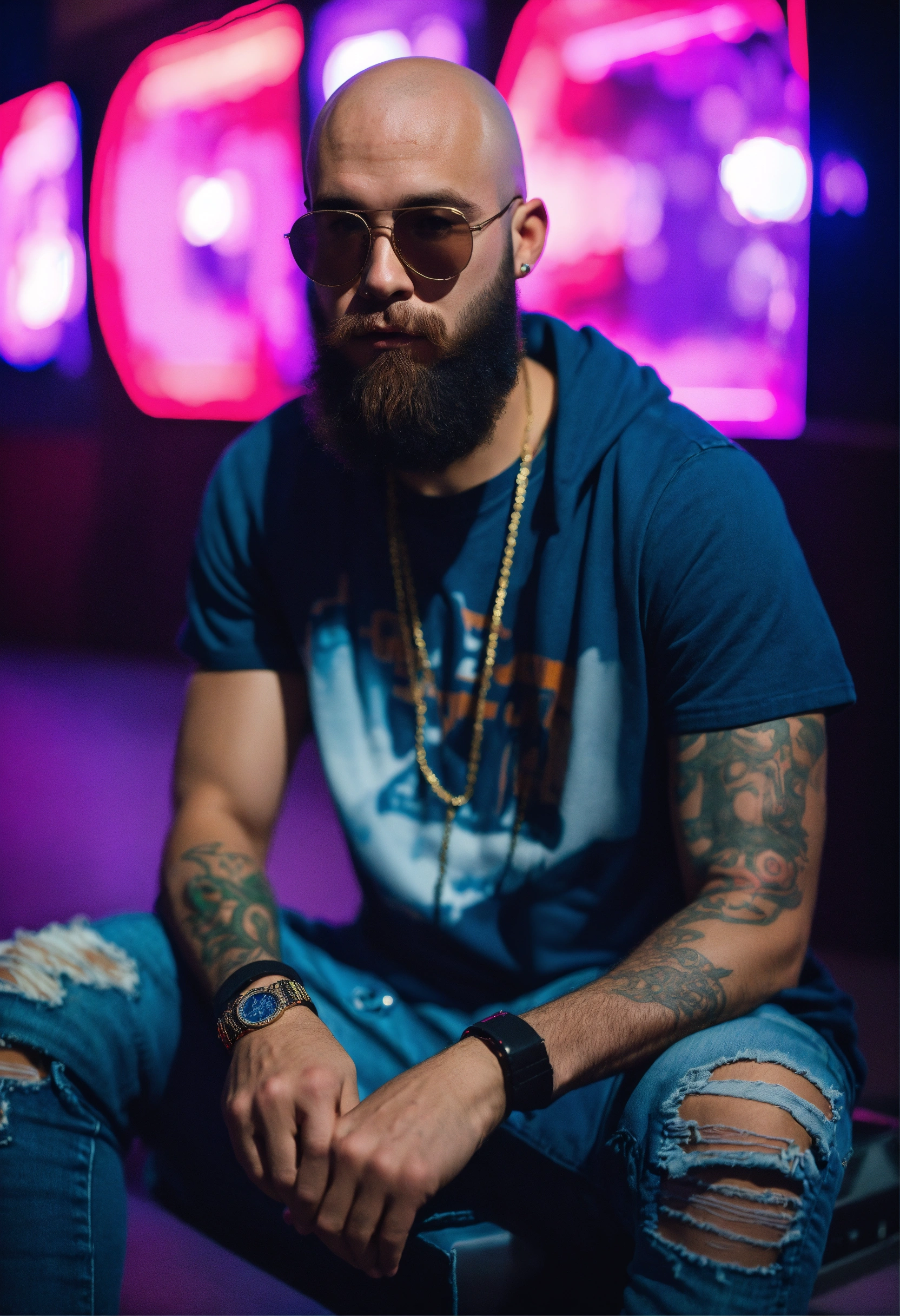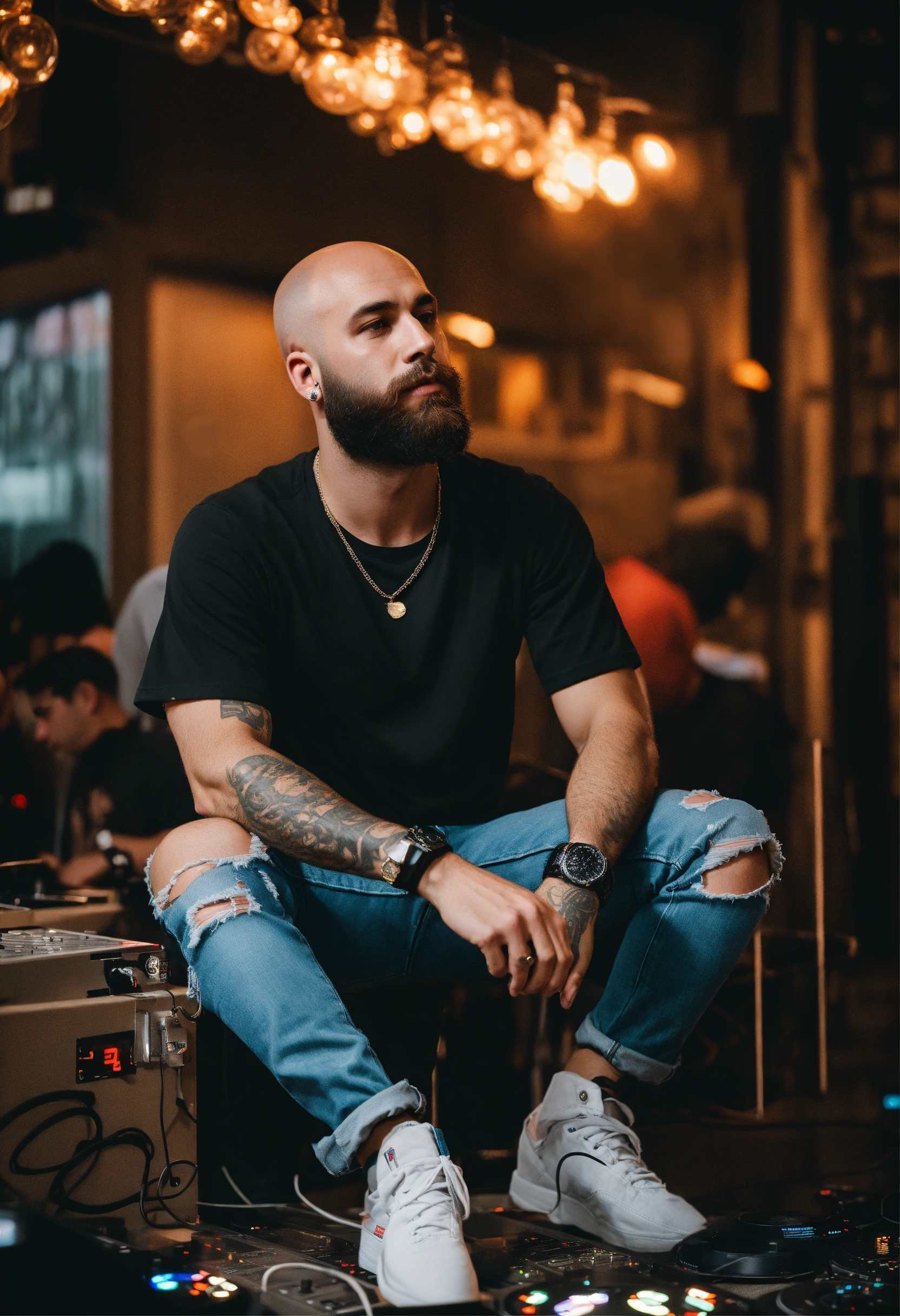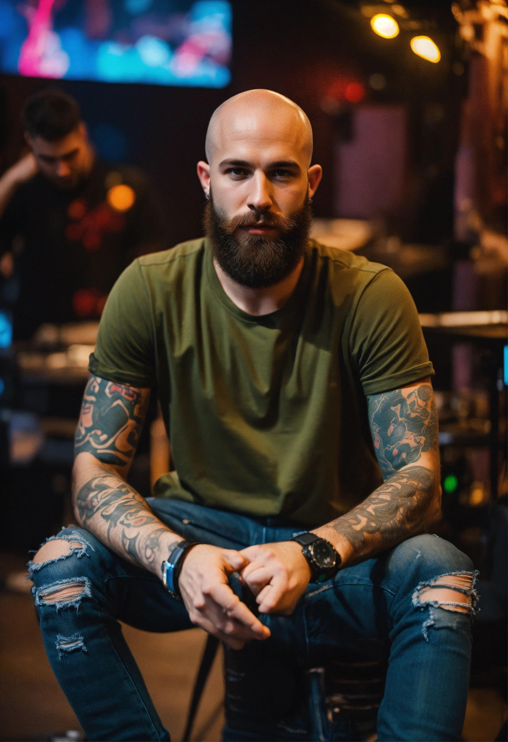 A young bald man with beard 8k modern day 2023 clothing t shirt and ripped jeans generate dj club scene washington dc