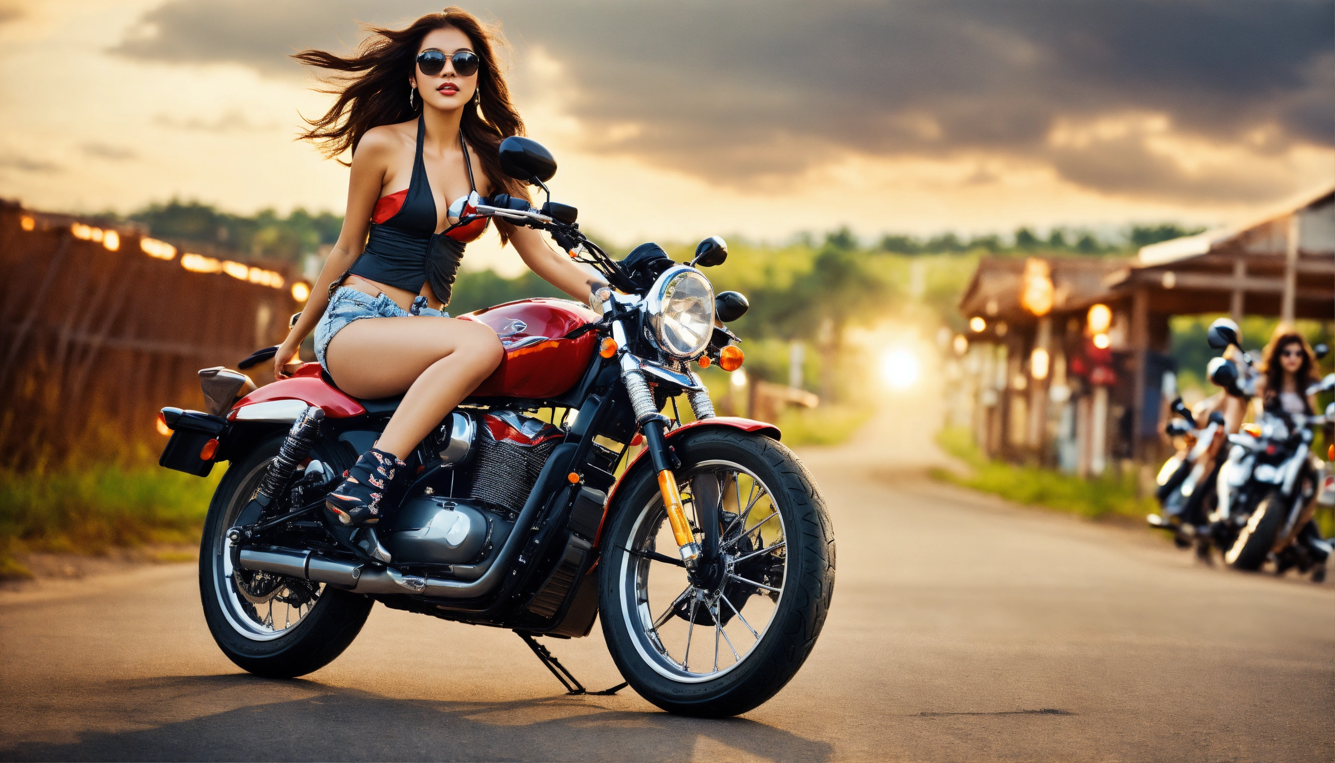 Group of beautiful young woman wearing shorts and halter tops riding motorcycles, high detail, photorealistic, canon eos 5d