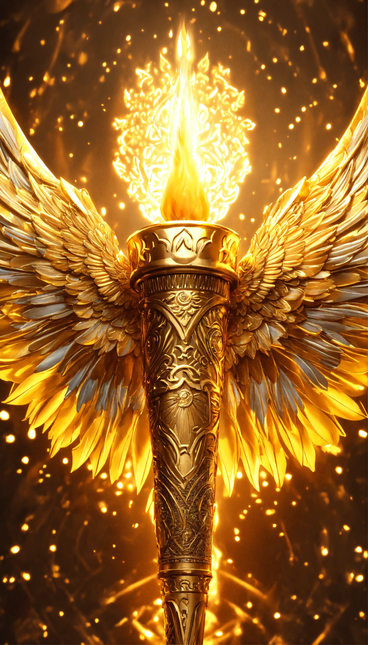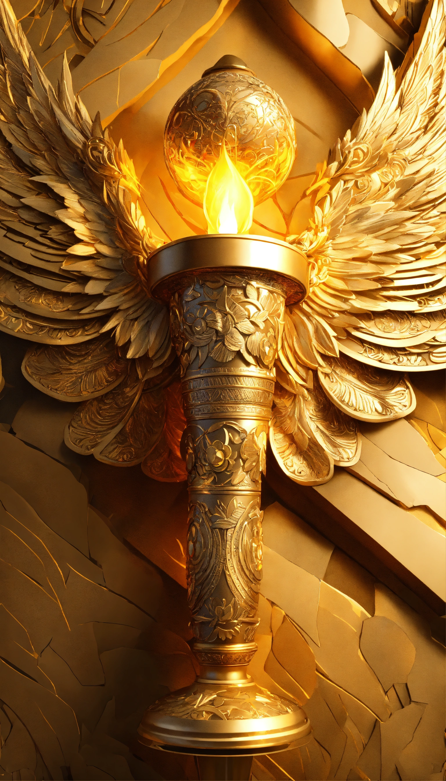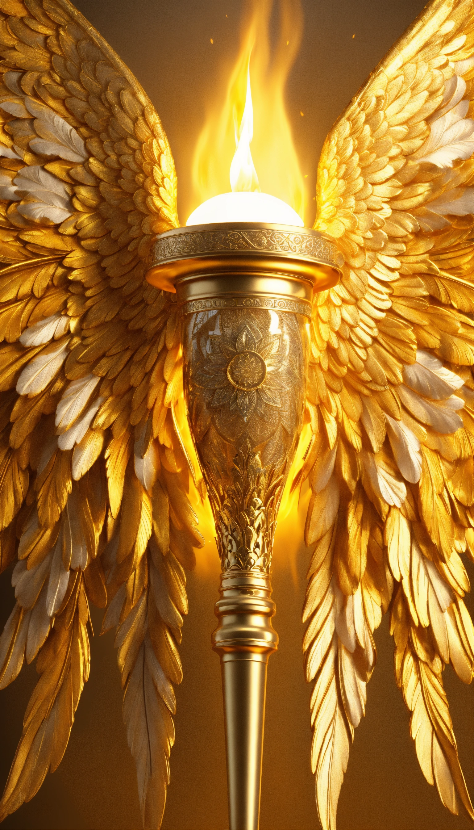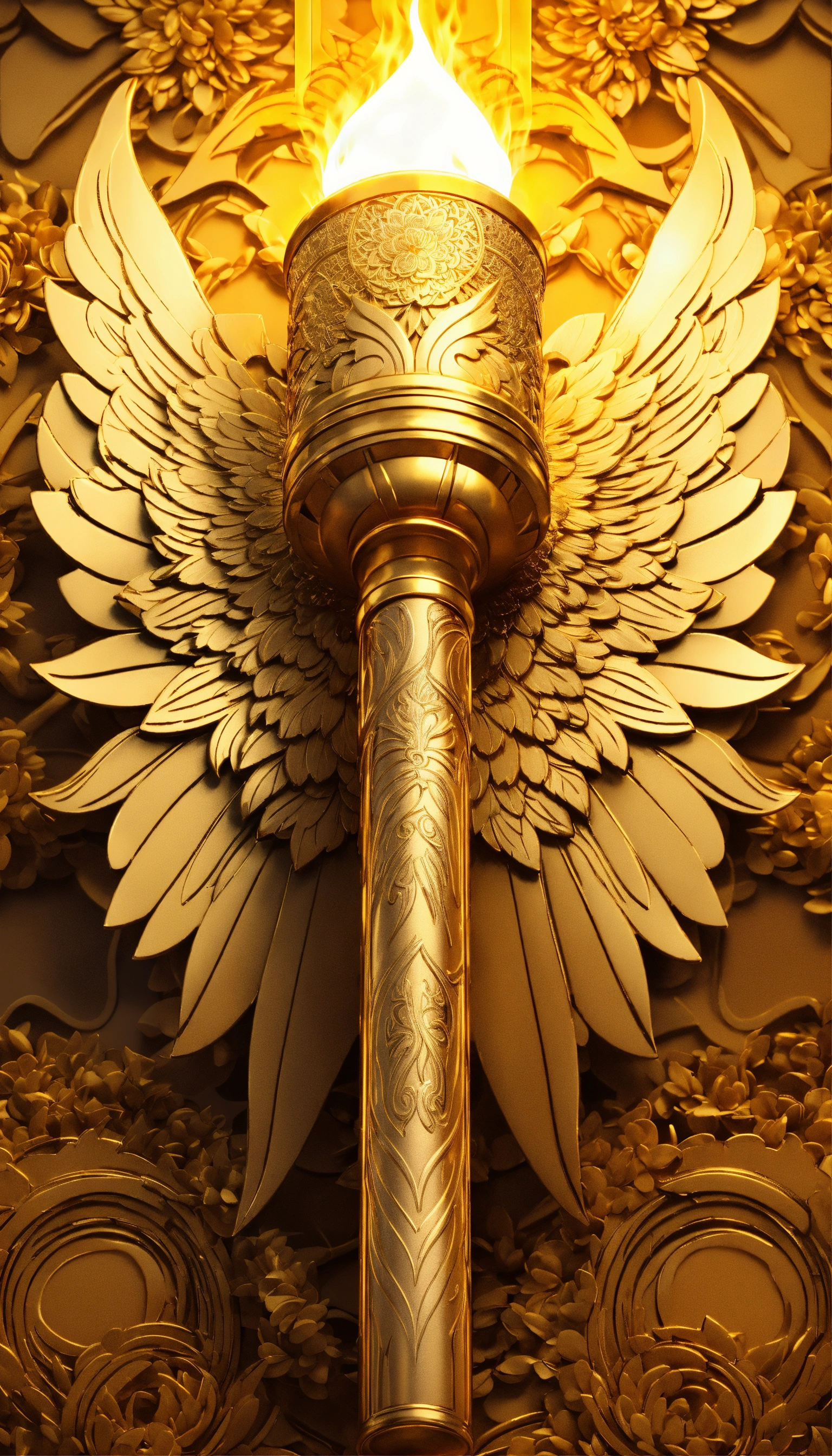 Powerful, detailed torch, digital illustration, real, 3d, golden colored torch with a yellow flame with white and golden details, on each side of the torch there are detailed and large wings, luminous golden mandala shape background, sharp focus, illustration cinematic, 8k, hyperrealistic digital painting, hd, high quality and resolution