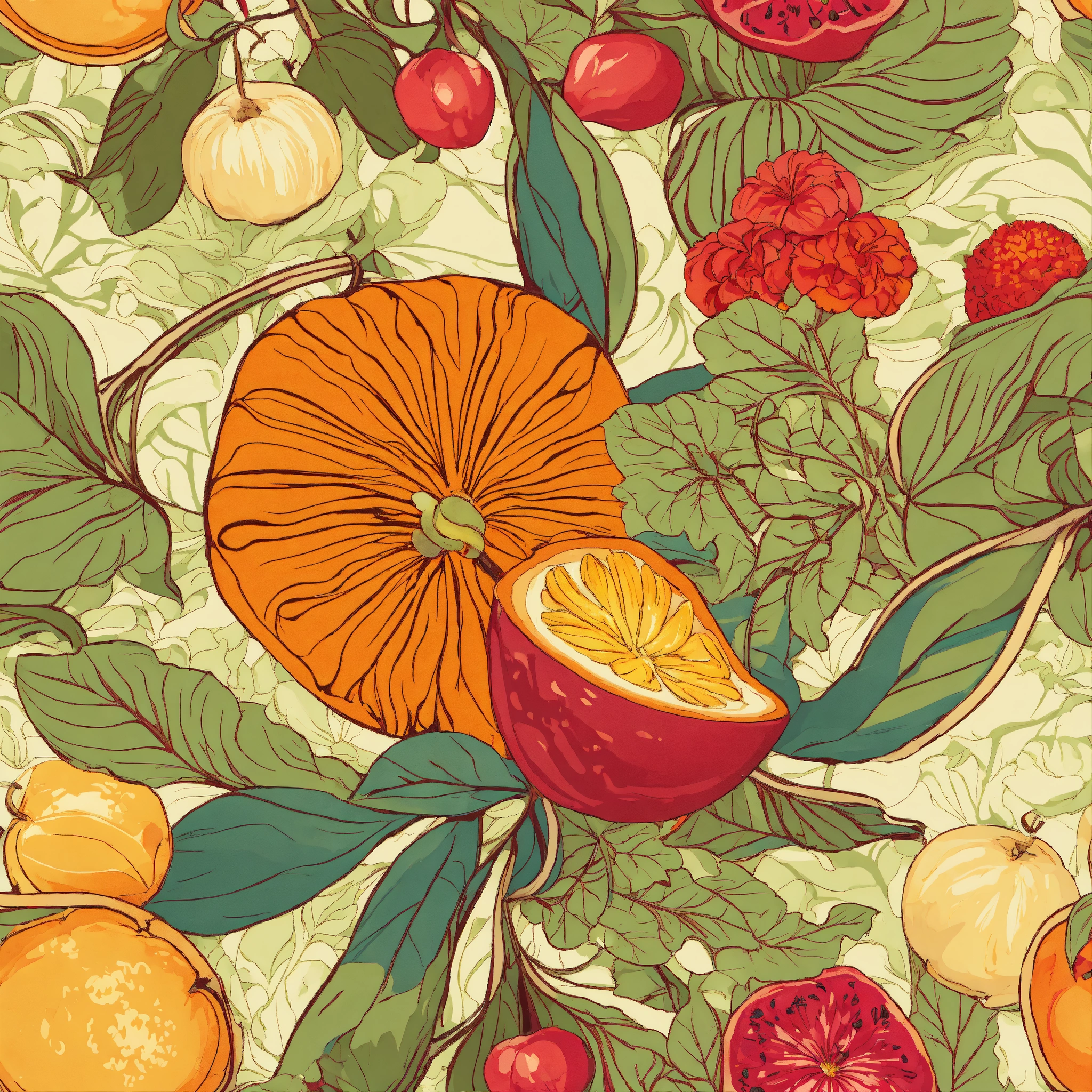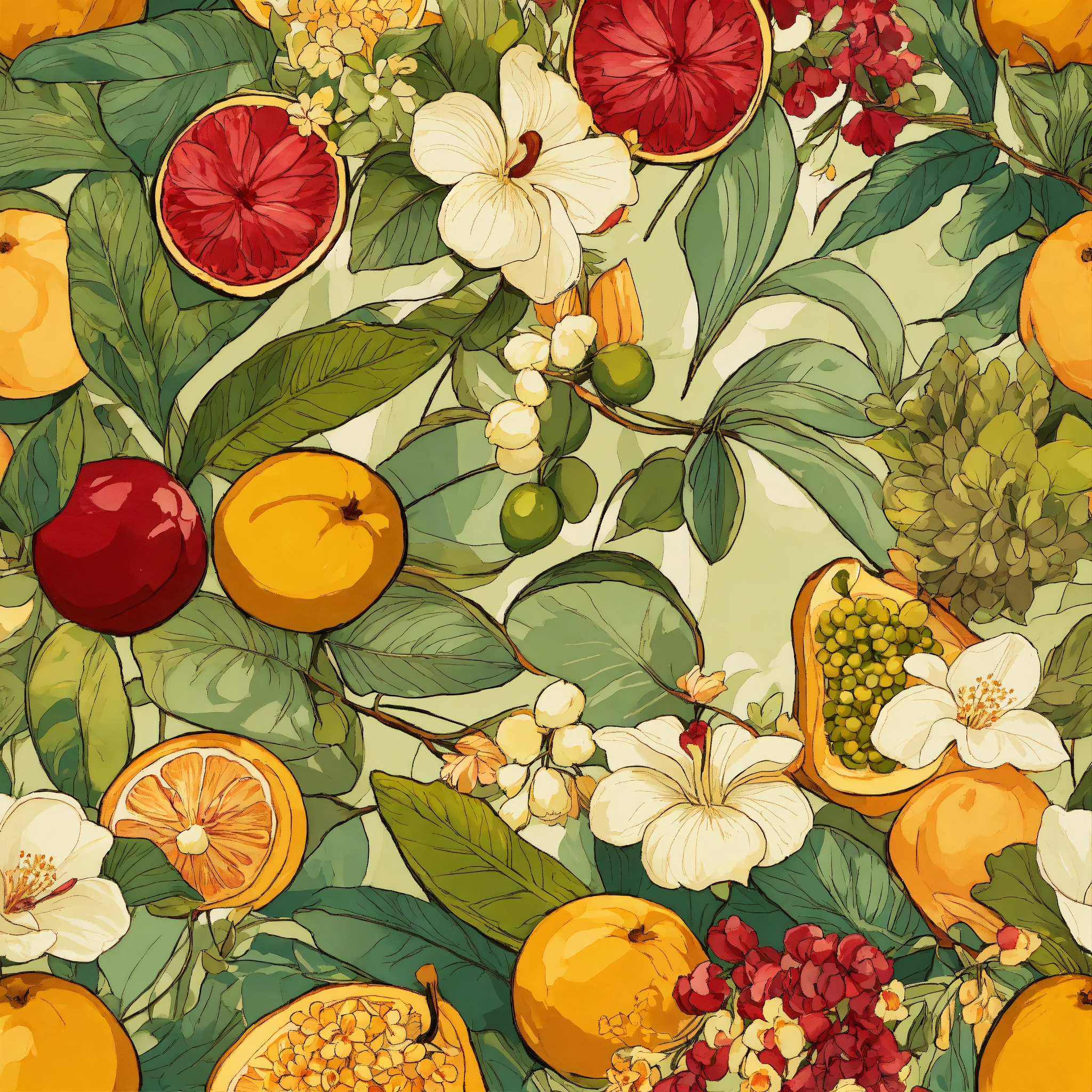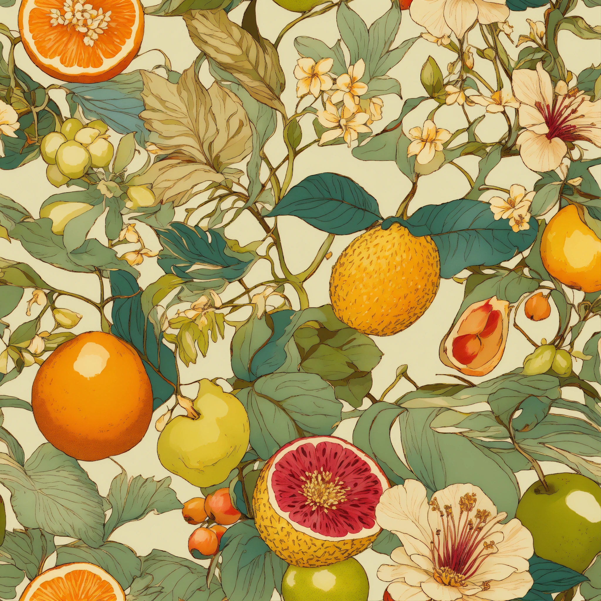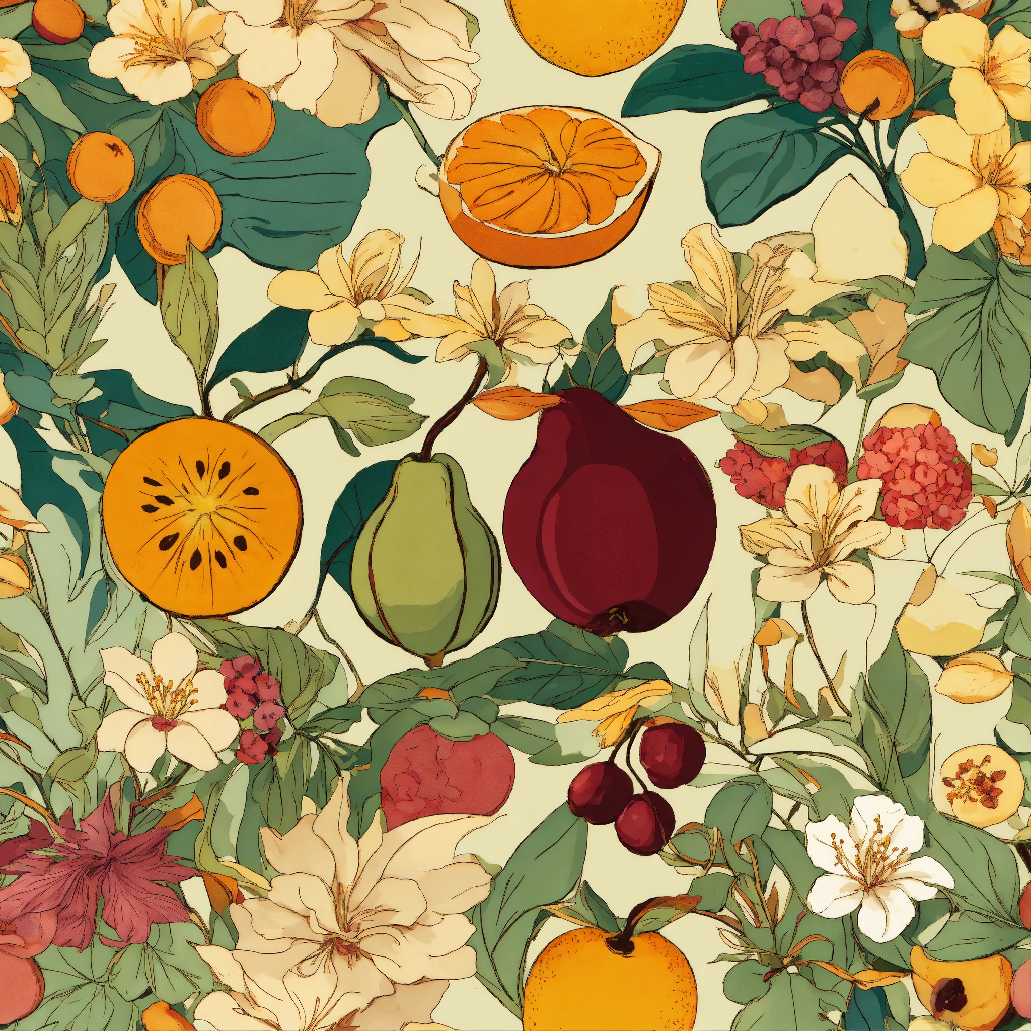 Create a stylistic art nouveau inspired pattern with a variety of tropical and summer fruits with winter blooming florals suitable for stationary design elements and motifs, light creamy background
