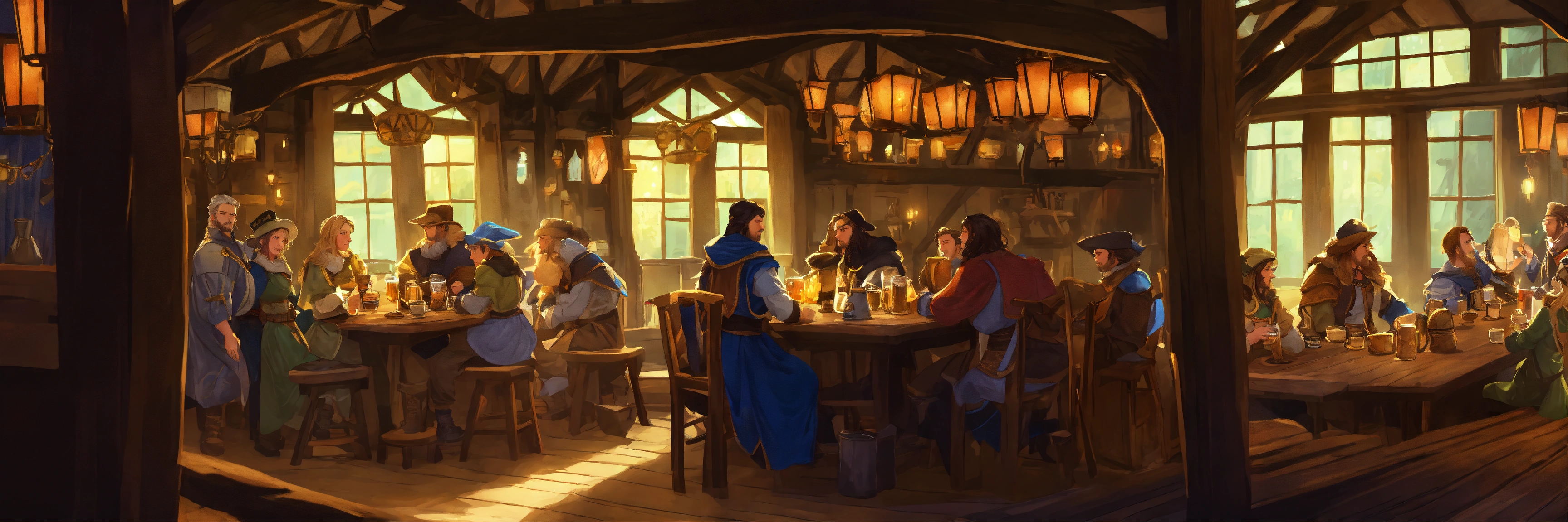 Fantasy tavern bustling with fantasy characters, sitting at a table, drinking ale from wooden mugs, digital art form