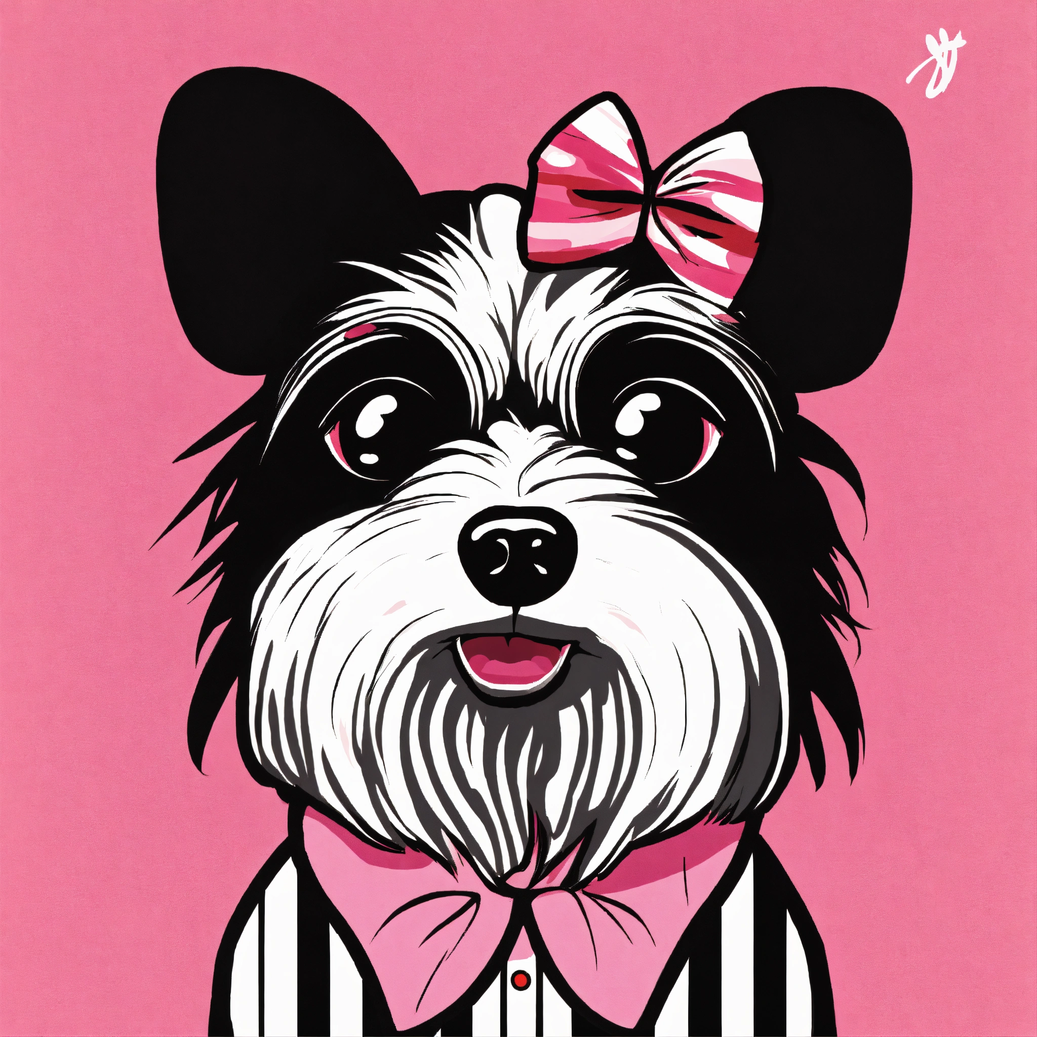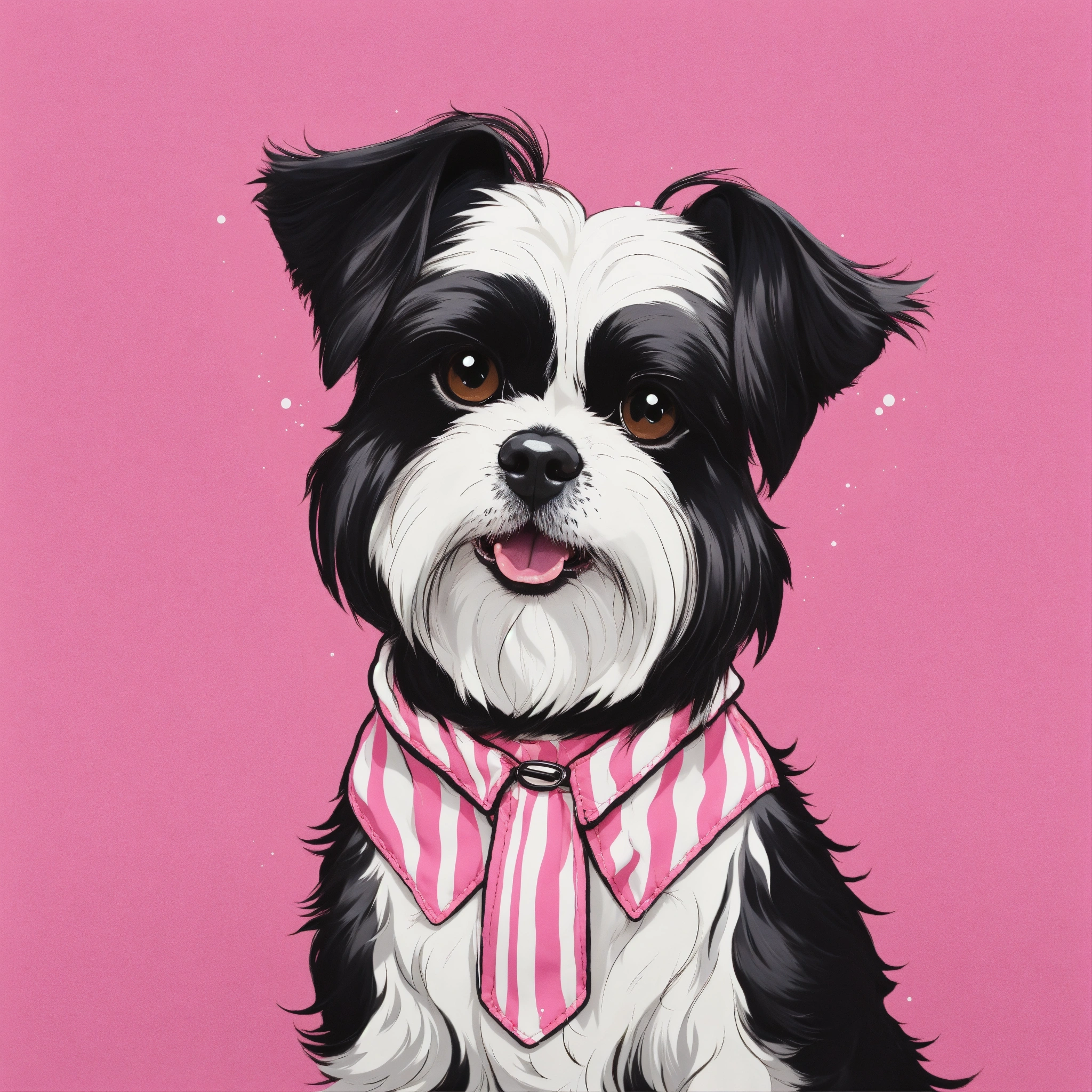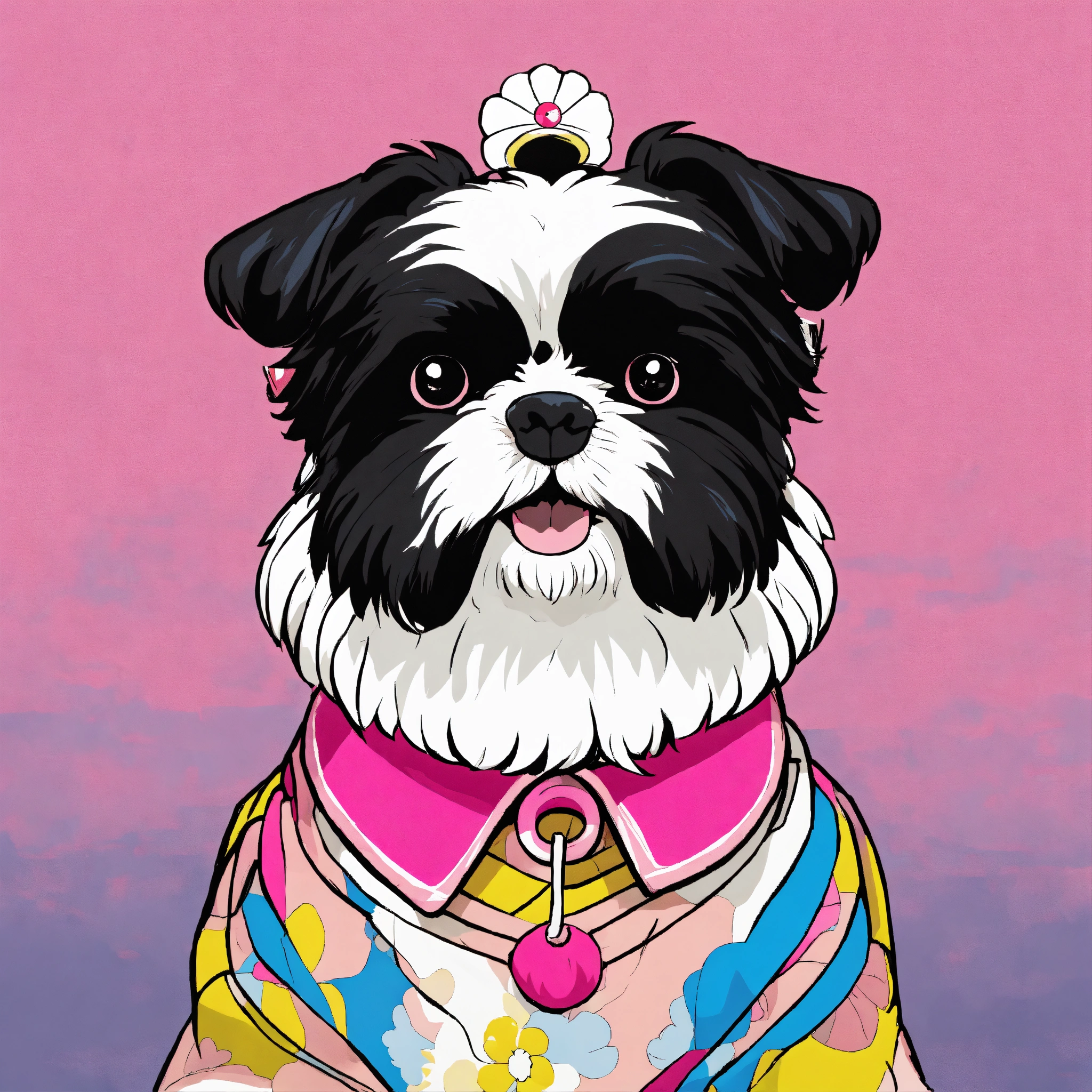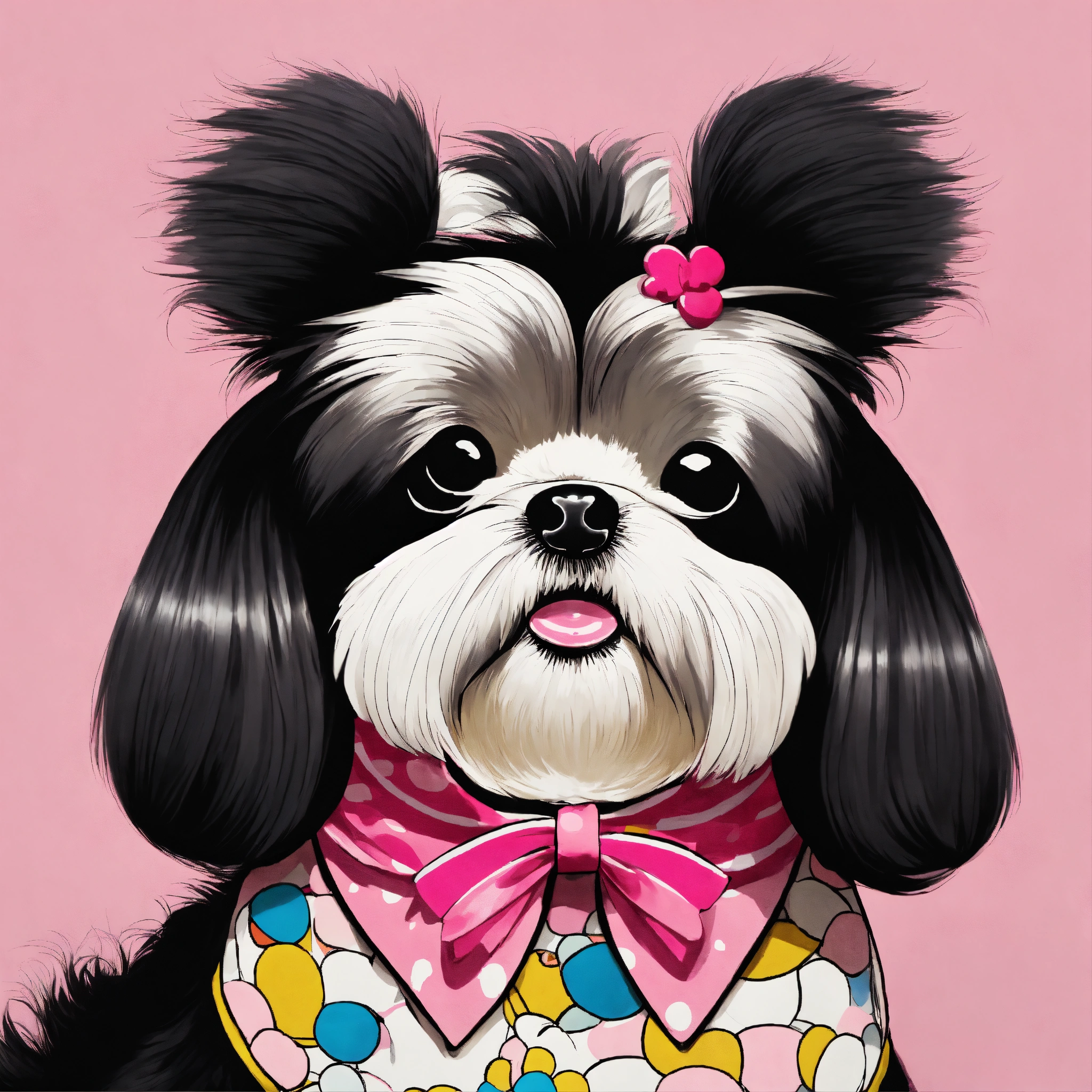 Takashi murakami style, black and white female shitzu dog with white stripe on face and hair in a top knot with a pink collar