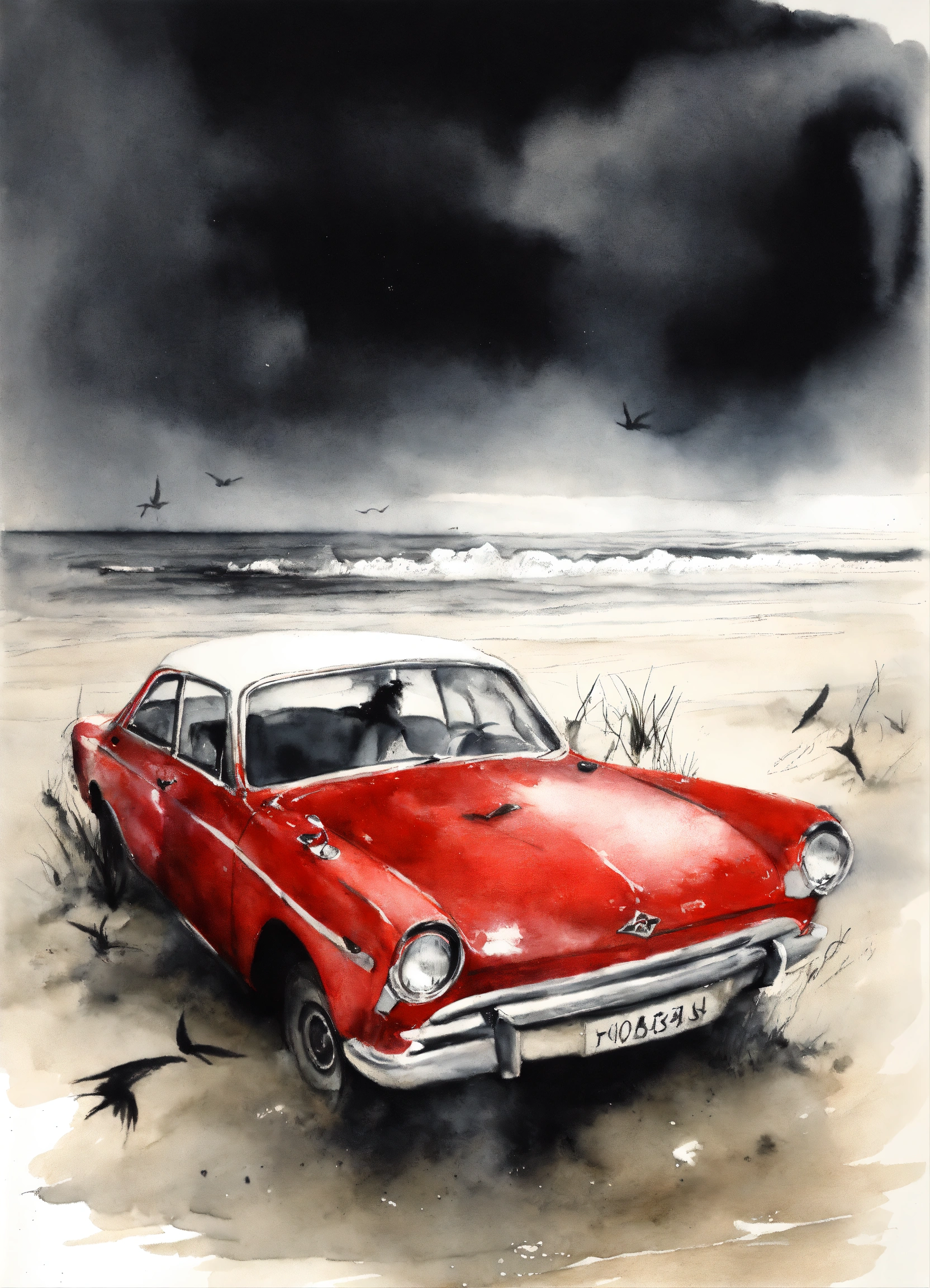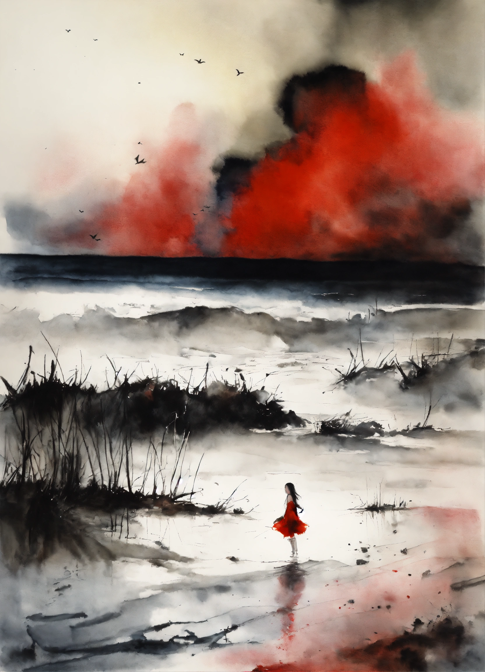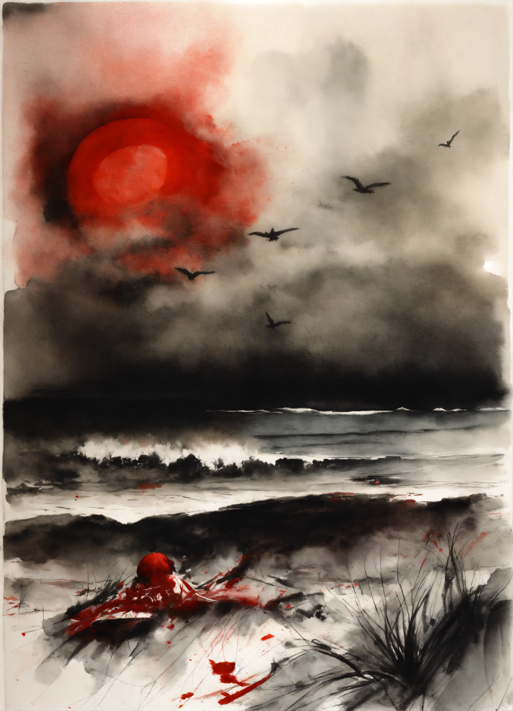 Stephen gammell style, dessin, aquarelle, aquarelles, noir et blanc et rouge, de marais, de sombres créatures, dégoulinant, the sea on a beach