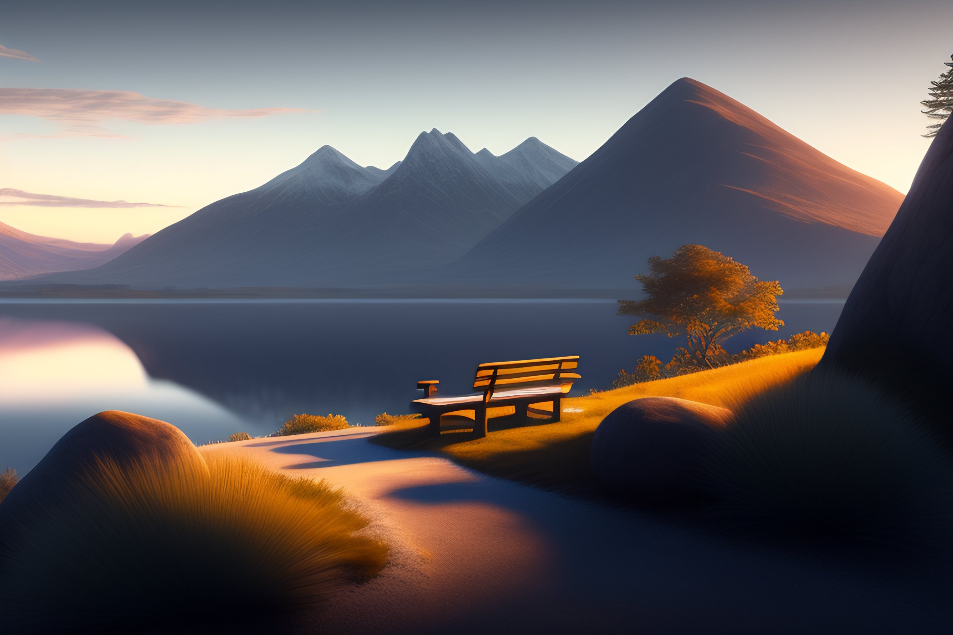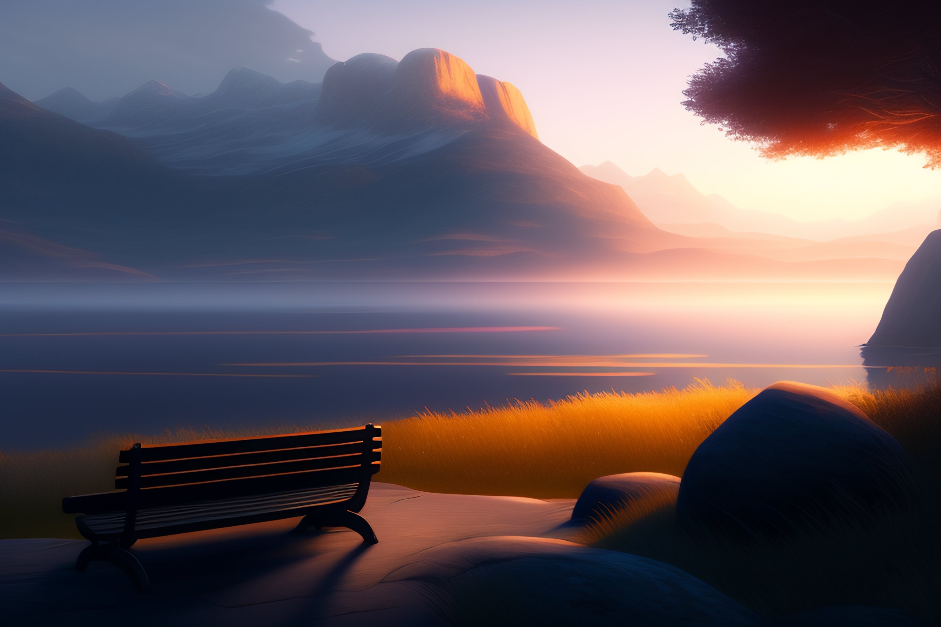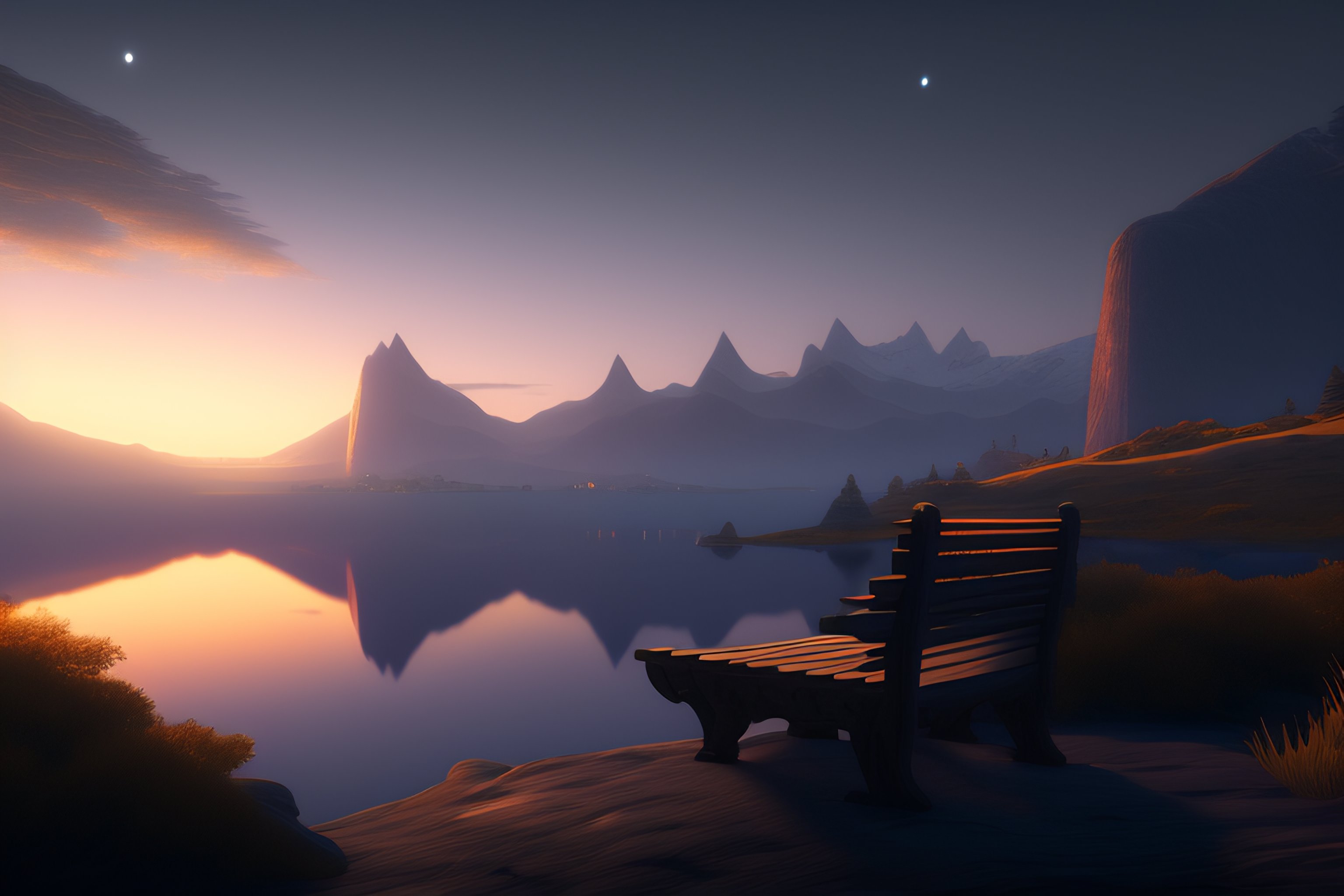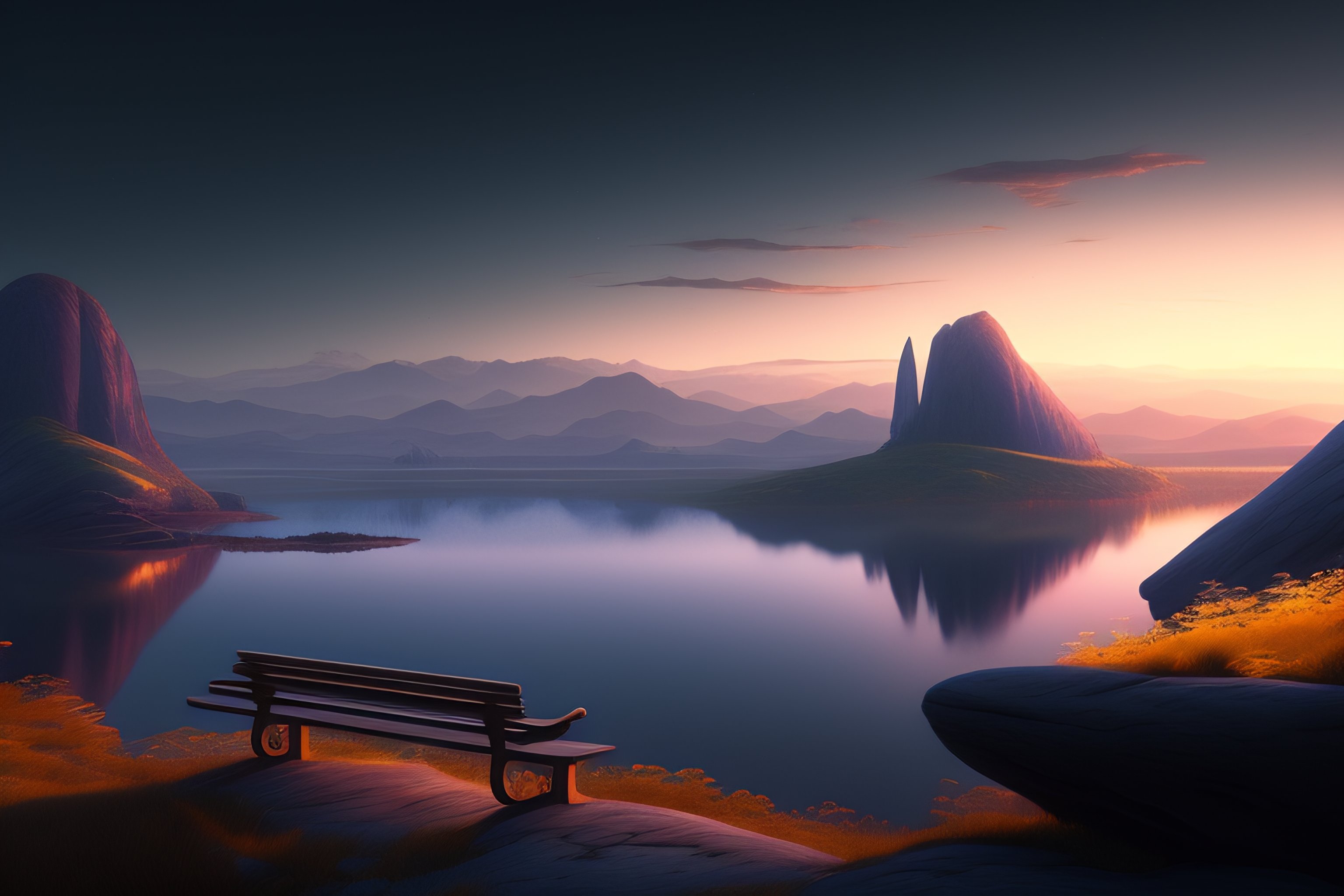 Bench looking at a serene lansdcape, at dusk, very detailed moody, matte painting, volumetric lighting, rocky, stunning detail, 4k, hd, clean, full of detail, sharp focus, rule of thirds by makoto shinkai, albert bierstadt, thomas moran, karol bak, trending on artstation