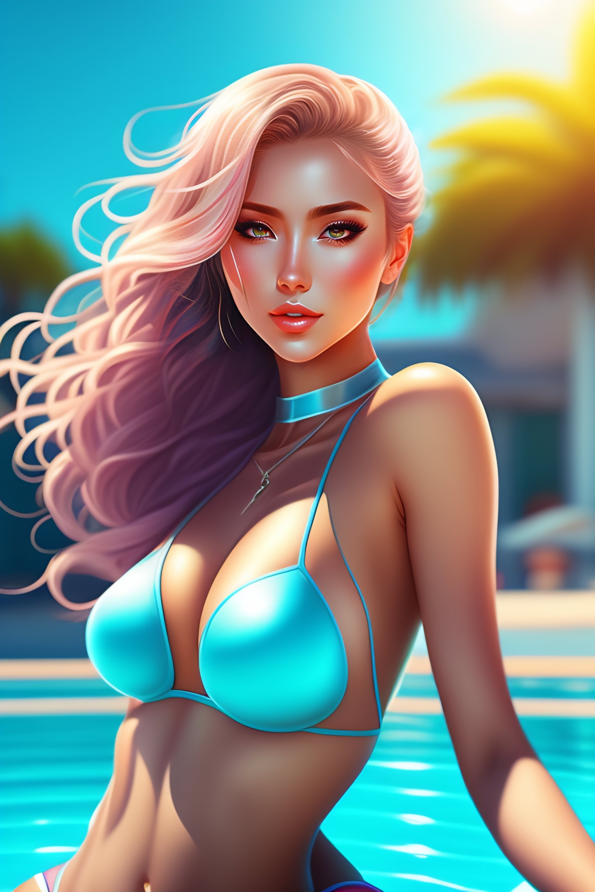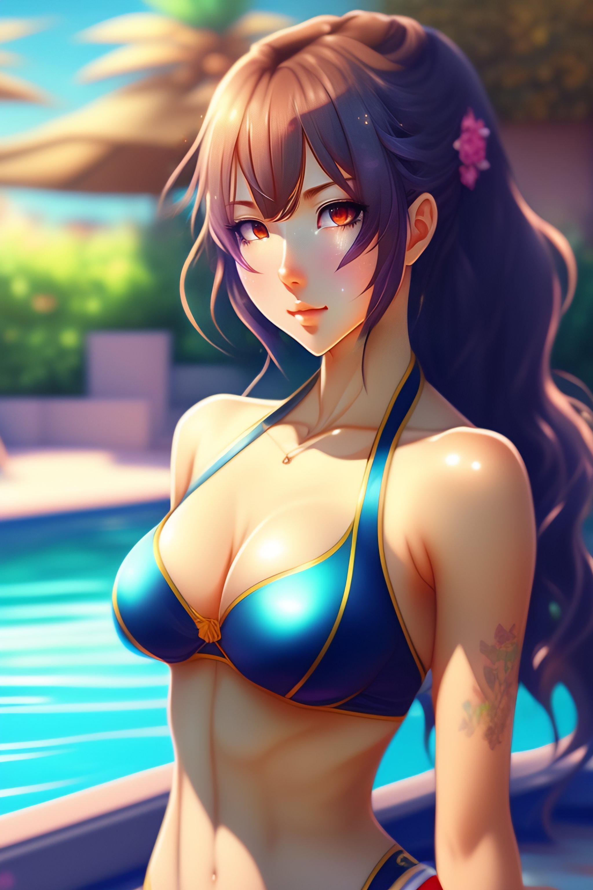 Dynamic photography of an beautiful anime girls in bikinis at a pool, detailed character portrait, sunny day, detailed and intricate environment