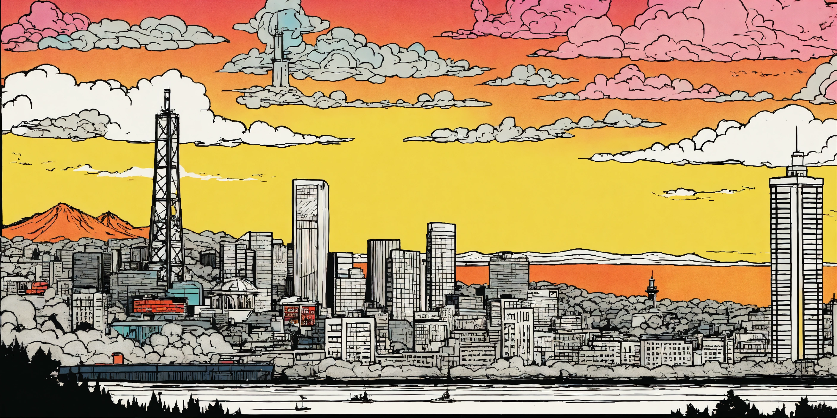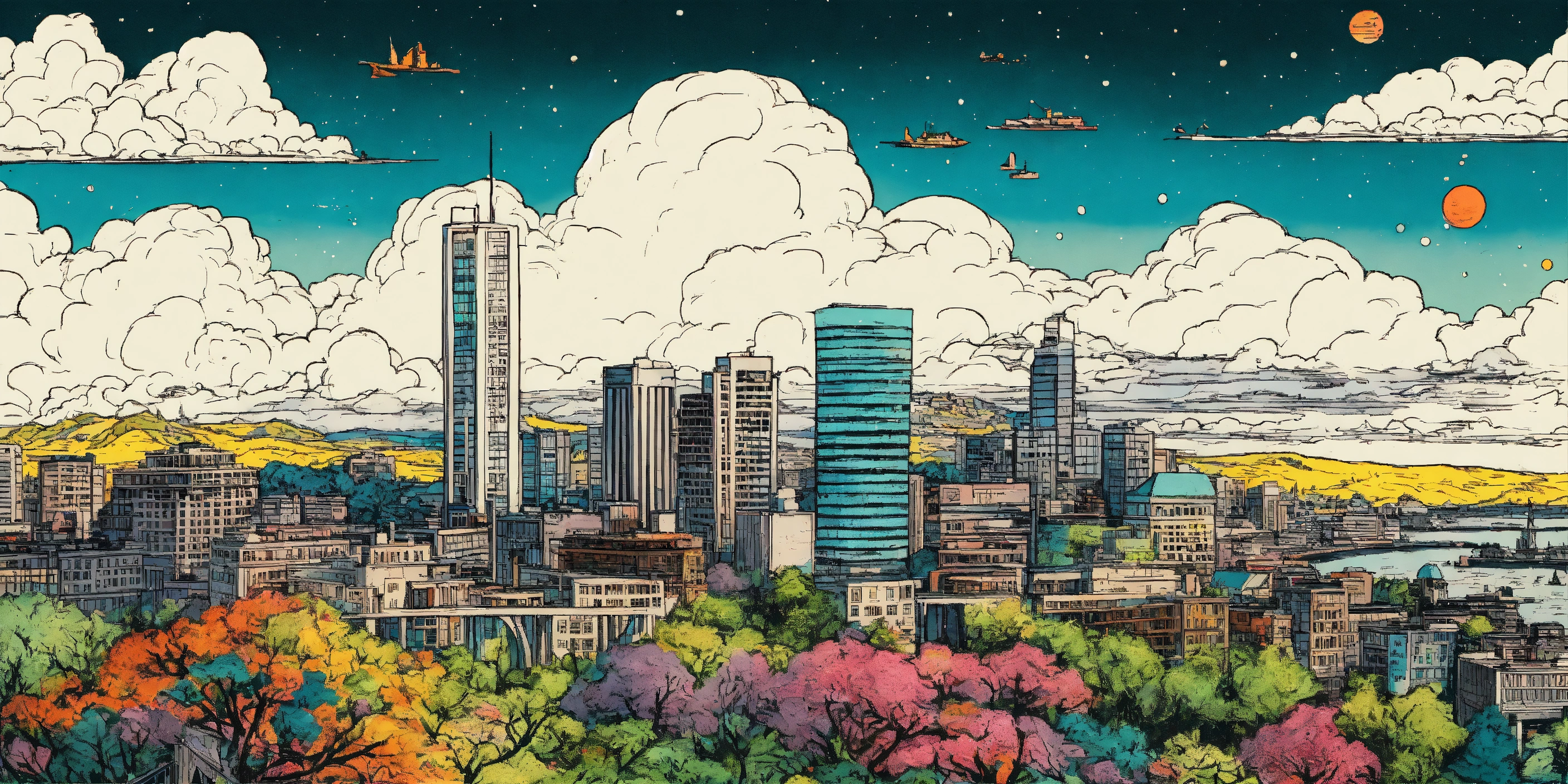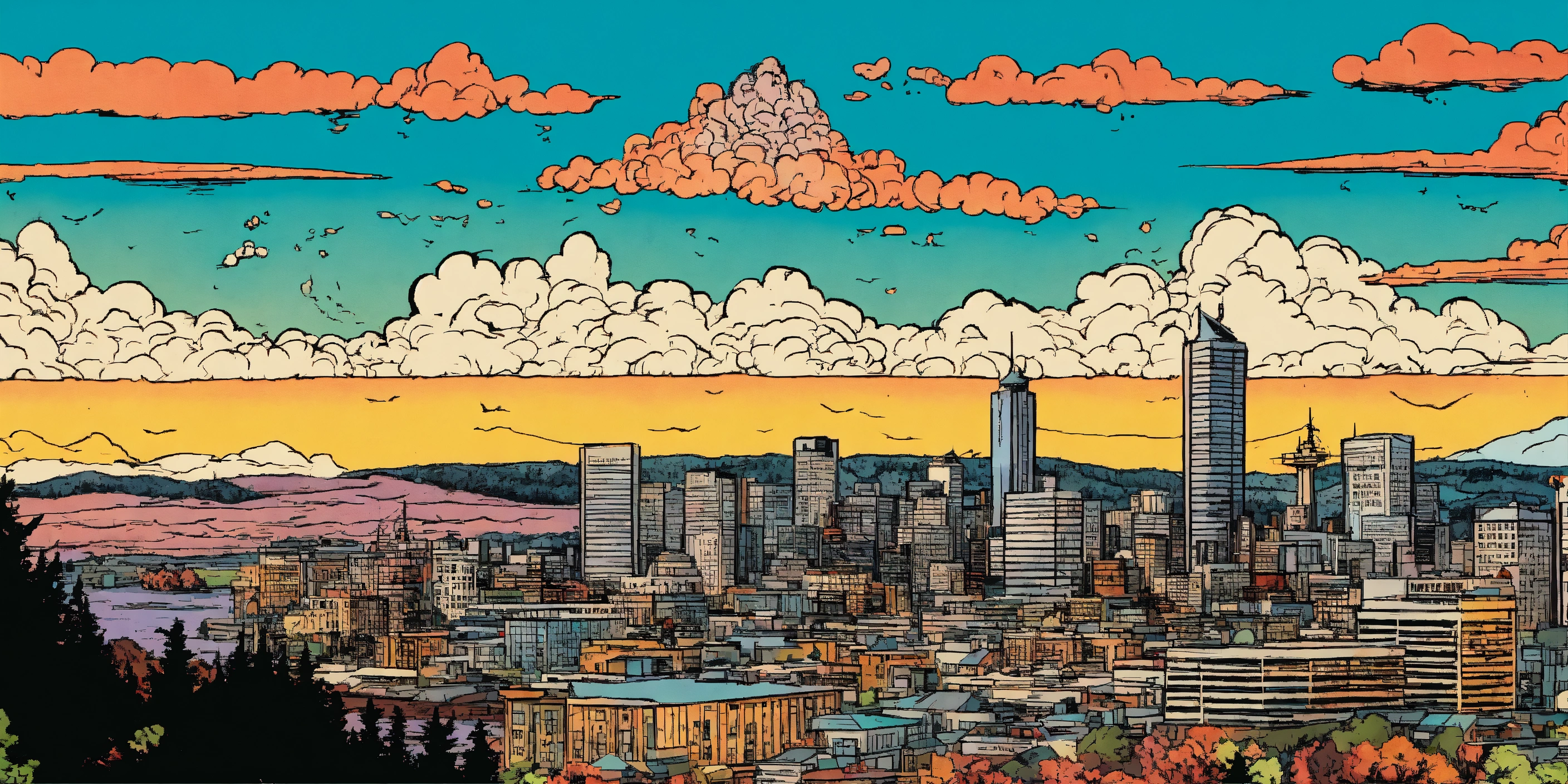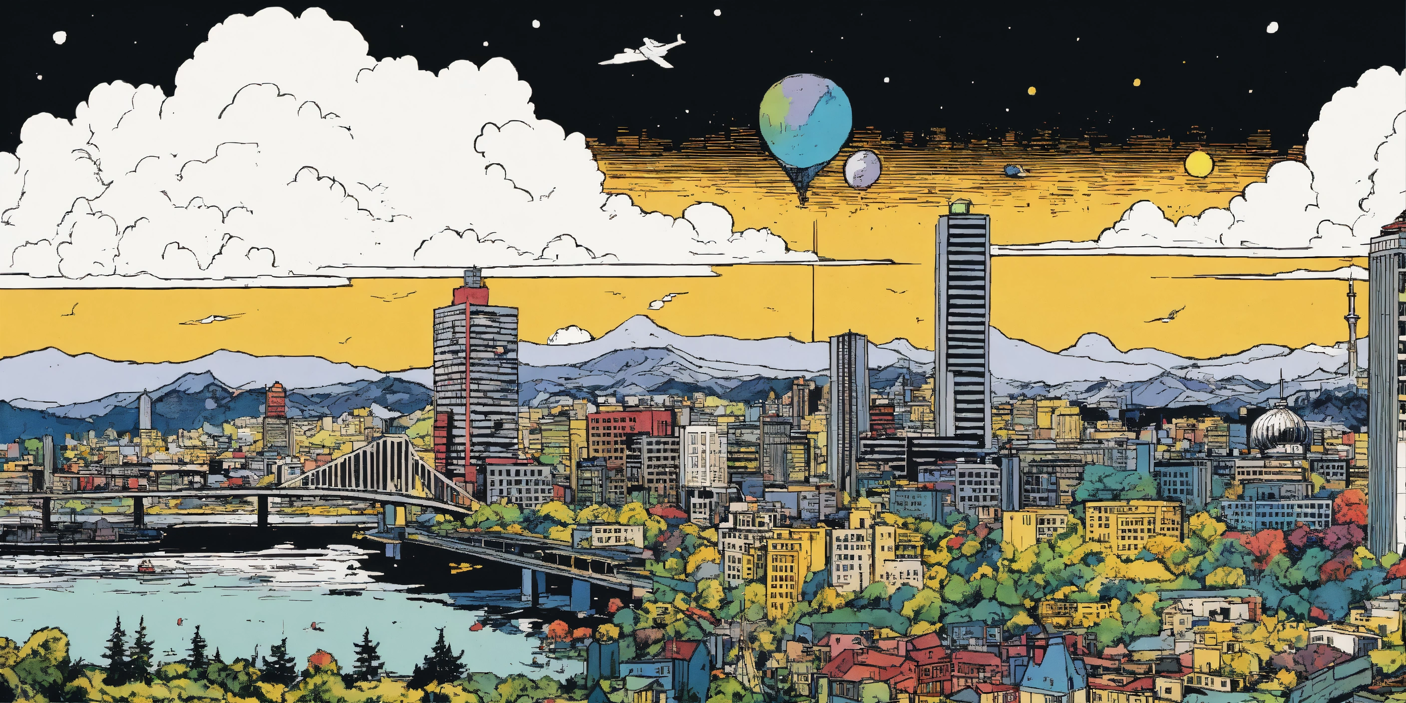 Chaotic stunning portland oregon, skyline, illustrated by hergé, style of tin tin comics, pen and ink. vintage 90's anime style, black and white, colorful clouds, symmetric