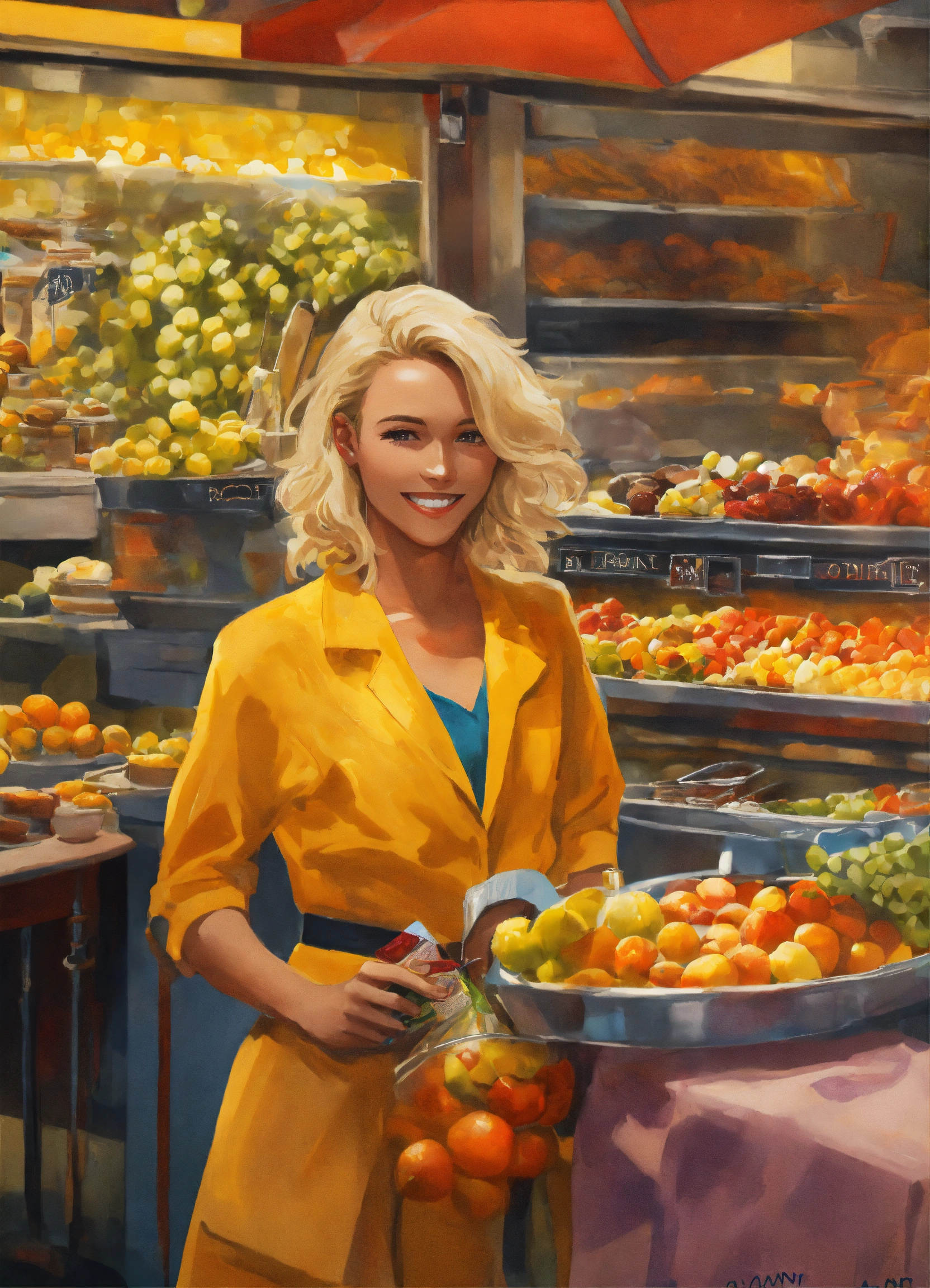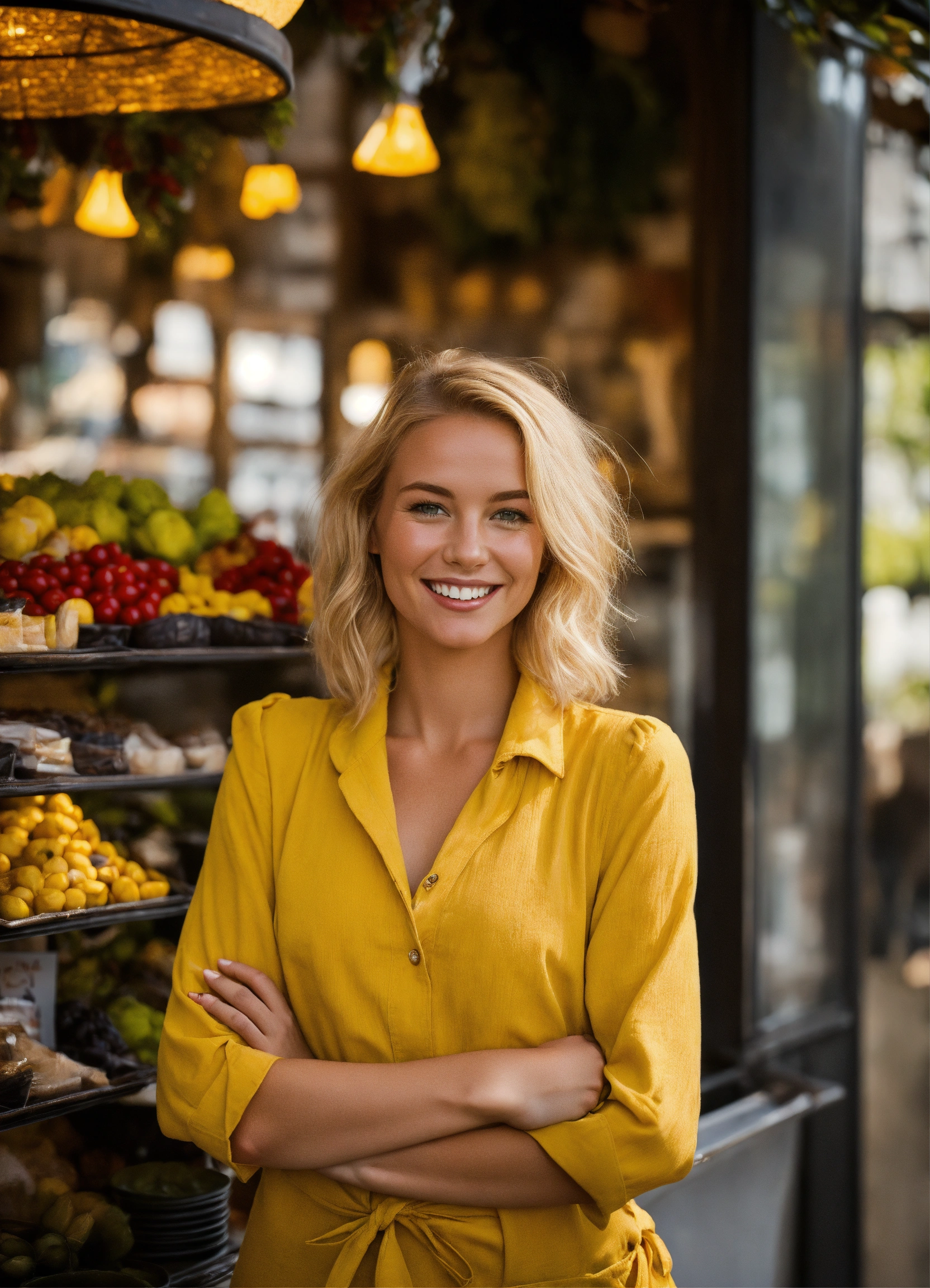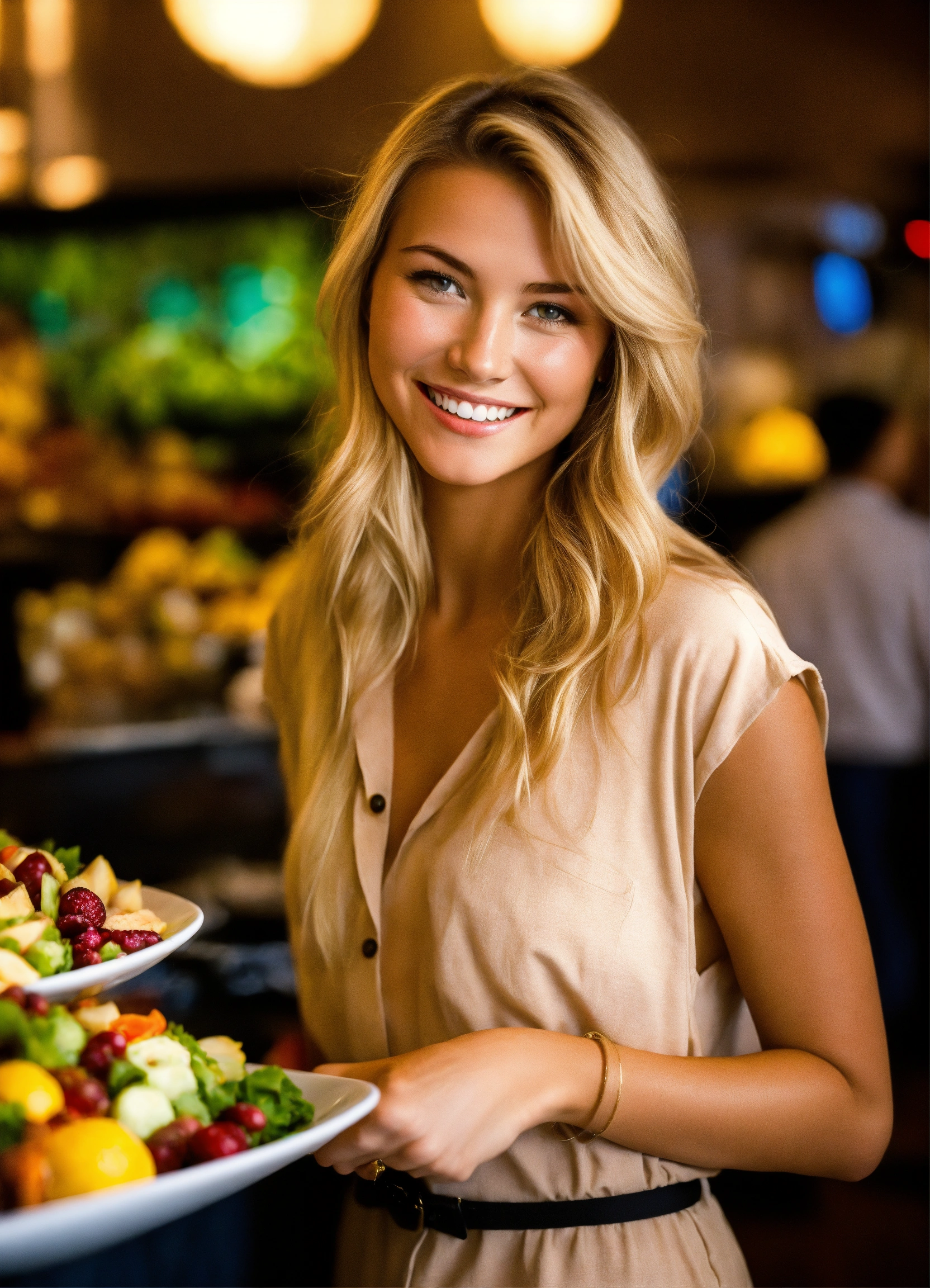Un serveur souriant blond ayant une aura de vendeur et charismatique