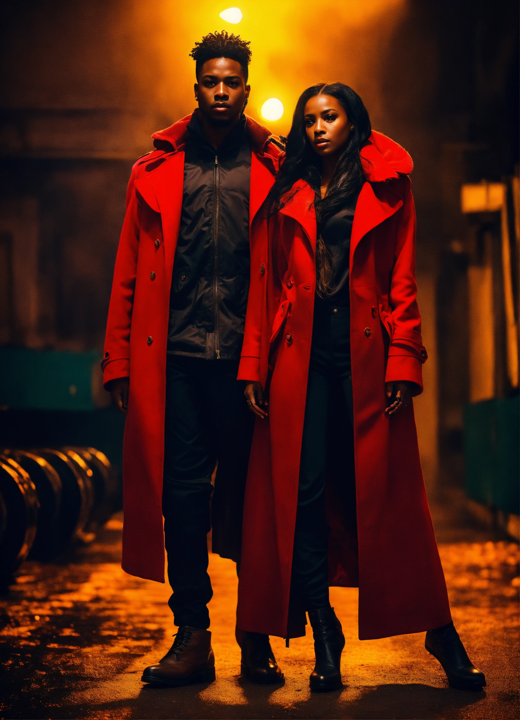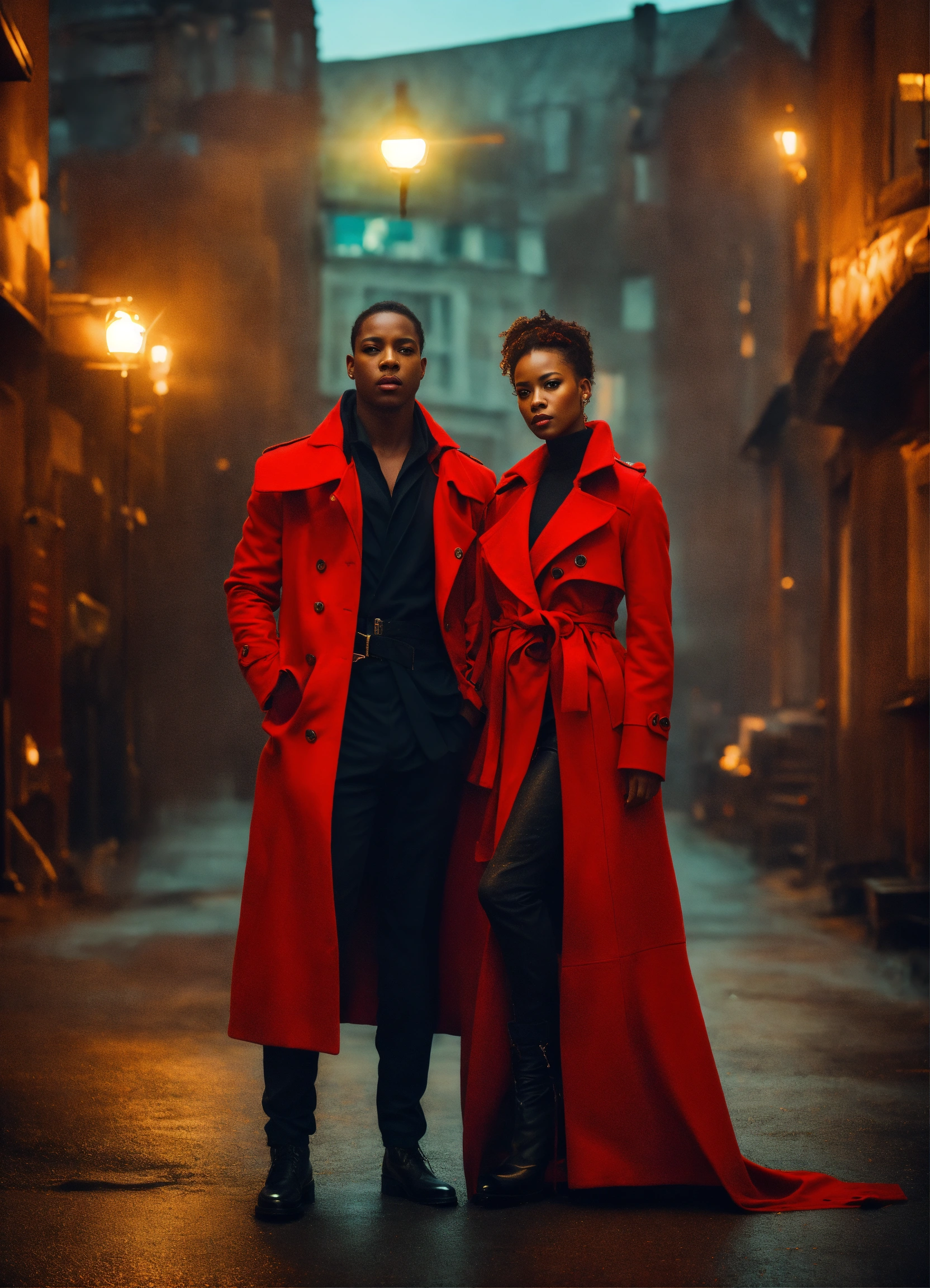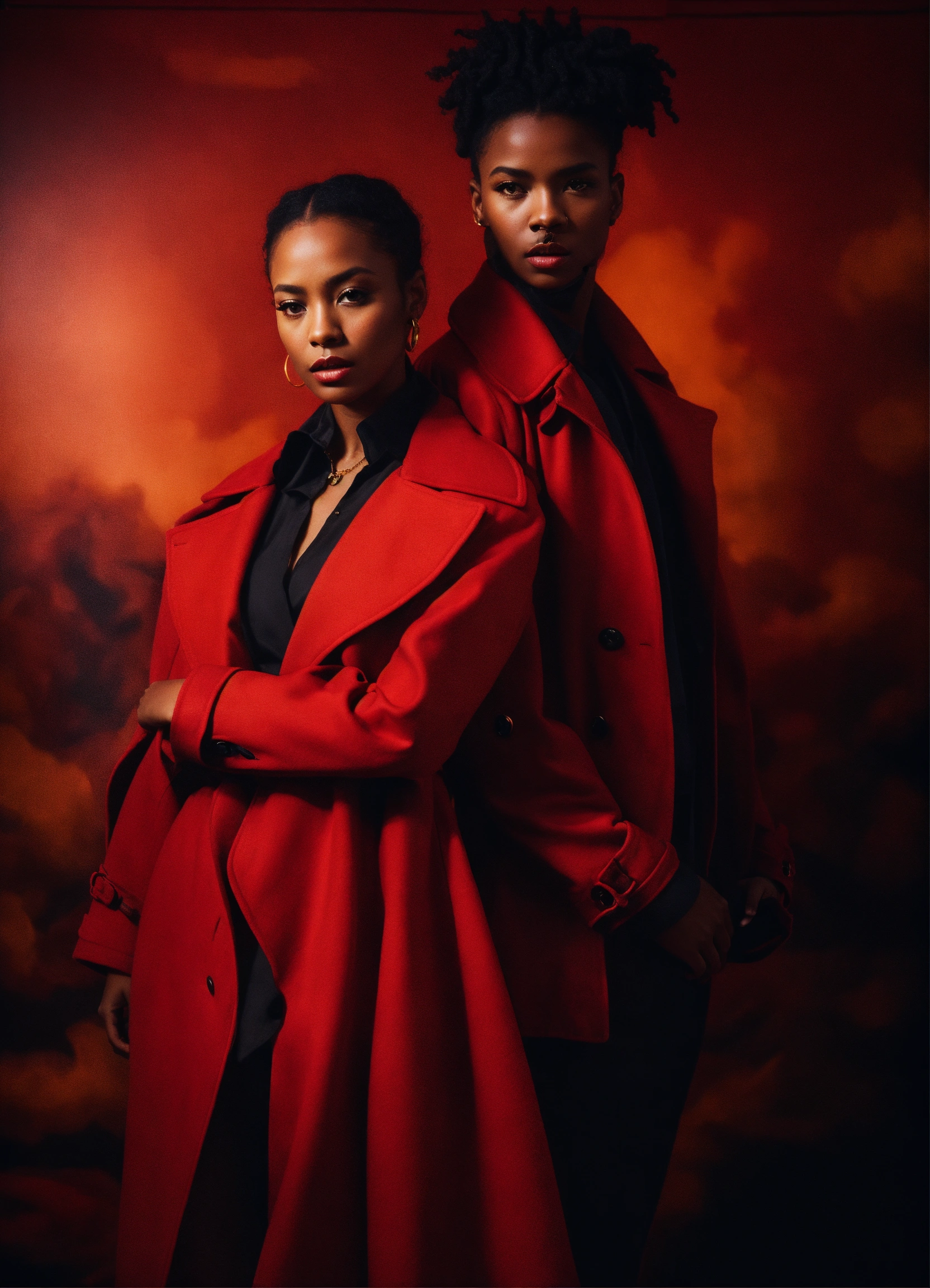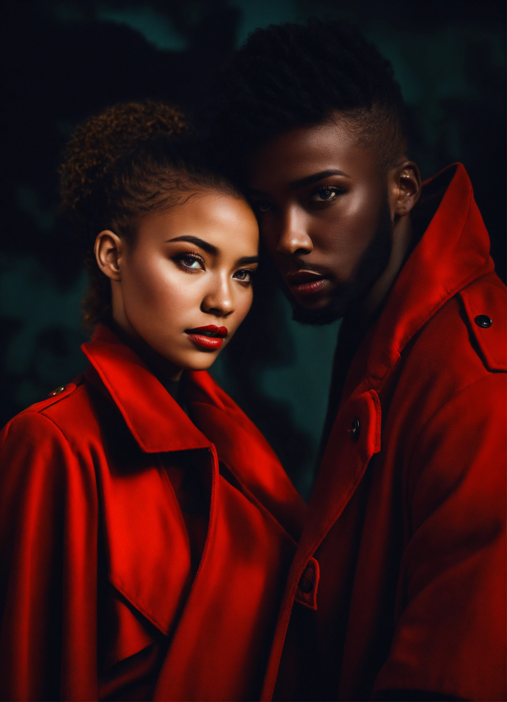 One man and woman posing together over a red coat, in the style of ingrid baars, cinematic lighting, black arts movement, jessica drossin, artgerm, dark brown and amber, young british artists( ybas)
