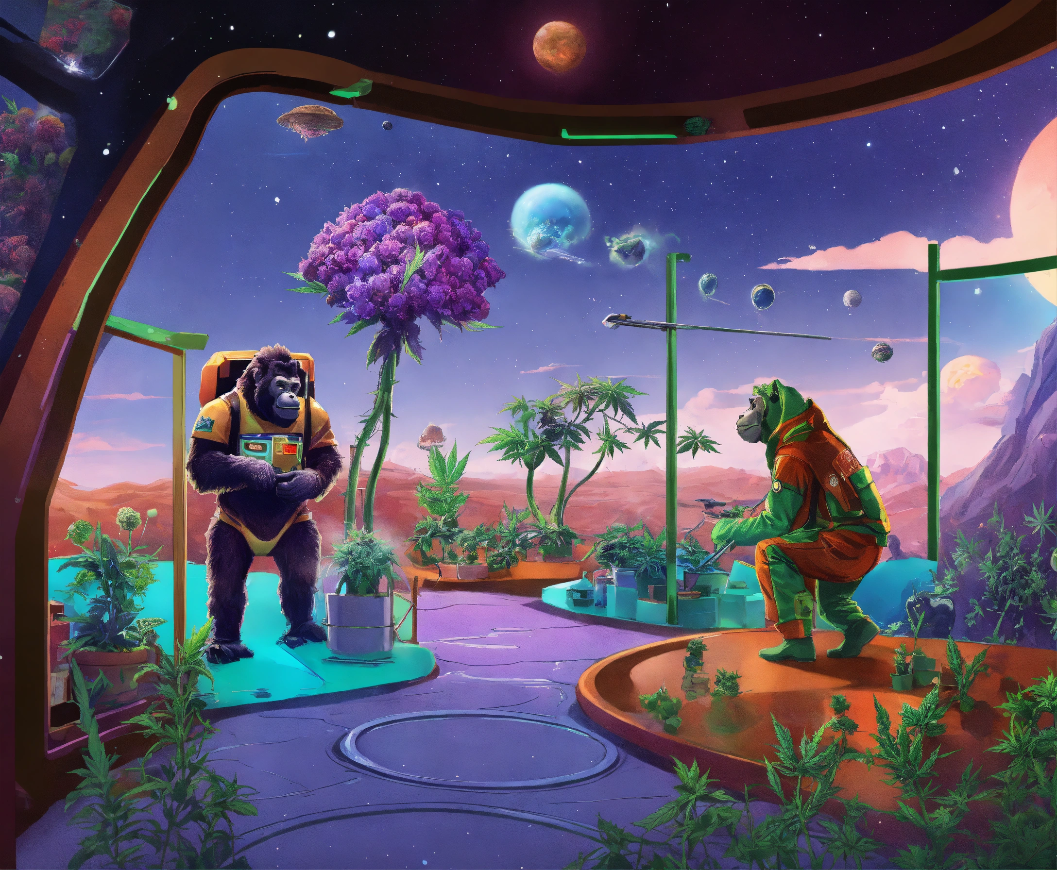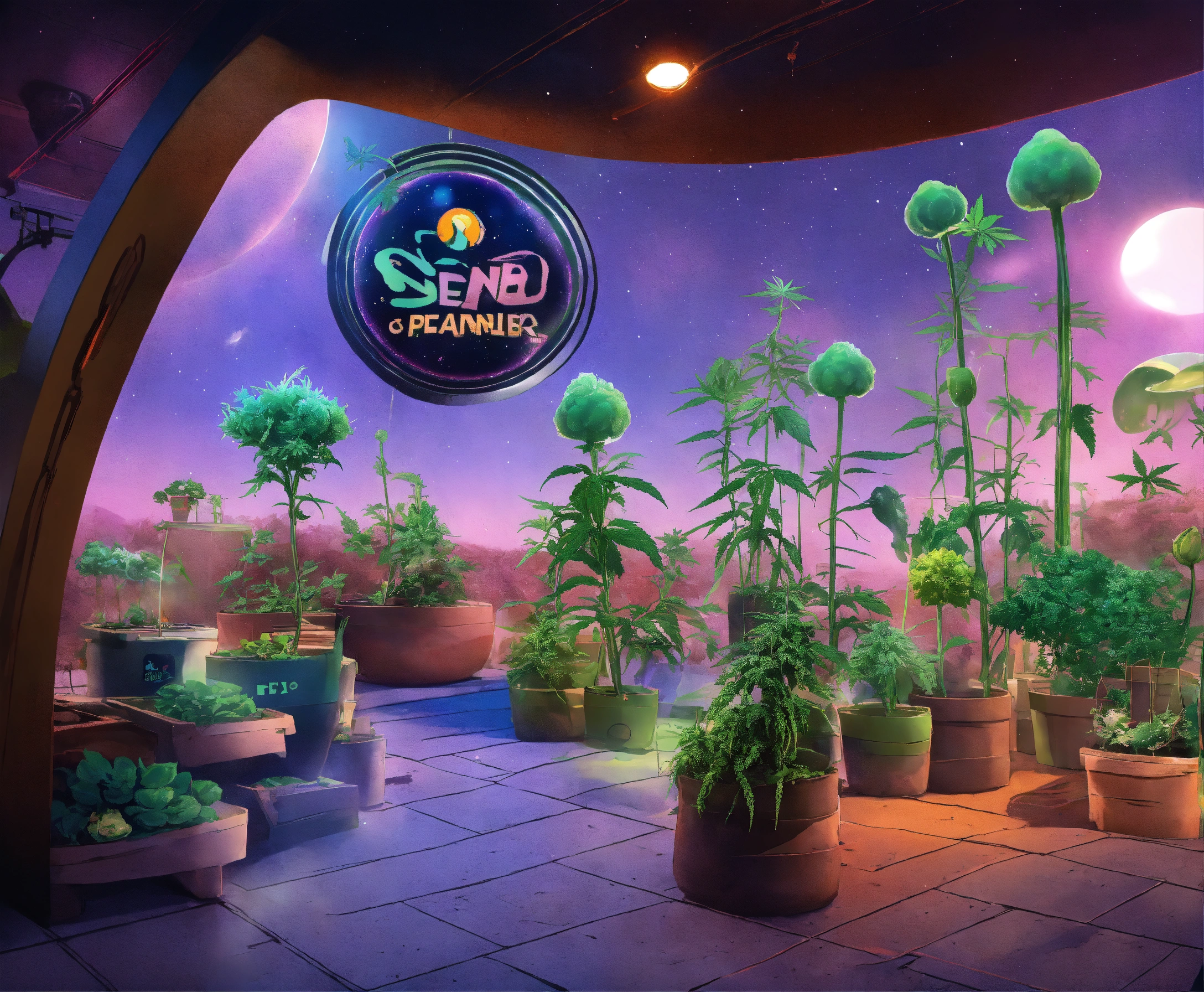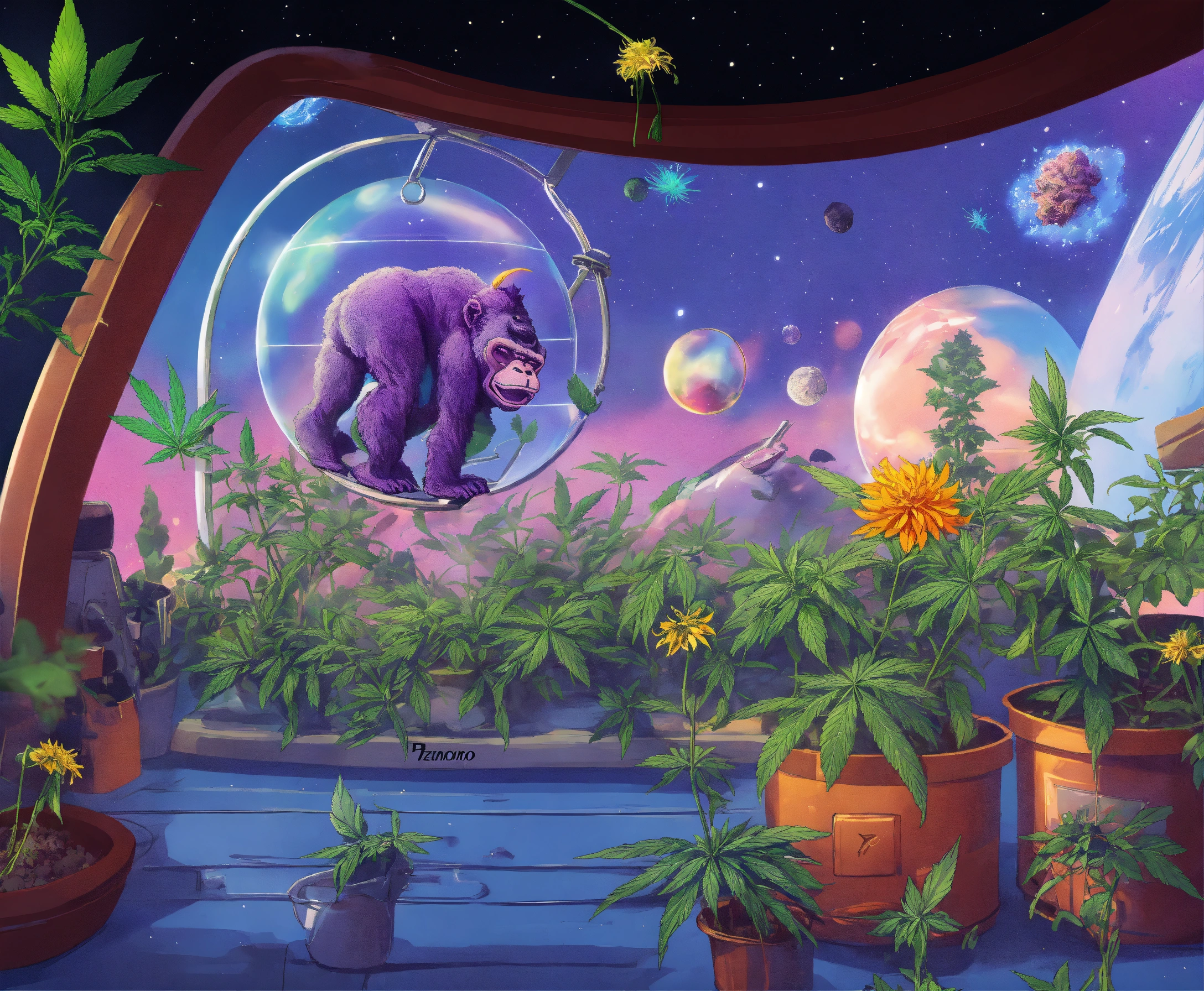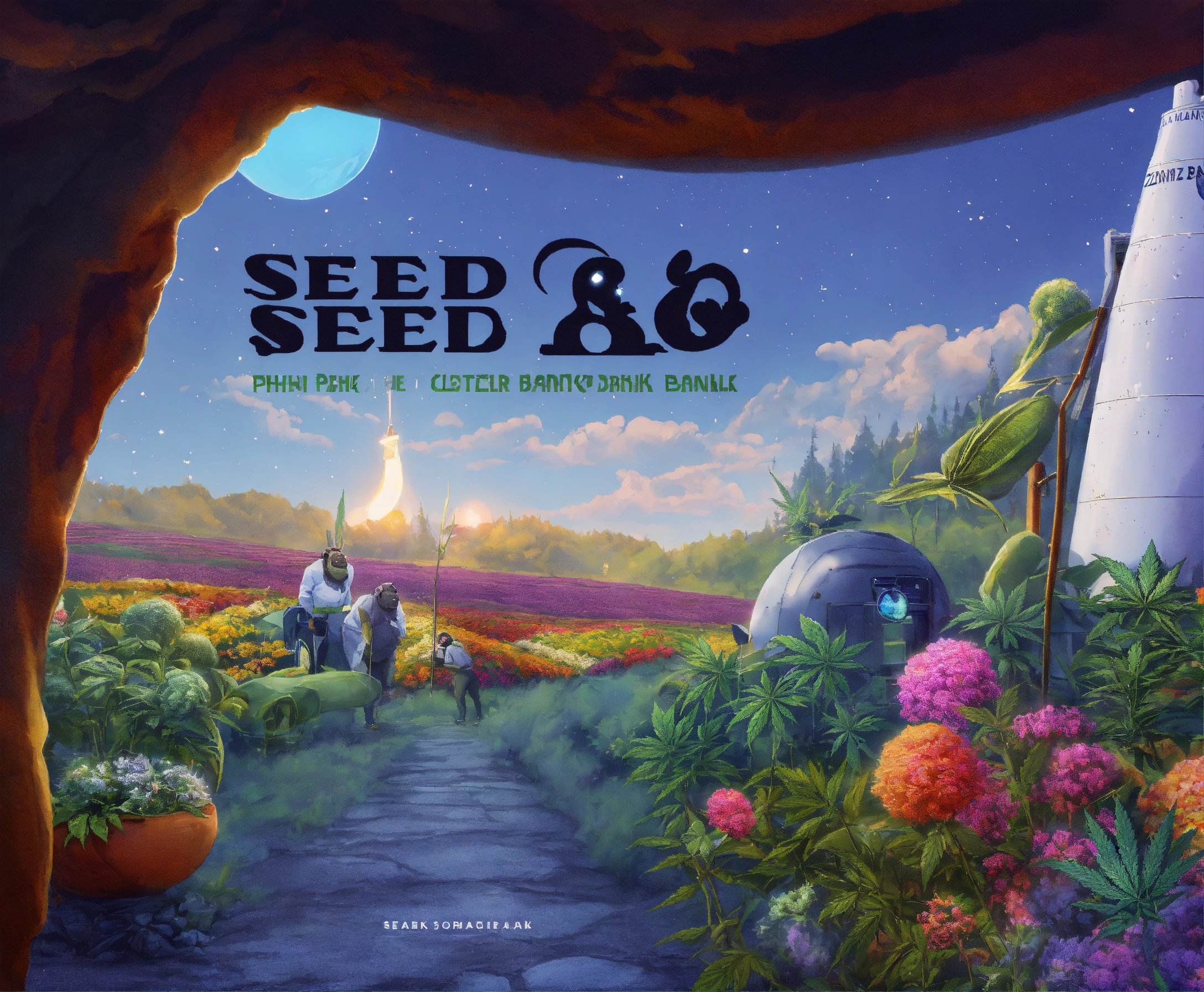 Logo of a seed store with name pheno bank, surreal, seed, plant, cannabis leaf, steam, buds flowers. gorilla, haze, zkittles rabbit, space farmer on another planet