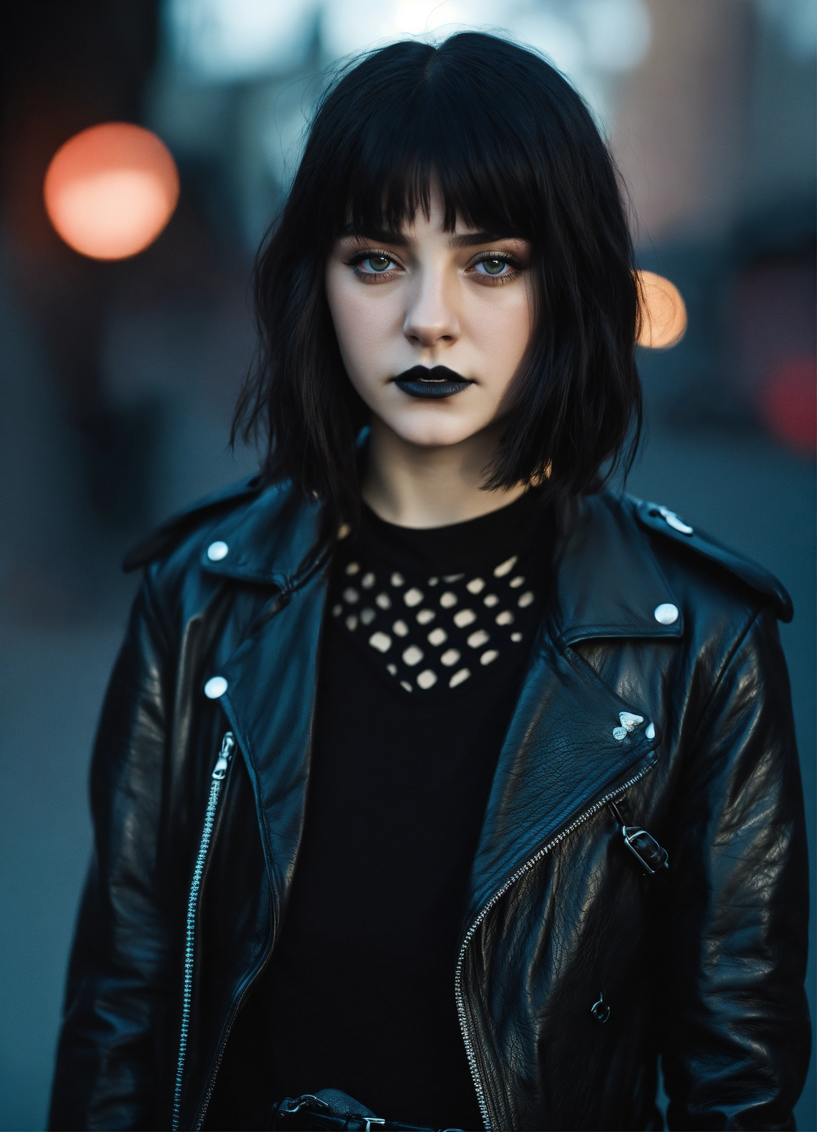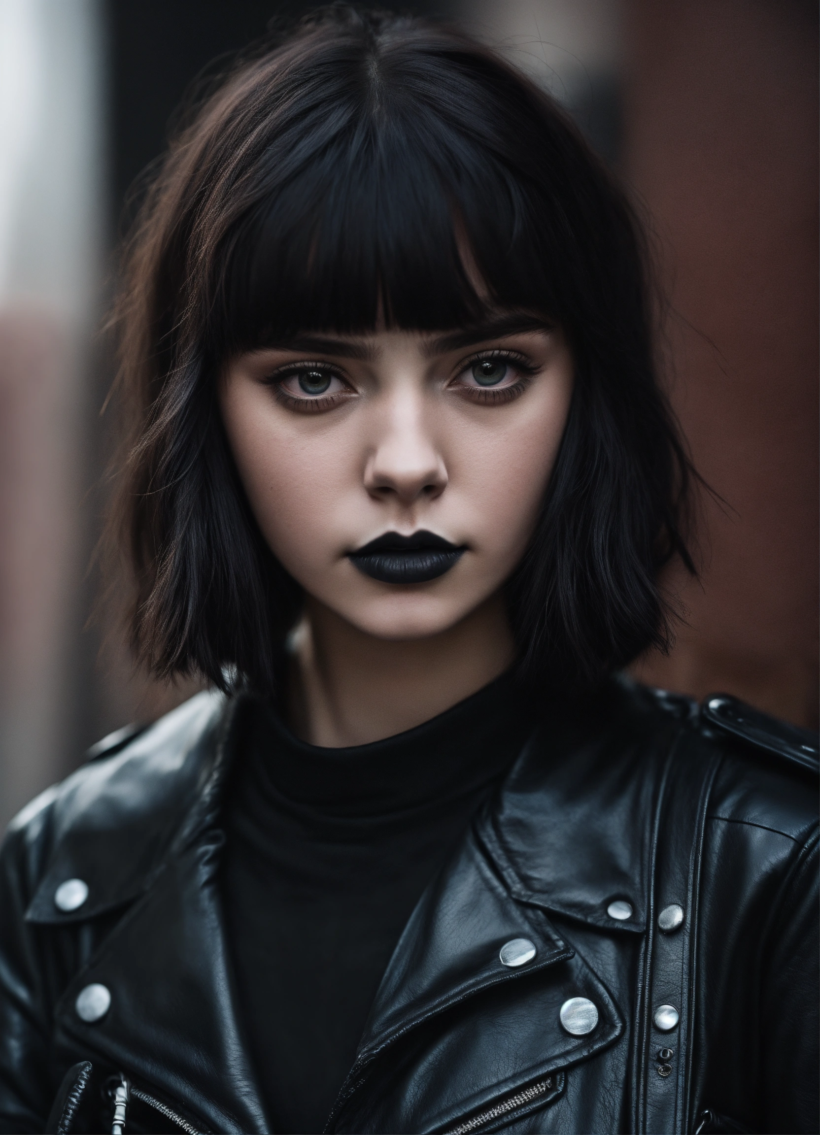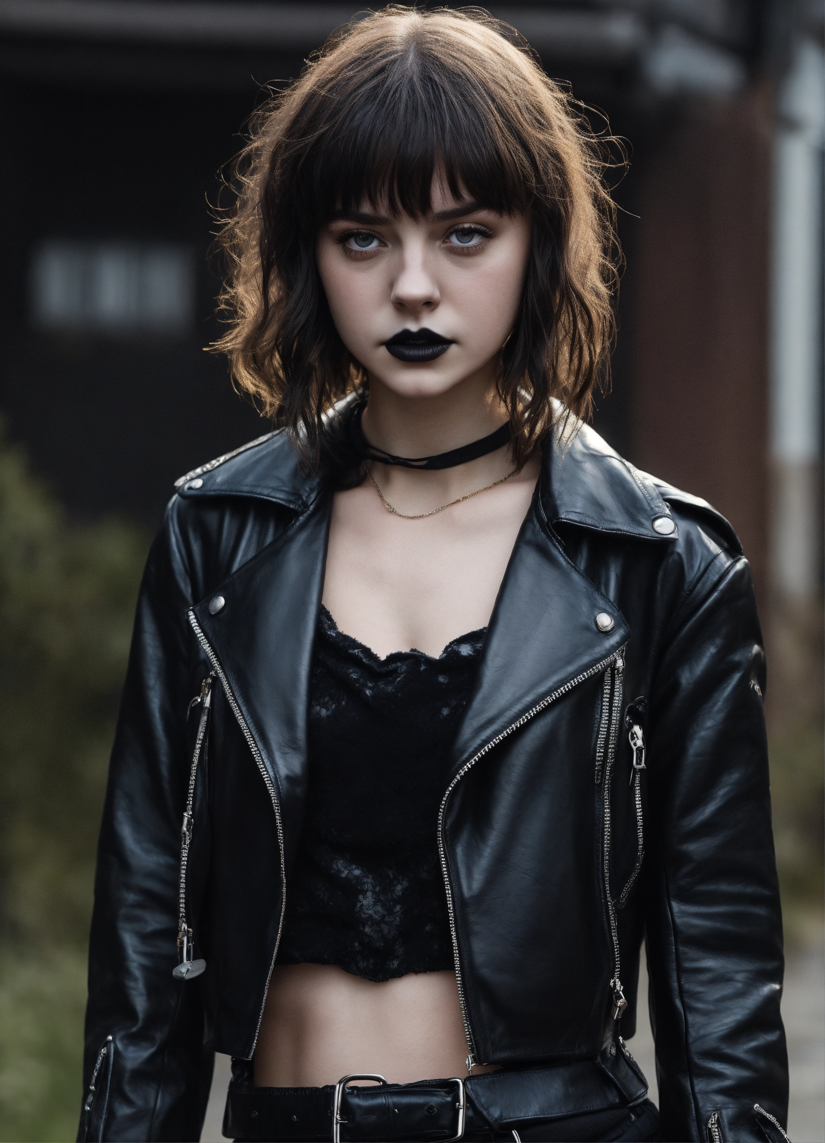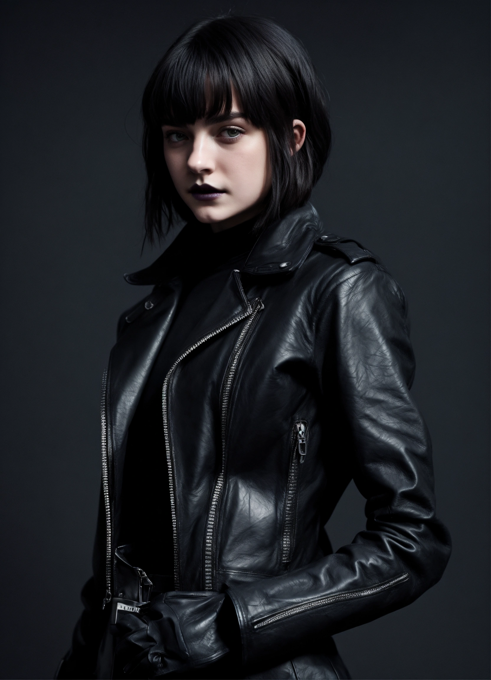 E-girl, age 20 fully body, black hair, bangs hairstyle, black leather jacket, top, pants and gloves, pale skin, high detail, highly detailed, blank background, black lipstick, walking looks like a real life version of arya stark