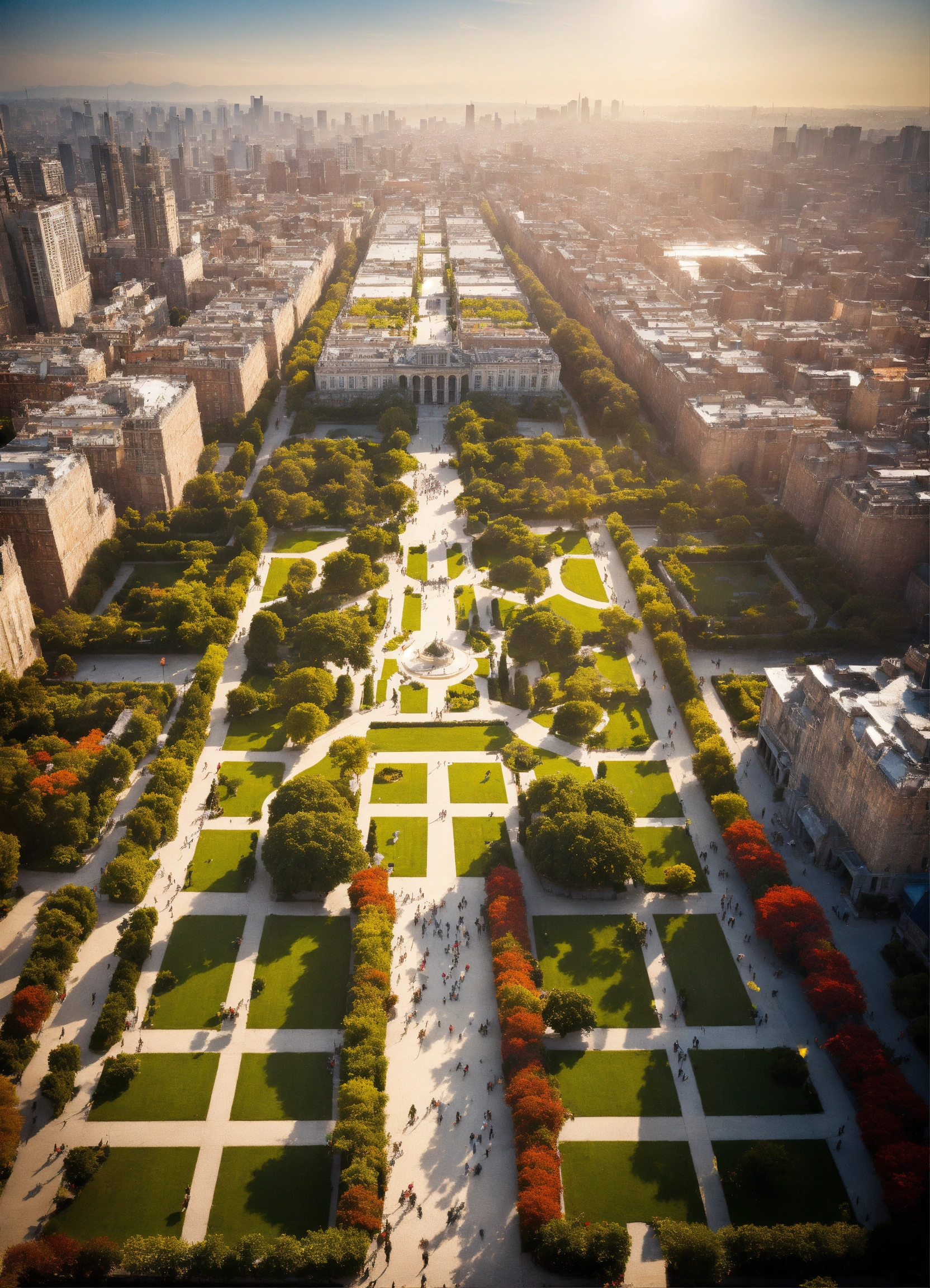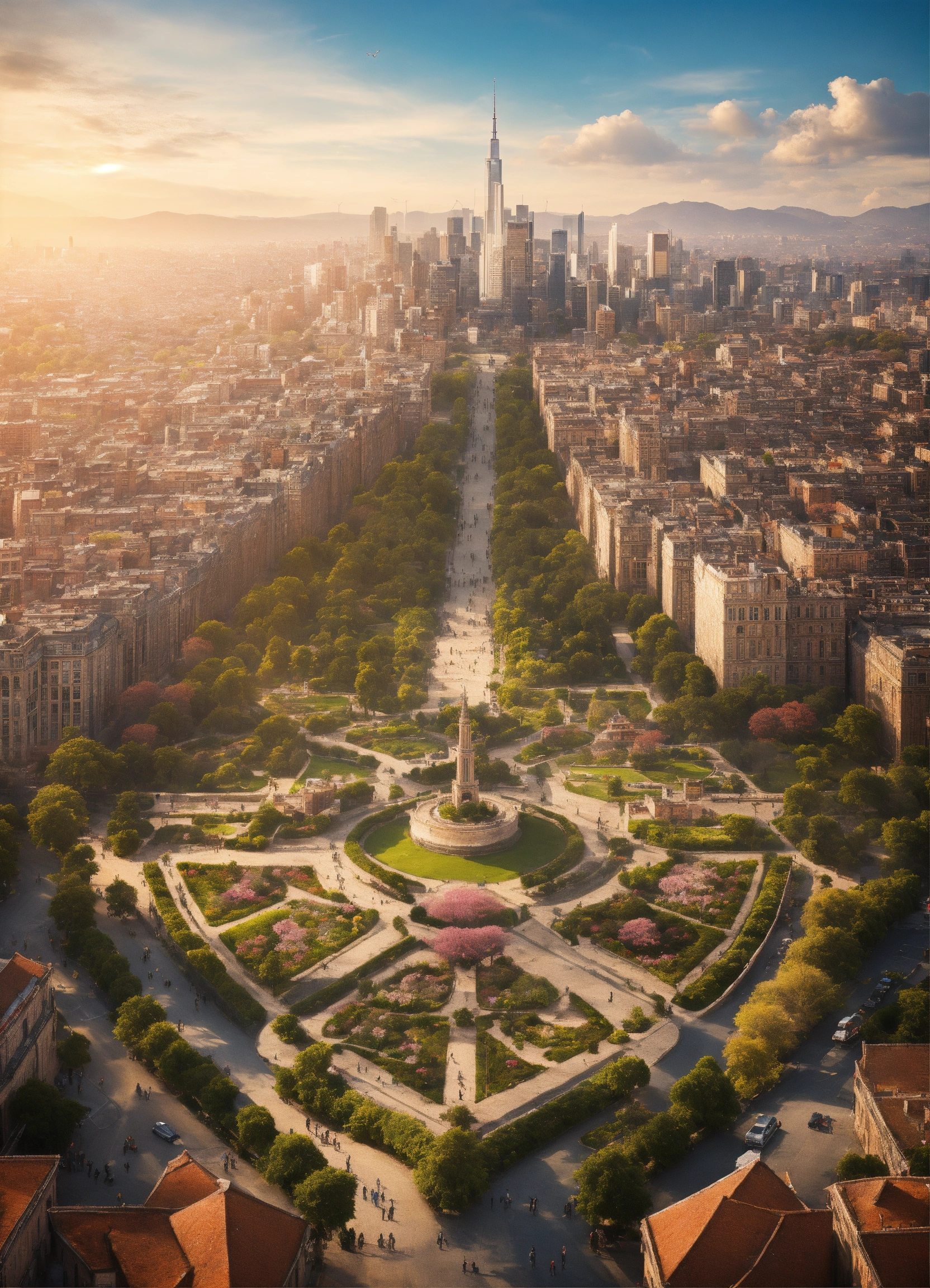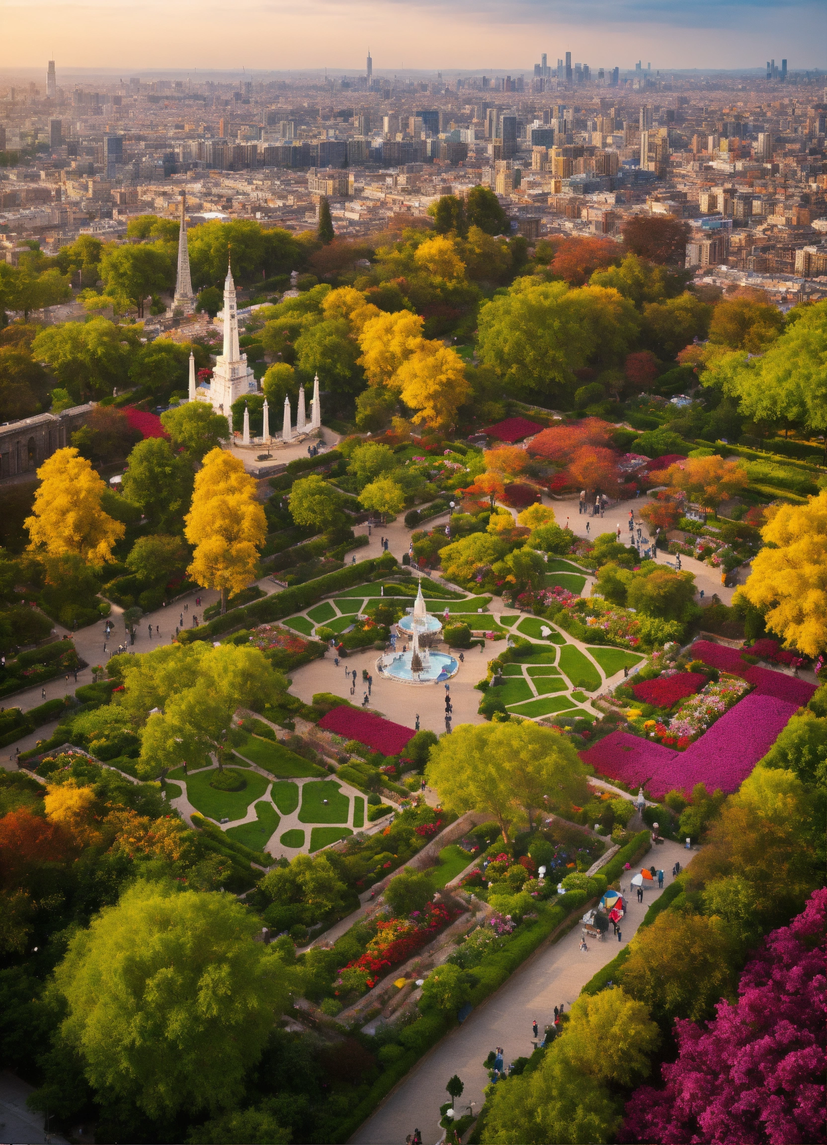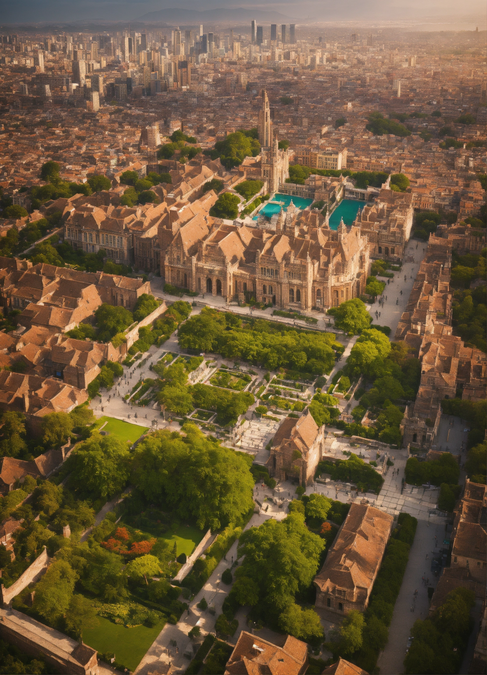 An aerial view of a city was known for its towering buildings, enchanting gardens, and the harmonious hum of people from all walks of life