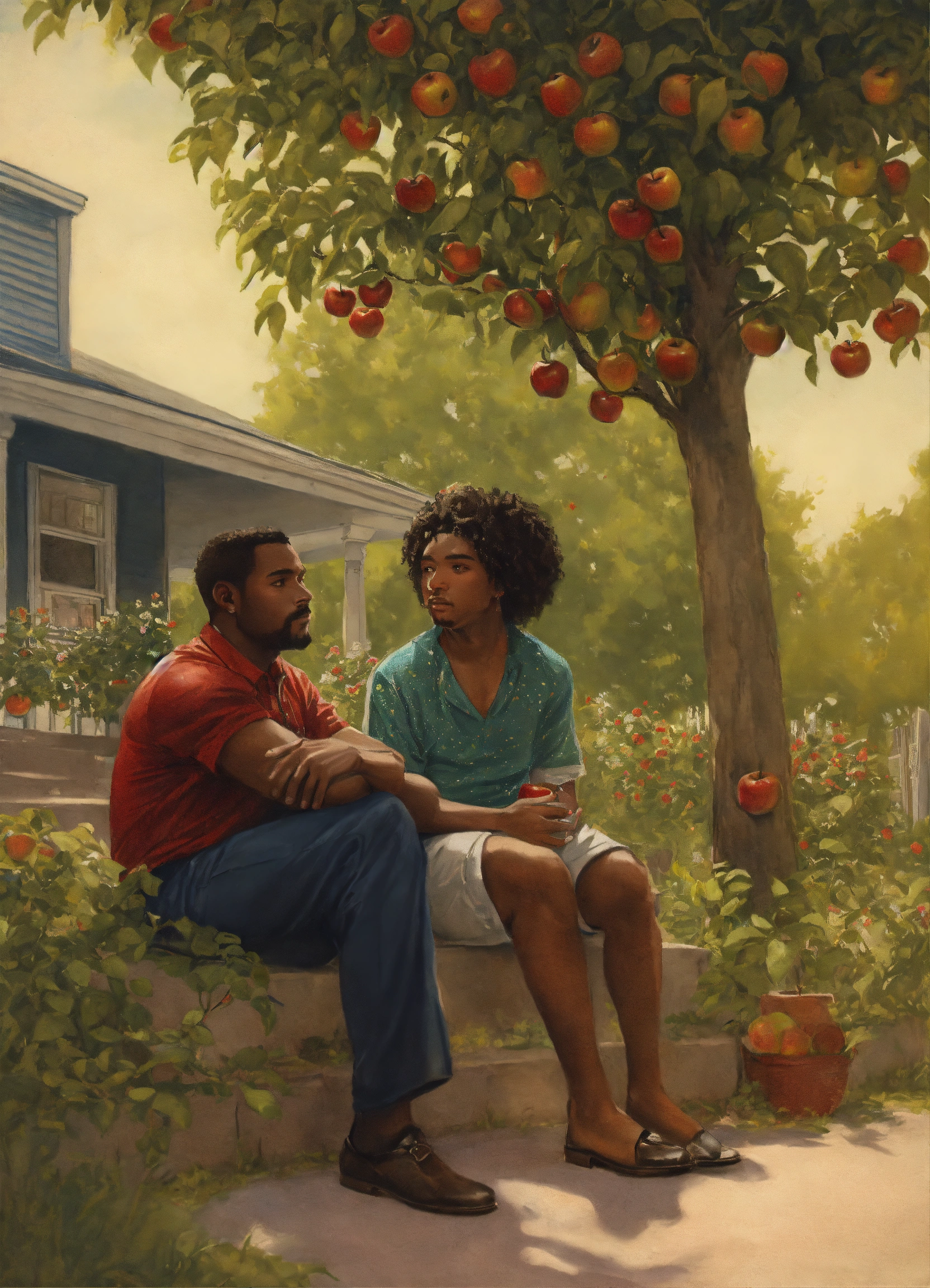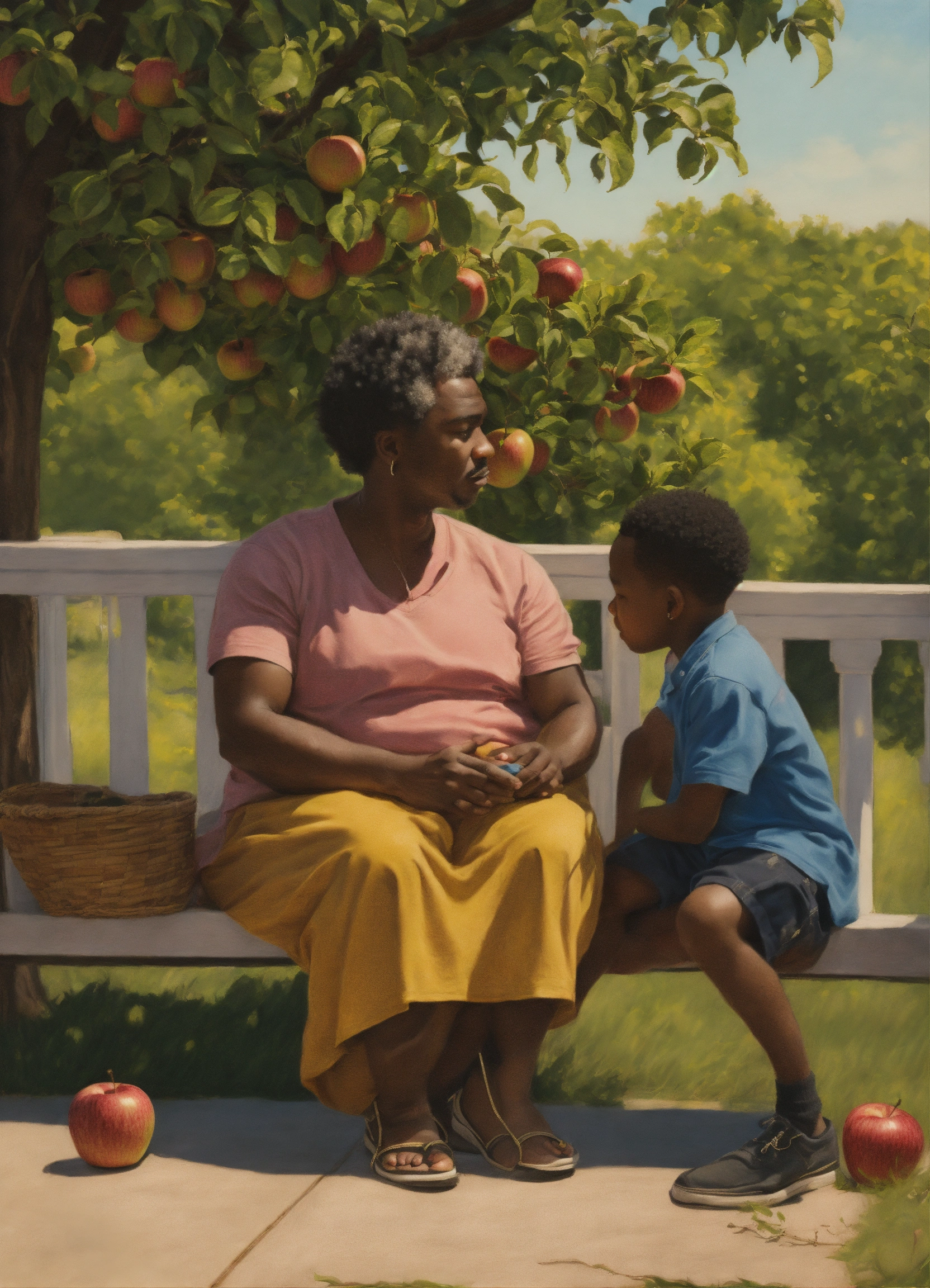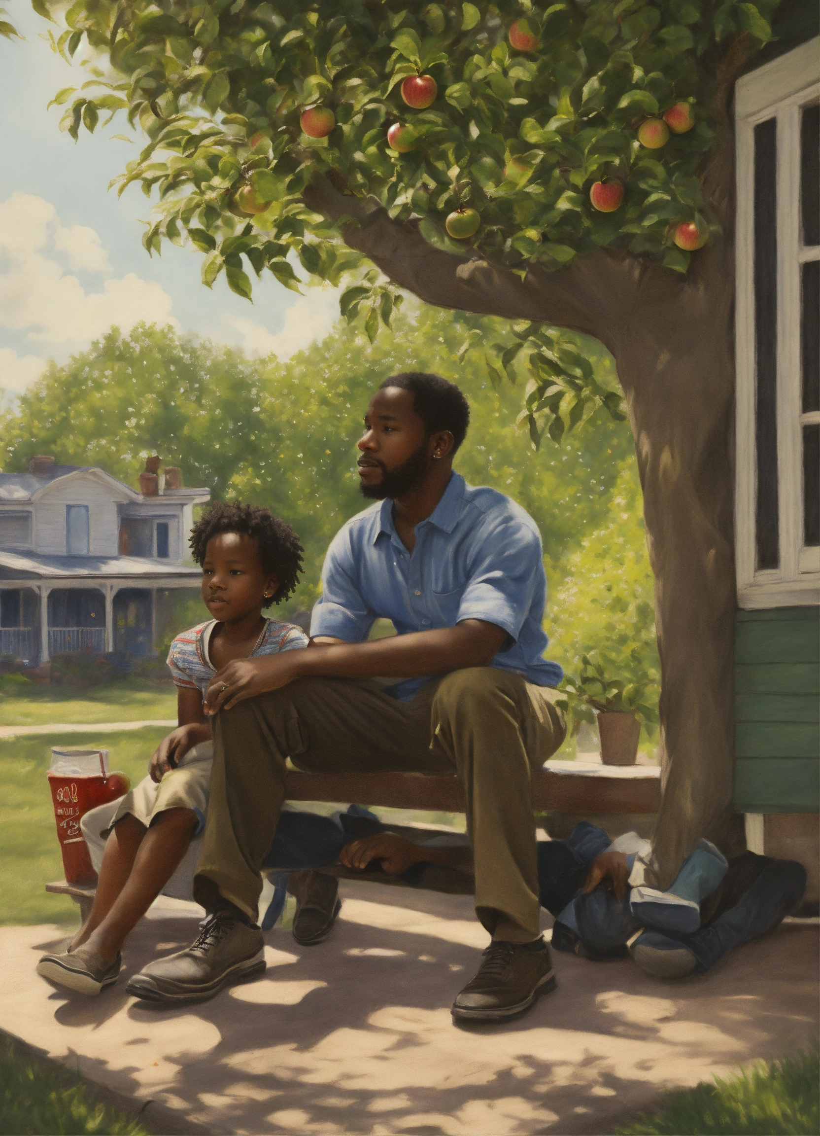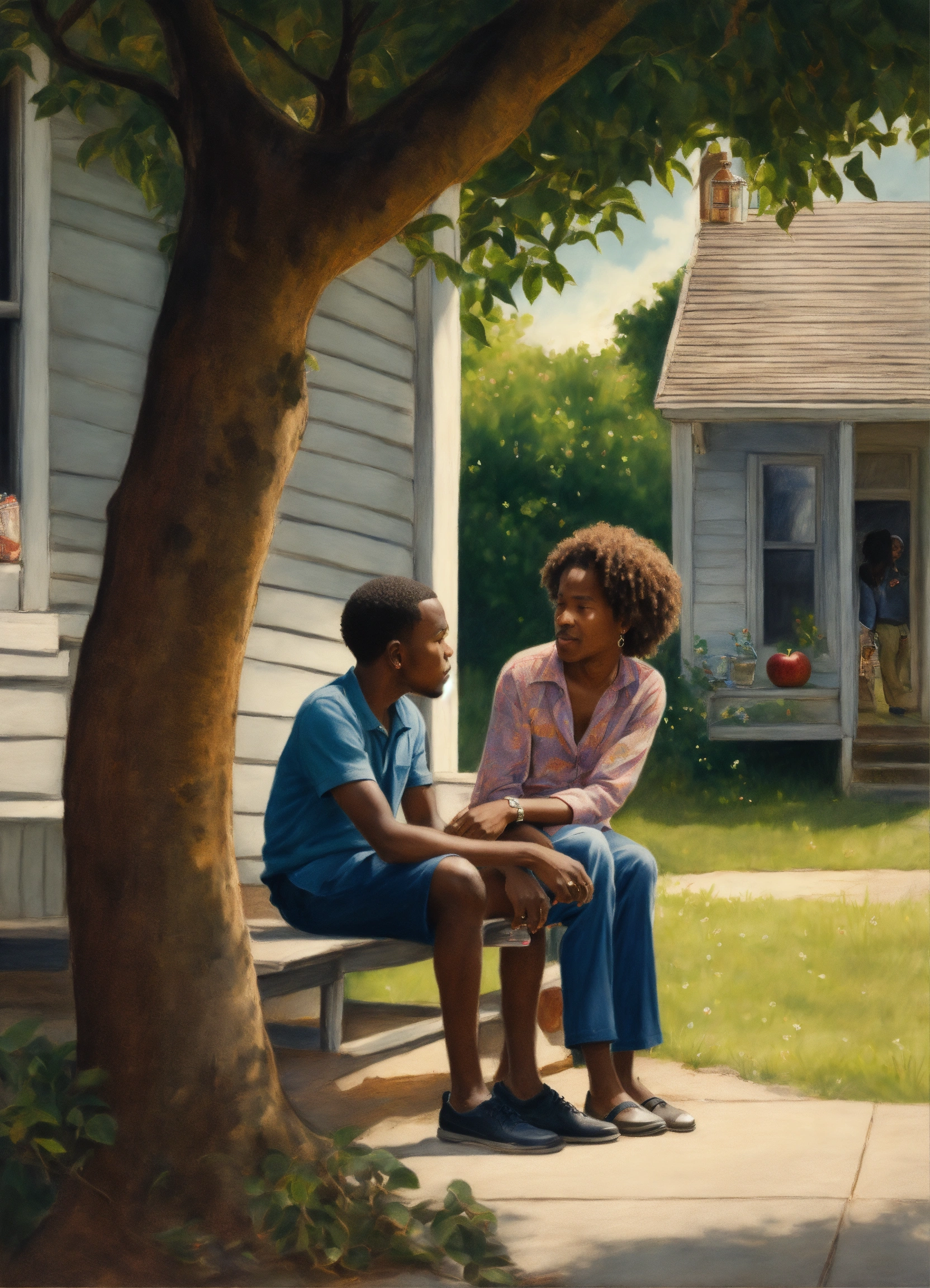 Realism drawing. outside, on the porch, a six-year-old black boy sits on a 50 year old black woman's lap. a 25-year old black man talks to a 50 year old man under an apple tree.