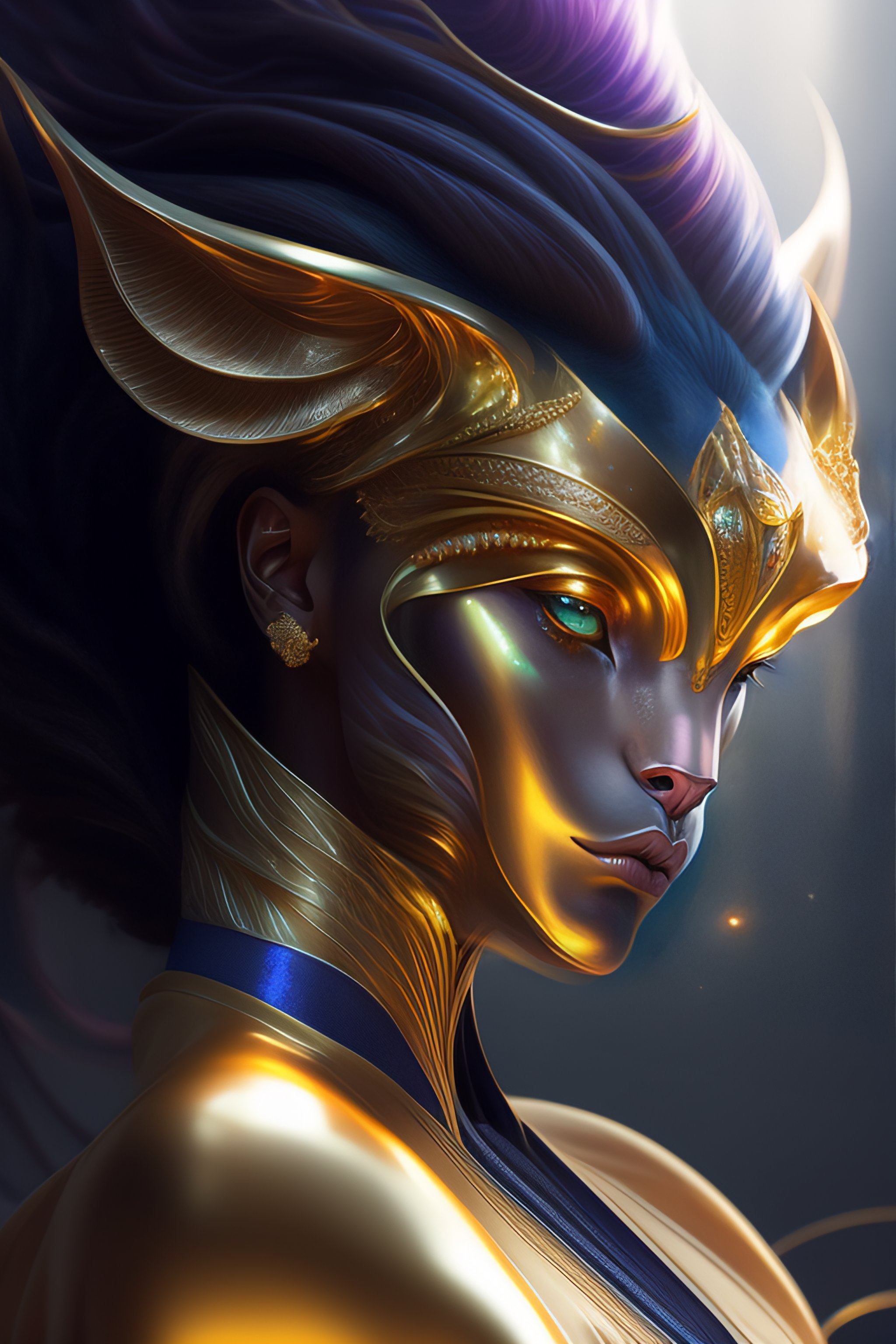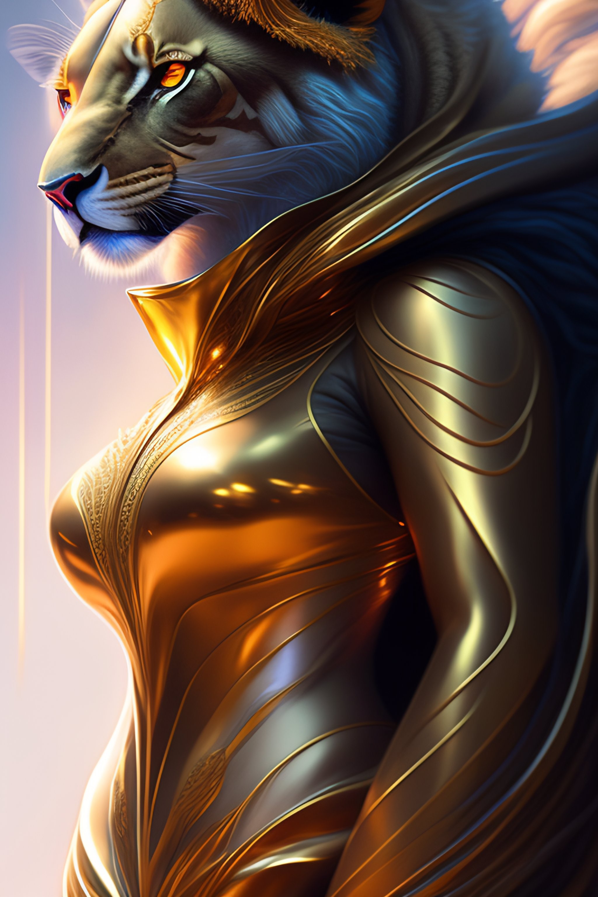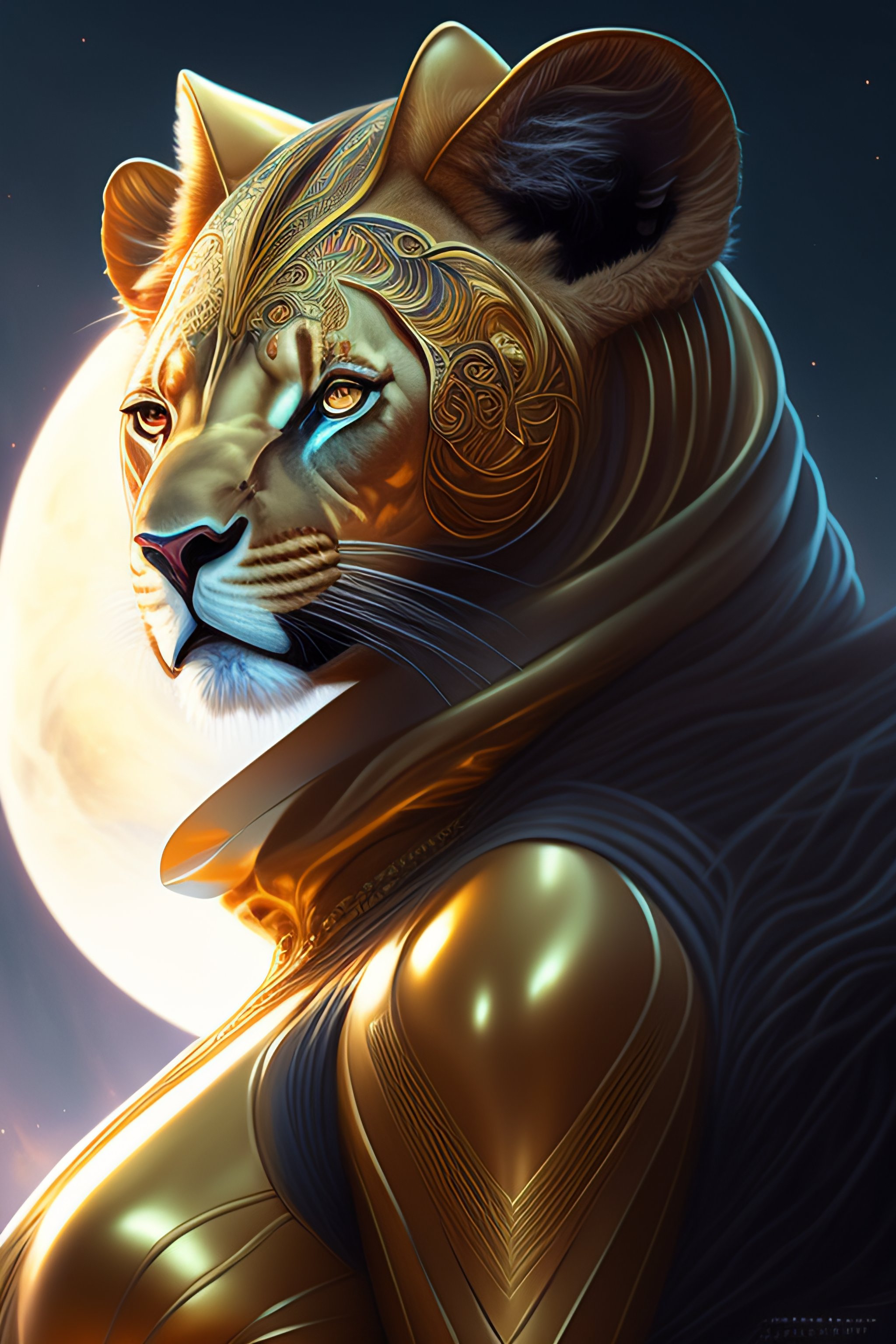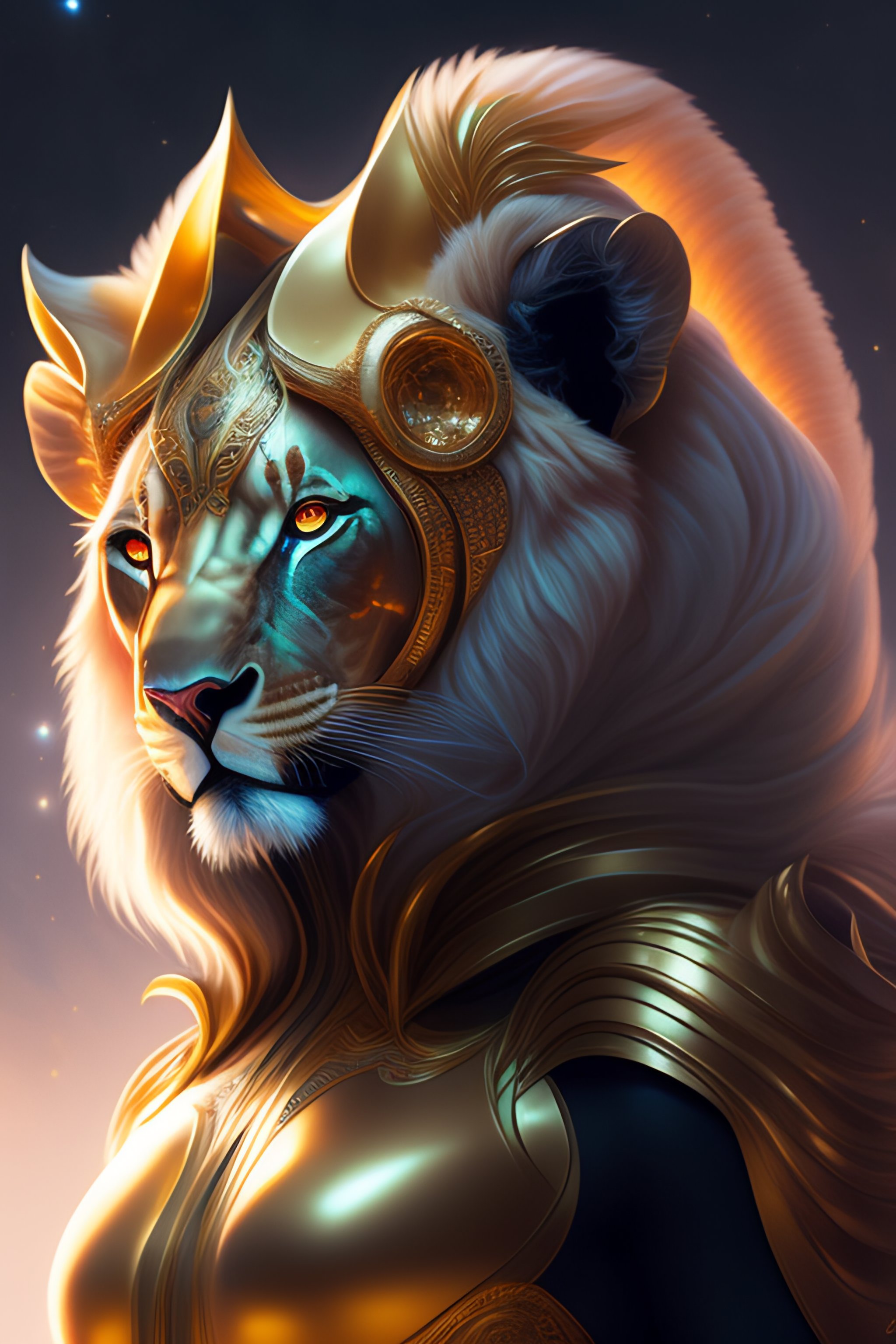 Alien lion in futuristic suit, portrait, fantasy, intricate, elegant, highly detailed, digital painting, artstation, concept art, smooth, sharp focus, illustration, art by artgerm and greg rutkowski and alphonse mucha