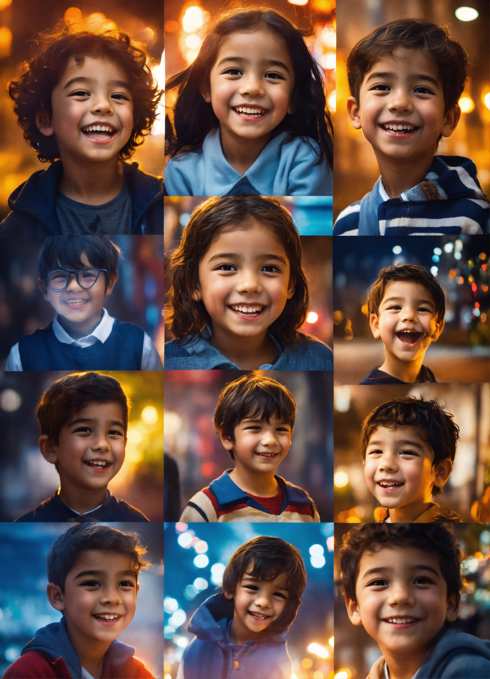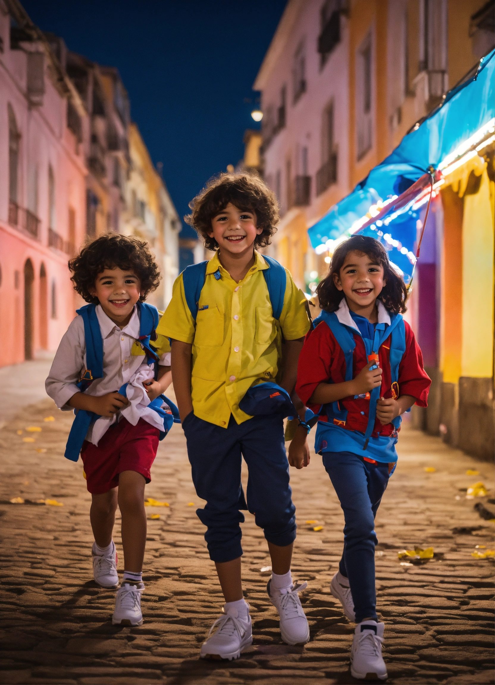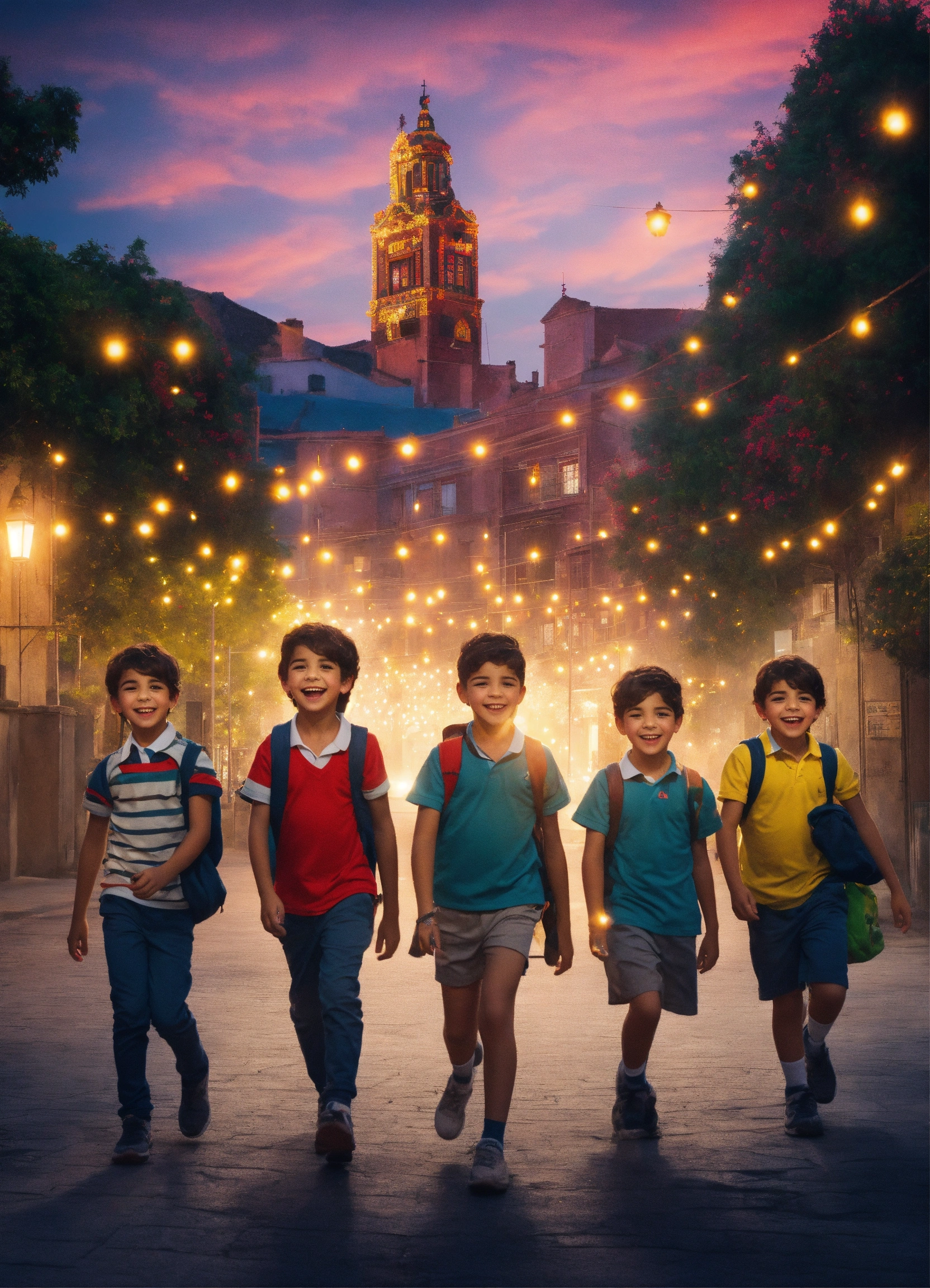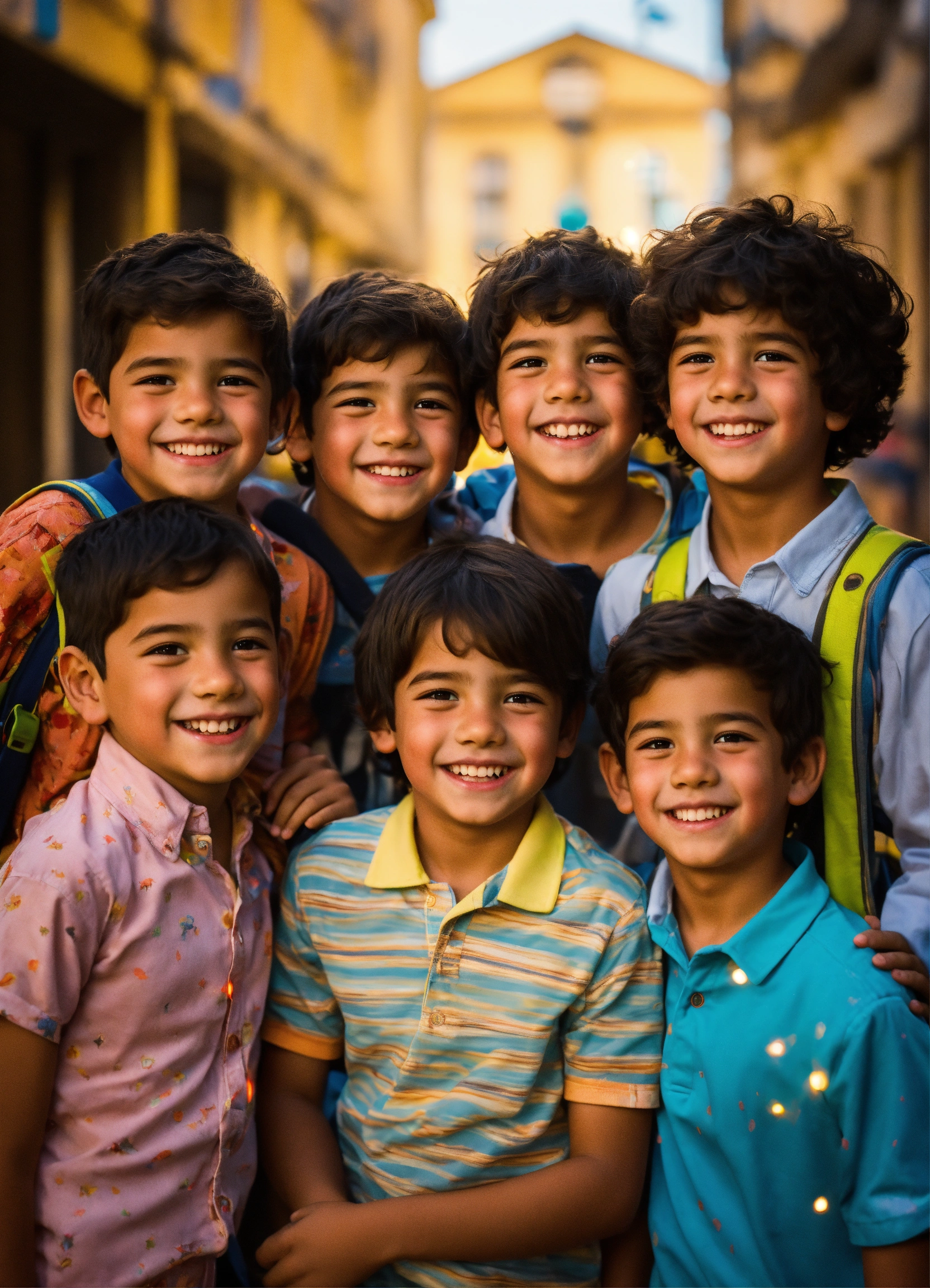 5 niños de colegio, caminan en la ciudad, con rostros sonrientes y de sorpresa, rostros bien definidos y nítidos, luces neón. estilo portada de película de espías de niños.