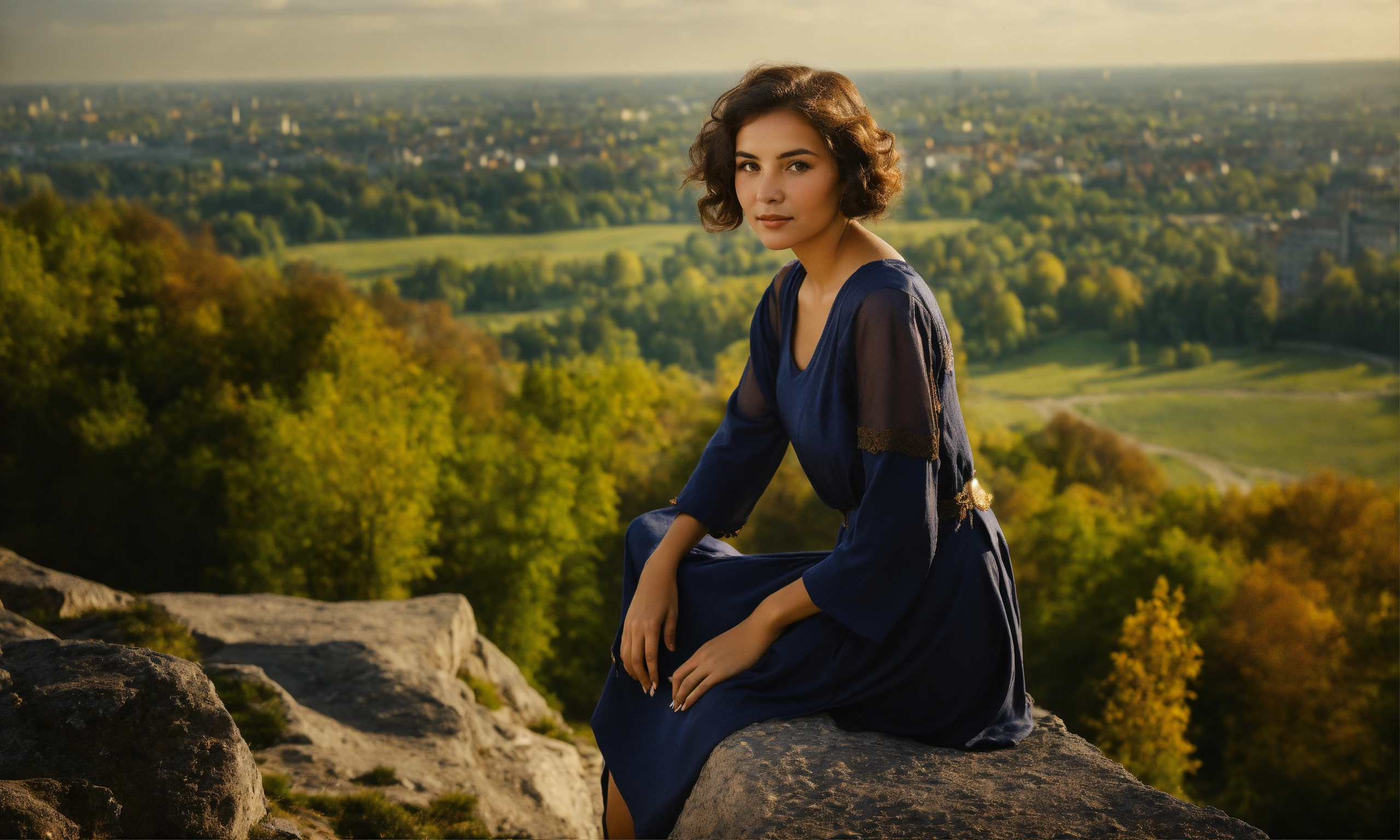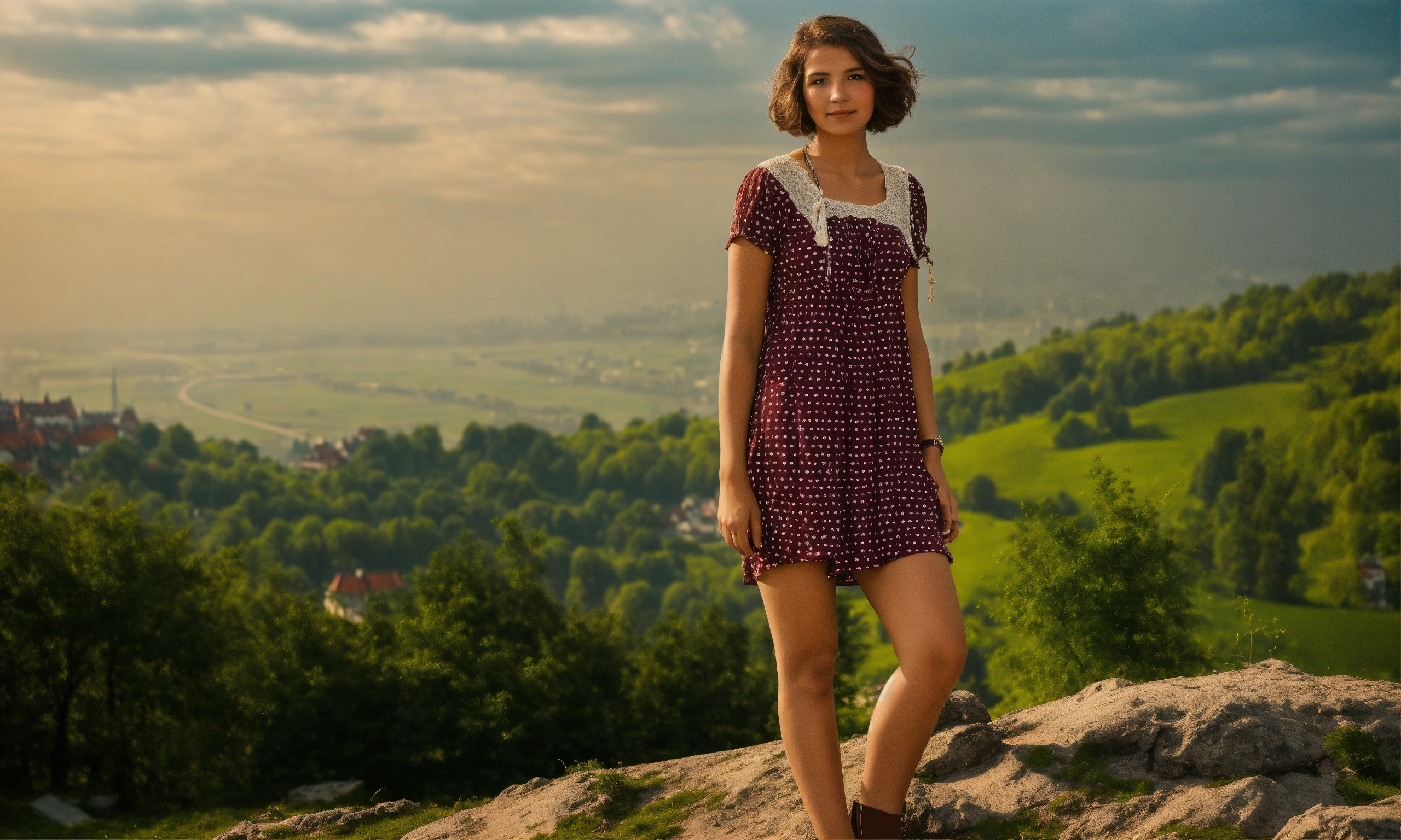Warszawa 1920-1930, buaty woman 18 age brunette hair, on top of a mountain, looks at the camera at full height, casual dress.