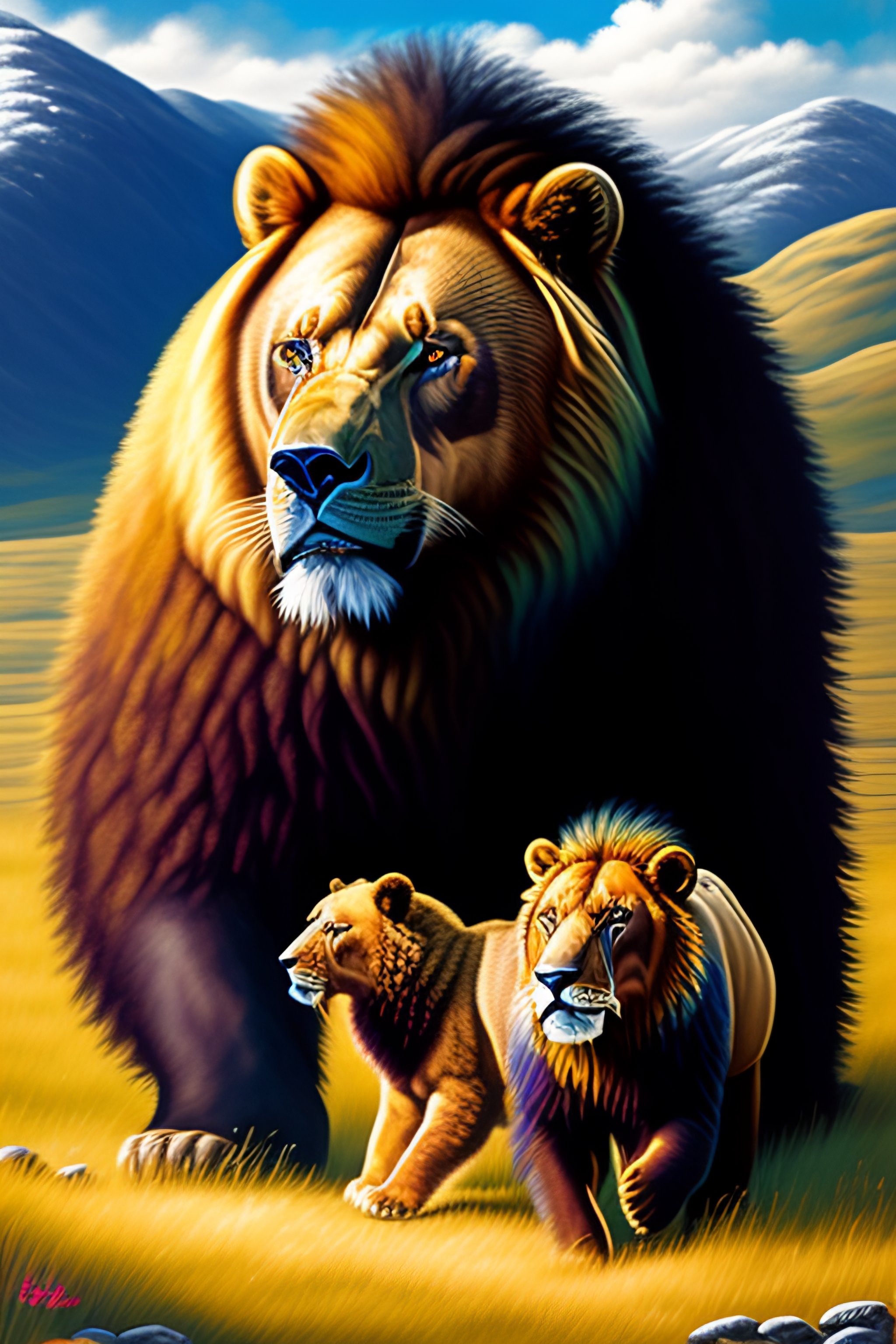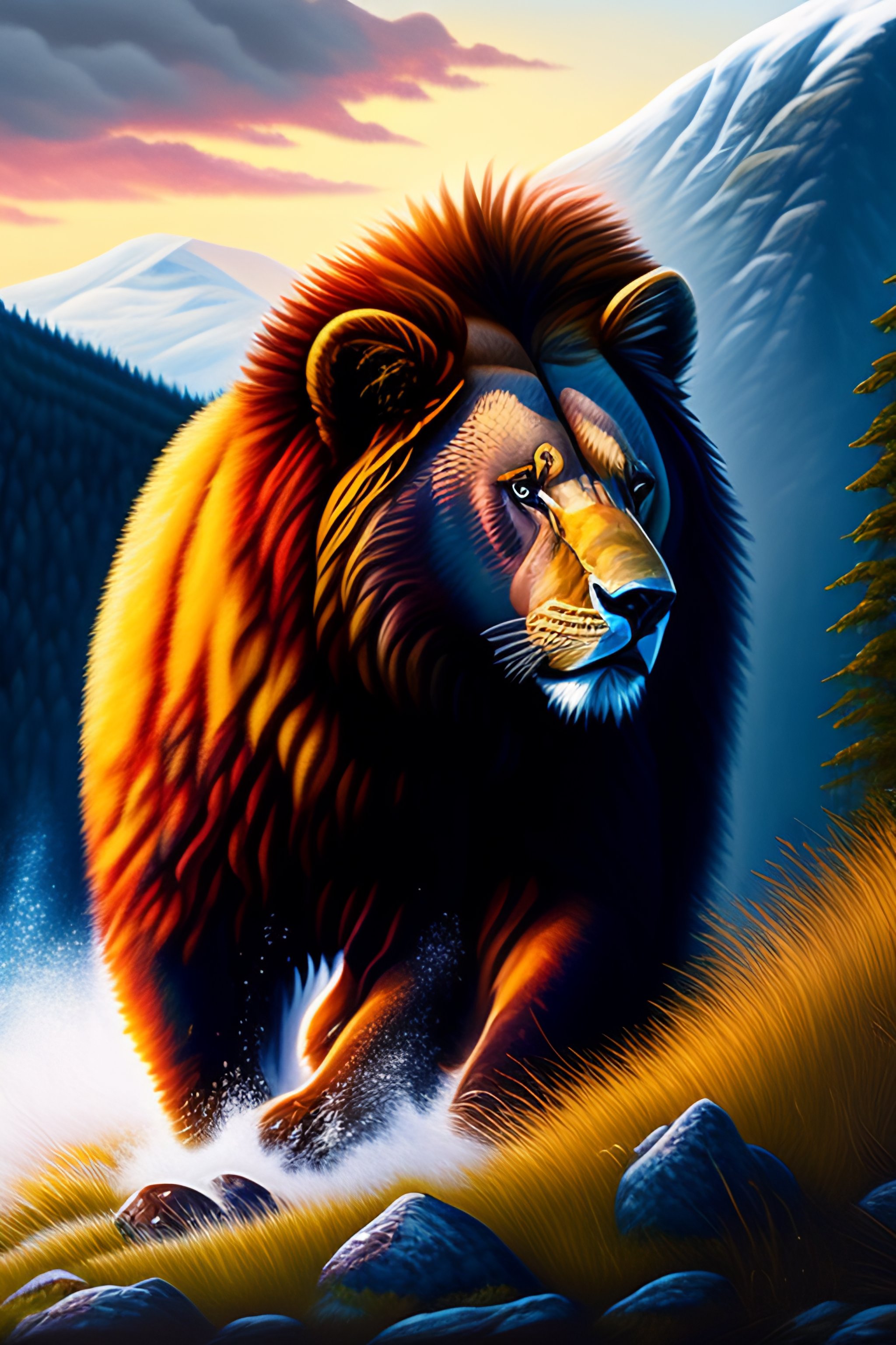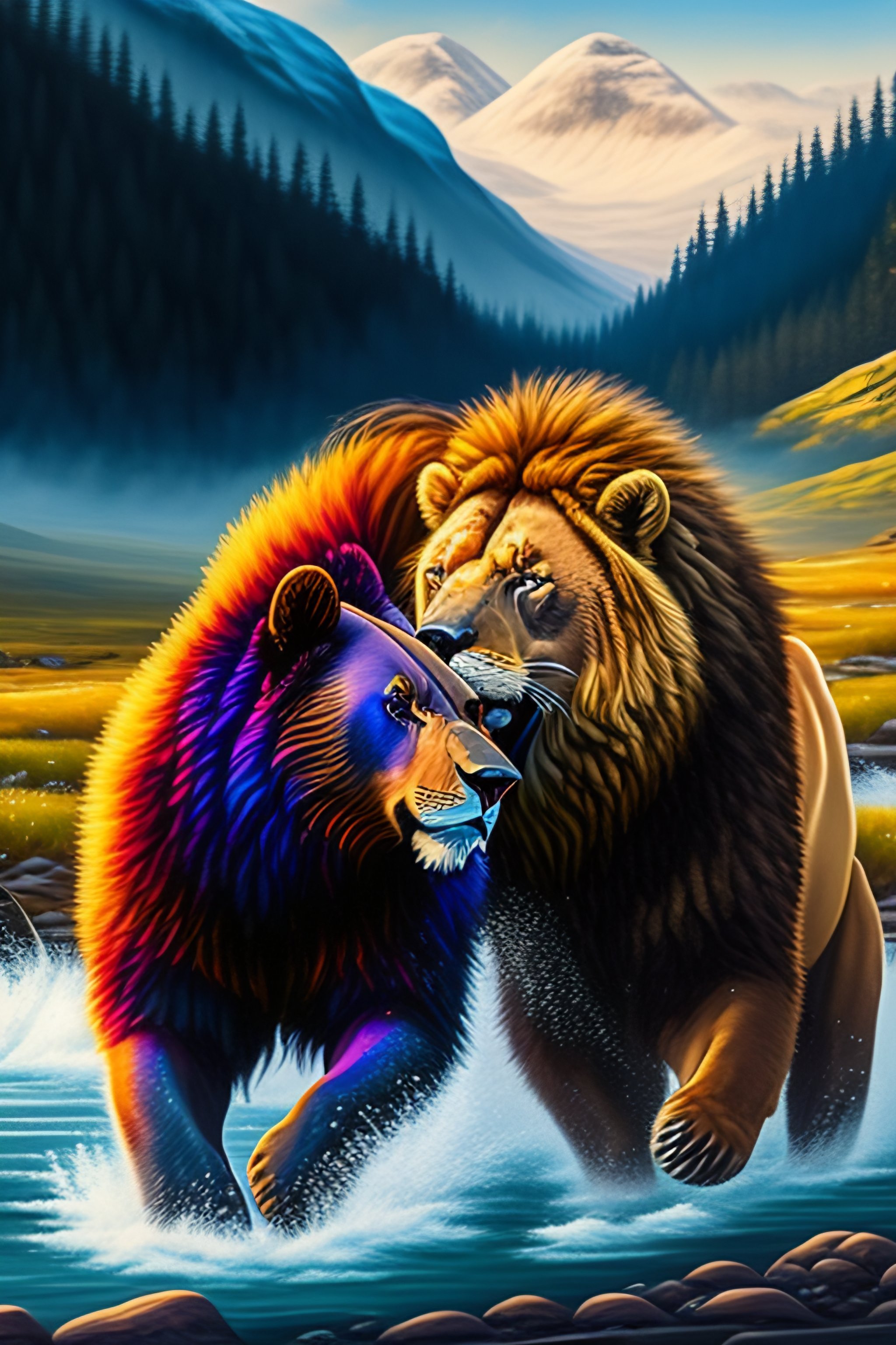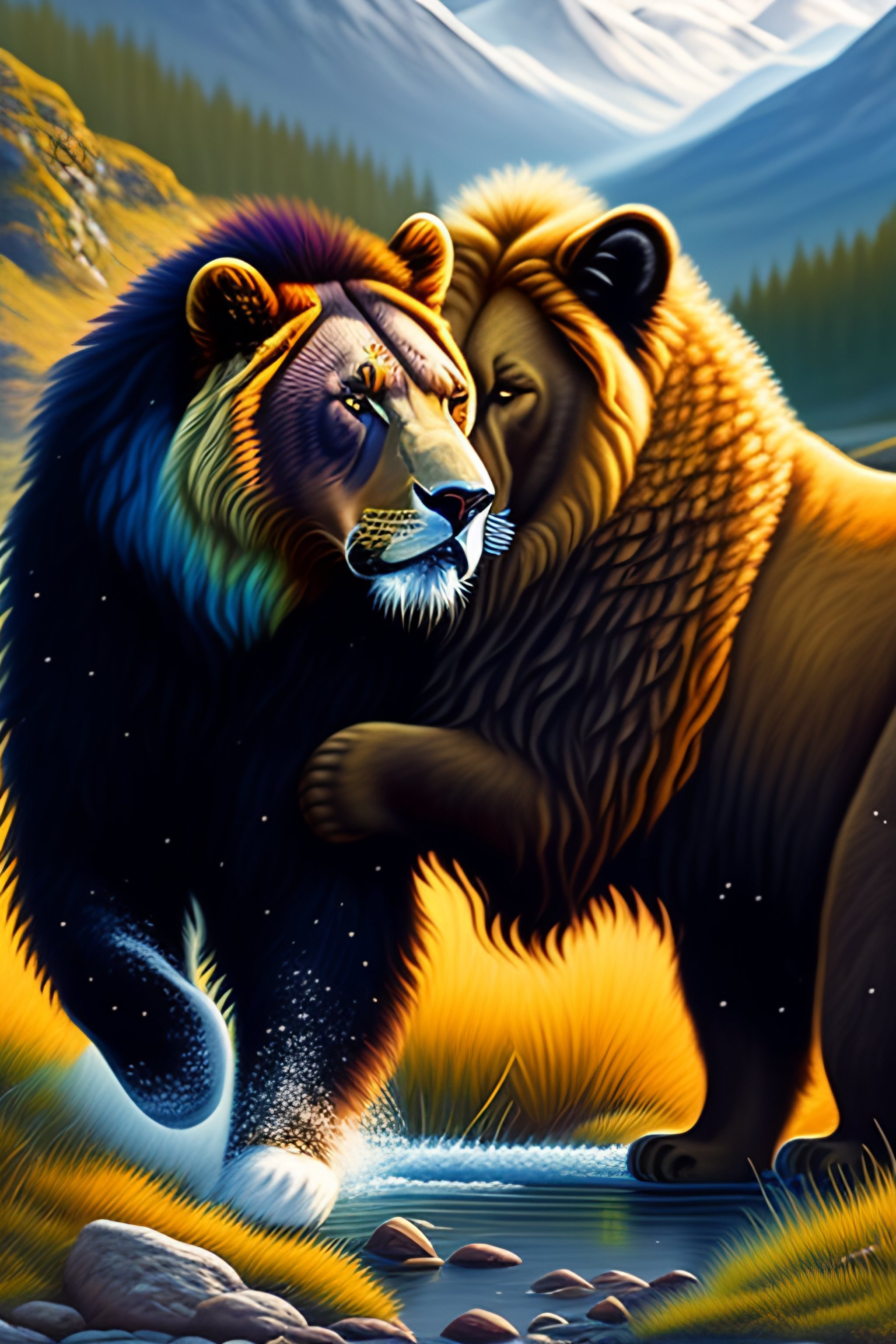 Grizzly bear and a lion fighting violently, scottish highlands, adventure, action, paint, bright colors, super detail