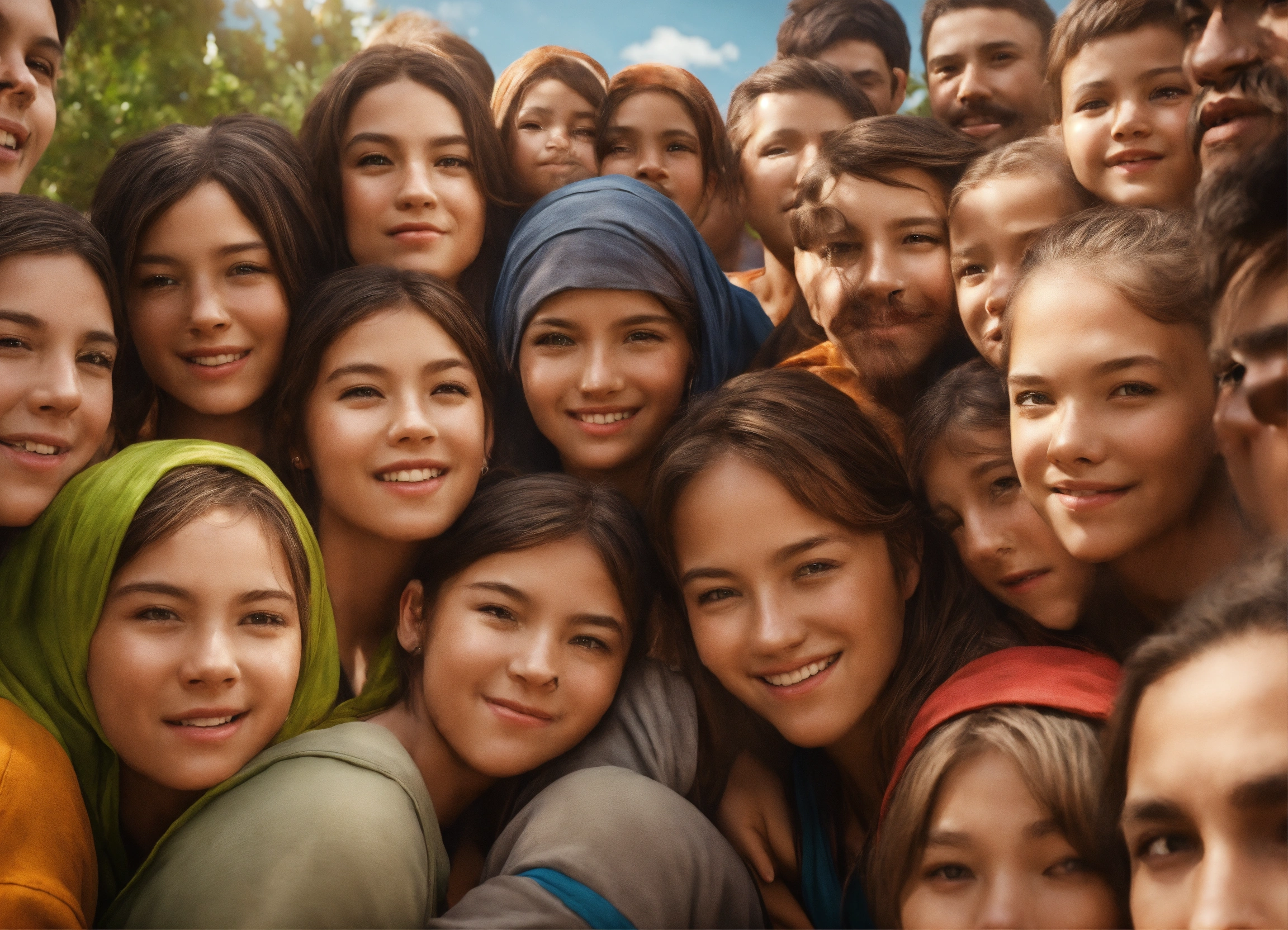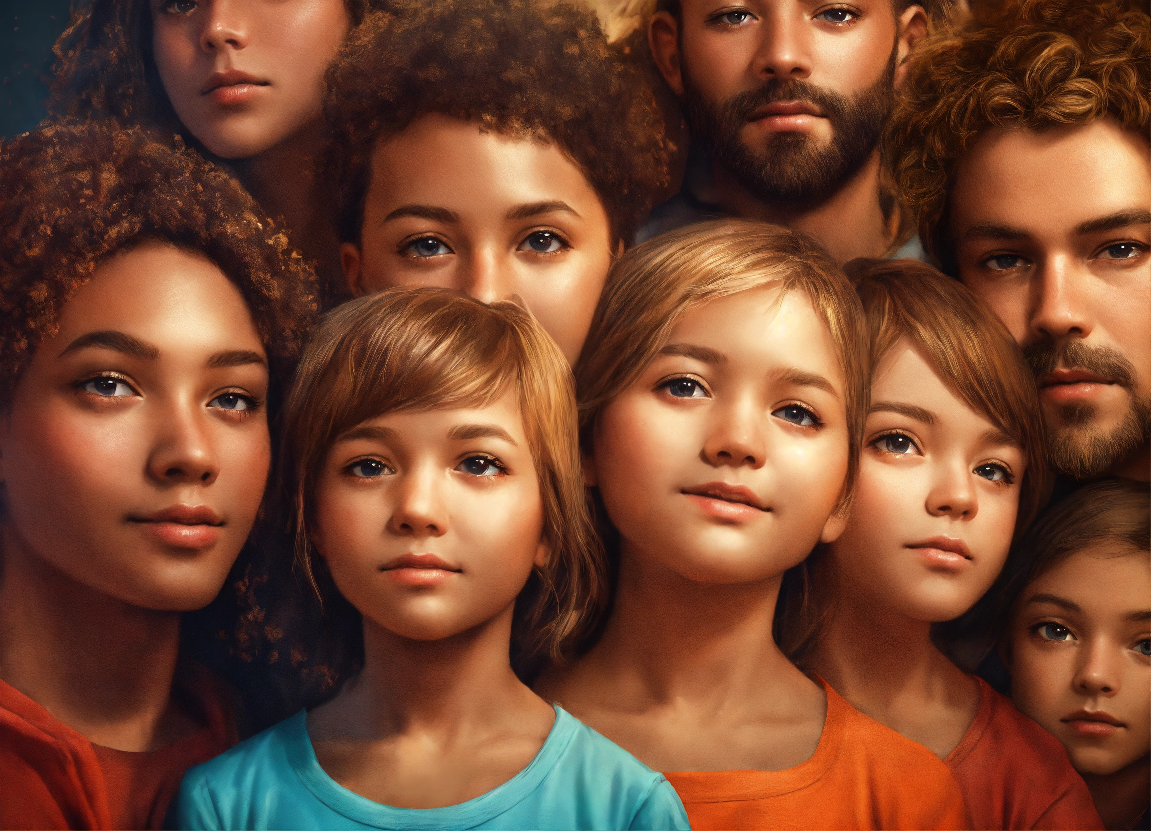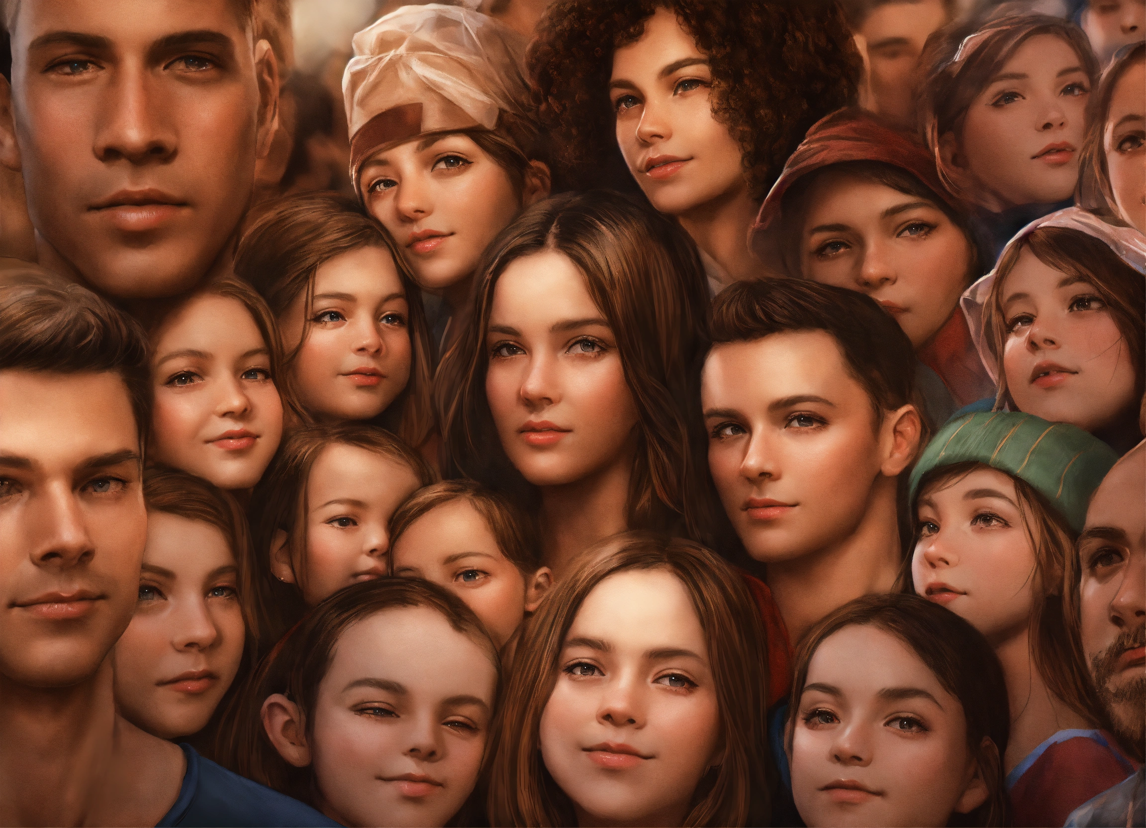 Many national, many faces together, man, women, children, drawn photorealistic with correct anatomy, 8k, dynamic lighting, hyperdetailed, deep color