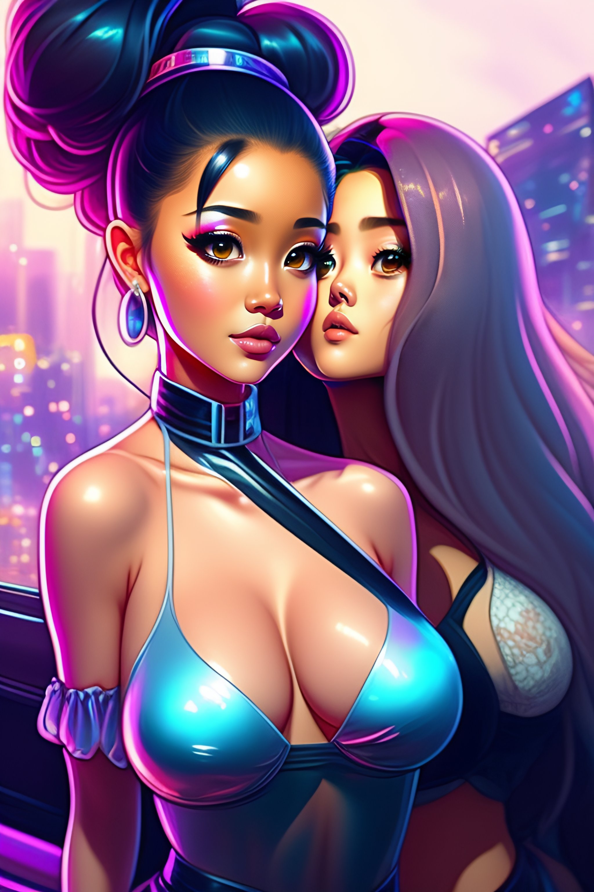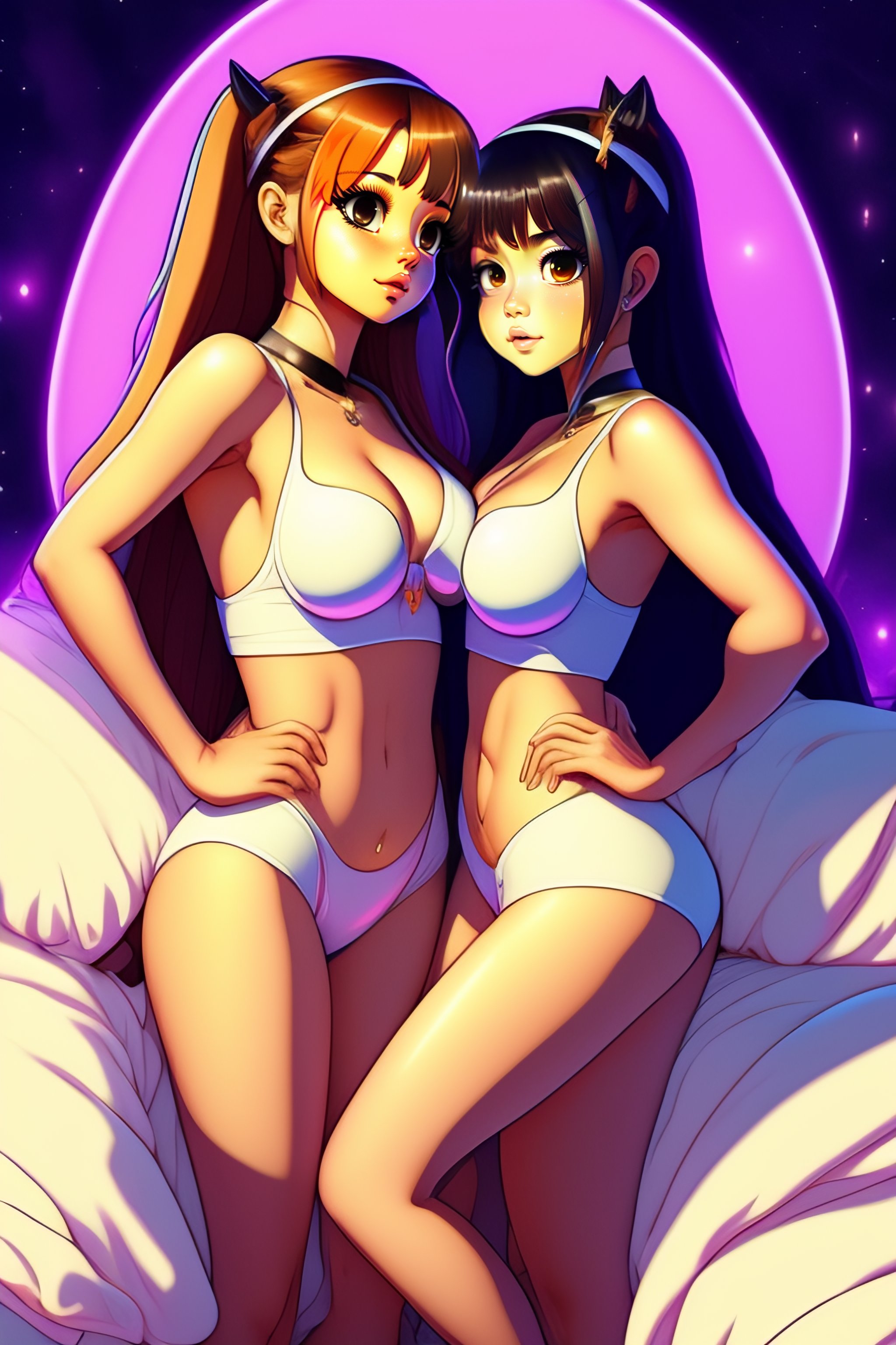 Full body kawai girls like ariana grande and selena gomez hugging with a cute expression in a transparent piece of micro under wear in a bed, hyper detailed painting, laurie greasley style, studio ghibli, akira toriyama, 4k, vibrant colors, trending on deviantart, trends in artstation, high details