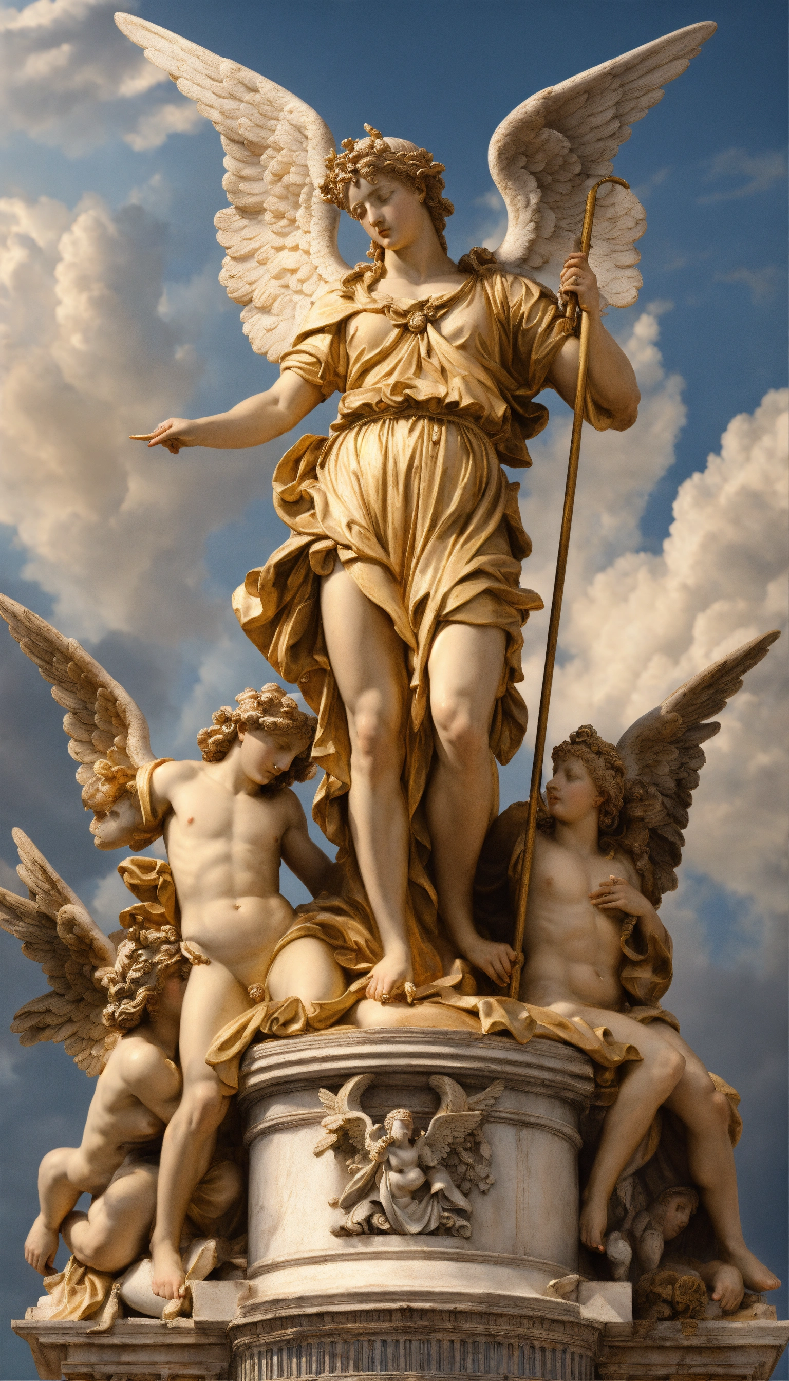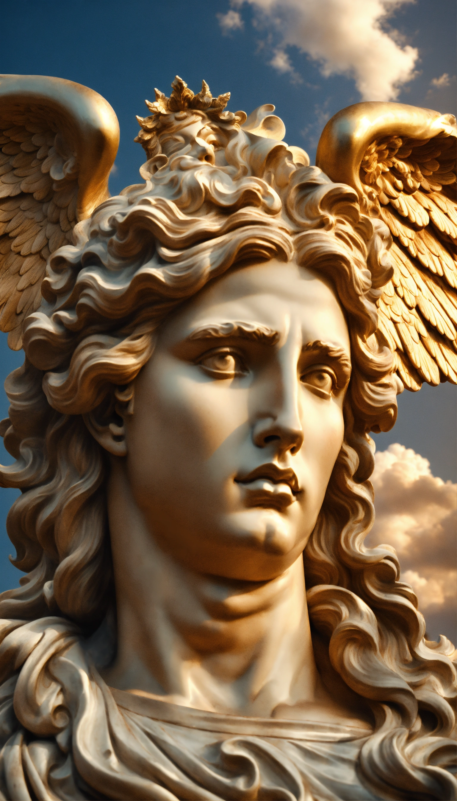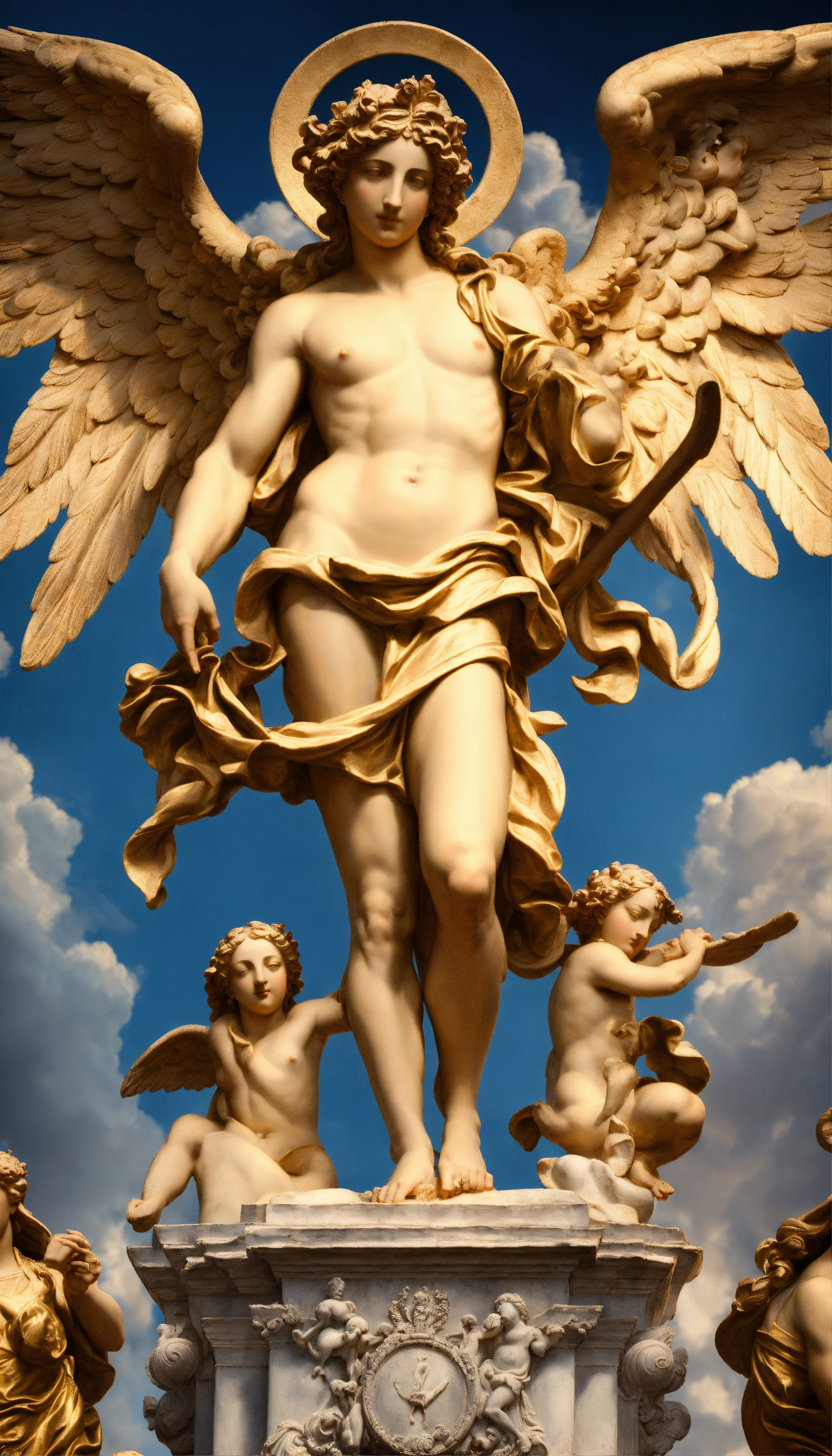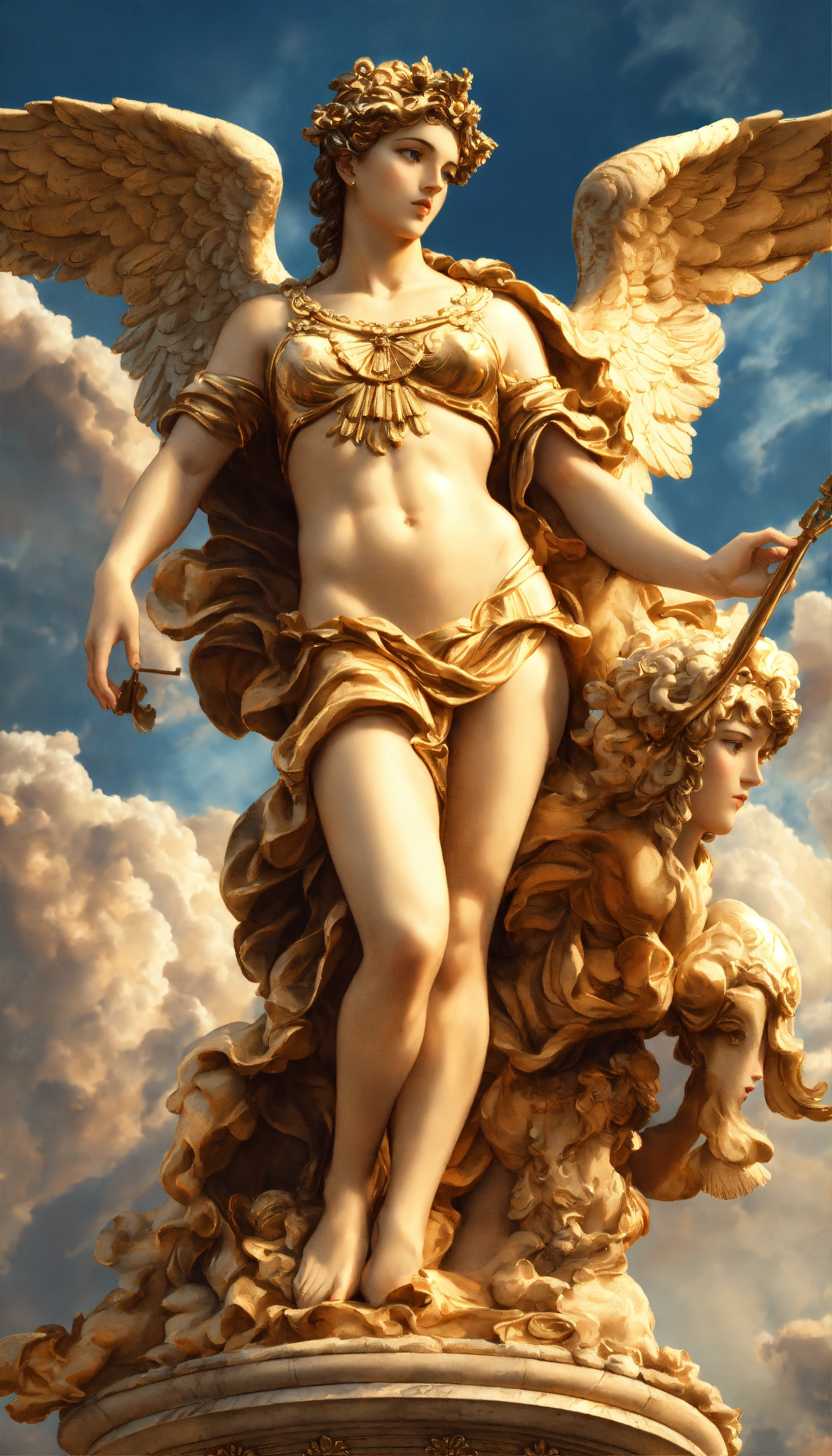 Greek baroque art representing greek statue of gods and godesses with clouds, angels, renaissance art, realistic painting style, hyperdetailed, 8k, hyperrealistic render, close up, intricate details, masterpiece