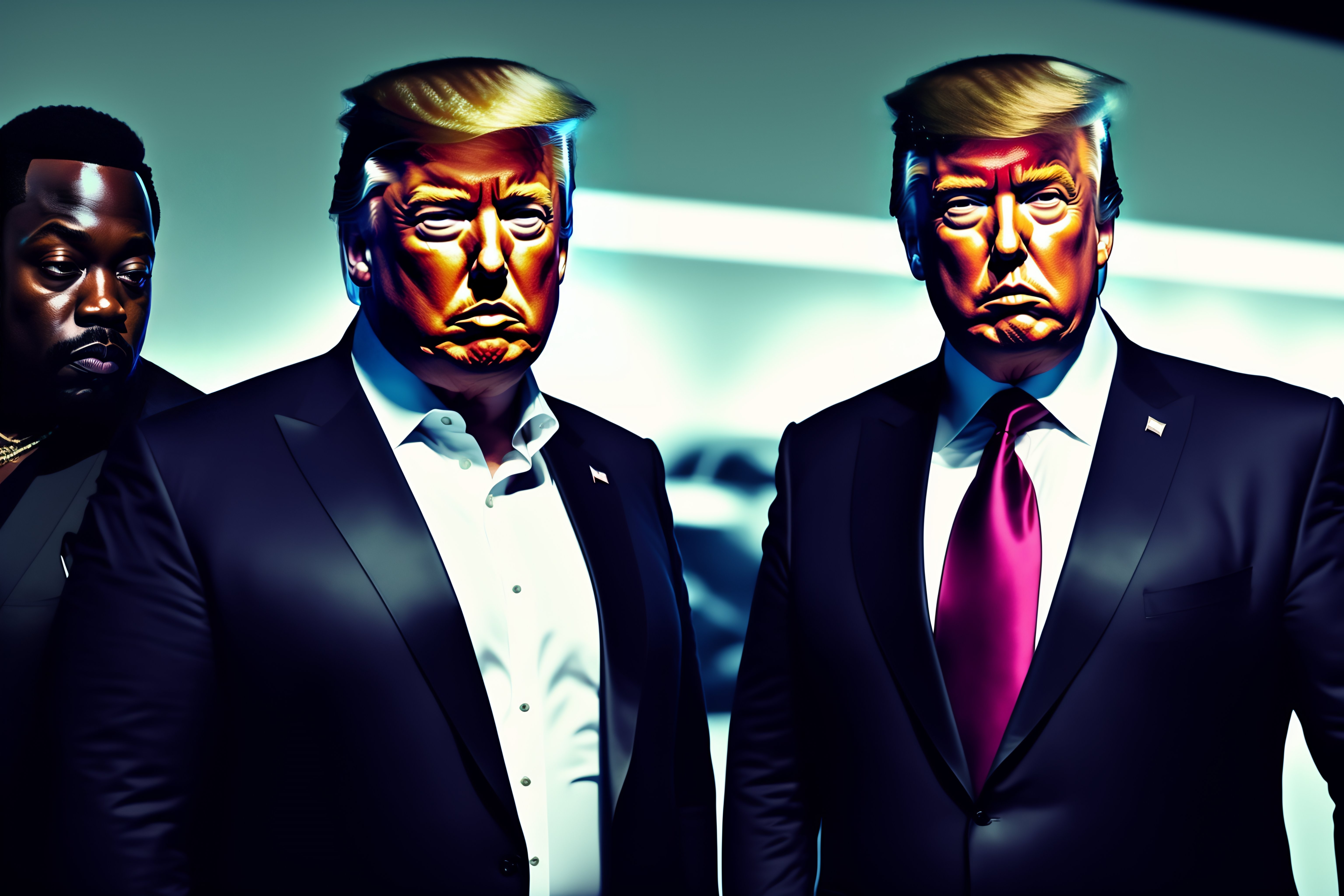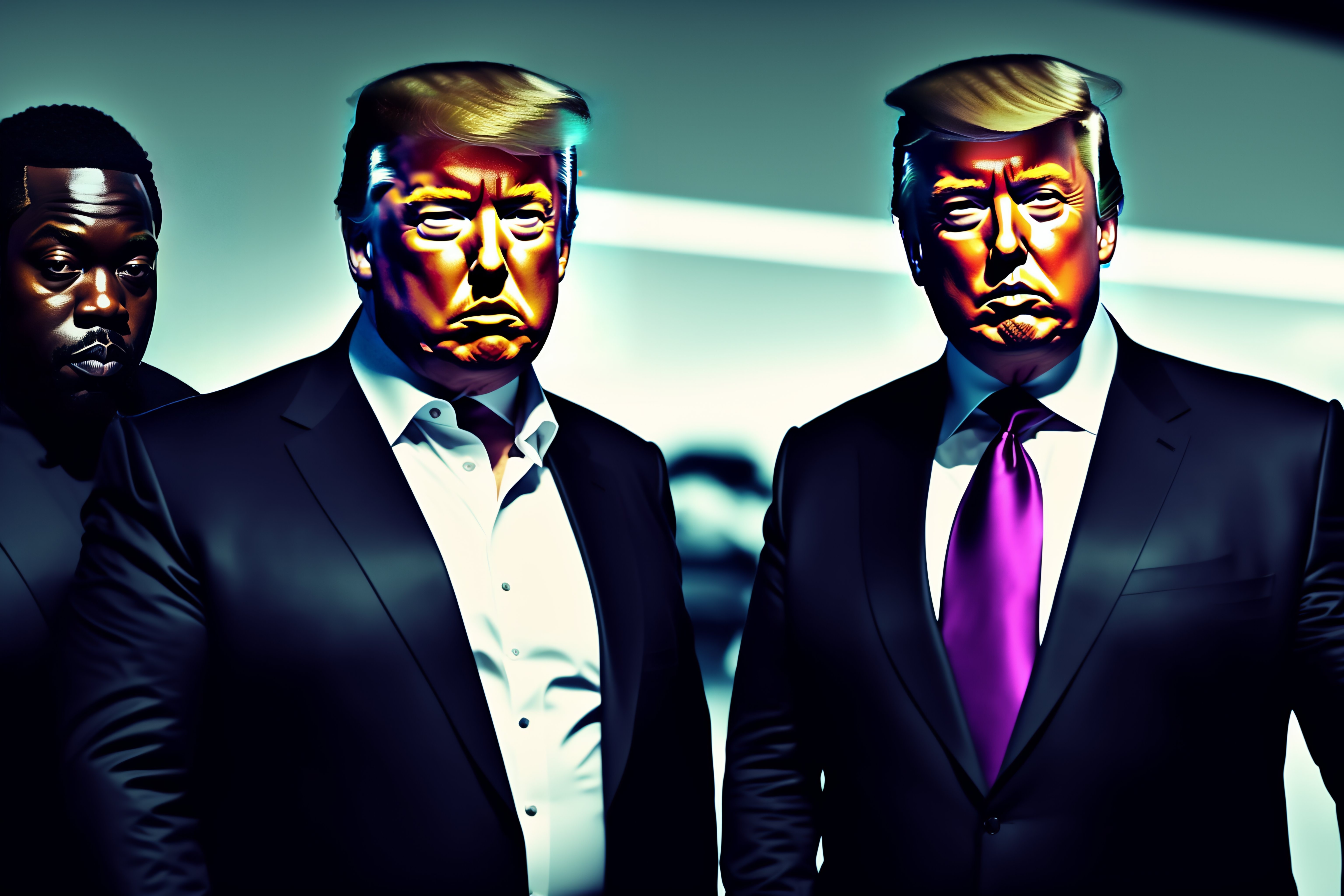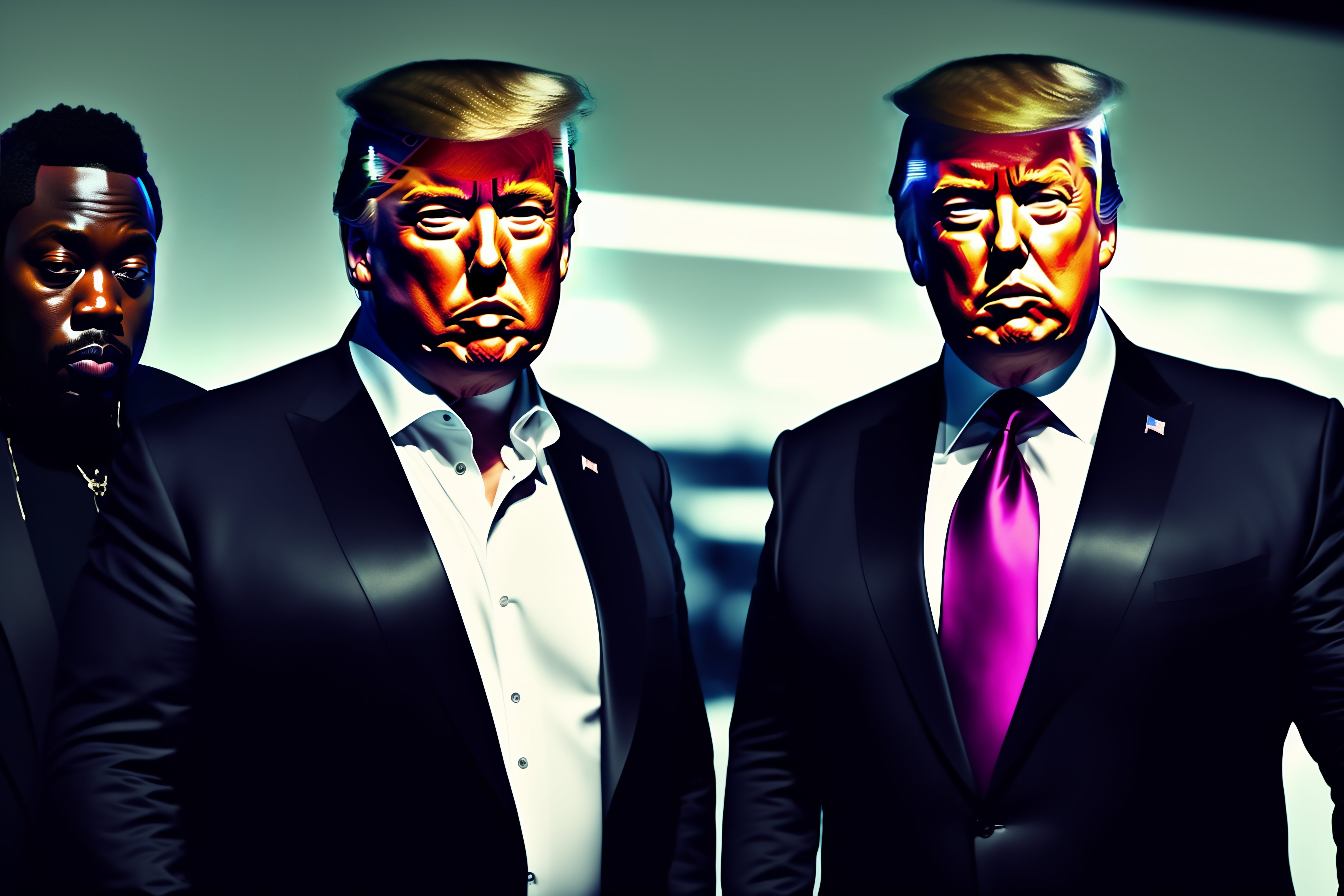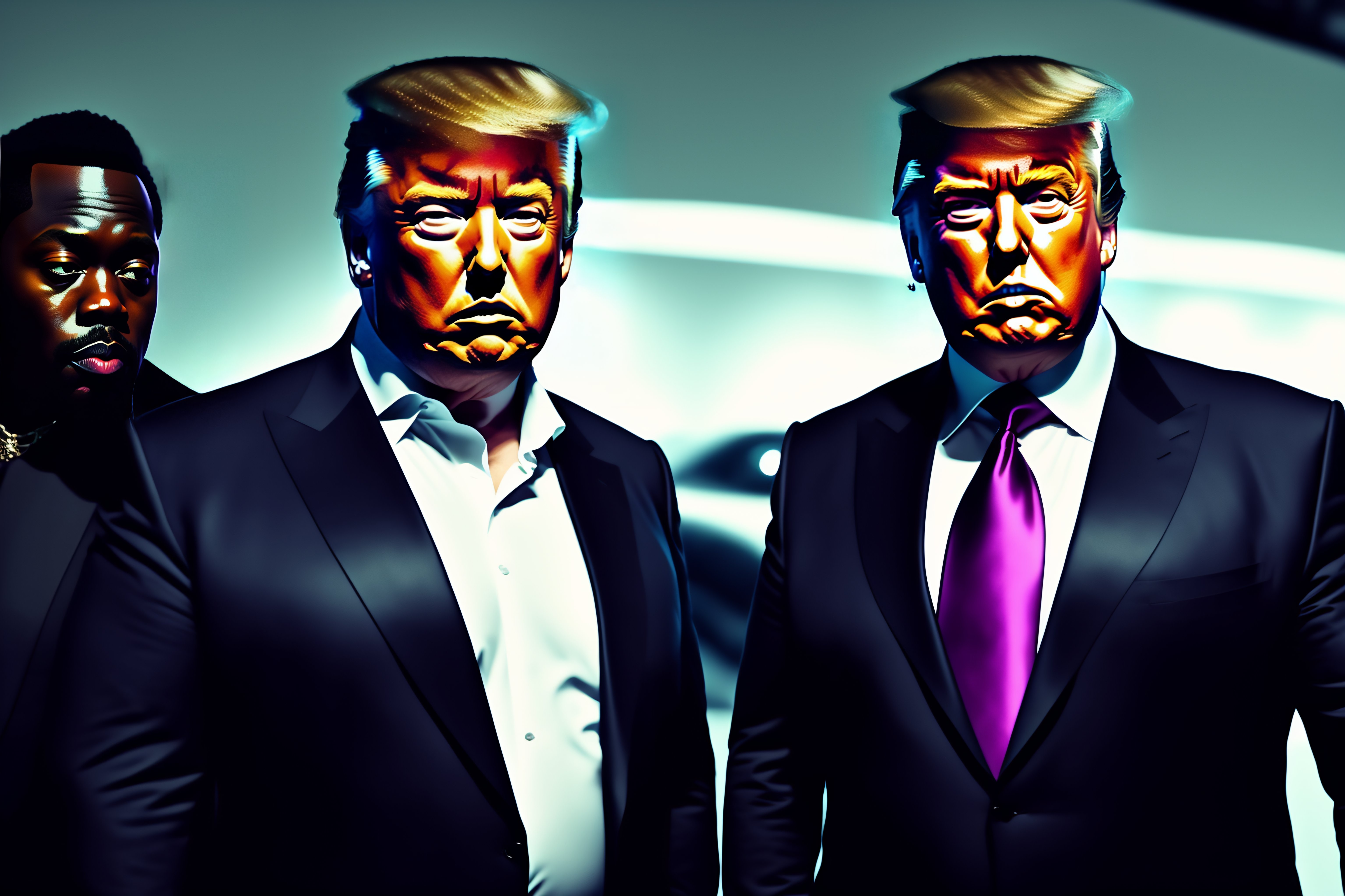 Elon musk with donald trump and kayne west, all on one photo, cyberpunk background, cinematic lightning