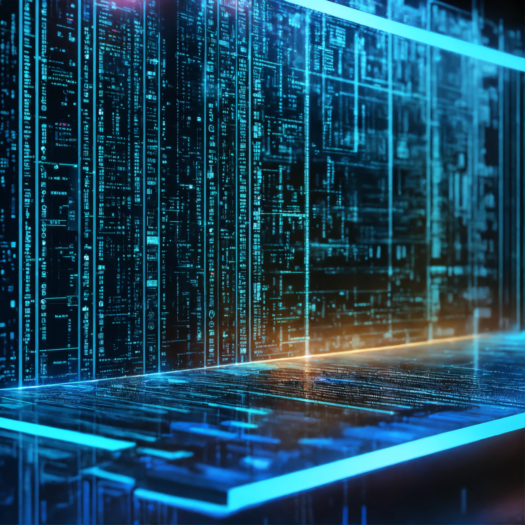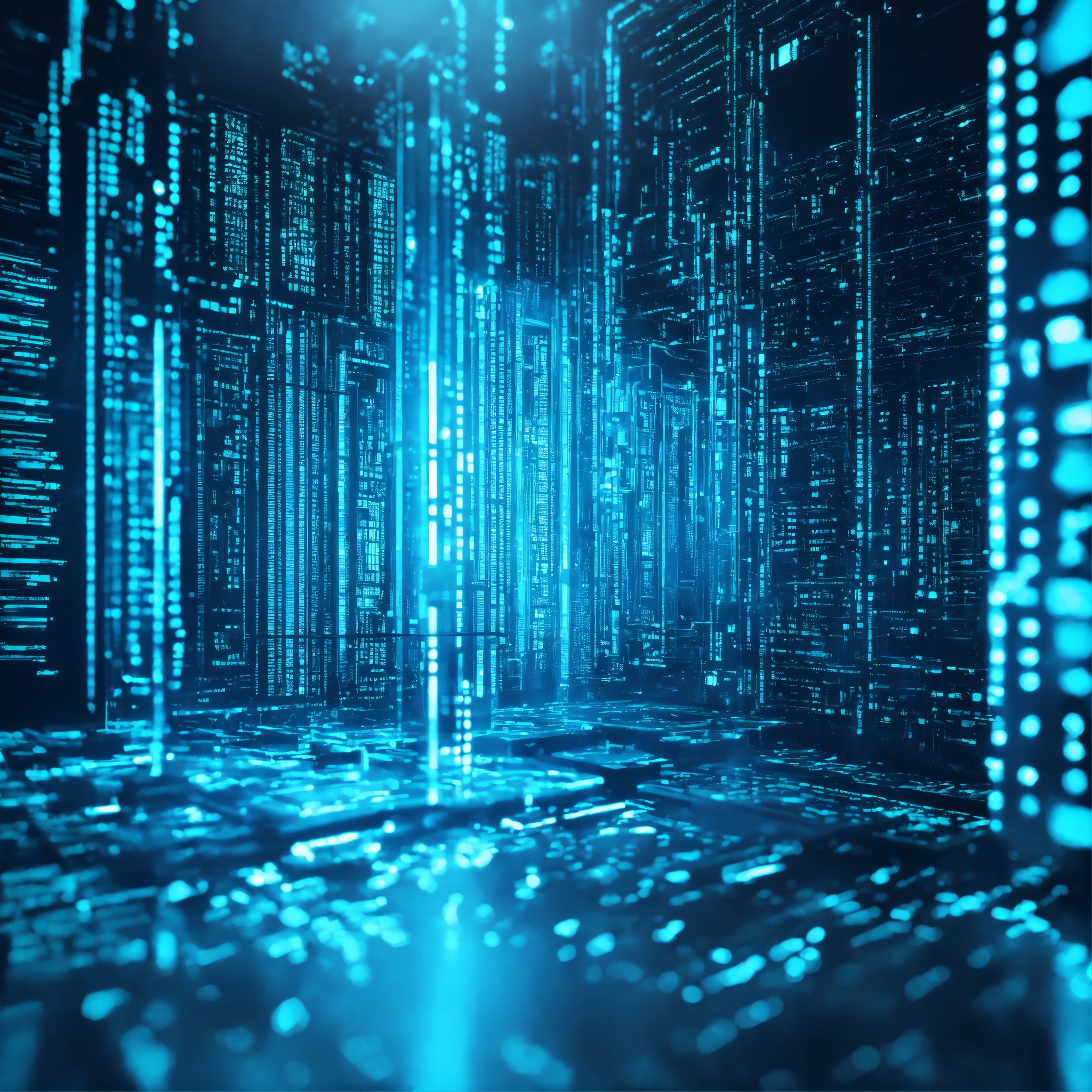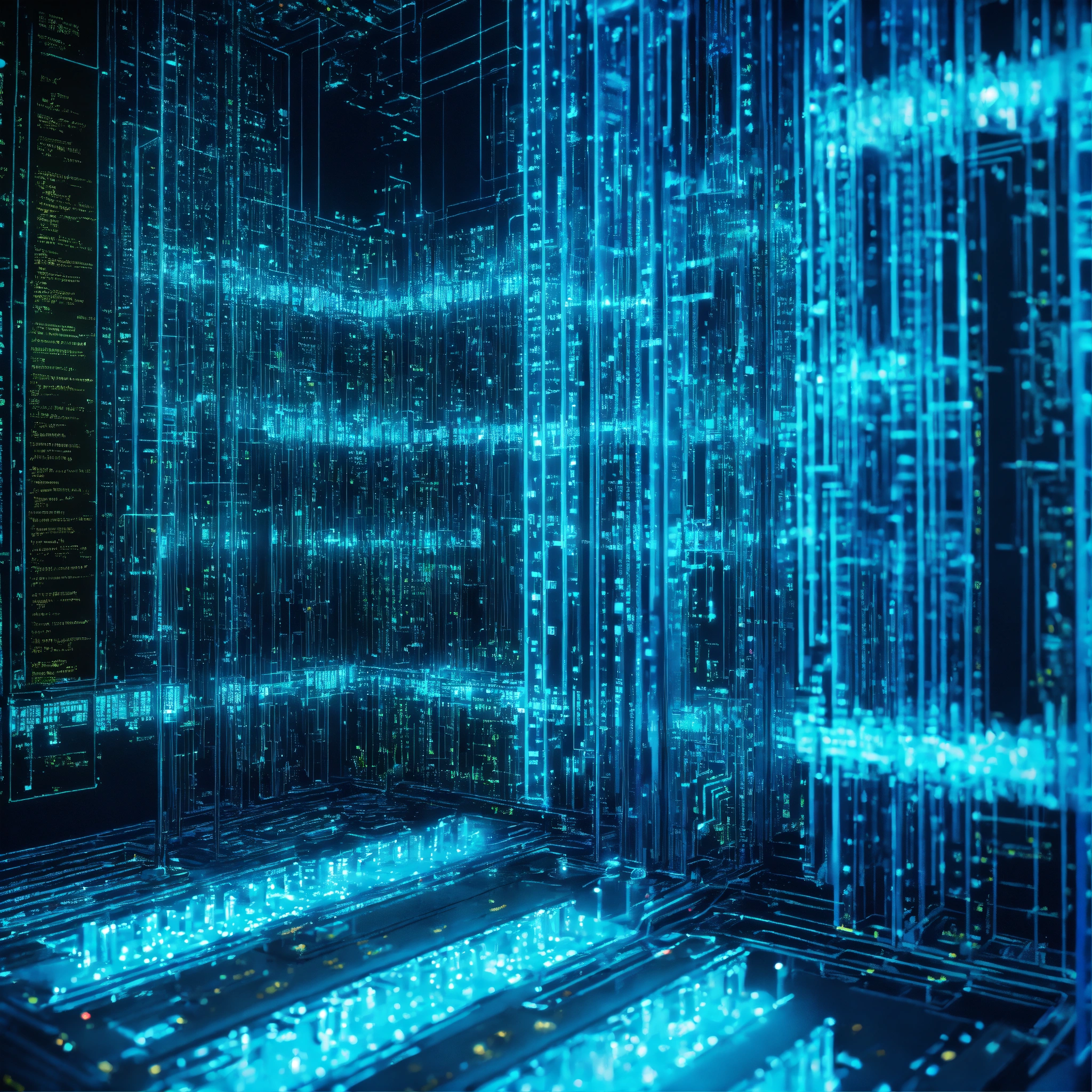 Ultra realistic bright photo of a very high tech 3d software code structure lit with bright blue and turquoise light