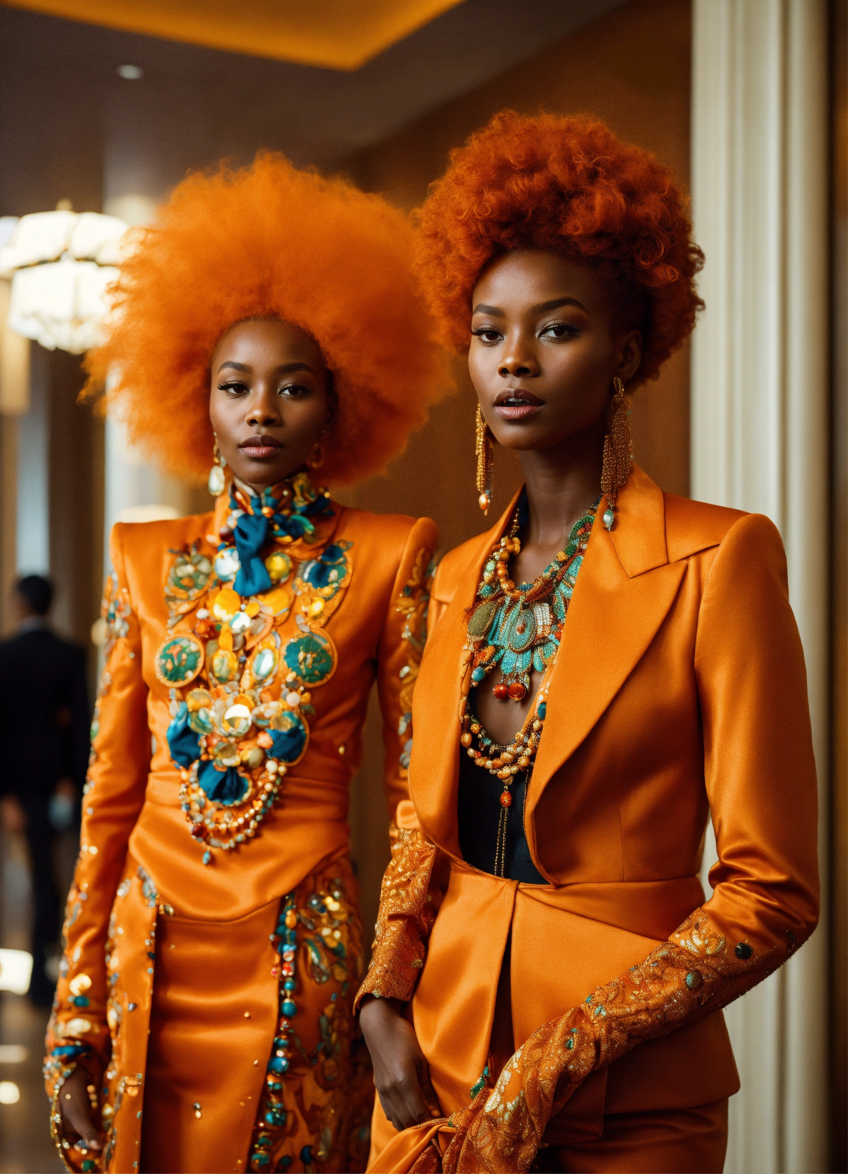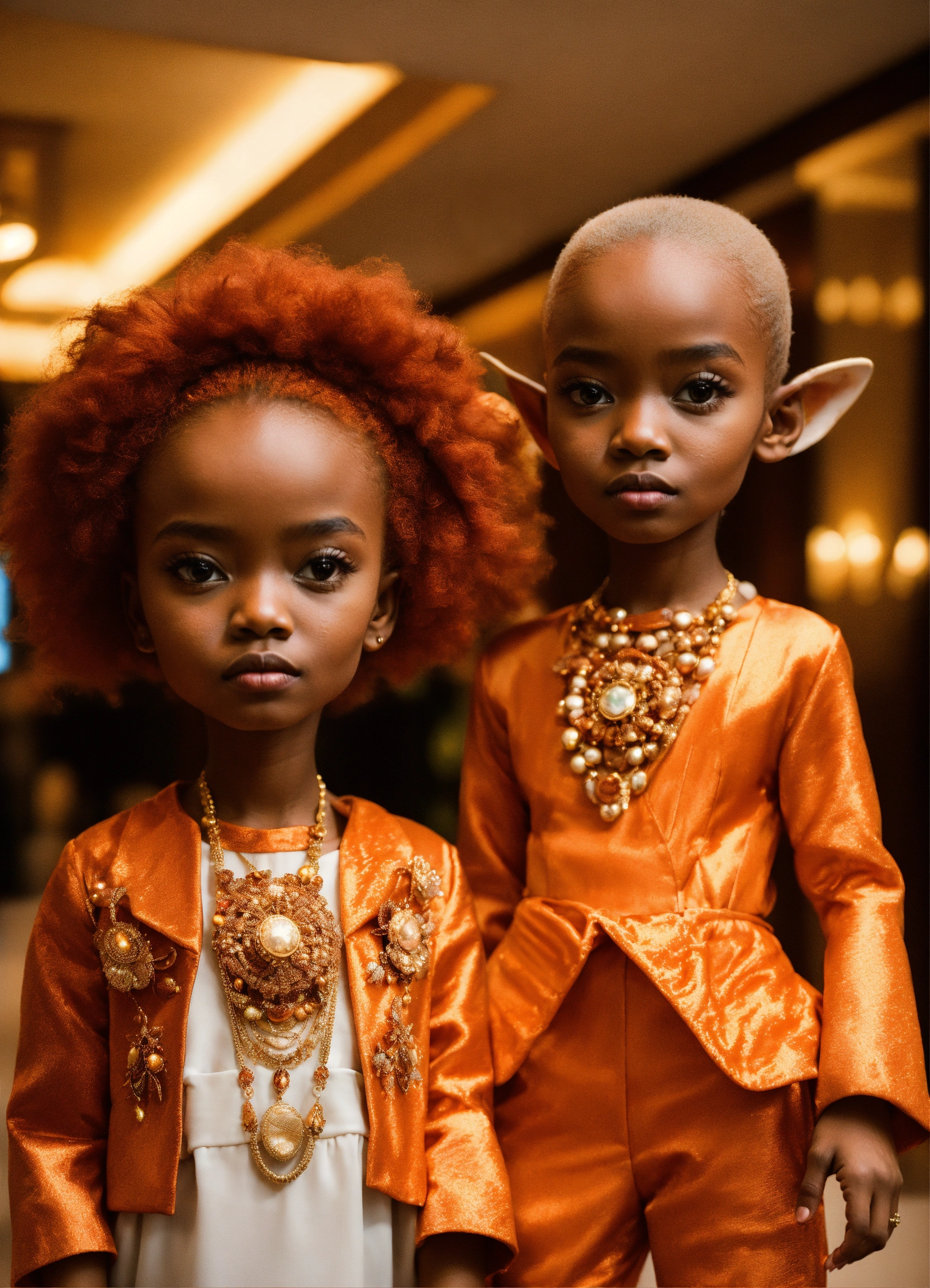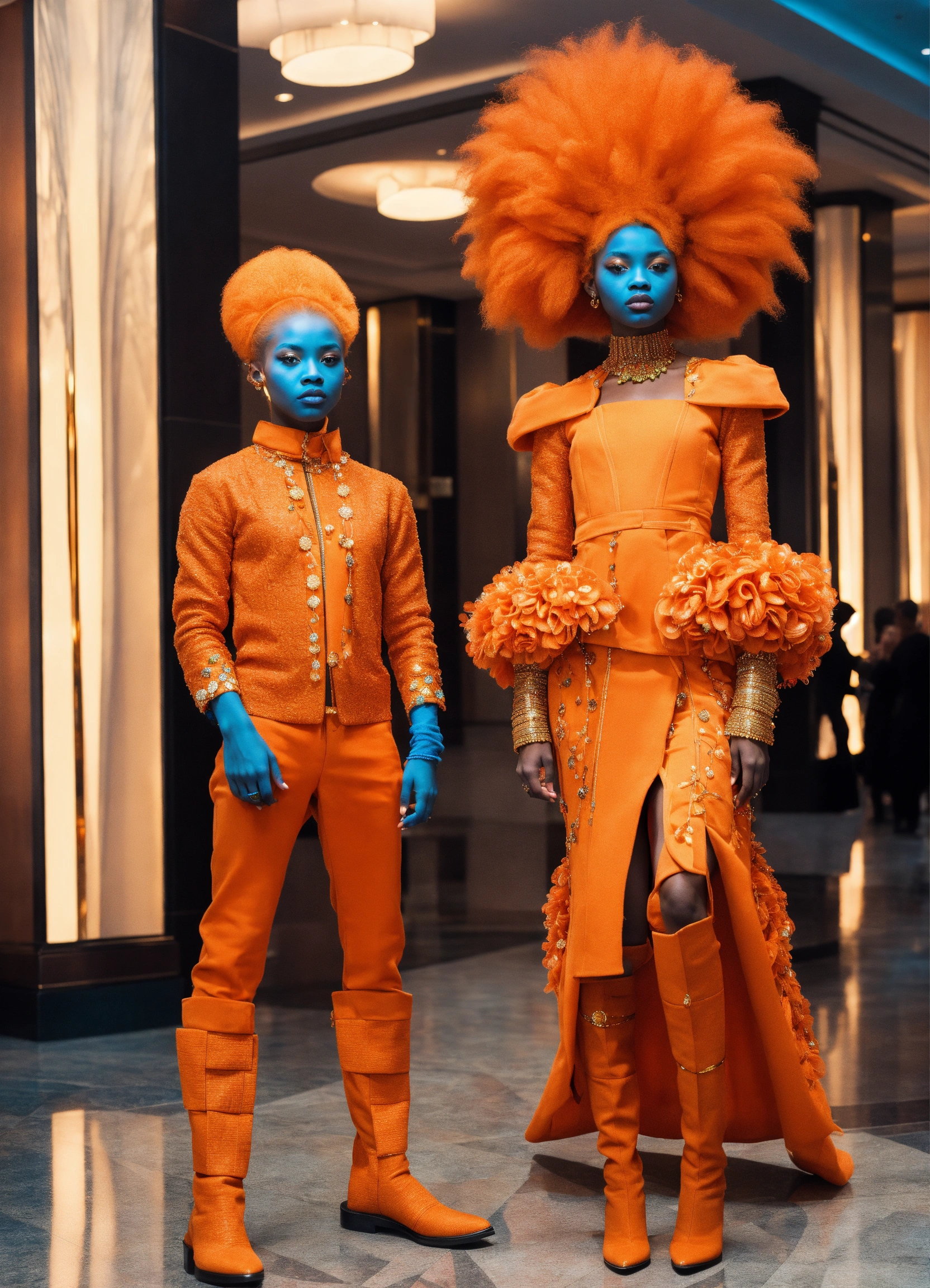 Two pretty human looking aliens with dark orange skin, reddish orange hair, african features, dressed in haute couture. in hotel lobby. with child