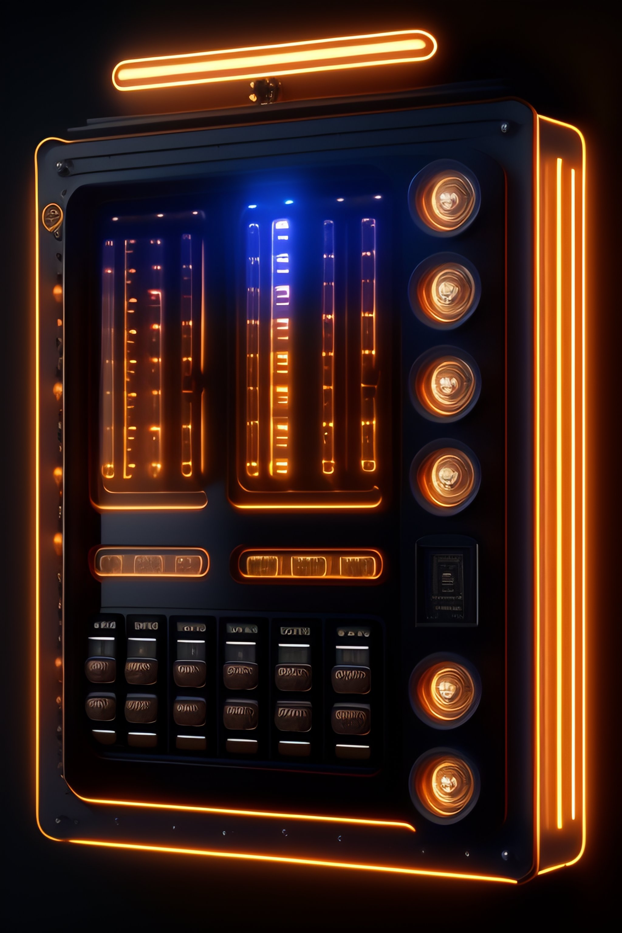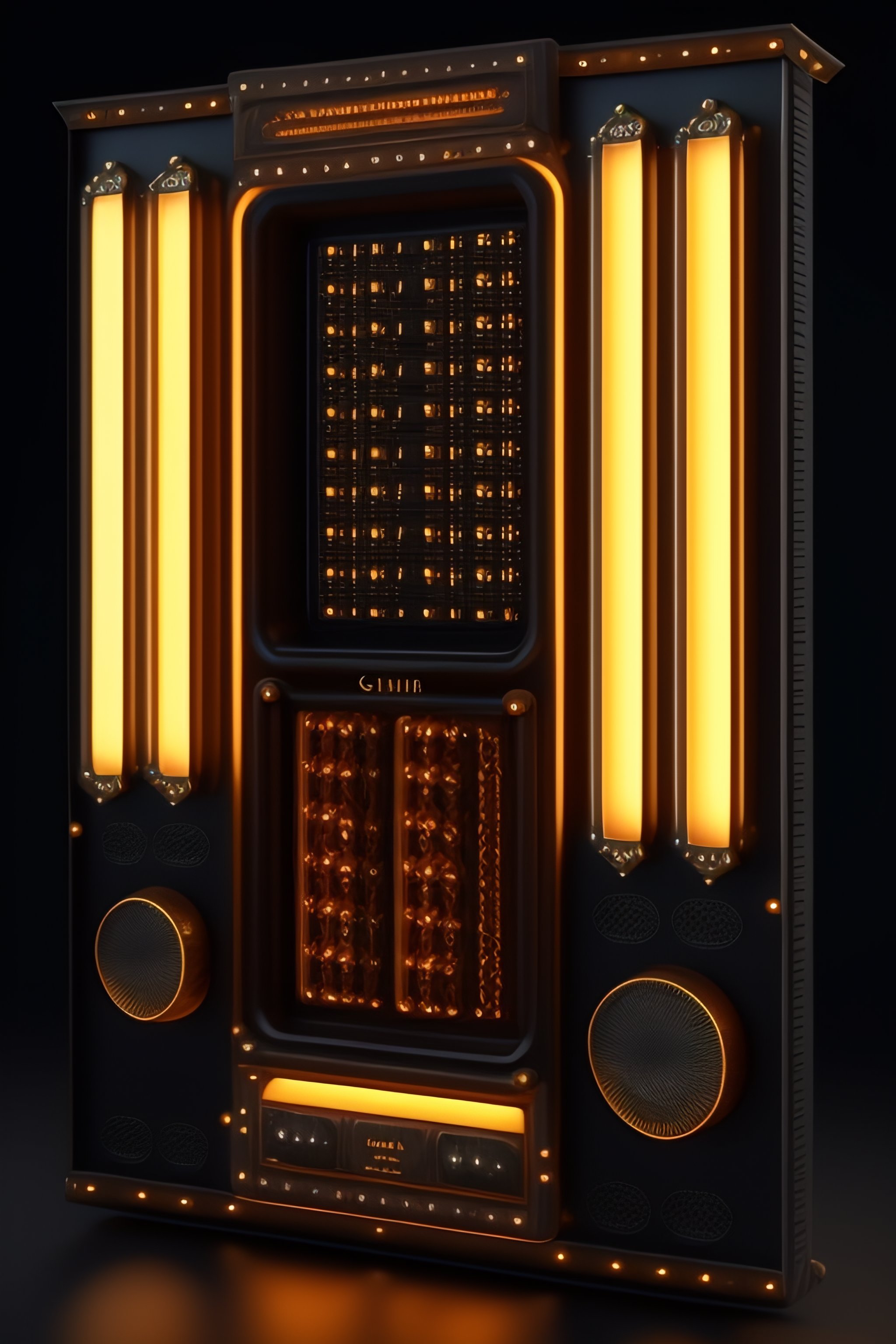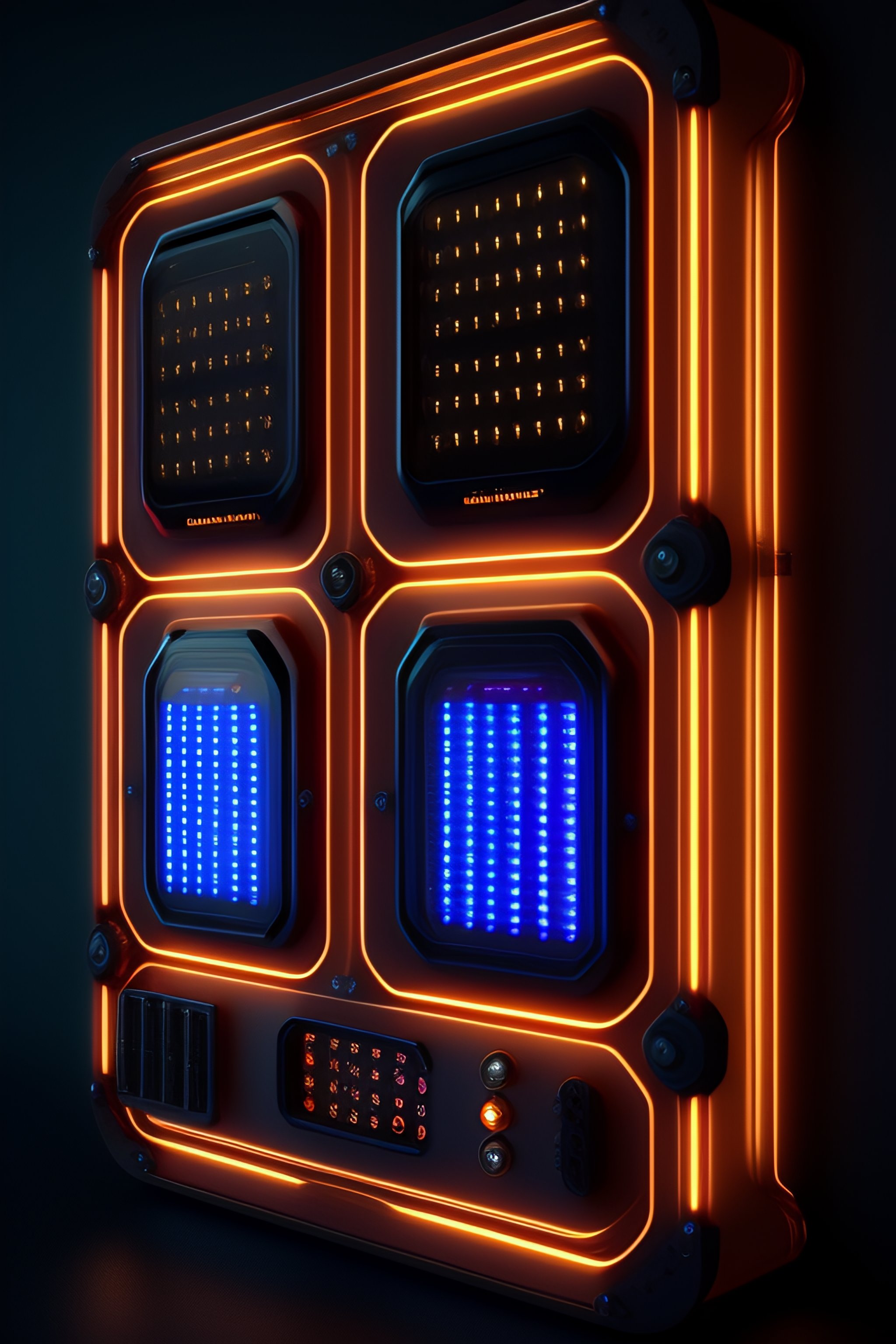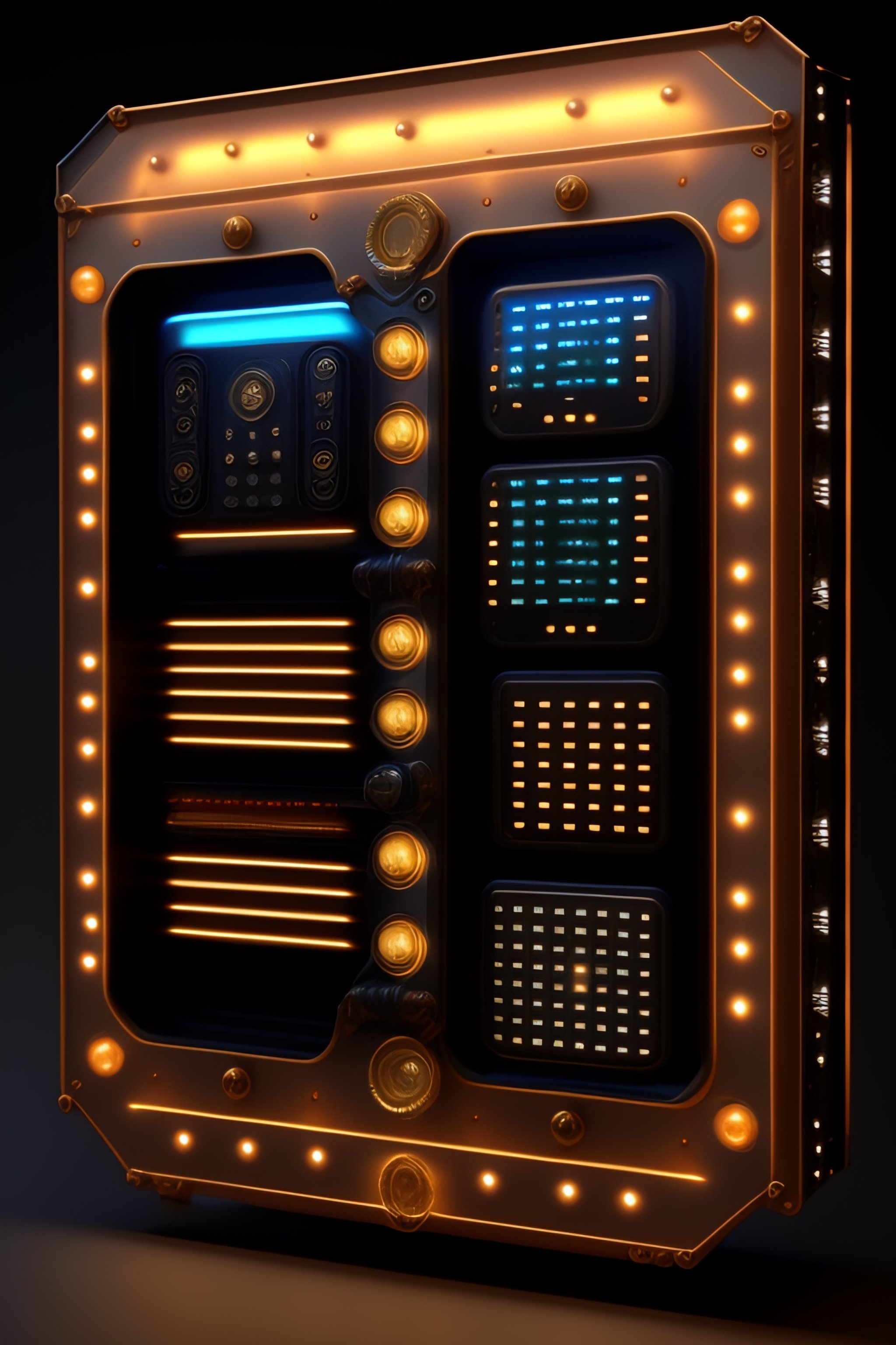 Steampunk front view of a control panel with screens and led bars