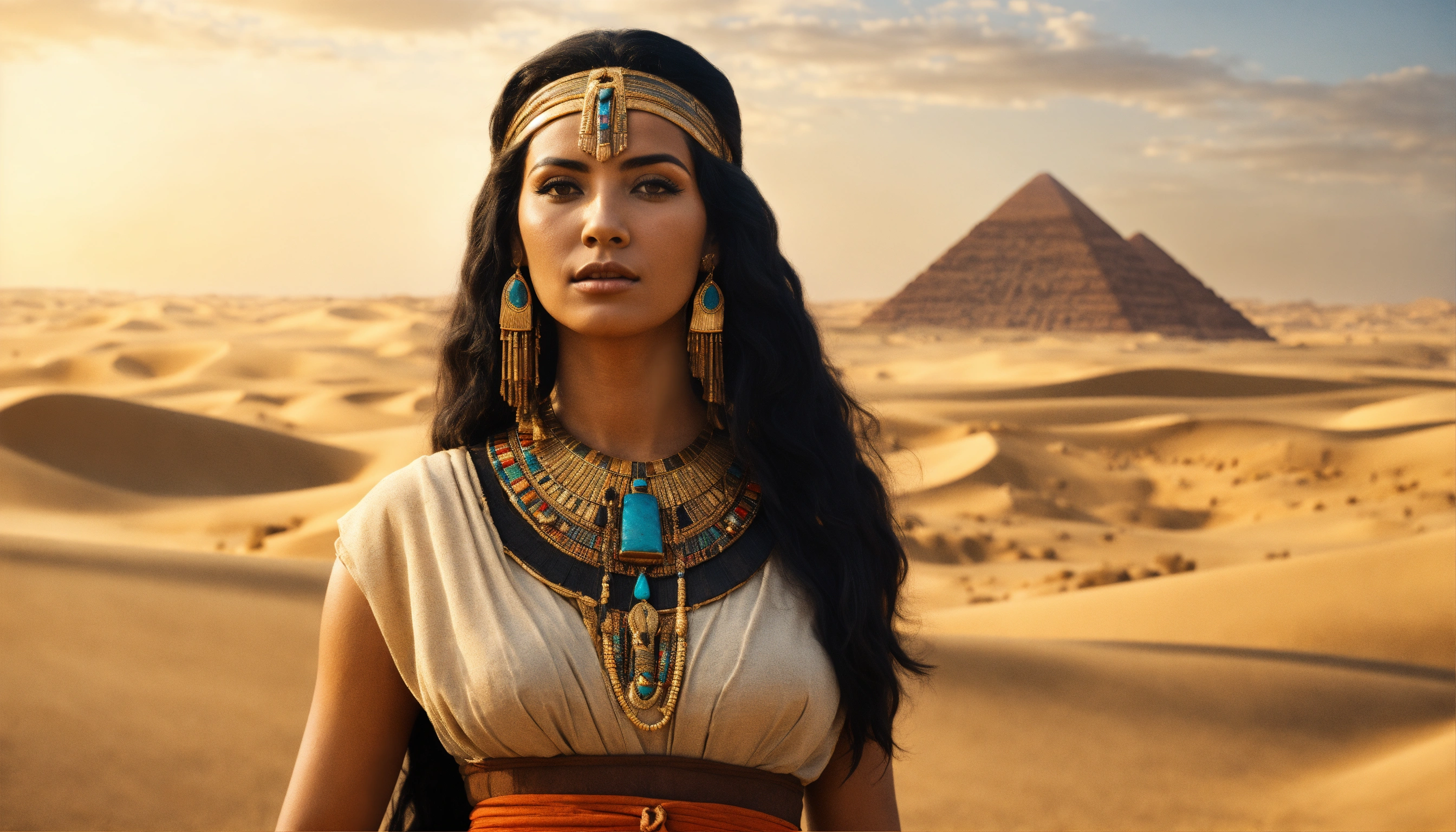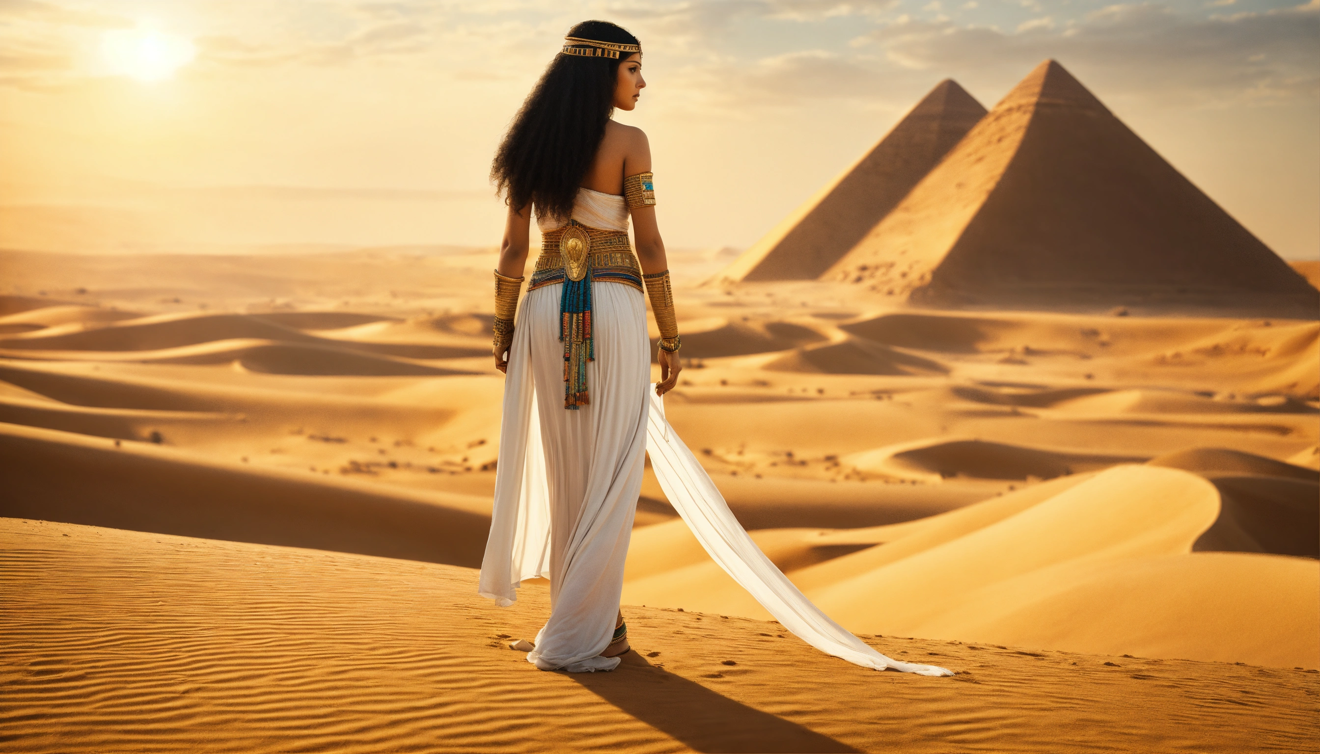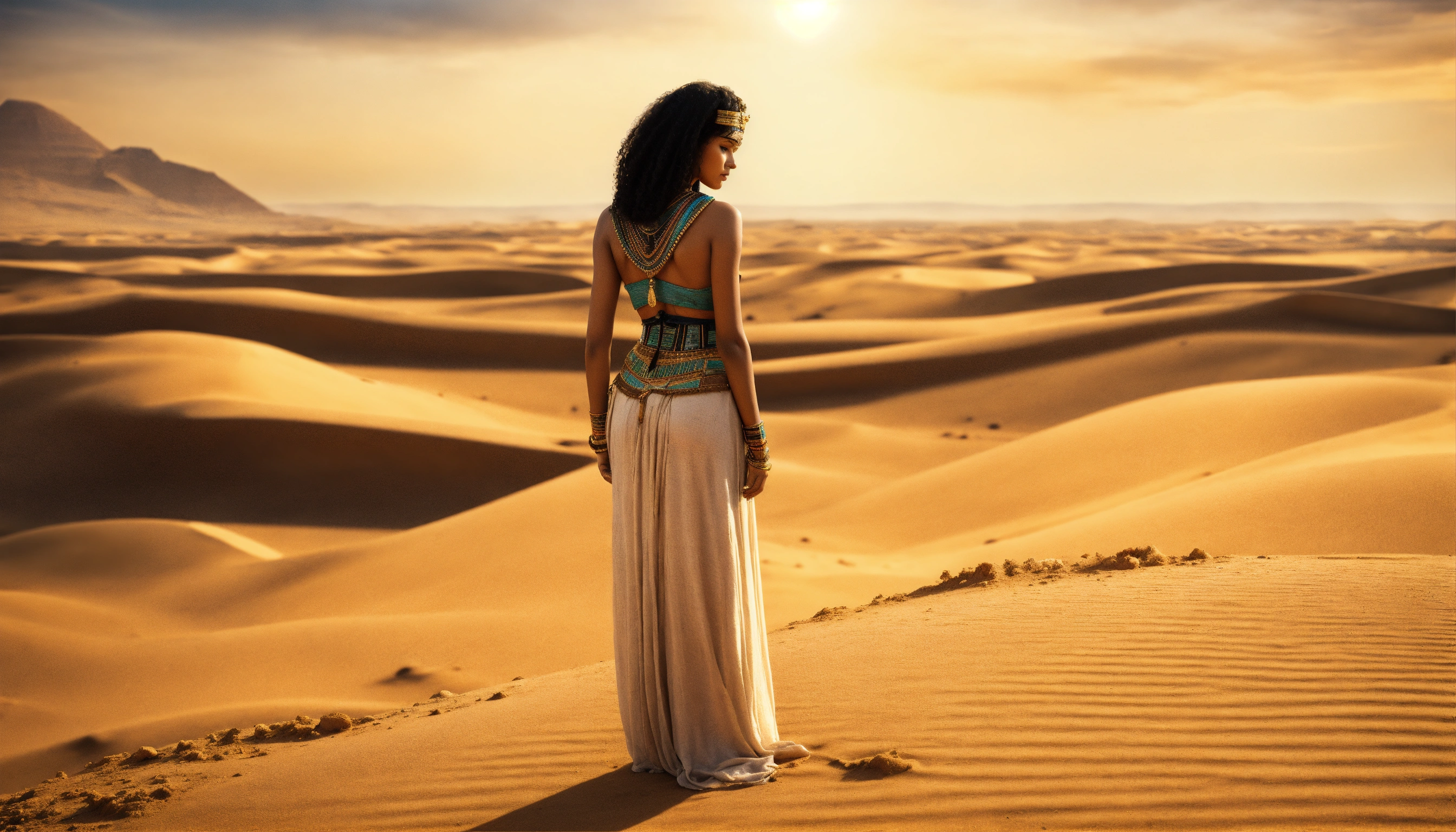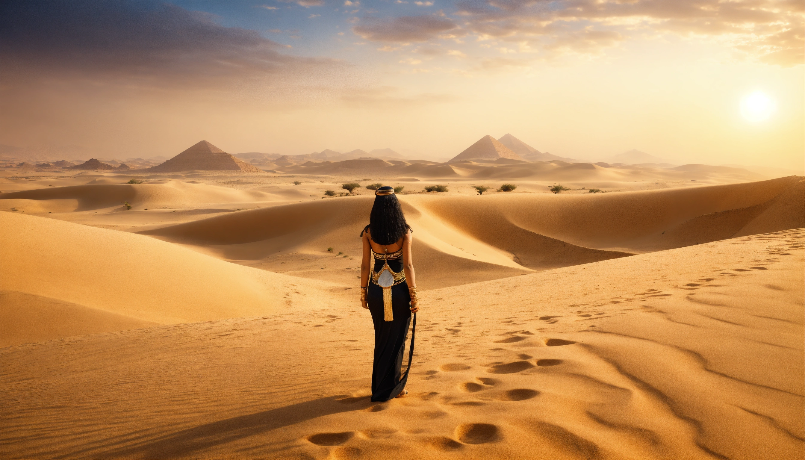Ancient egypt woman with black-haired in a sandy desert landscape uhd
