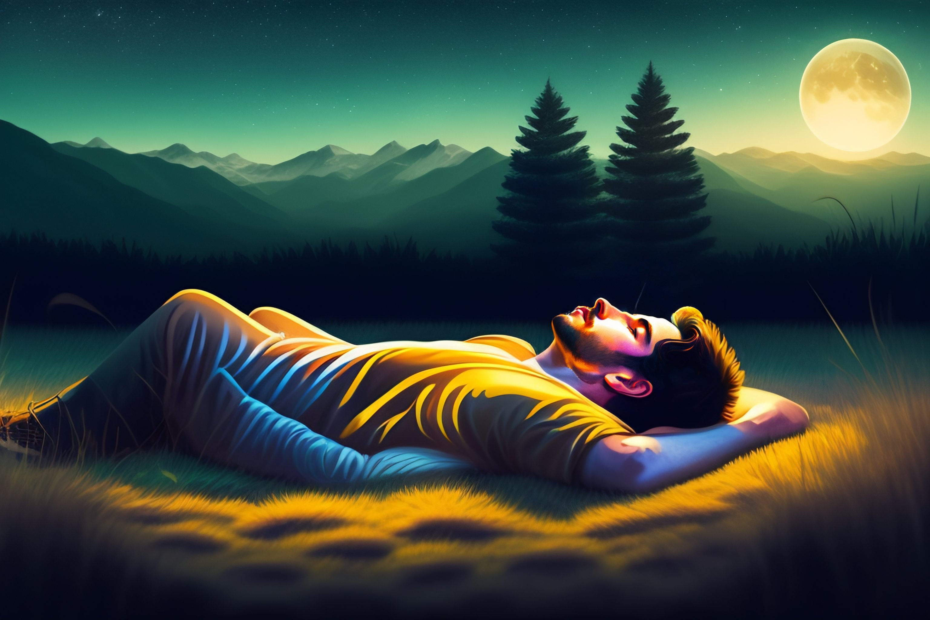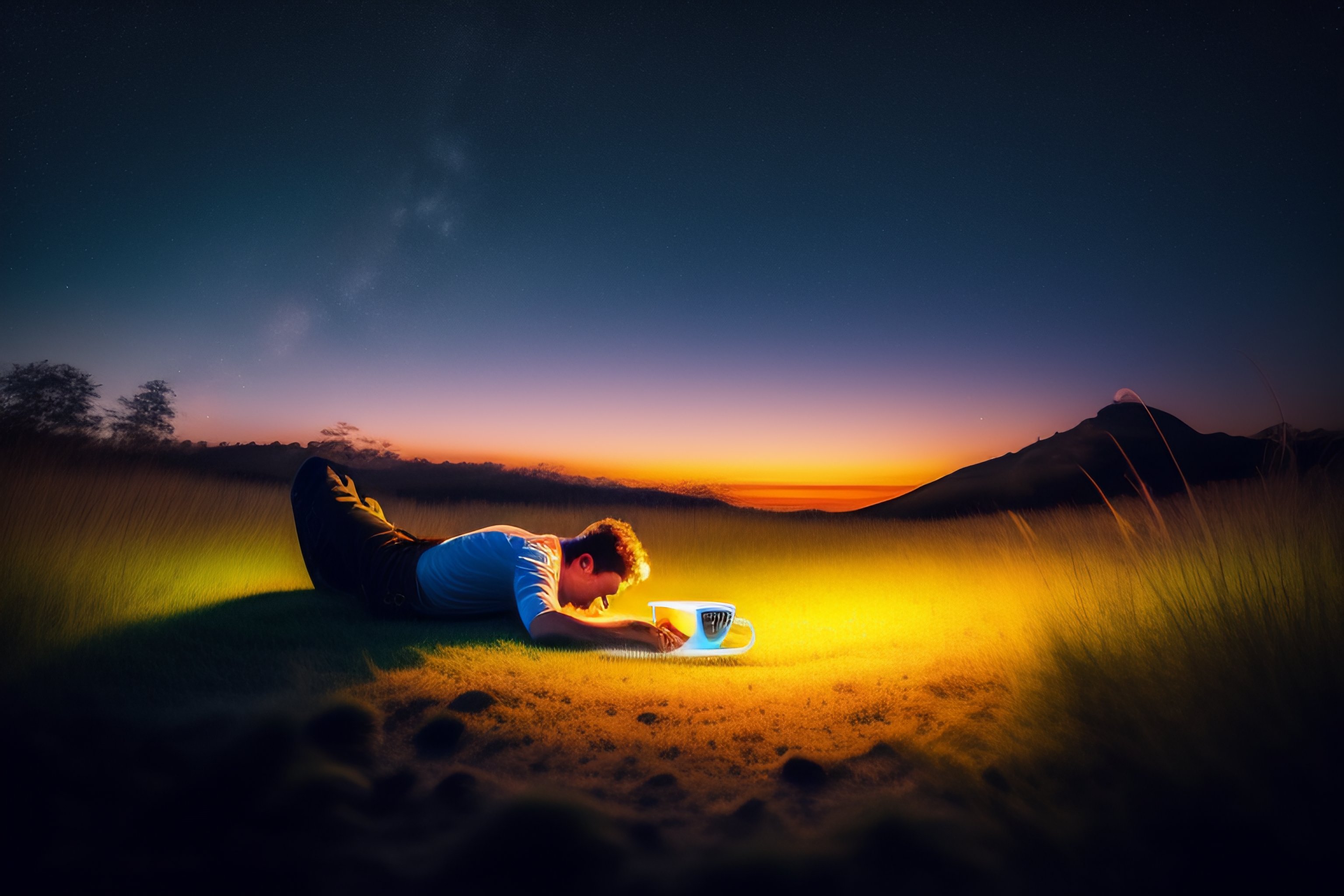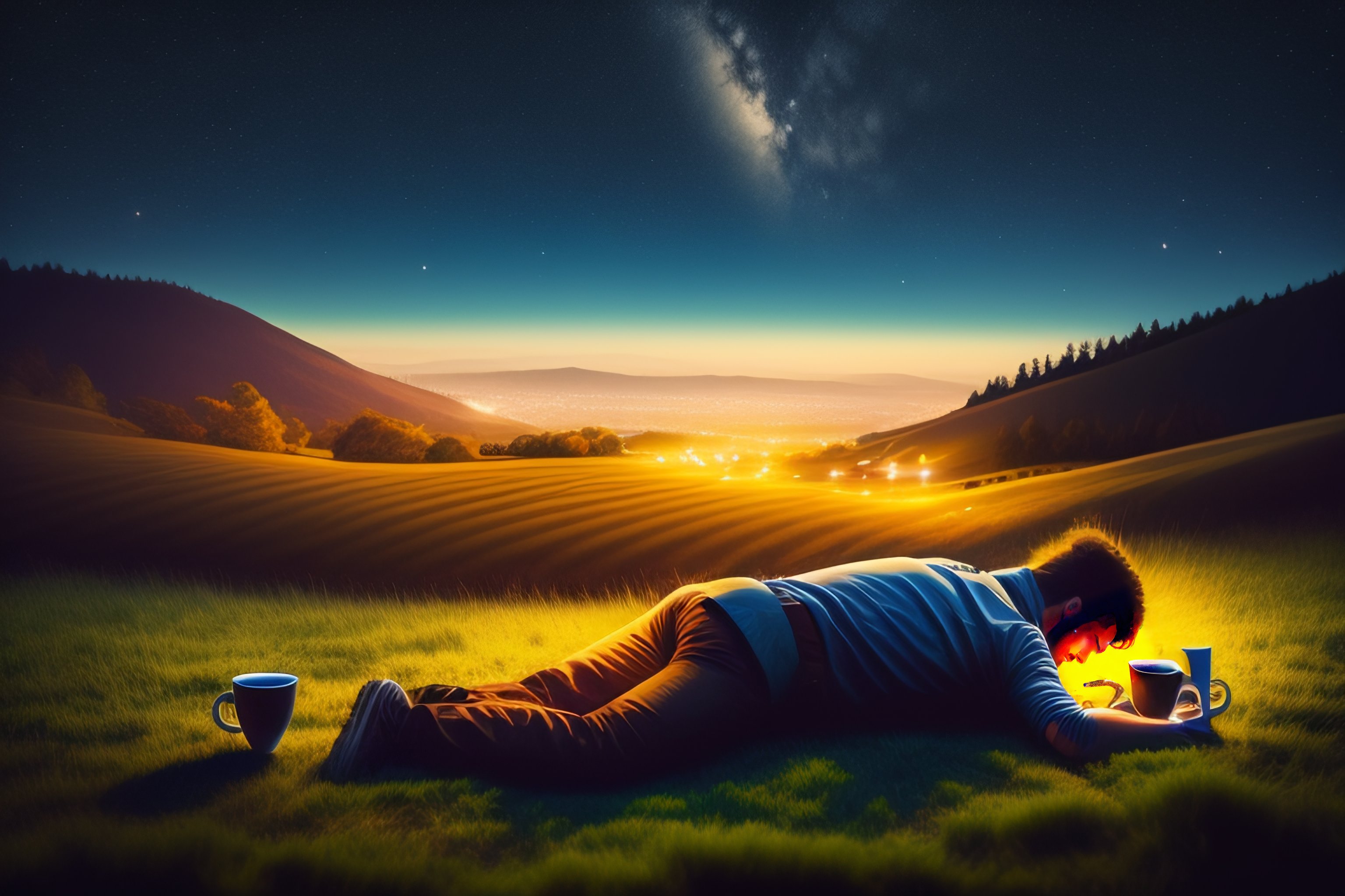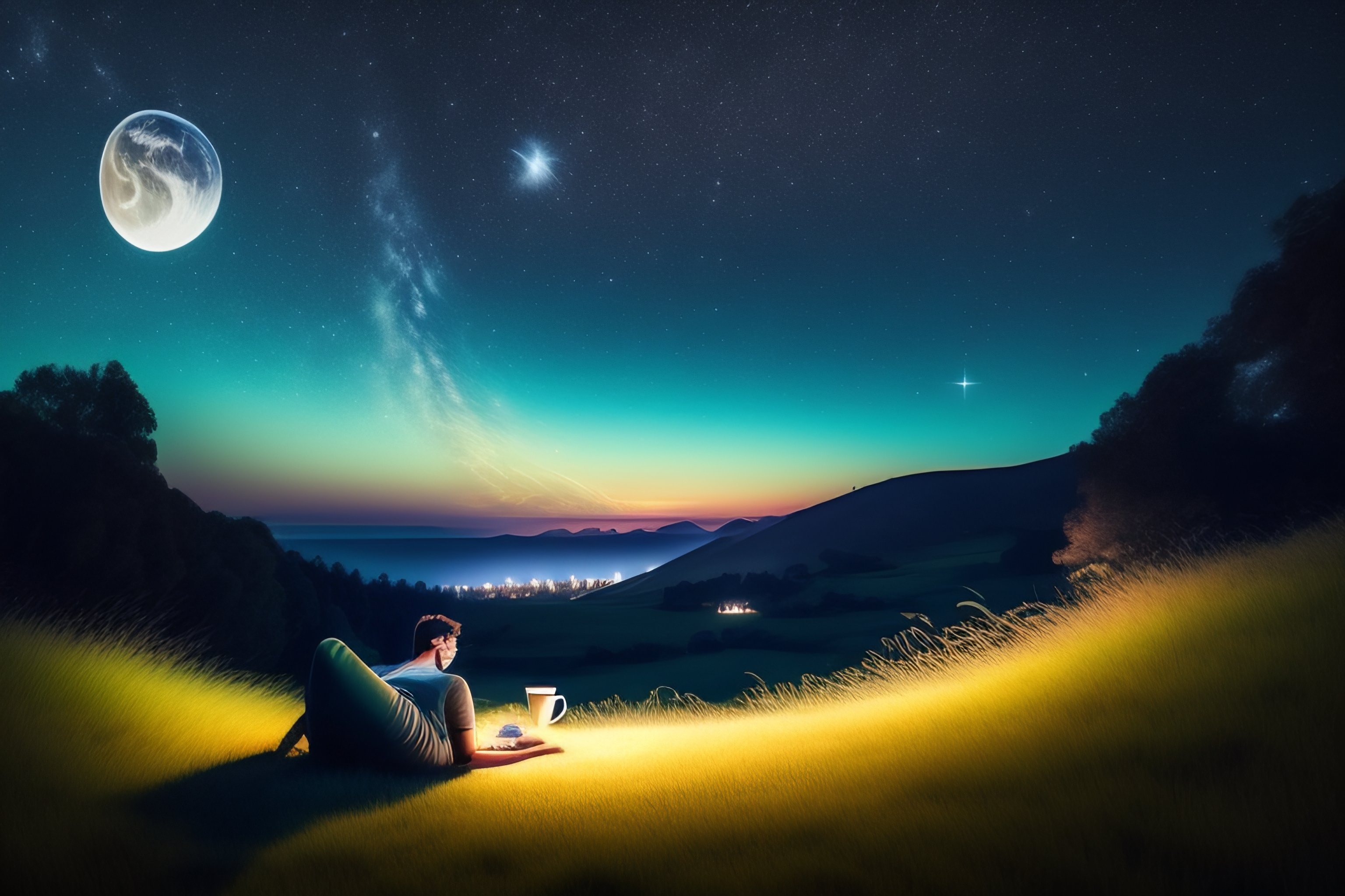 Man lying on grass at night looking at the stars with a cup of coffee on the ground, matte, beautiful, masterpiece, detailed illustration