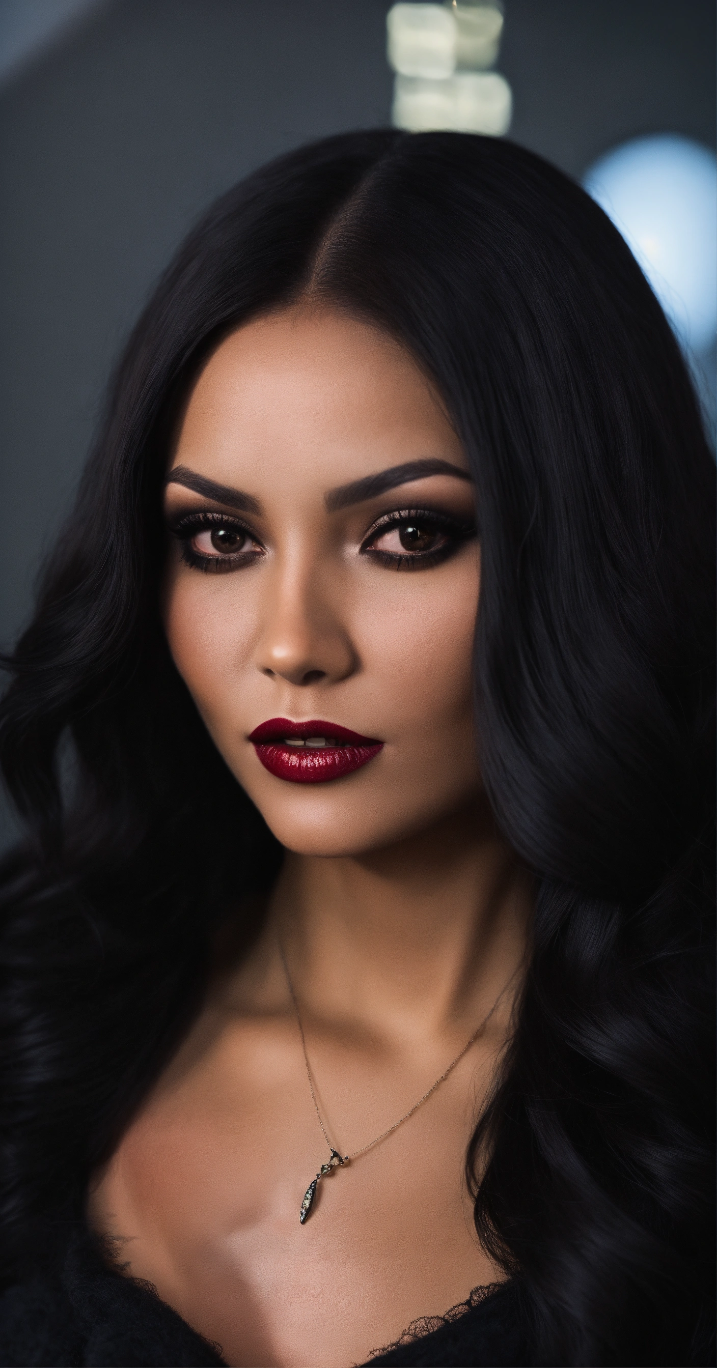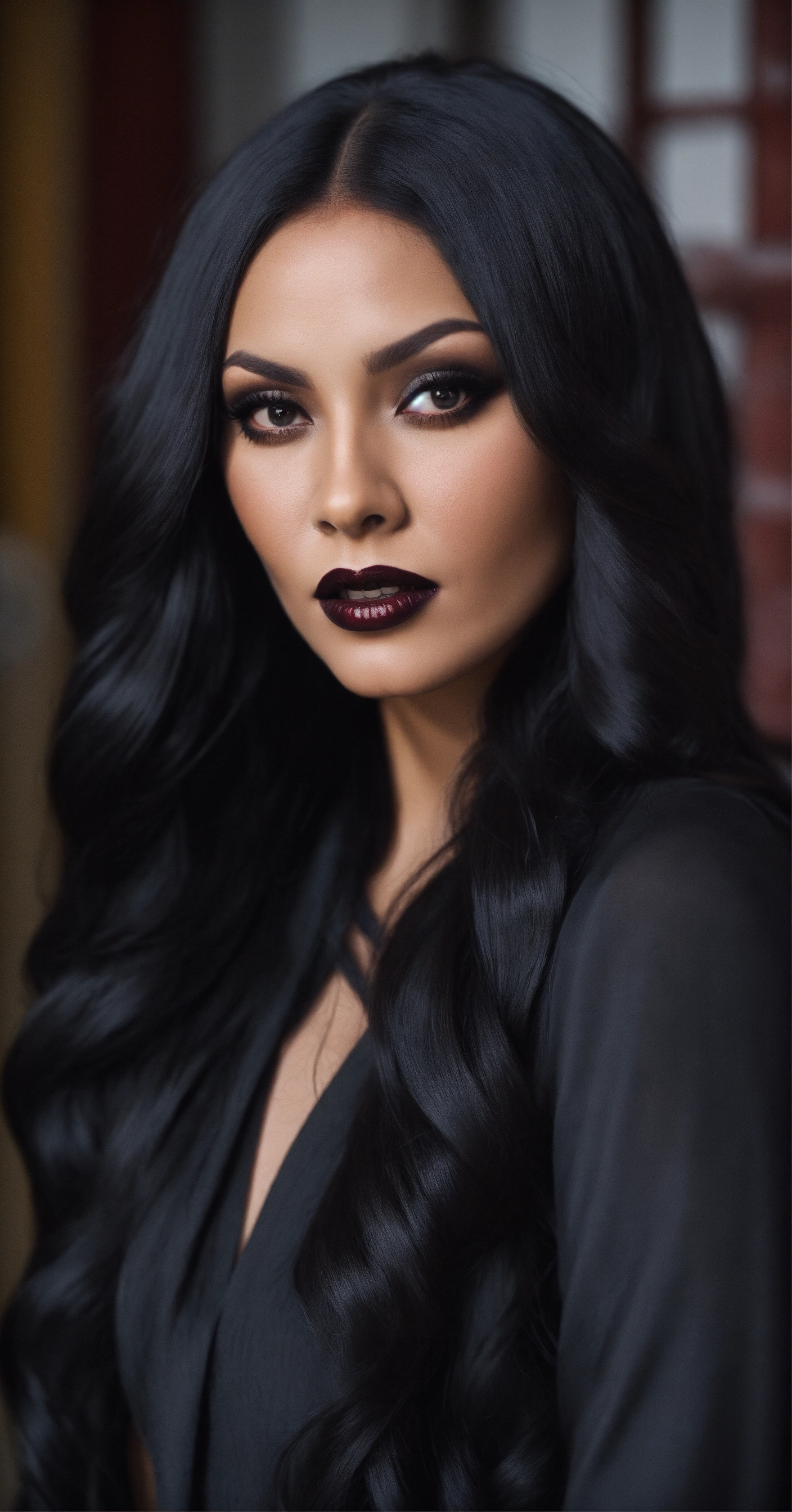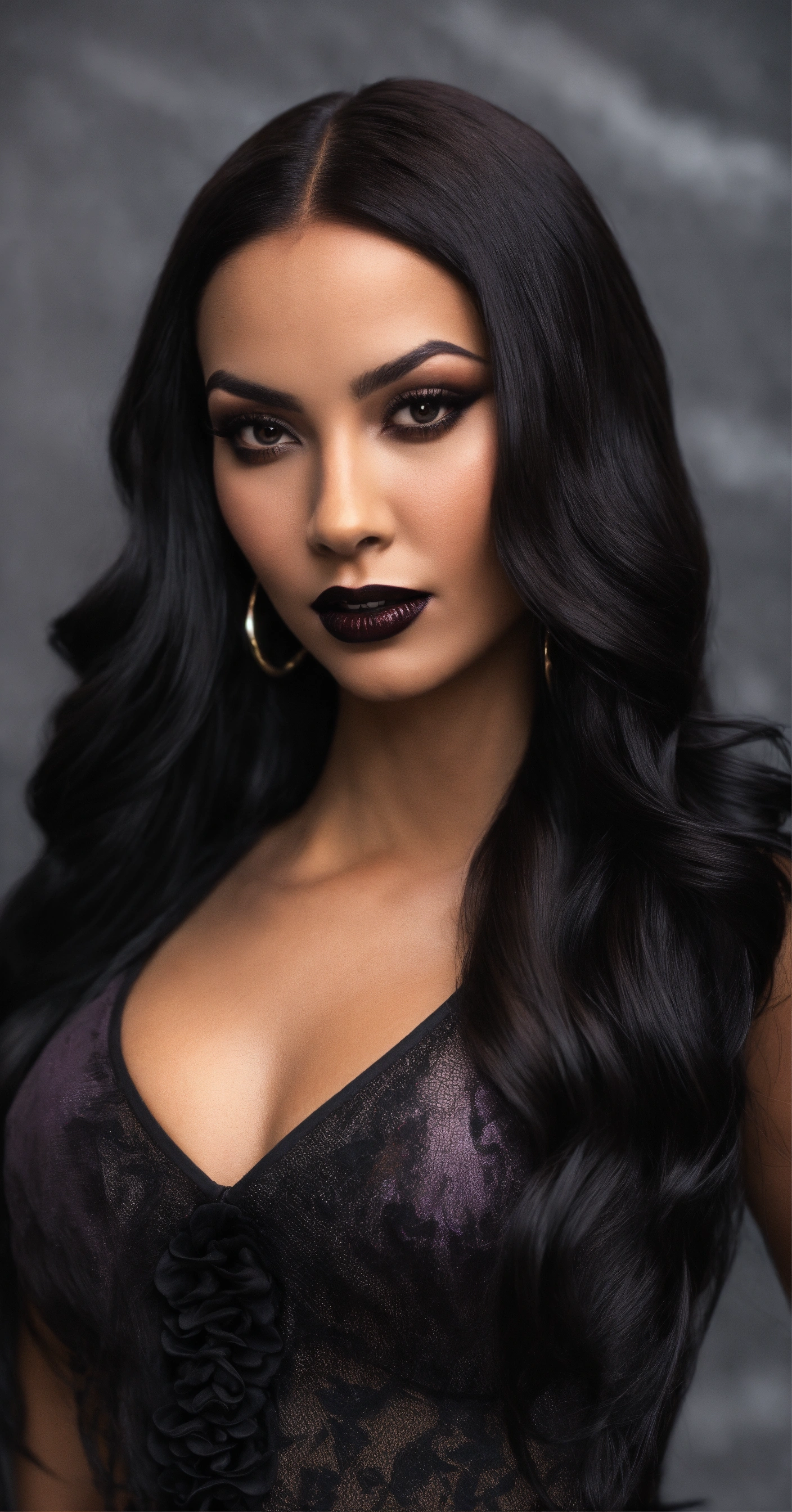 30 year old pretty light brown skin woman with corporate goth style and vampire glossy black hair like morticia adams