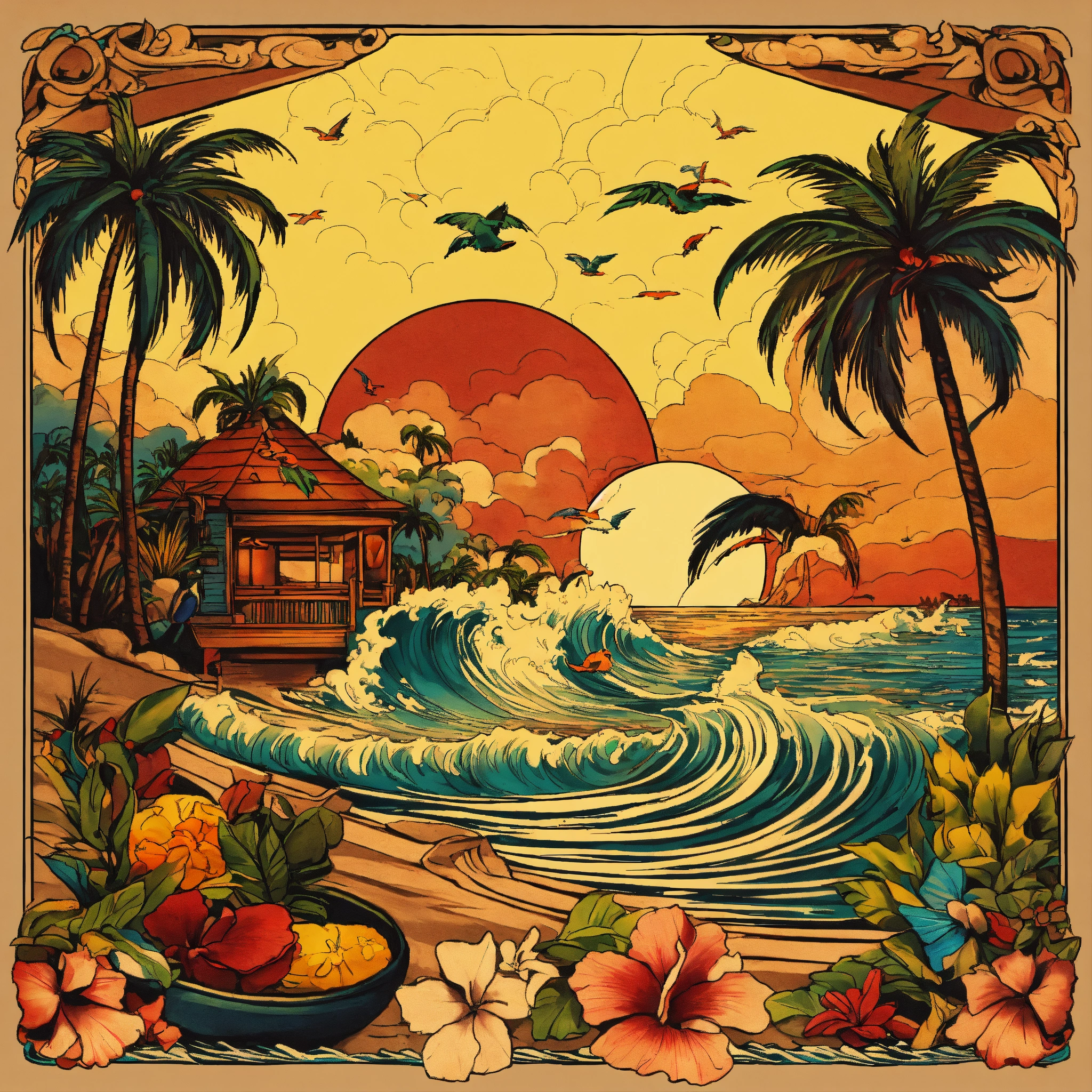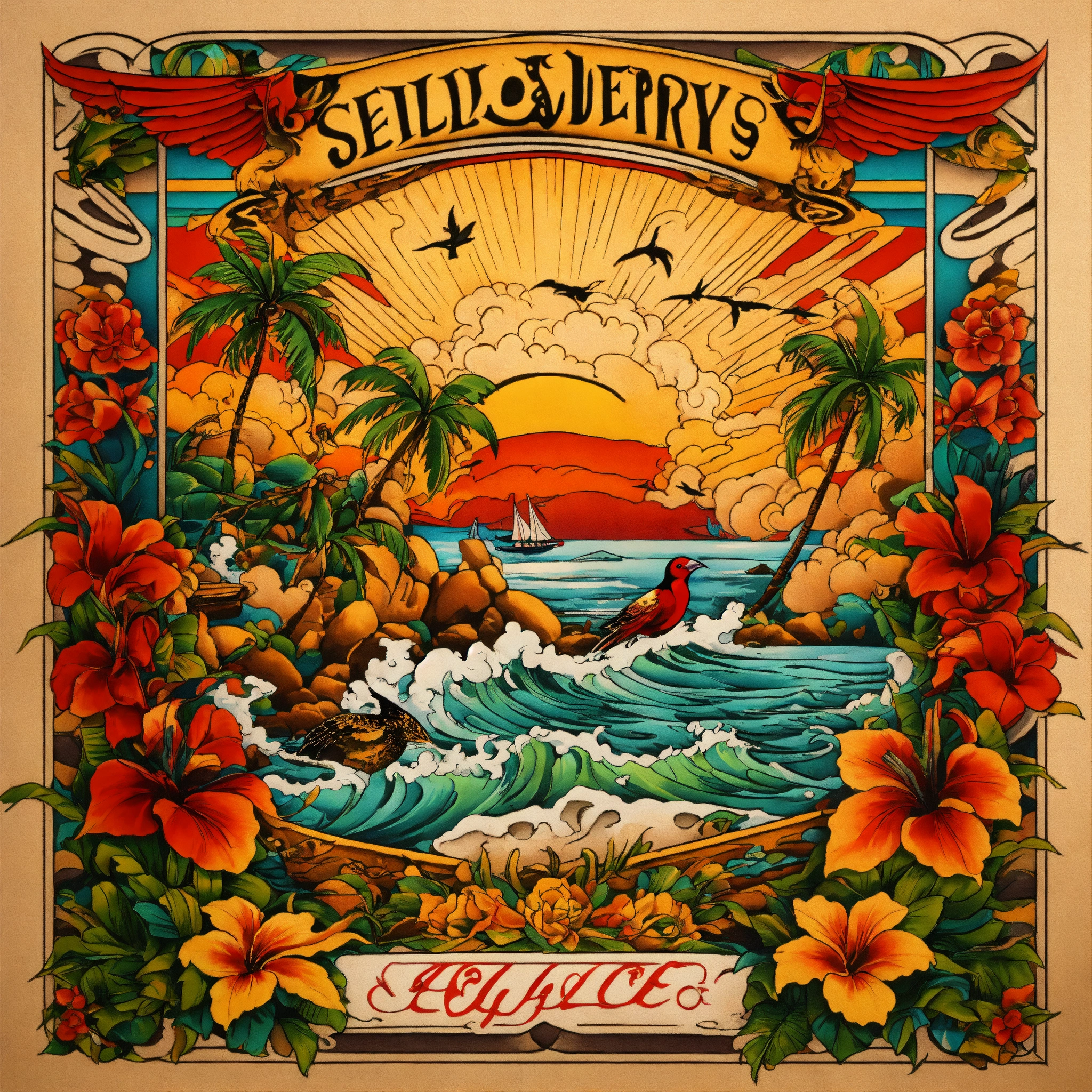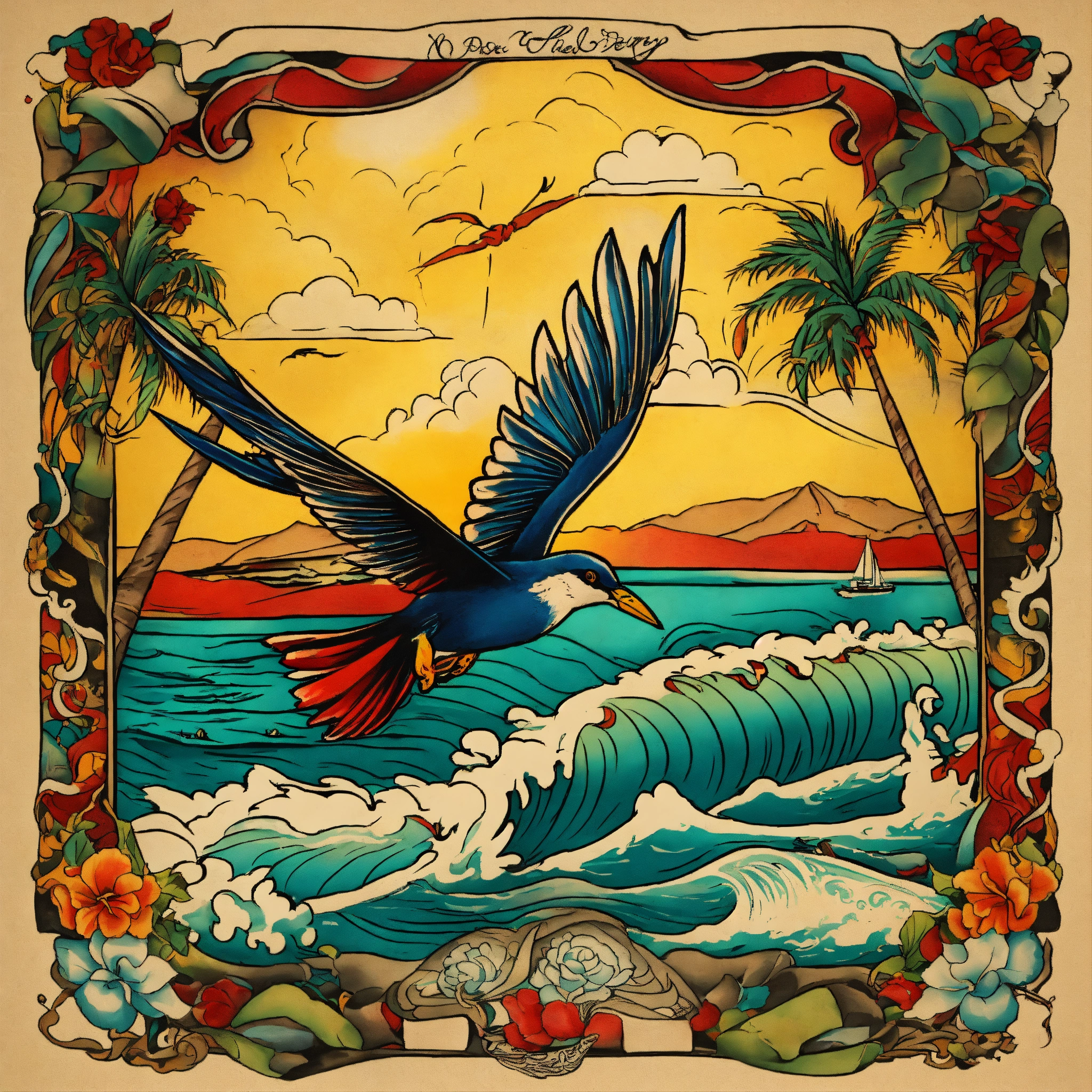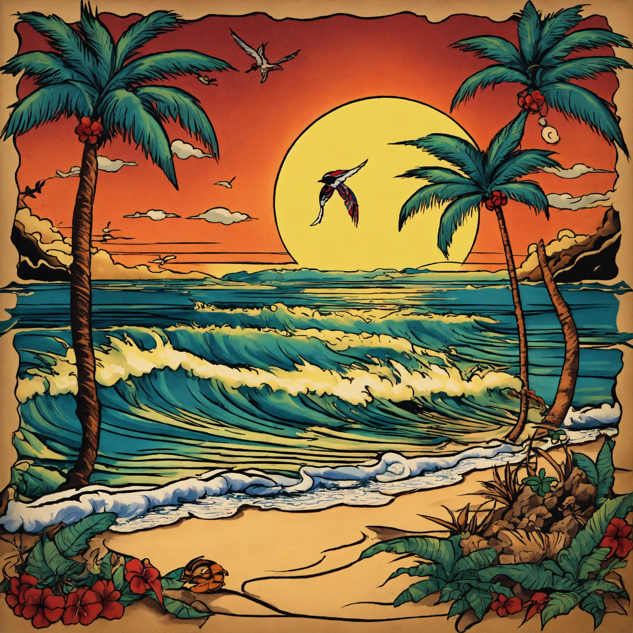 Artistic image type of image tattoo design prompt description craft a captivating tattoo design featuring a monterey california-infused tropical beach background in the iconic styles of sailor jerry and ed hardy. the design will highlight majestic palm trees swaying against a backdrop of dynamic ocean waves. the palm trees and waves will be intricately detailed, capturing the essence of traditional and neo-traditional tattoo artistry. embrace the bold linework, vibrant colors, and intricate shading techniques synonymous with sailor jerry and ed hardy's styles. this tattoo design will be a harmonious fusion of reggae culture, swallow birds, and legendary tattoo art, a timeless piece that pays homage to classic tattoo masters while celebrating the tropical allure of the beach.