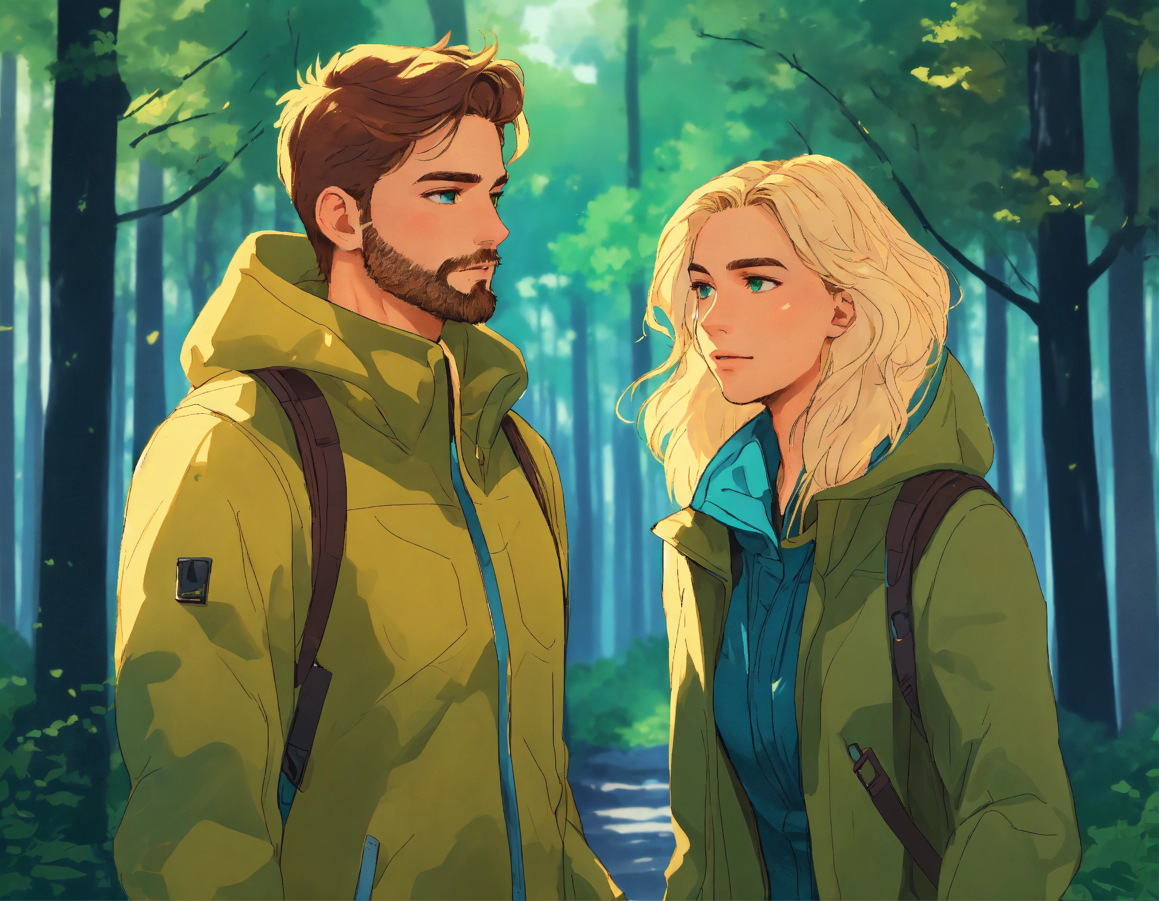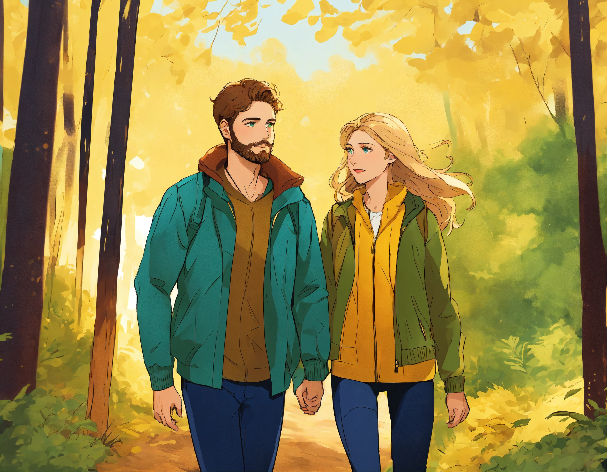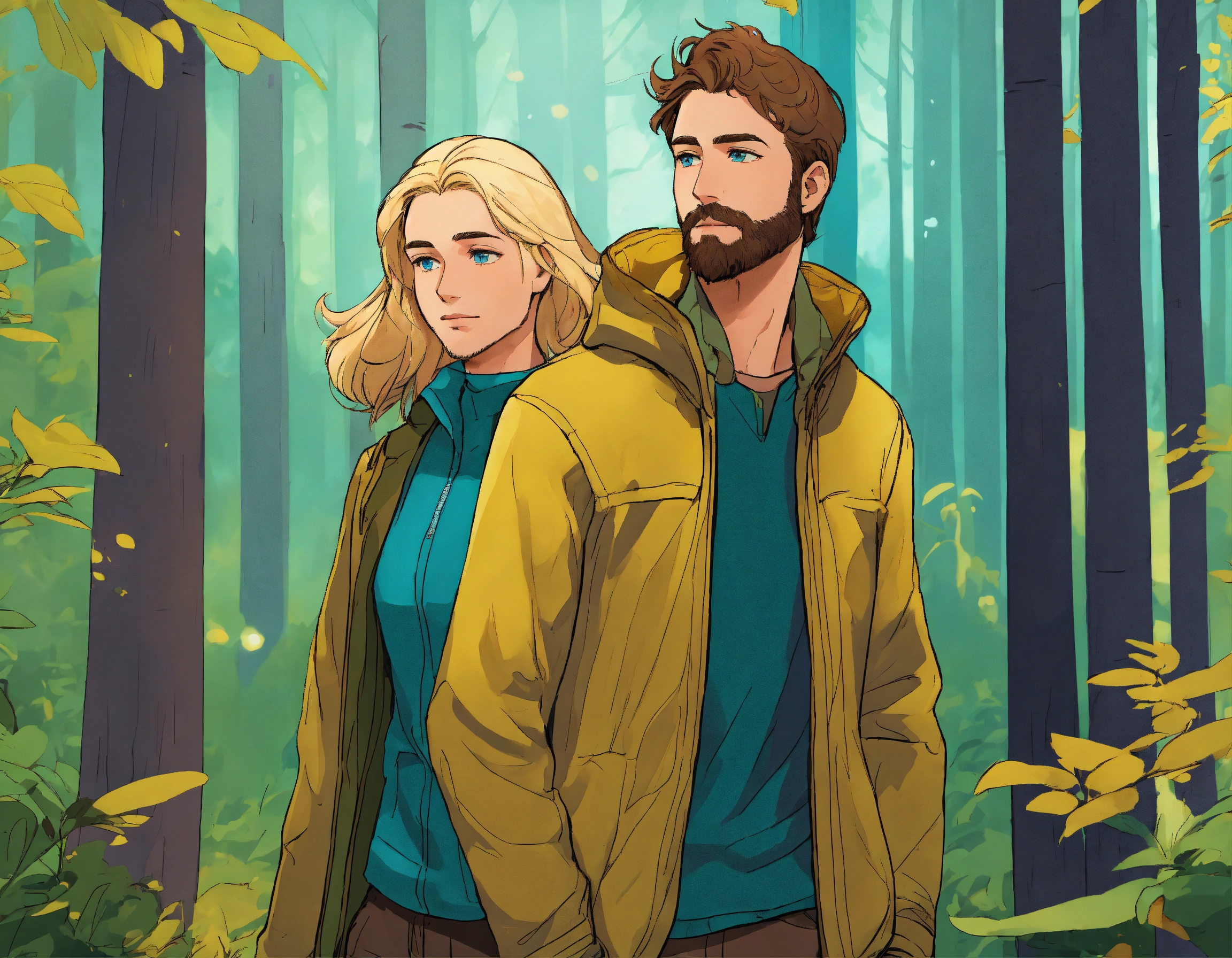 An illustration style where young man with brown hair, light thin brown beard and green eyes, yellow jacket and woman with blonde hair, blue eyes and v shape face, no beard embarks on their journey young man and woman both meet group of people in forest.