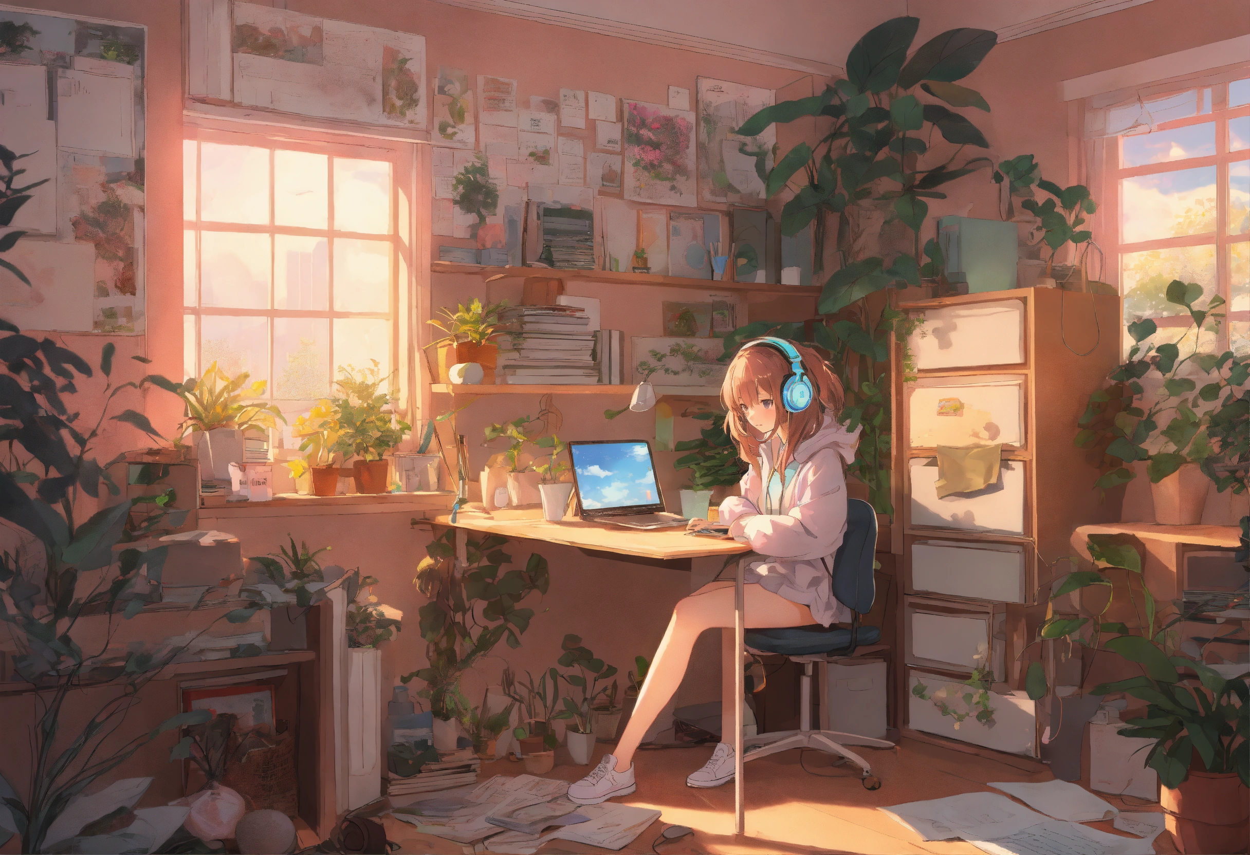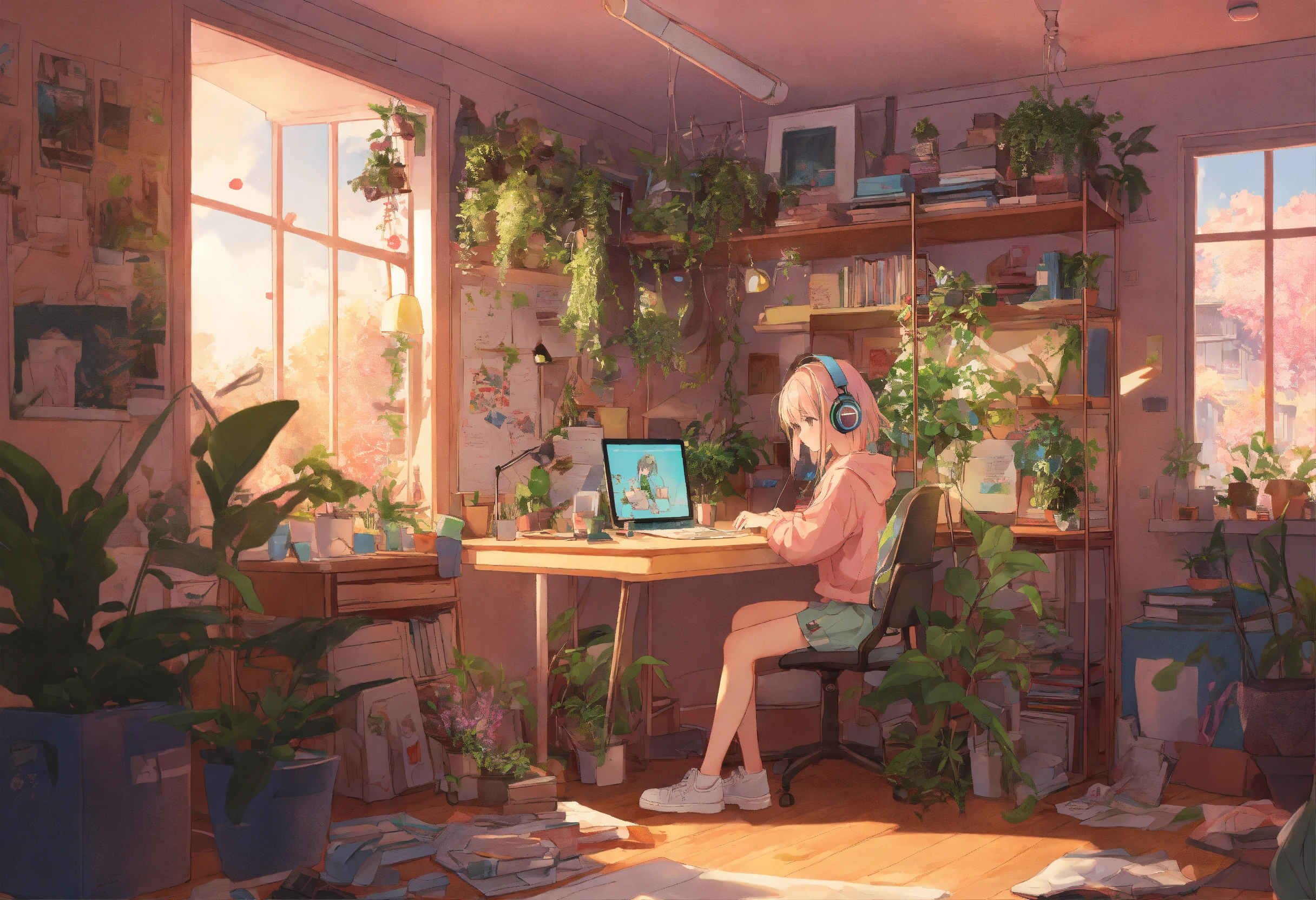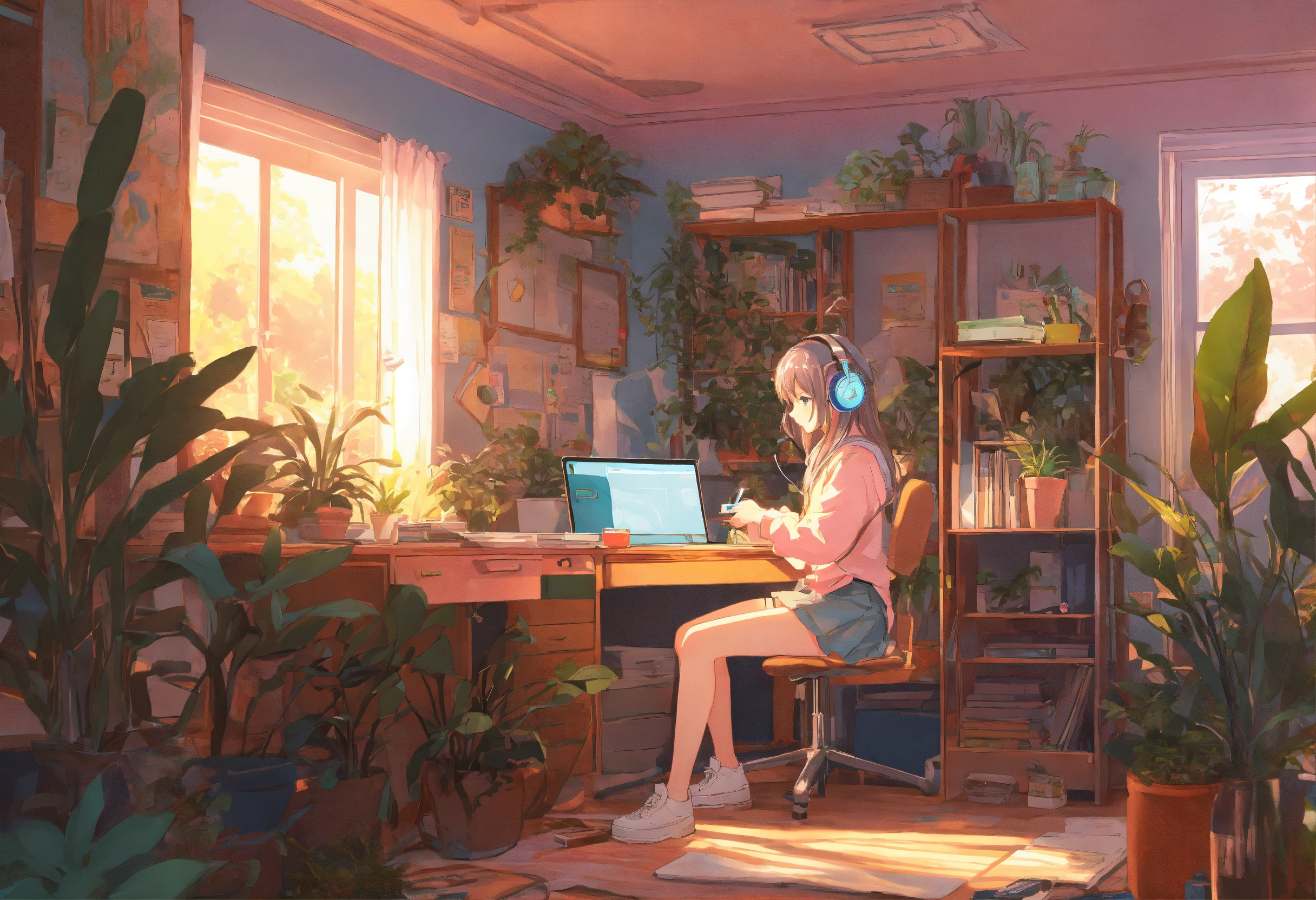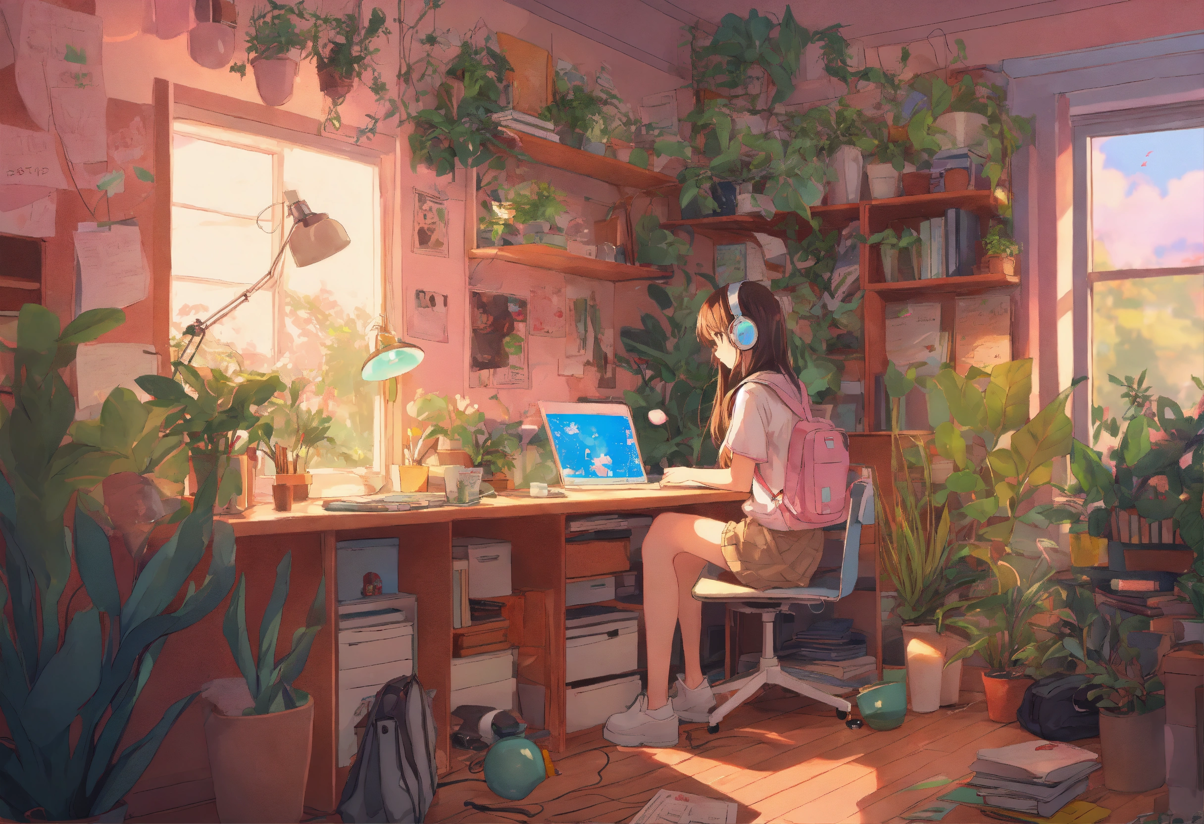 Anime girl at, her desk in the college dorm doing homework with headphones on pastel colors highly detailed, lots of plants and messy room