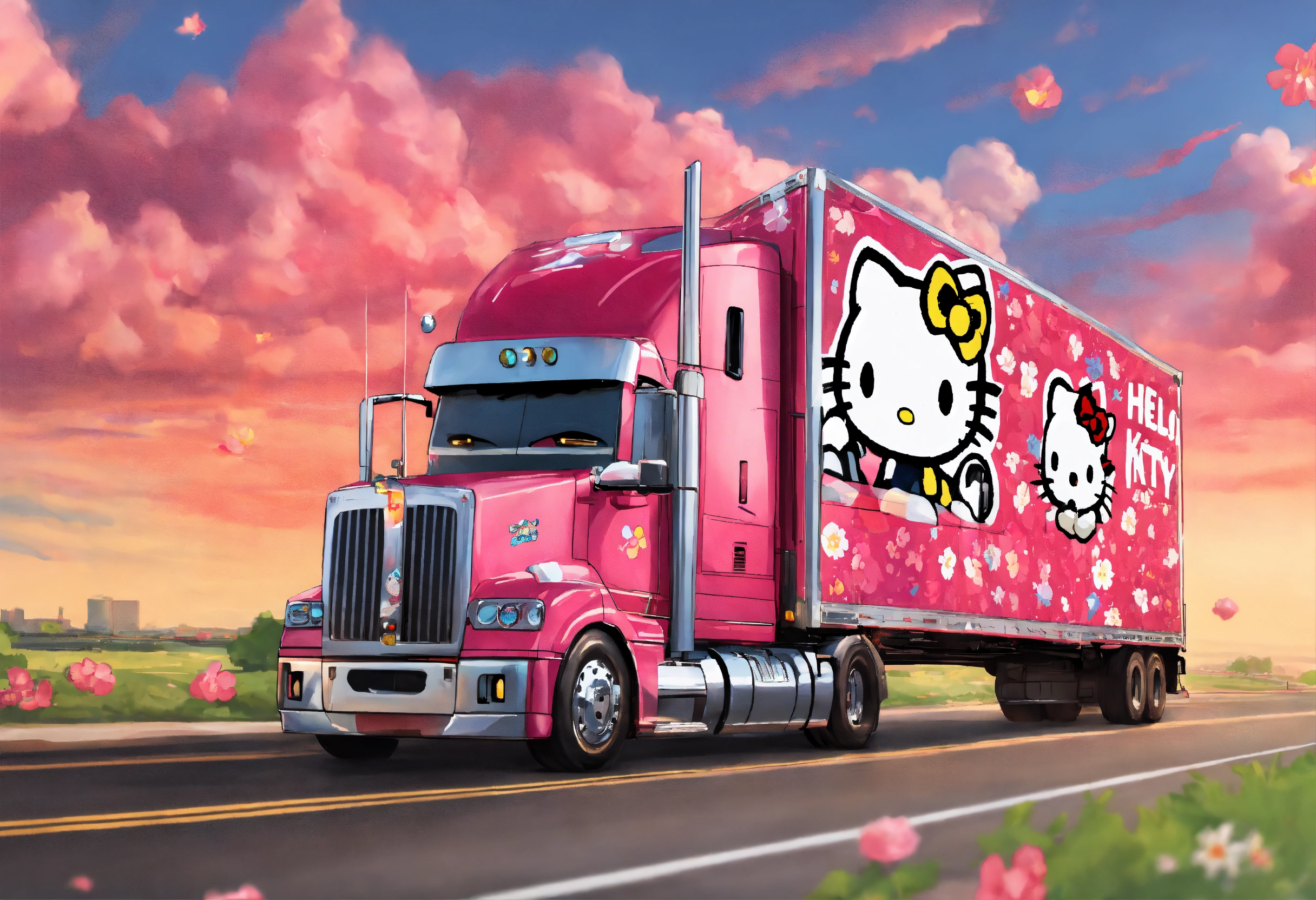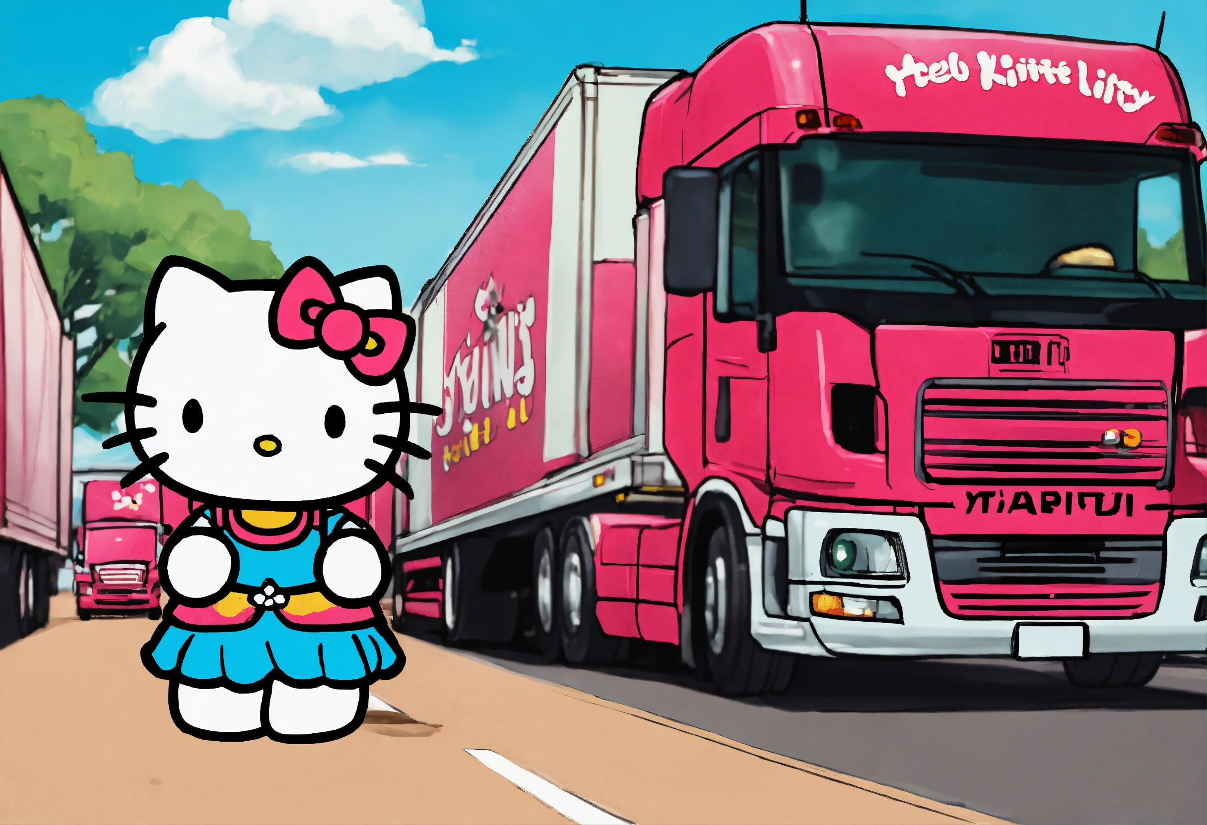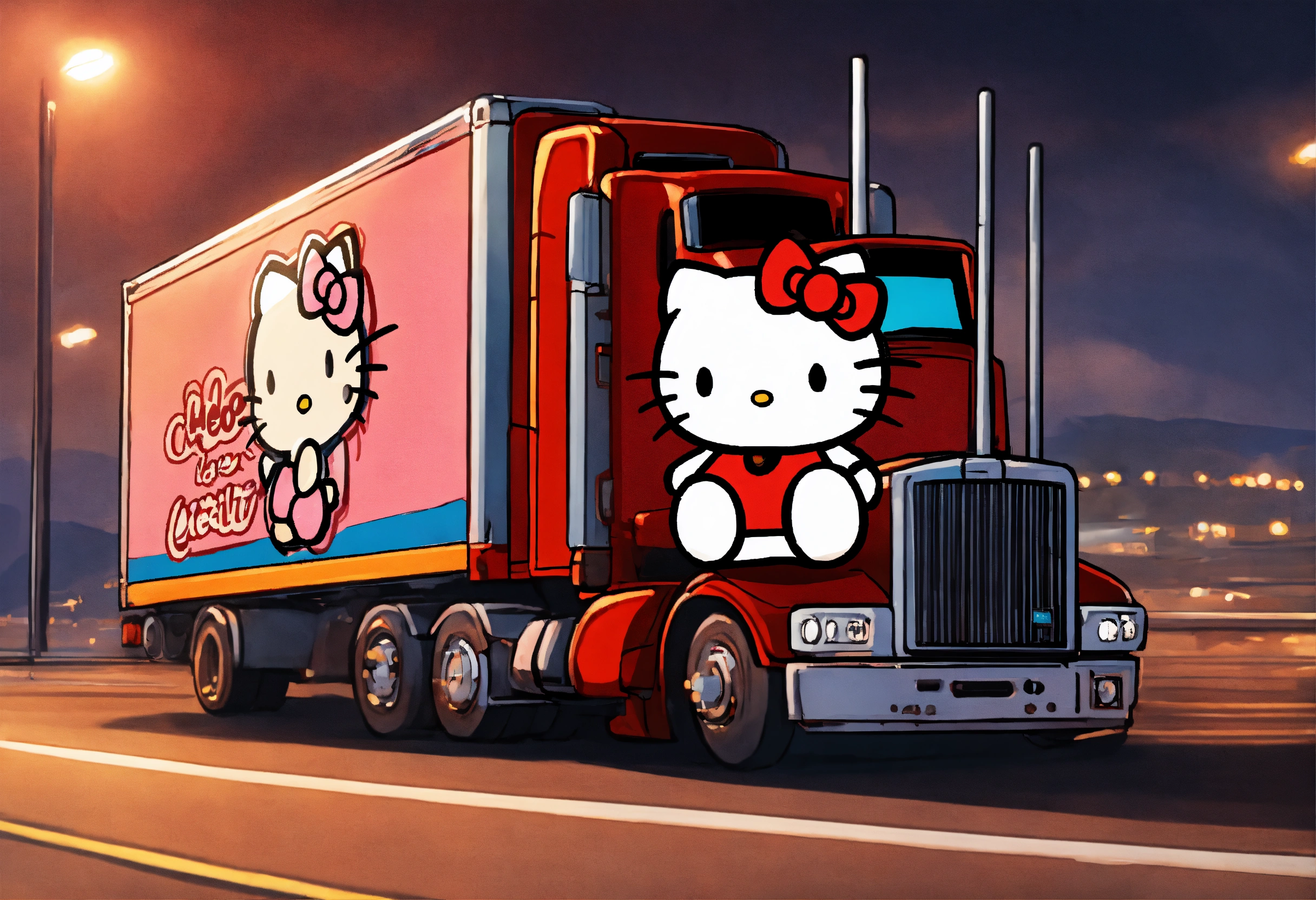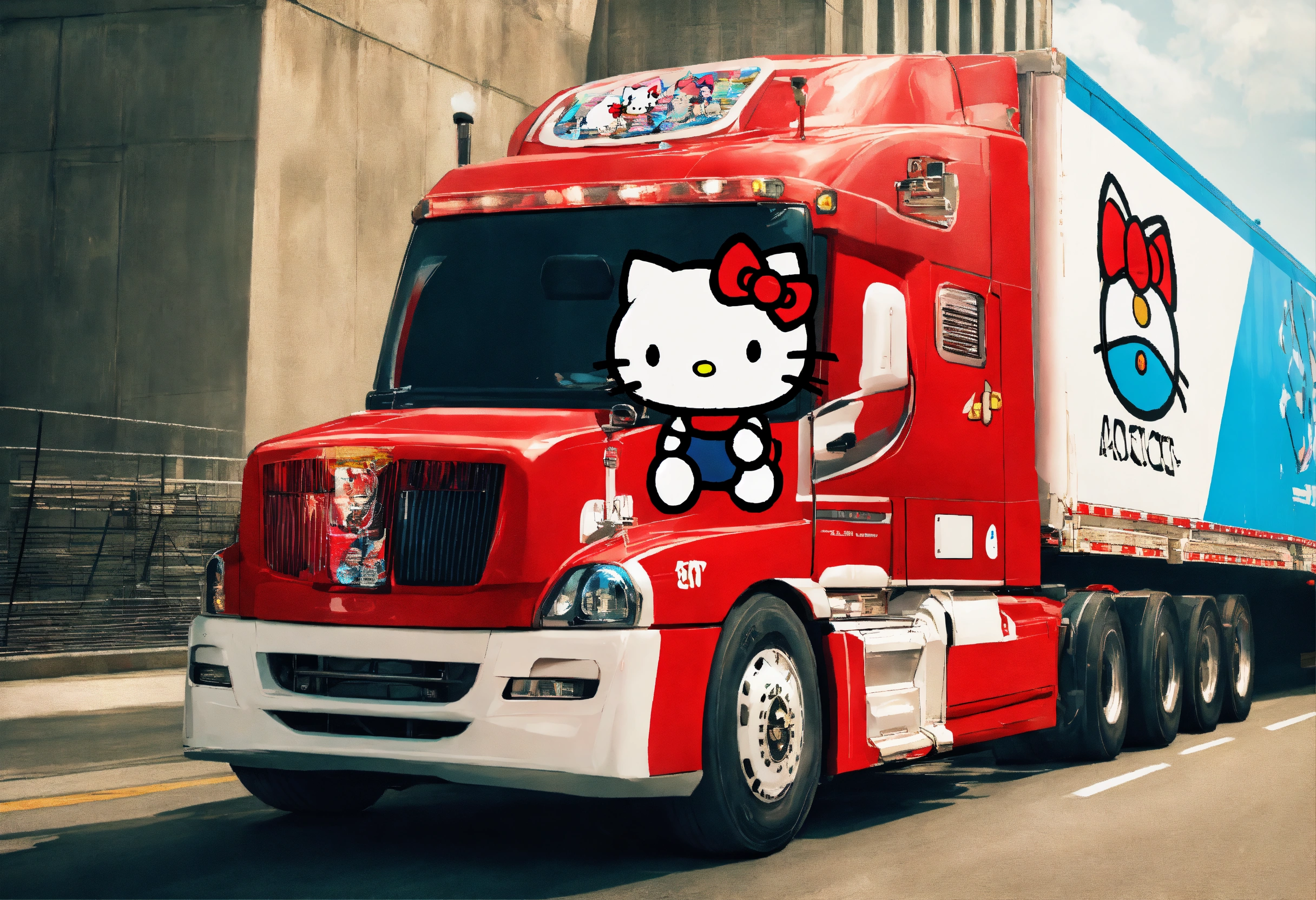 Hello kitty operating a semi truck