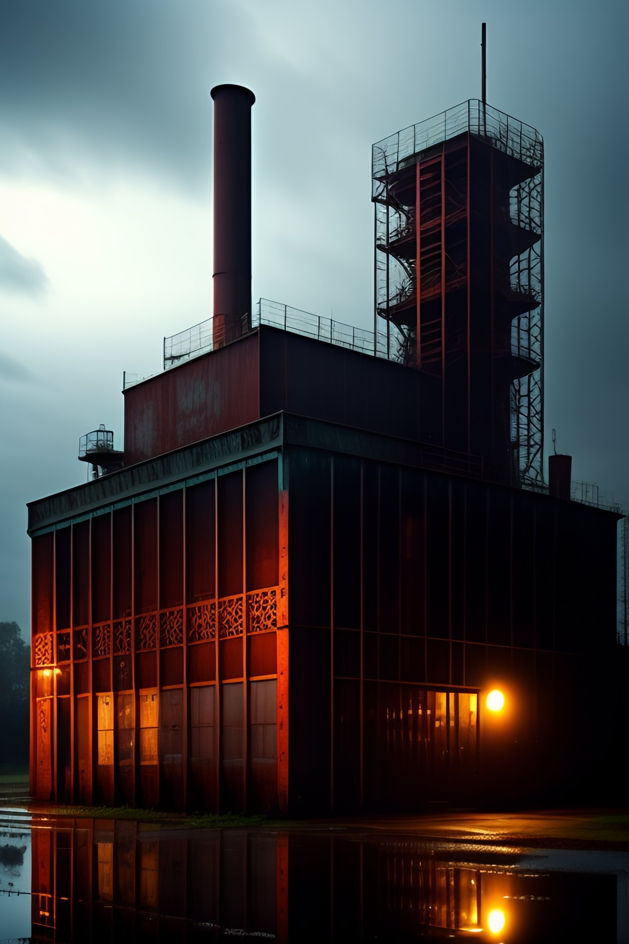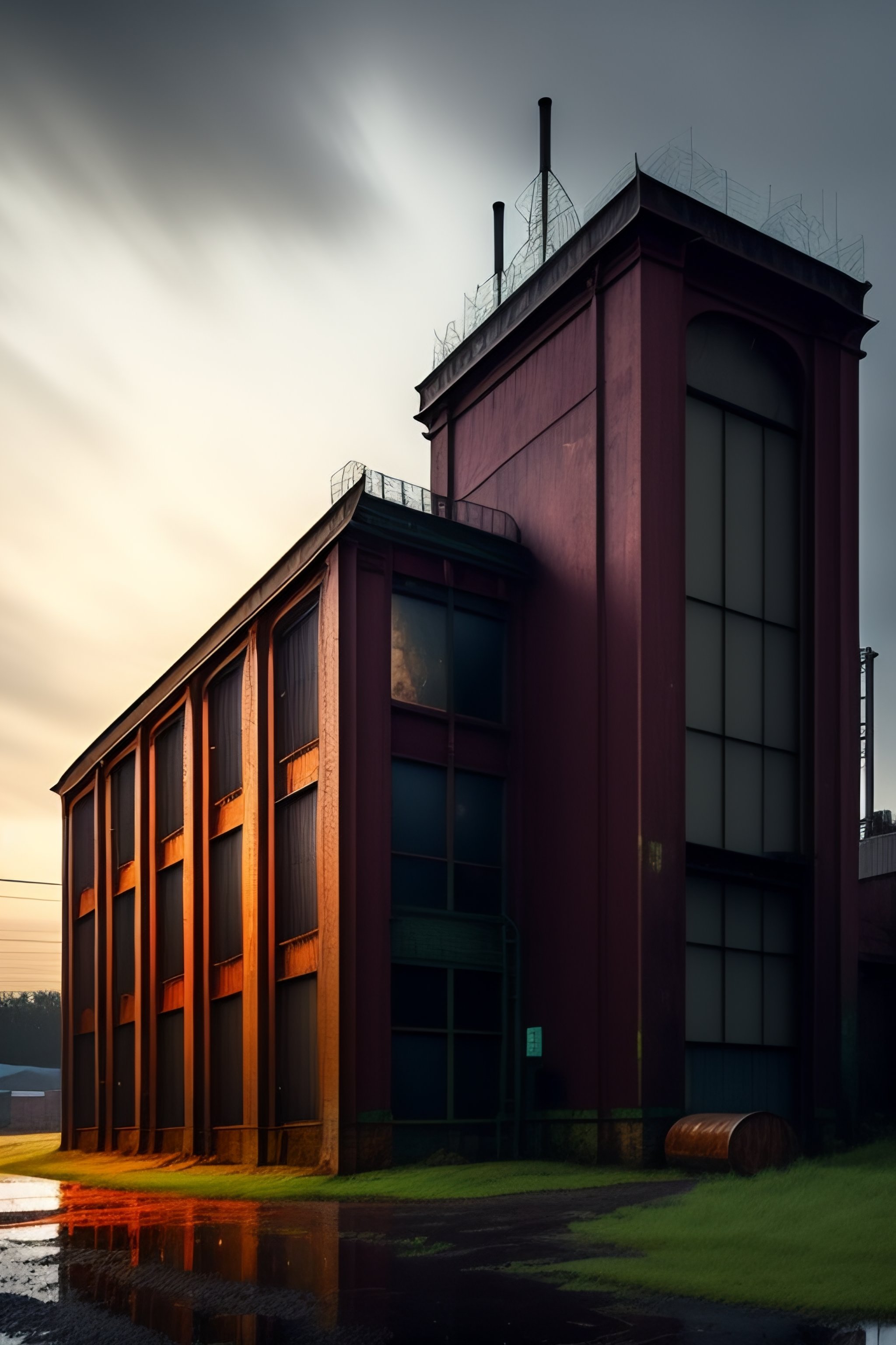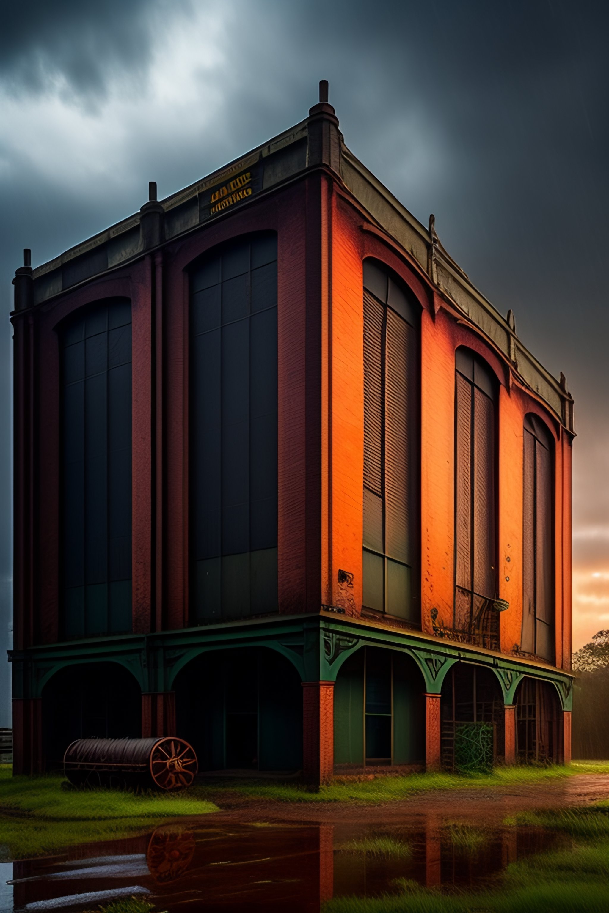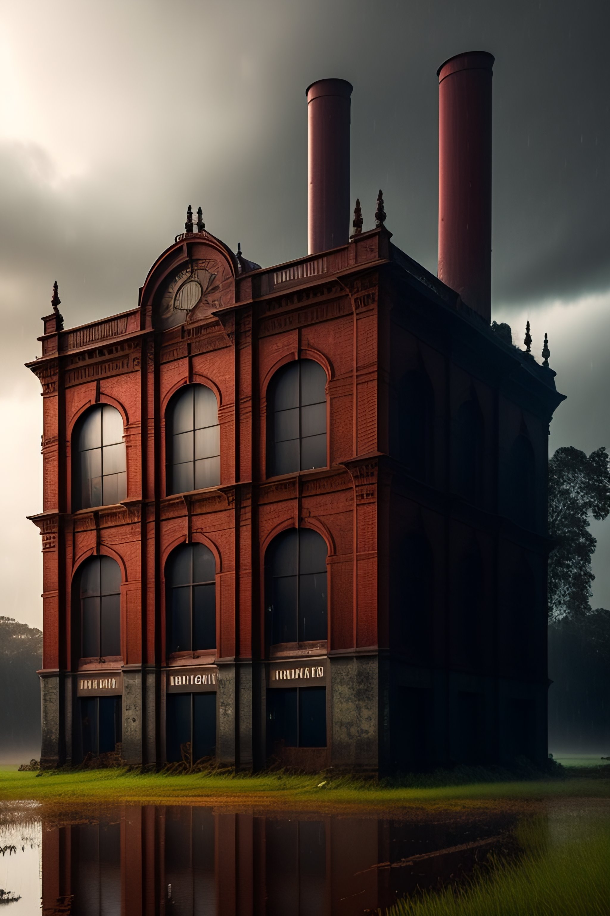 An abandoned victorian factory on a rainy night