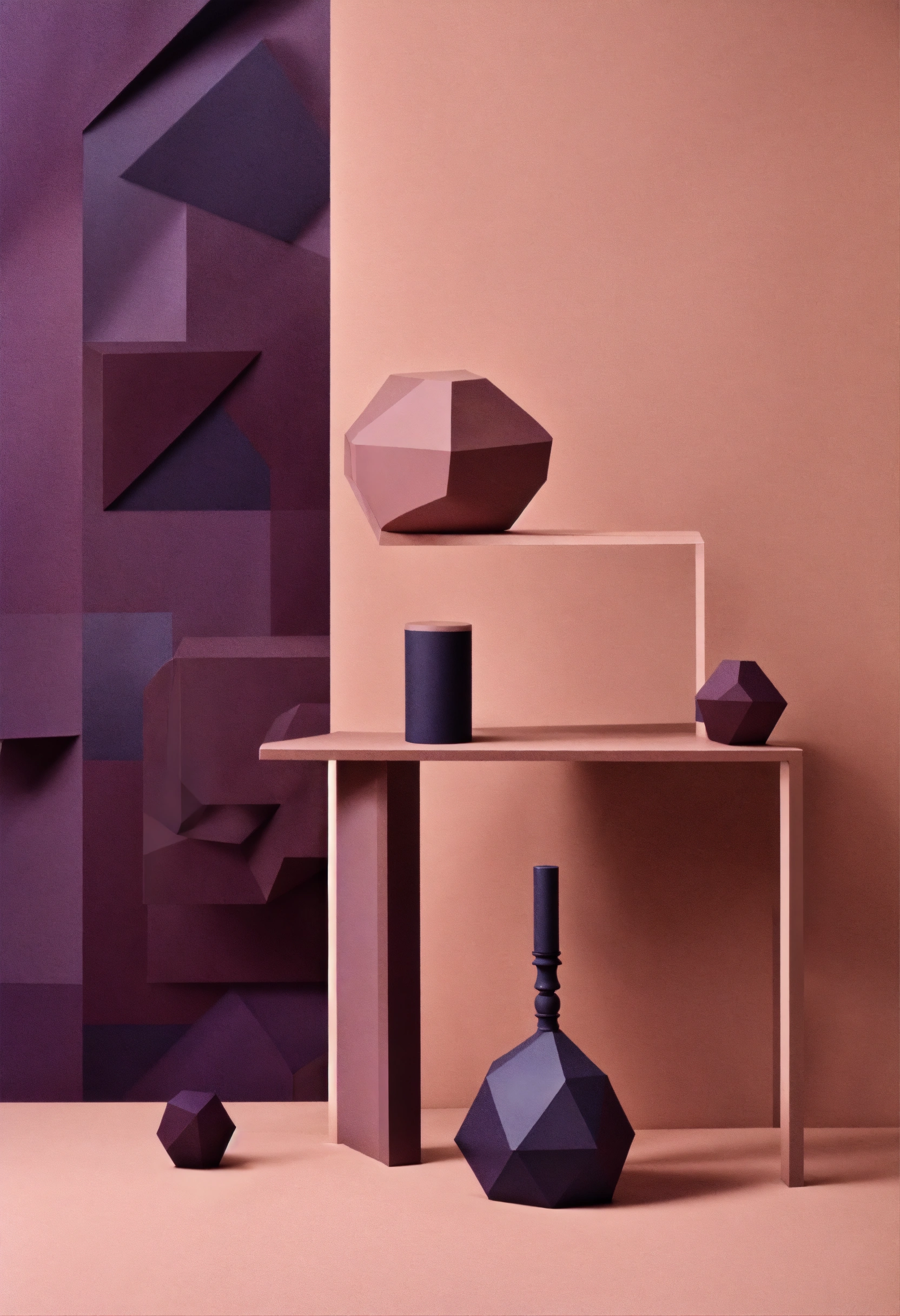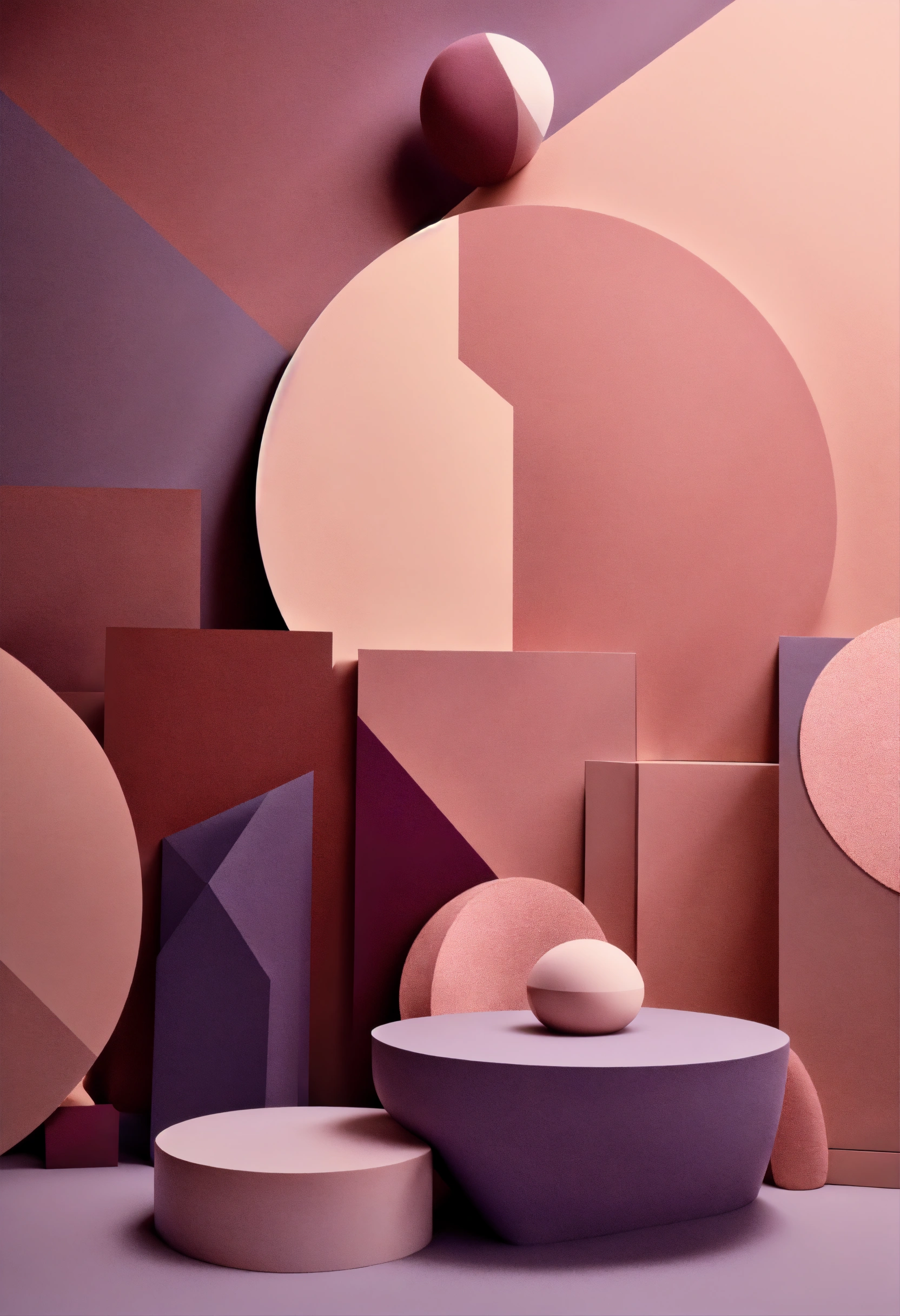 Muted tones of dusty pink and dark purple, evoking a sense of calmness, geometric patterning, clean and minimalistic approach 3d compositions, wedding theme.